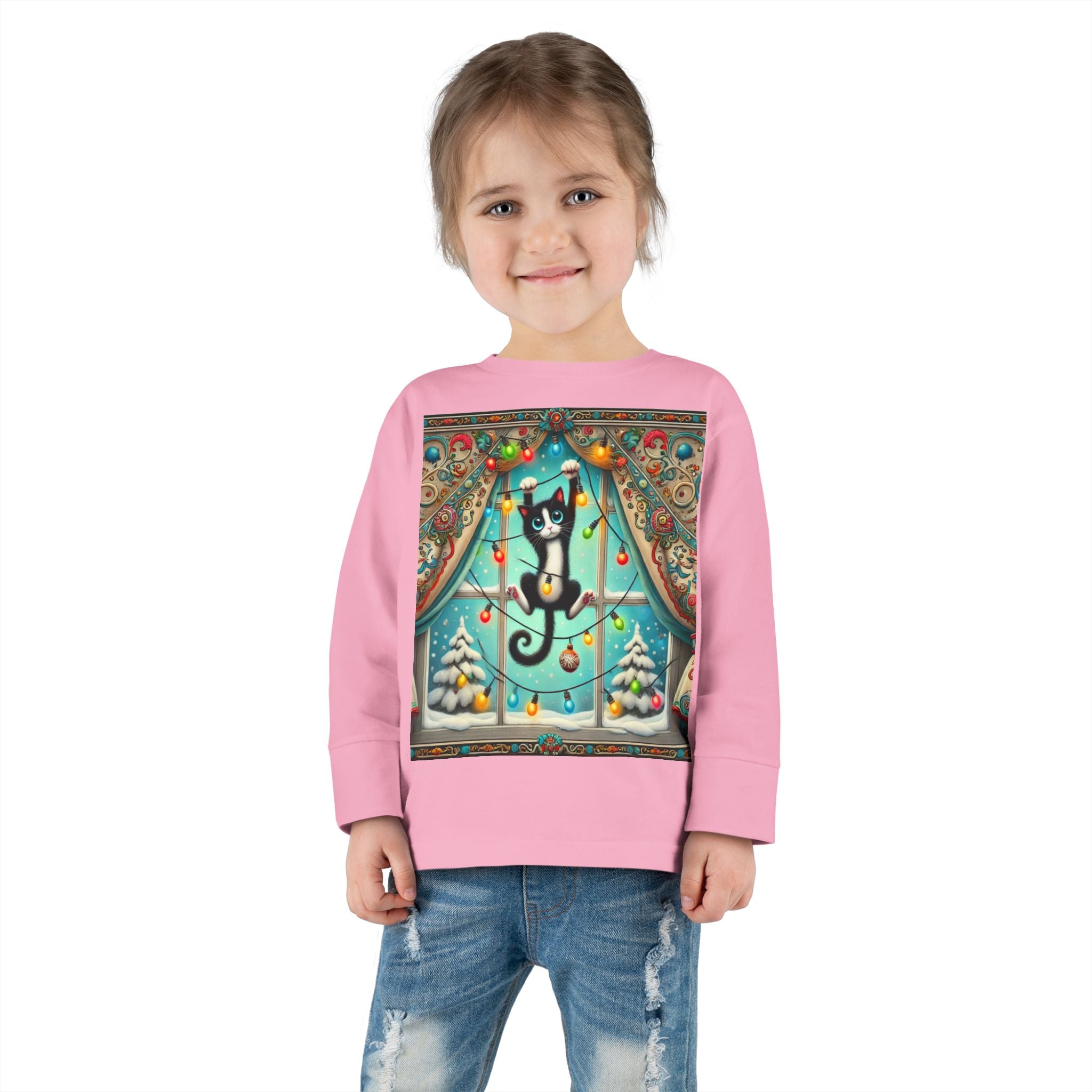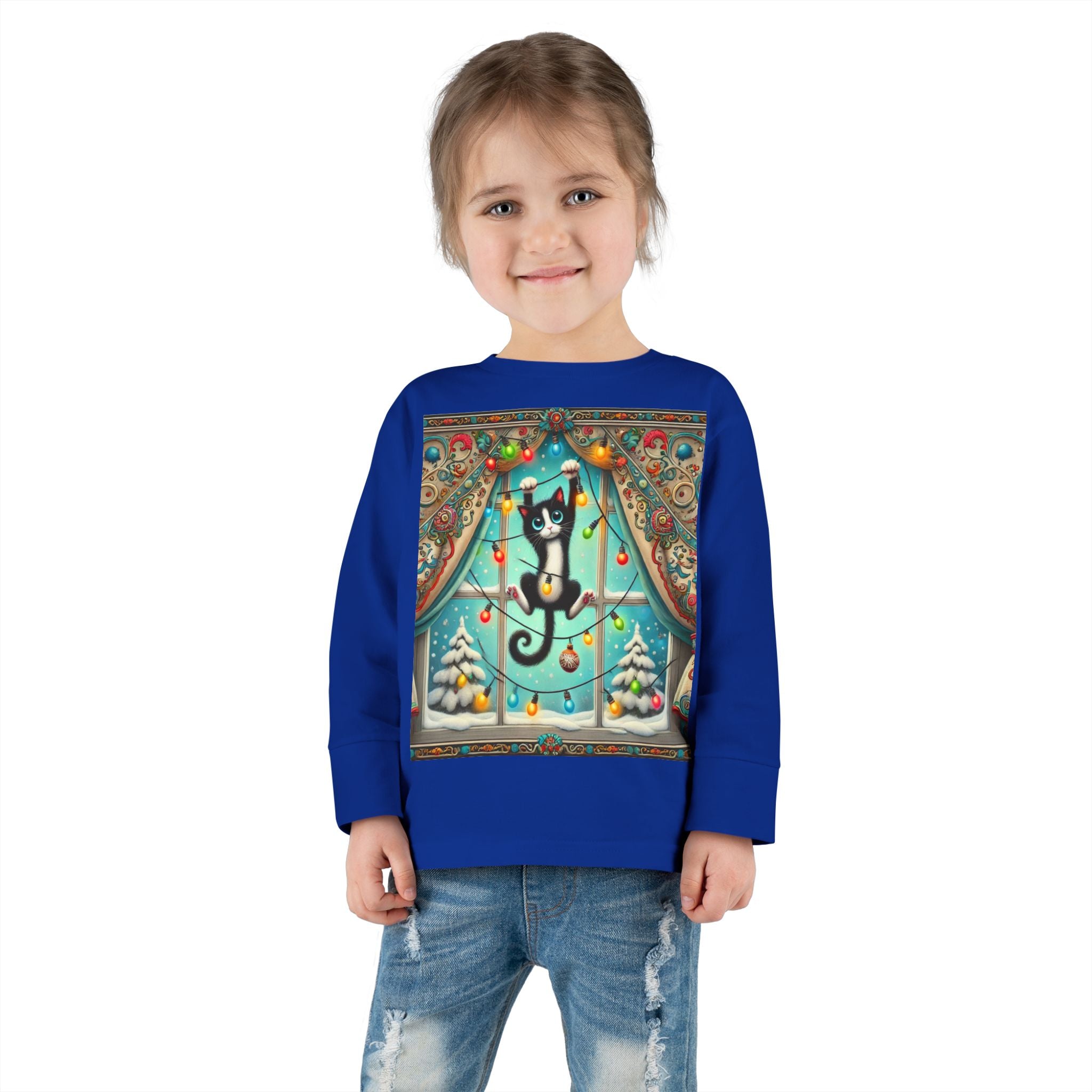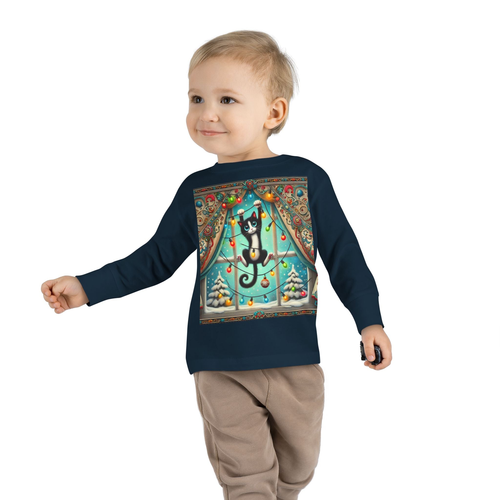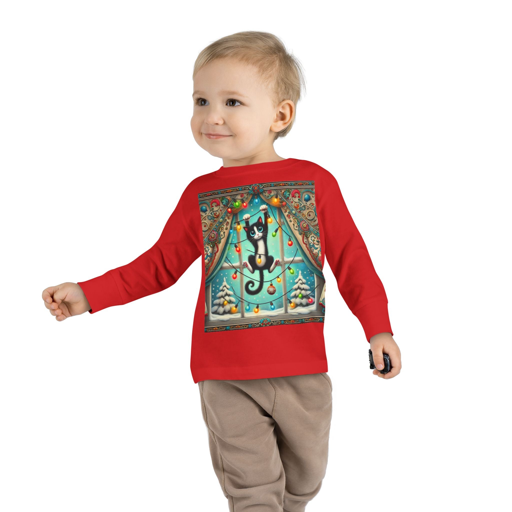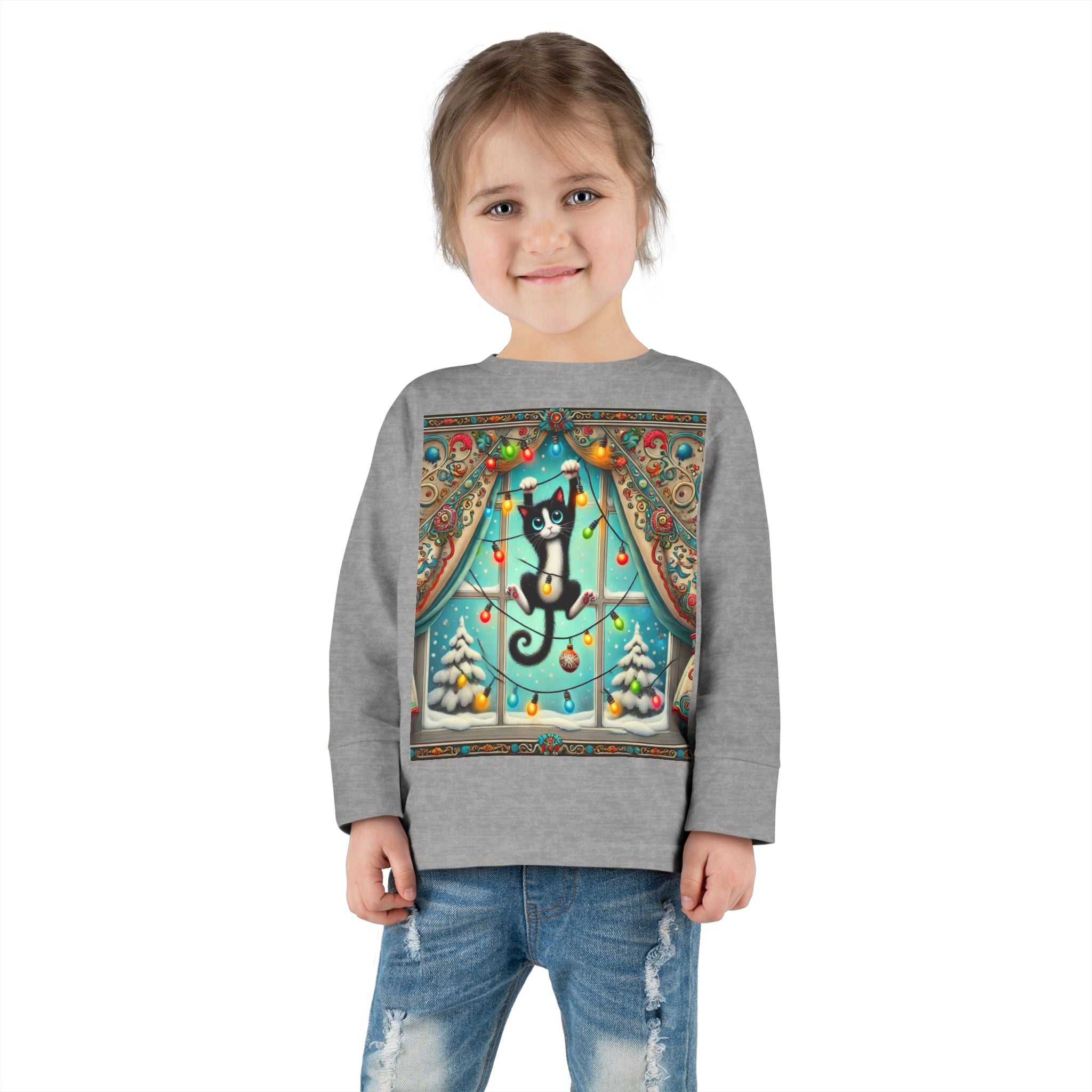 Let your little one celebrate the season in comfort and charm with the Mischief in Tinselland Toddler Long Sleeve Tee. This delightful Christmas artwork features a playful black-and-white kitten tangled in glowing holiday lights, peeking out from behind a frosted window framed by swirling, festive curtains. Outside, snow-covered trees glisten under a turquoise winter sky — a whimsical, heartwarming scene that captures the joyful mischief of the holidays. 🎄🐾✨