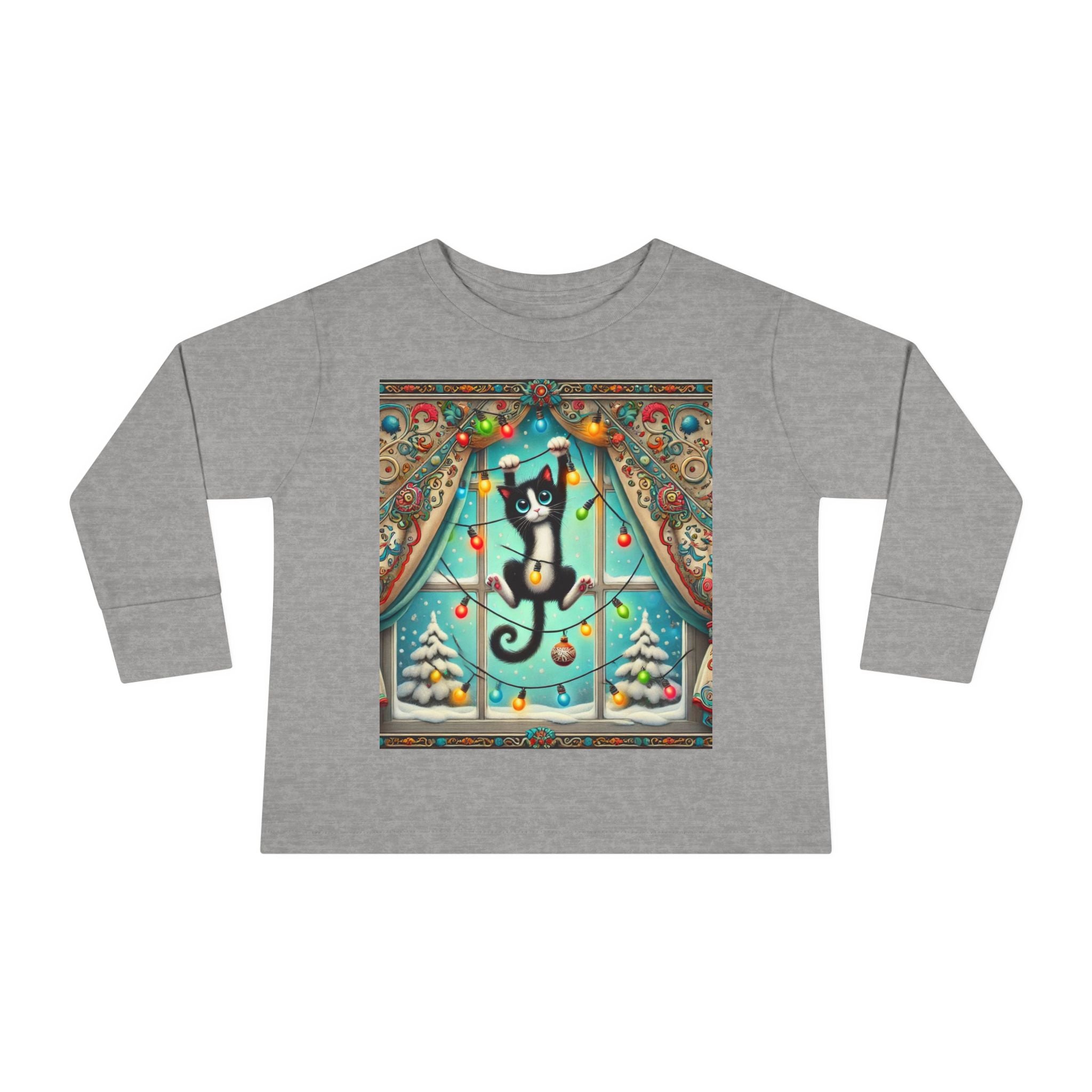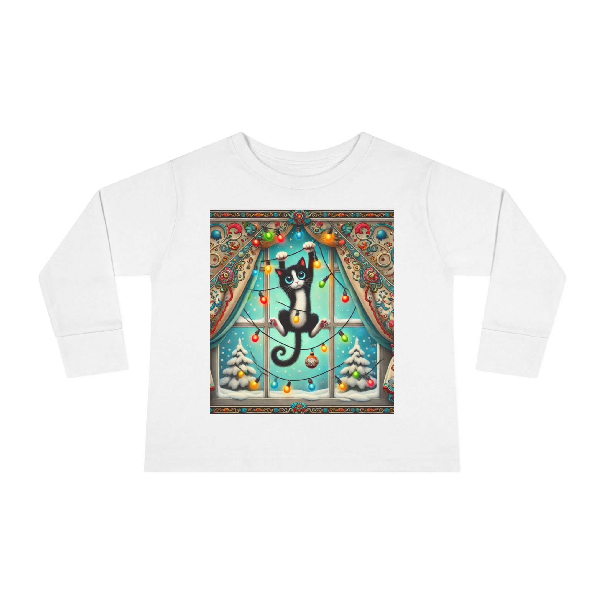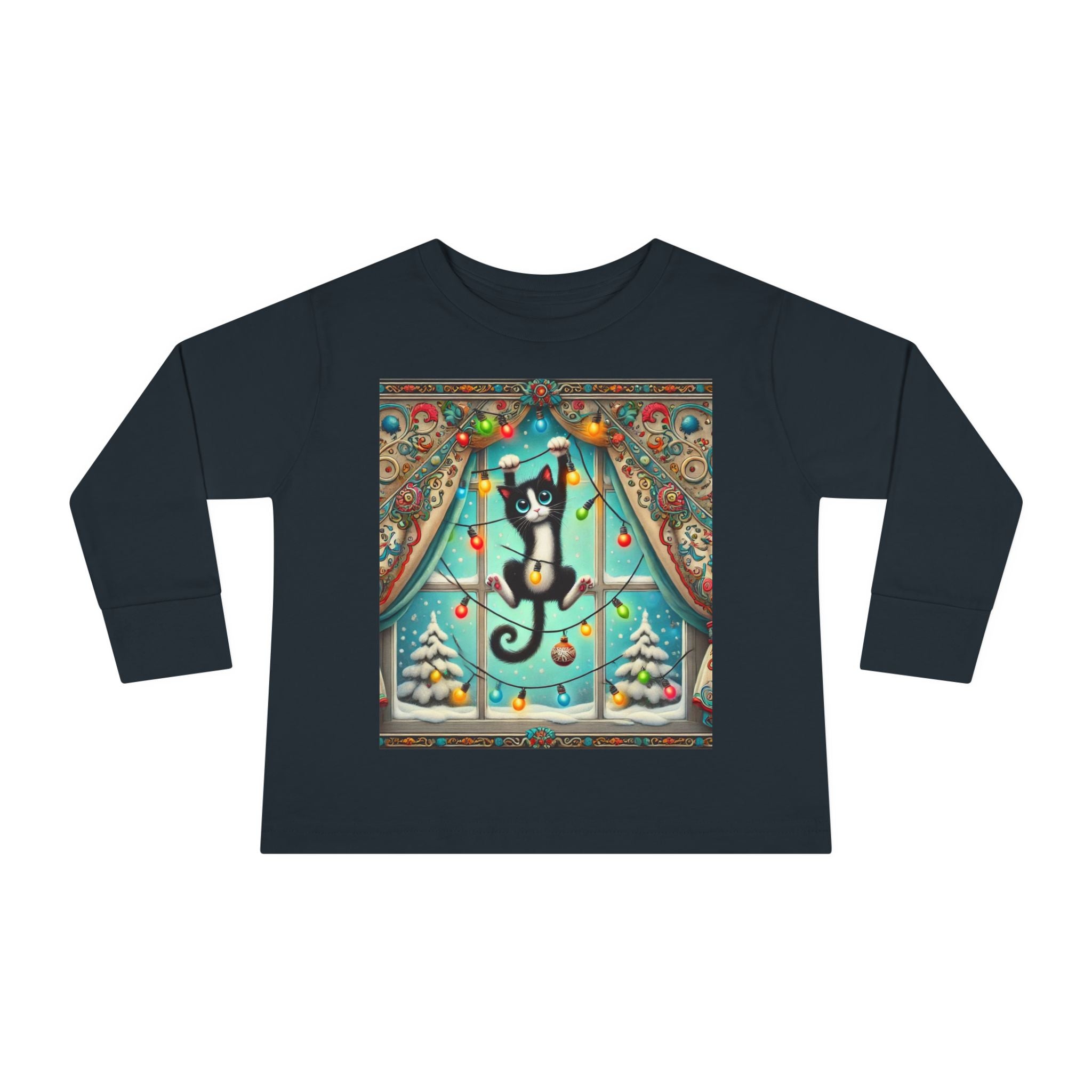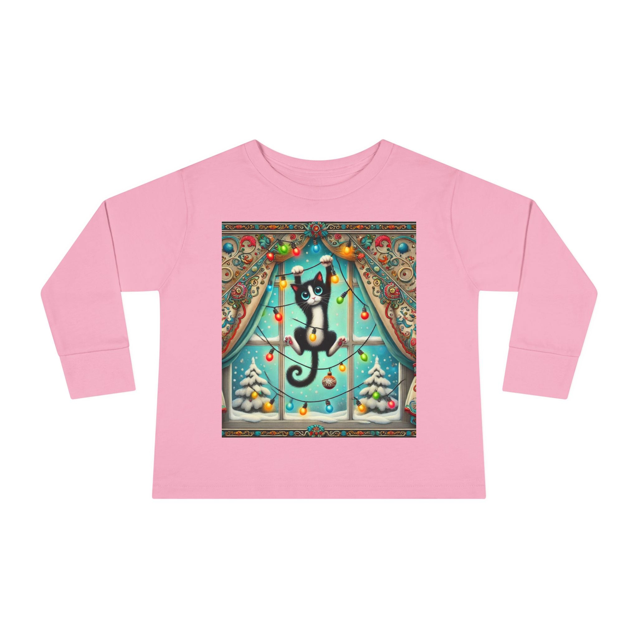 Let your little one celebrate the season in comfort and charm with the Mischief in Tinselland Toddler Long Sleeve Tee. This delightful Christmas artwork features a playful black-and-white kitten tangled in glowing holiday lights, peeking out from behind a frosted window framed by swirling, festive curtains. Outside, snow-covered trees glisten under a turquoise winter sky — a whimsical, heartwarming scene that captures the joyful mischief of the holidays. 🎄🐾✨
