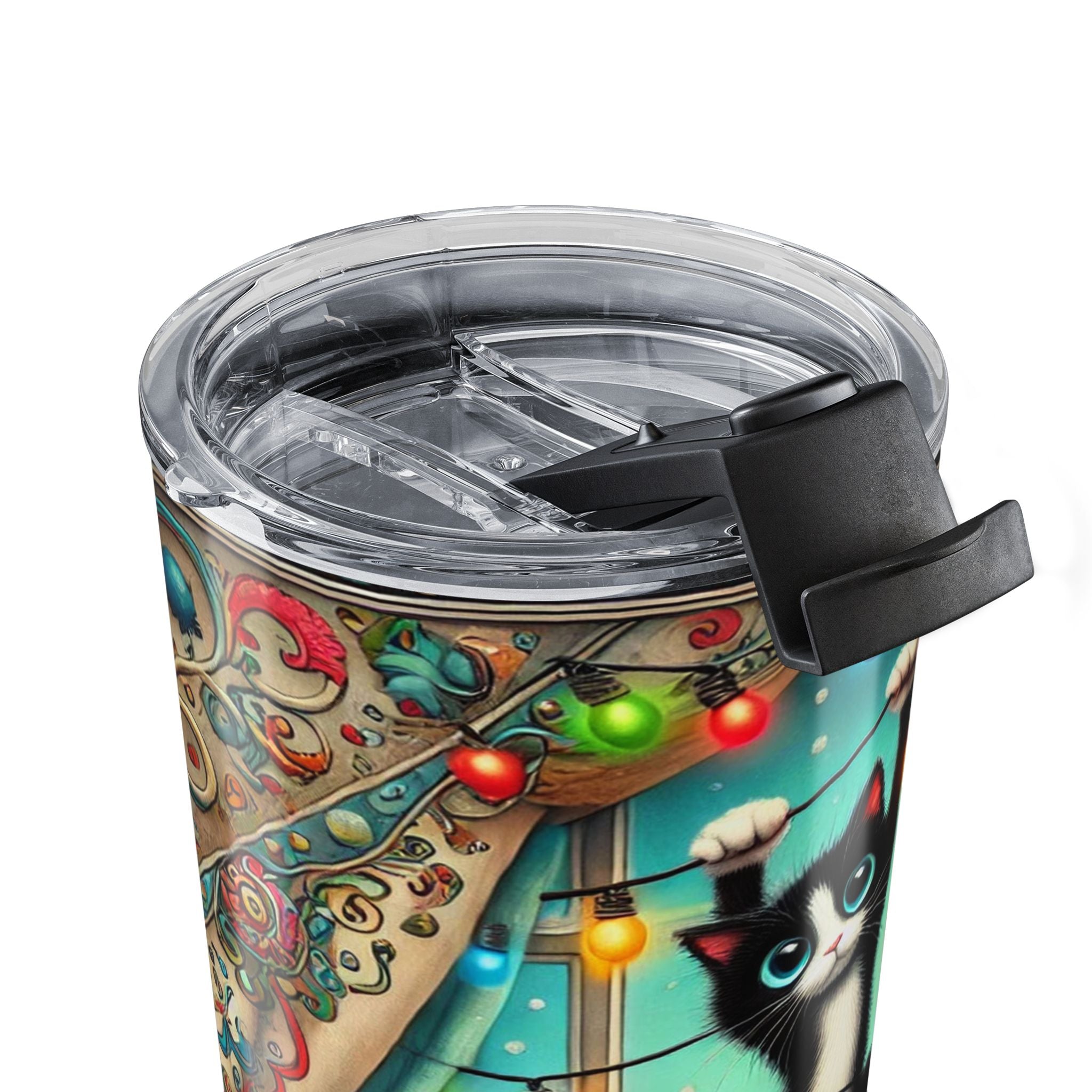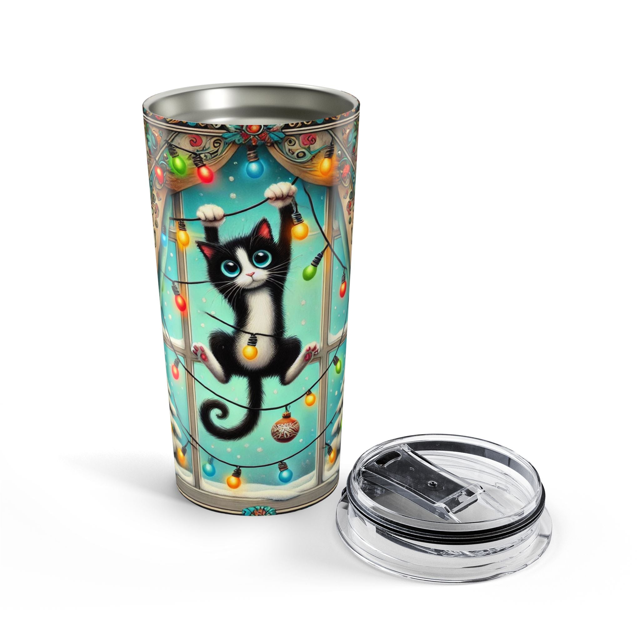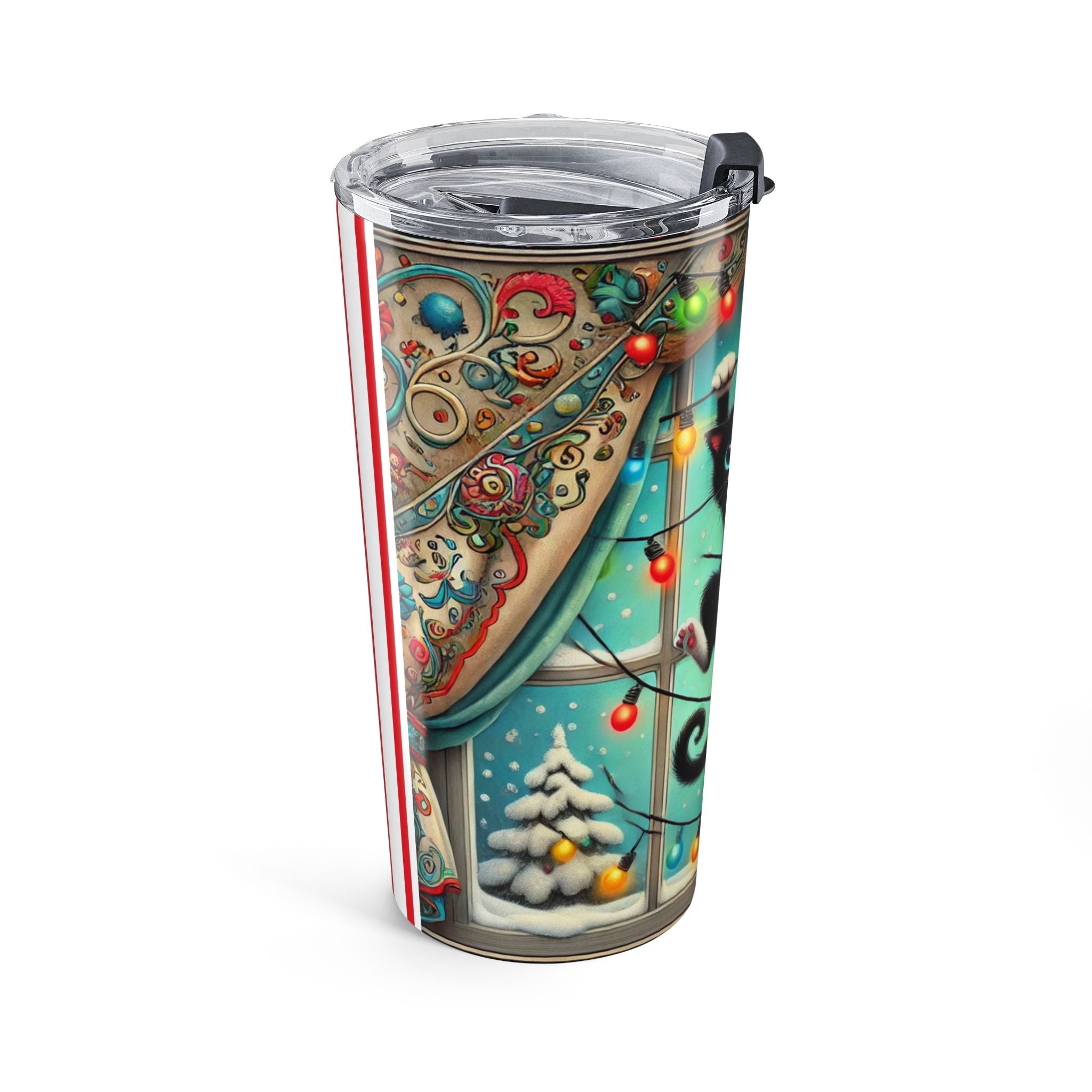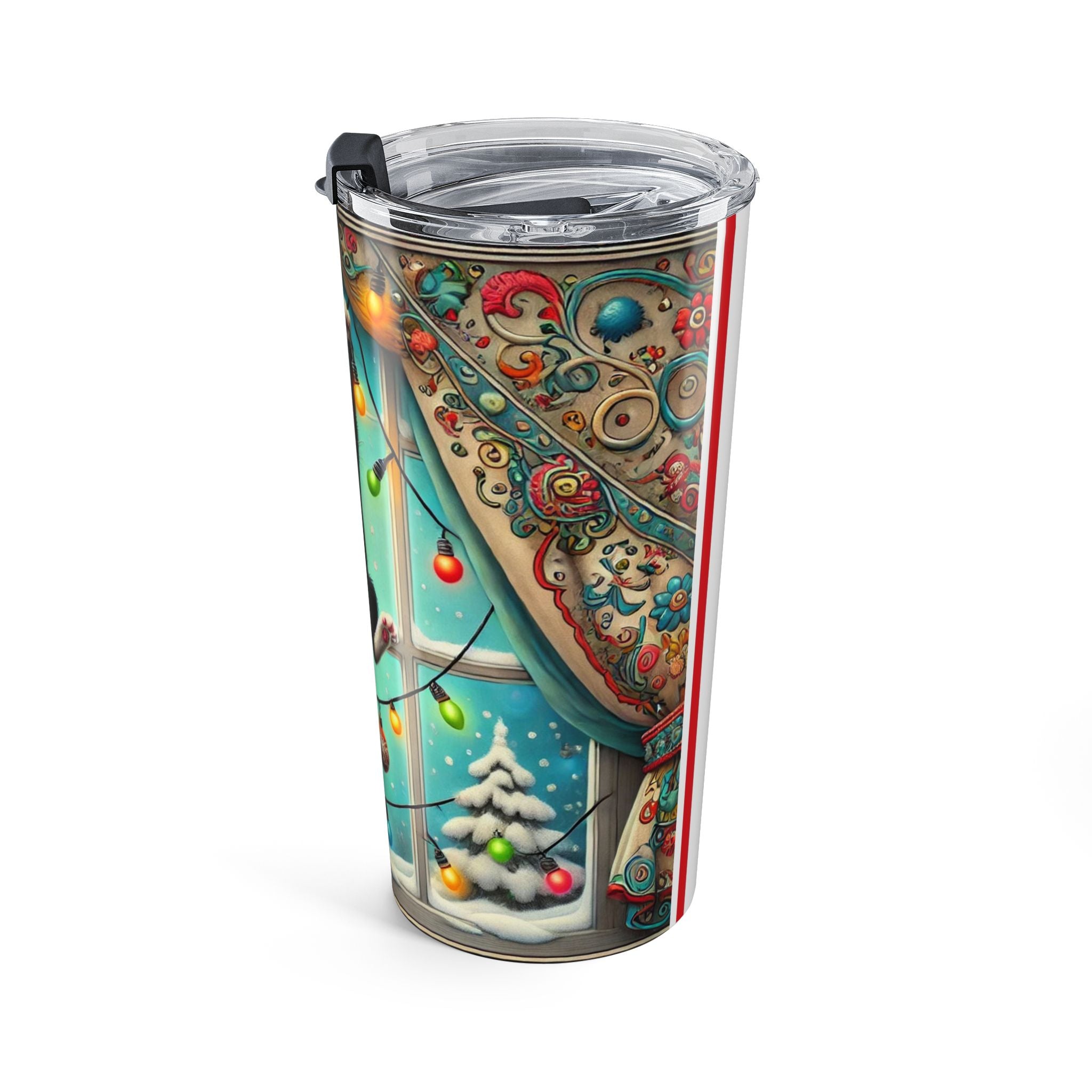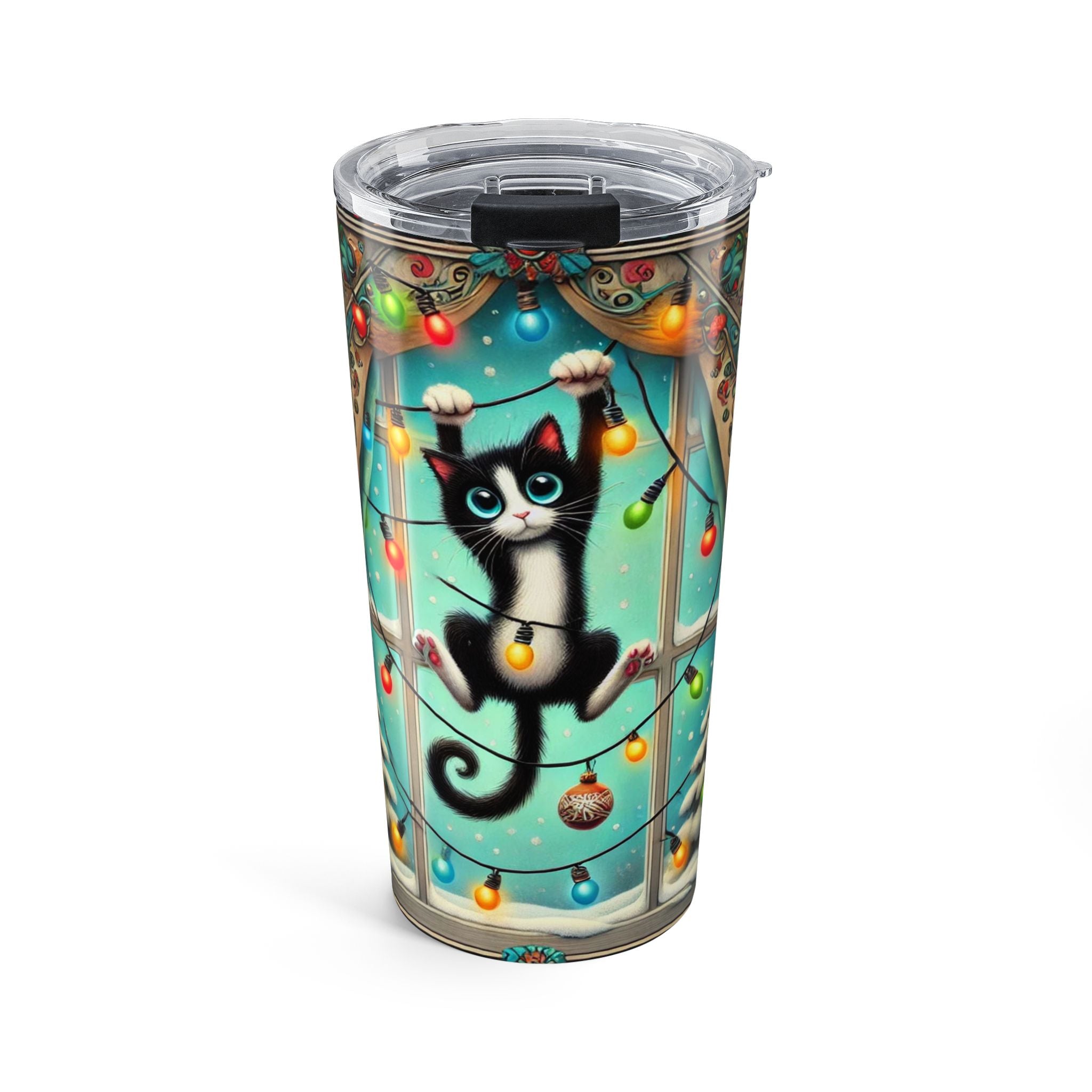 Add a spark of holiday mischief to your day with the Mischief in Tinselland Tumbler. This playful Christmas design features a black-and-white kitten tangled in colorful lights, gazing out a frosted window framed by festive curtains. Outside, snow-covered trees shimmer under a turquoise sky ā a cozy scene full of color, humor, and holiday cheer. šš¾āØ