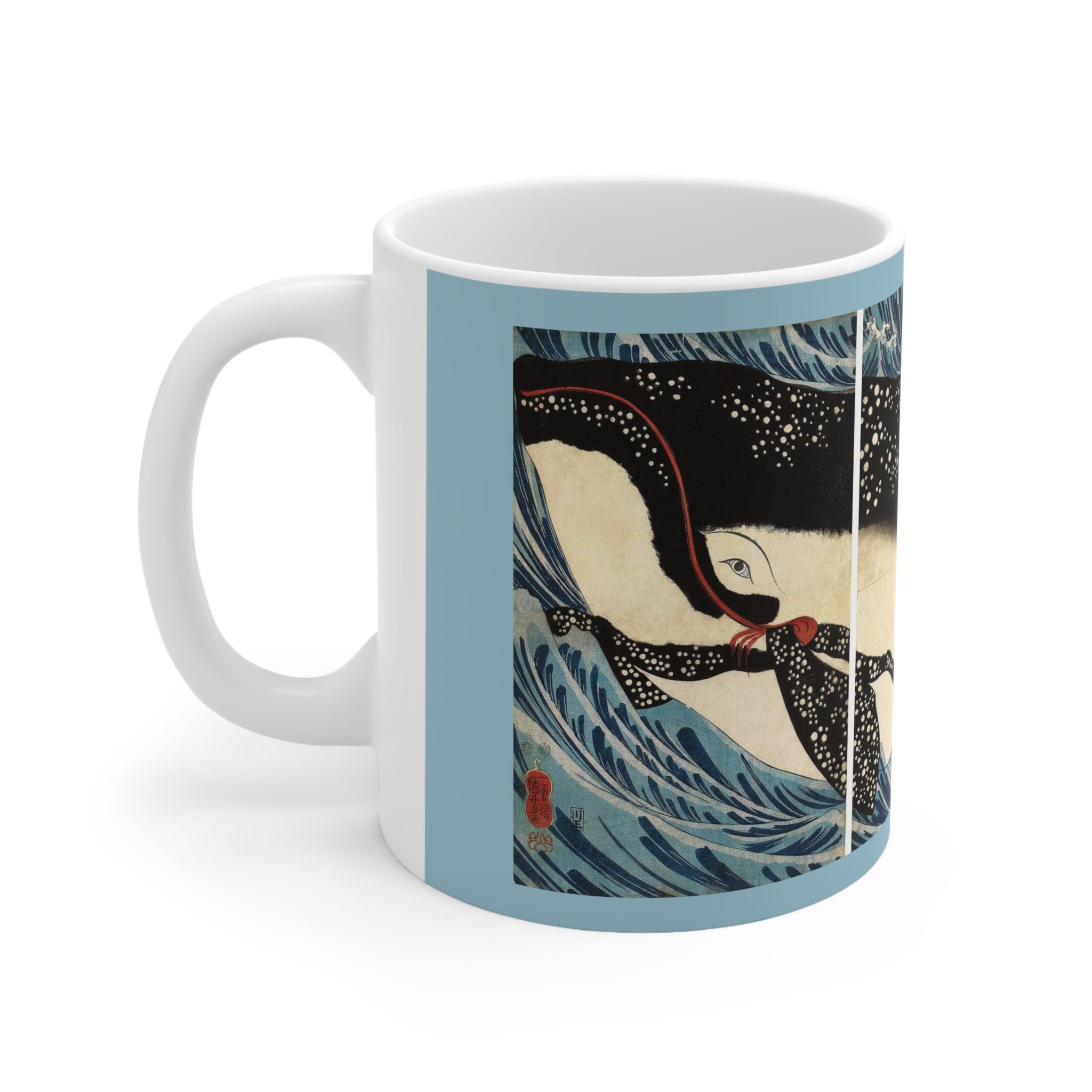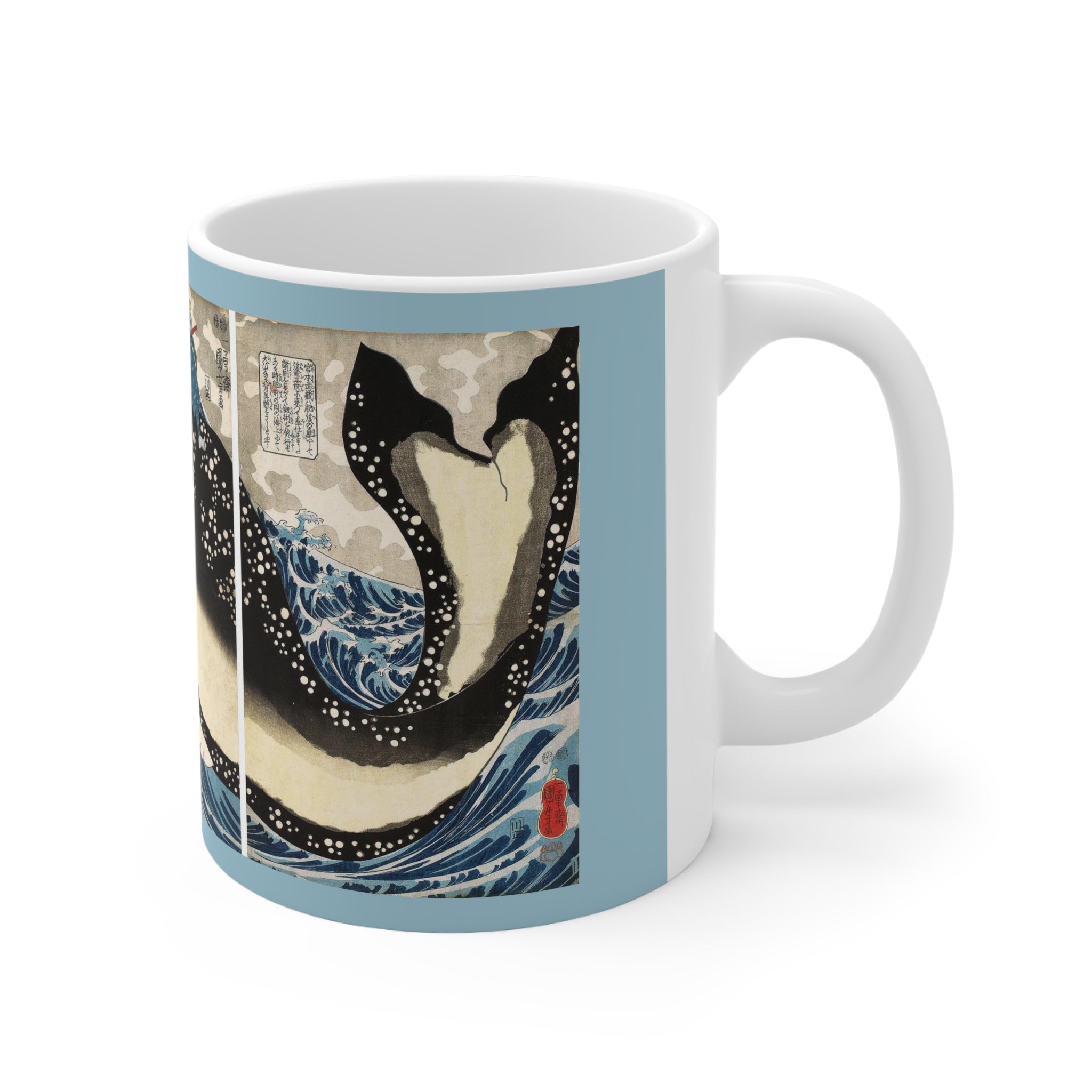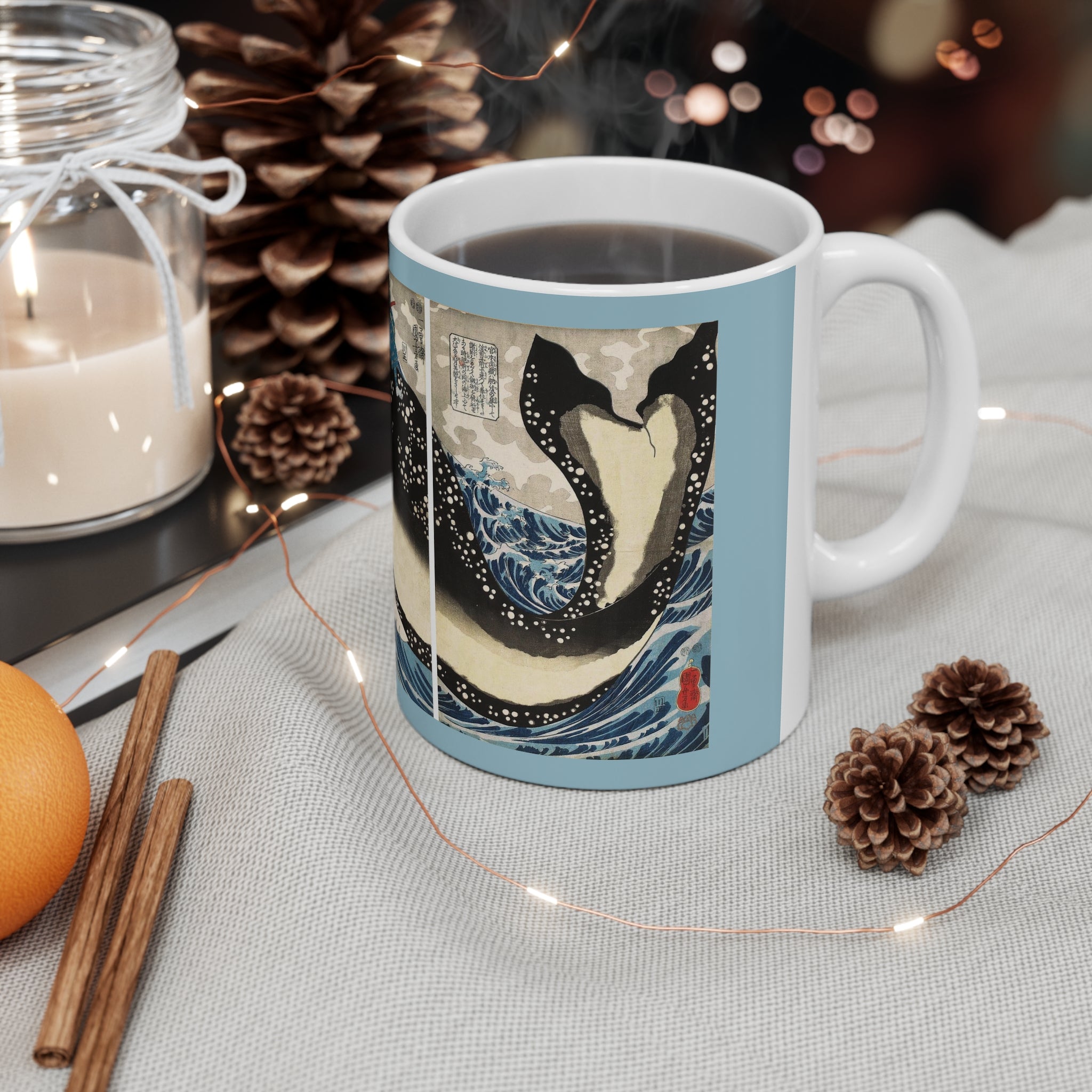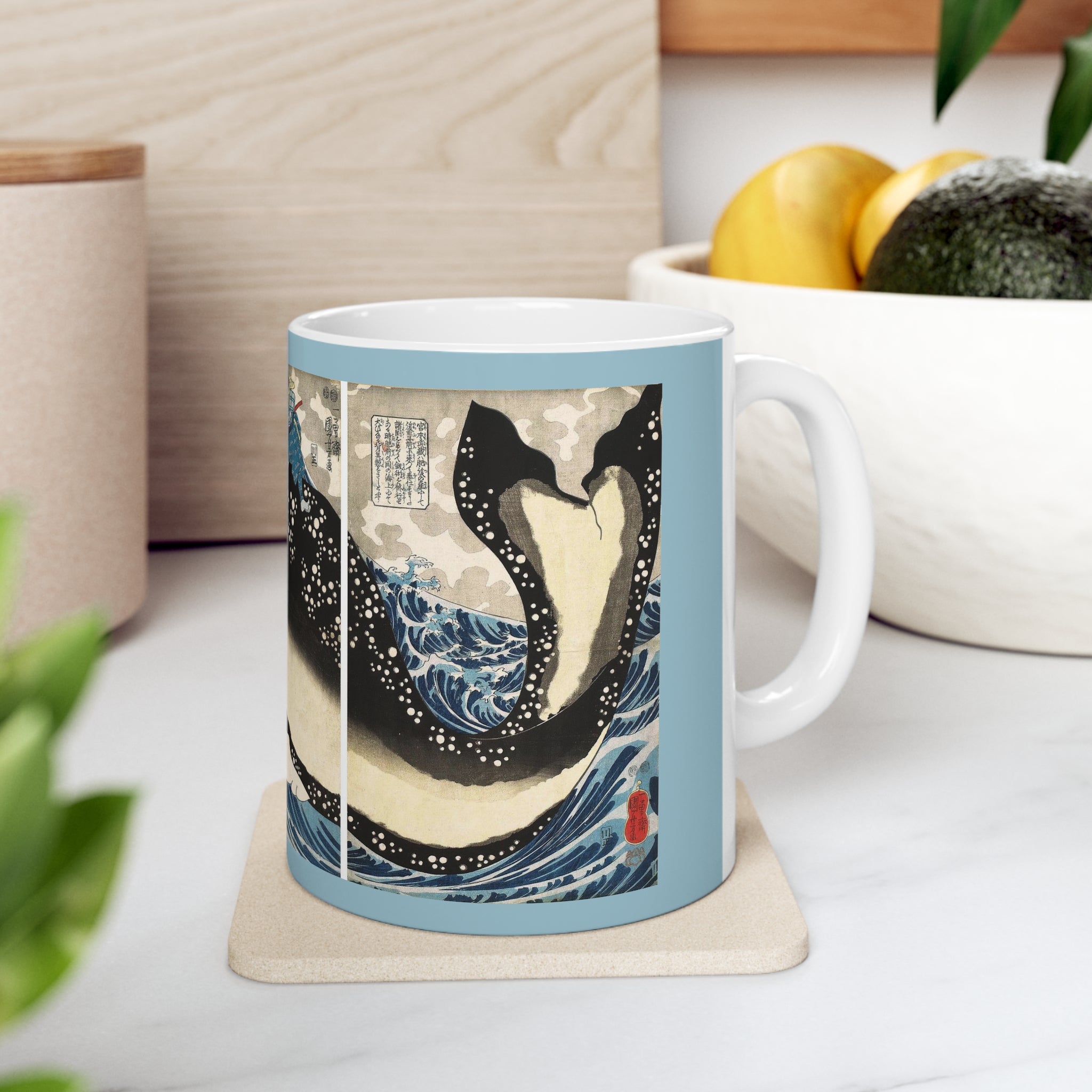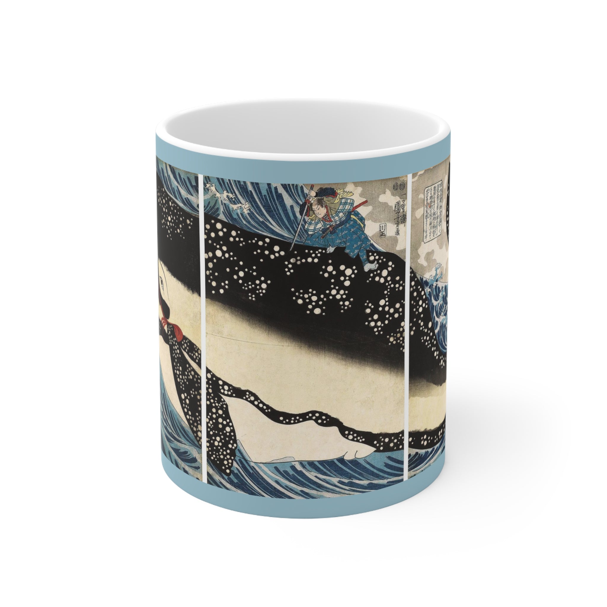 Artwork designed and digitally remastered by Sarasvati Designs. The original artwork titled "Miyamoto no Musashi Attacking the Giant Whale," published by Kawaguchiya Shozo between 1847 and 1850, is a striking woodblock print created by the celebrated Japanese ukiyo-e artist Utagawa Kuniyoshi. In this dramatic composition, the legendary swordsman Miyamoto no Musashi takes center stage. He is depicted in a dynamic and fierce pose, engaged in a life-and-death struggle with an enormous, fearsome whale. Musashi, an iconic figure in Japanese history, is known for his exceptional skill in martial arts and swordsmanship. "Miyamoto no Musashi Attacking the Giant Whale" is a captivating and action-packed woodblock print that brings to life the legendary exploits of Miyamoto no Musashi. It showcases Utagawa Kuniyoshi's talent for merging traditional ukiyo-e aesthetics with stories of heroism and adventure from Japanese history and folklore.