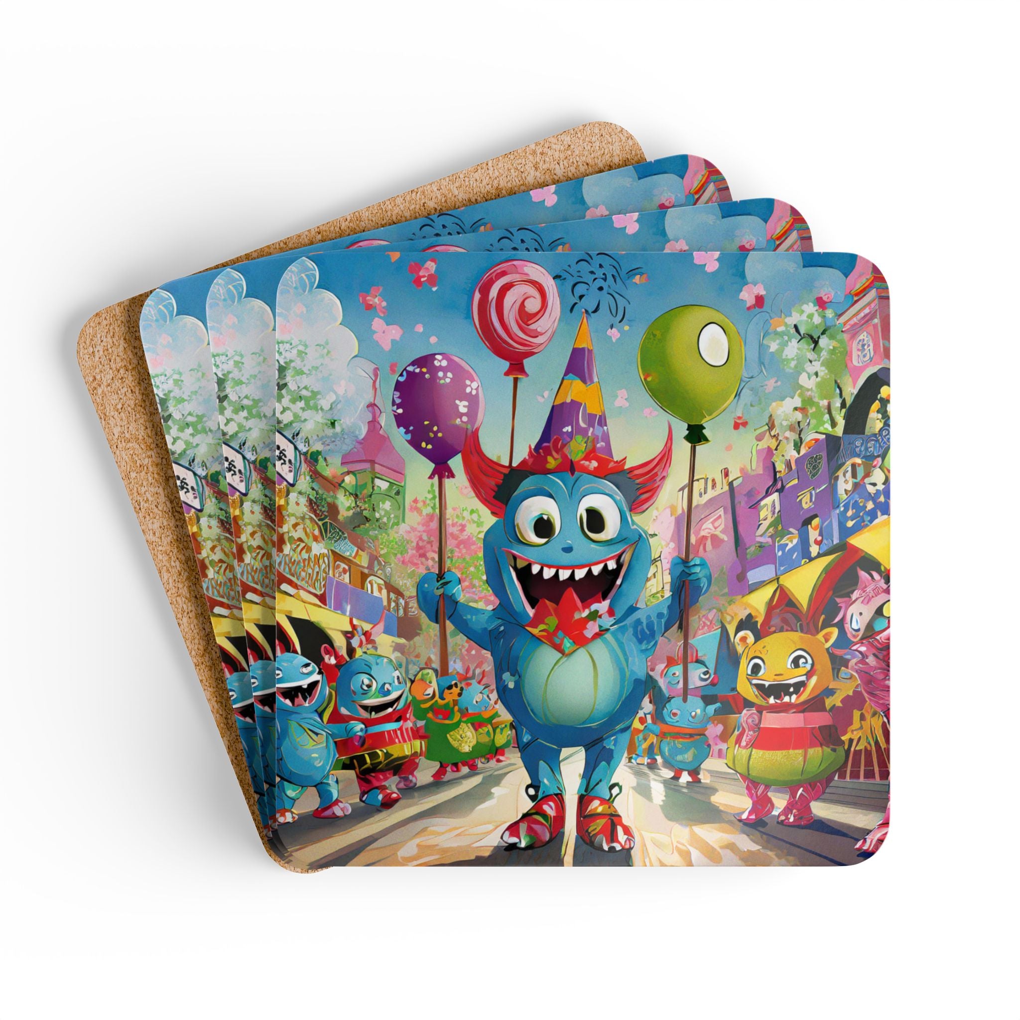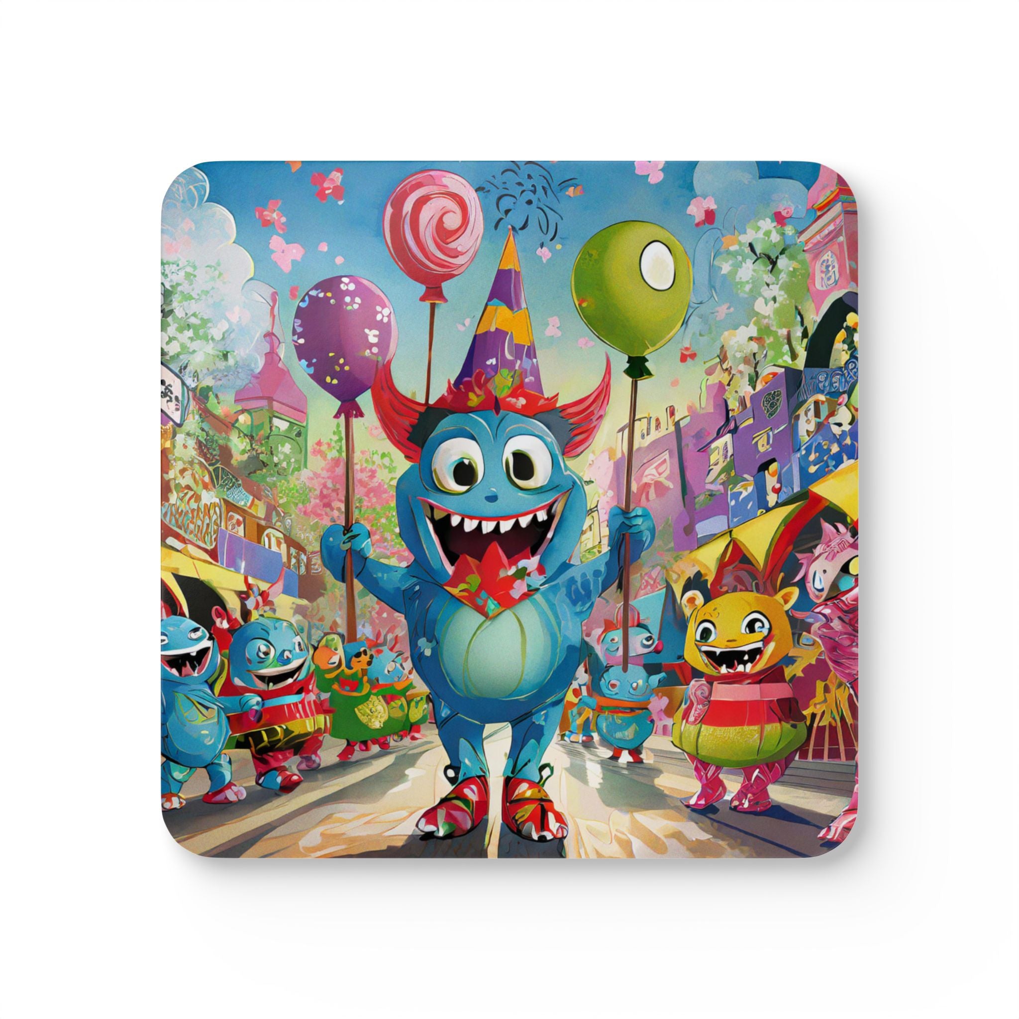 Artwork created, designed and digitally remastered by Sarasvati Designs. In this whimsical Halloween scene, a funny blue clownish monster takes center stage. His wide eyes bulge with playful mischief, and his tongue sticks out in a cheeky display. He waves balloons on sticks above his head, adding to the festive chaos. Around him, other crazy and colorful monsters join in the parade, each one more bizarre than the next. The scene is full of energy, with streamers and confetti flying through the air, capturing the spirit of a joyful, monster-filled celebration.