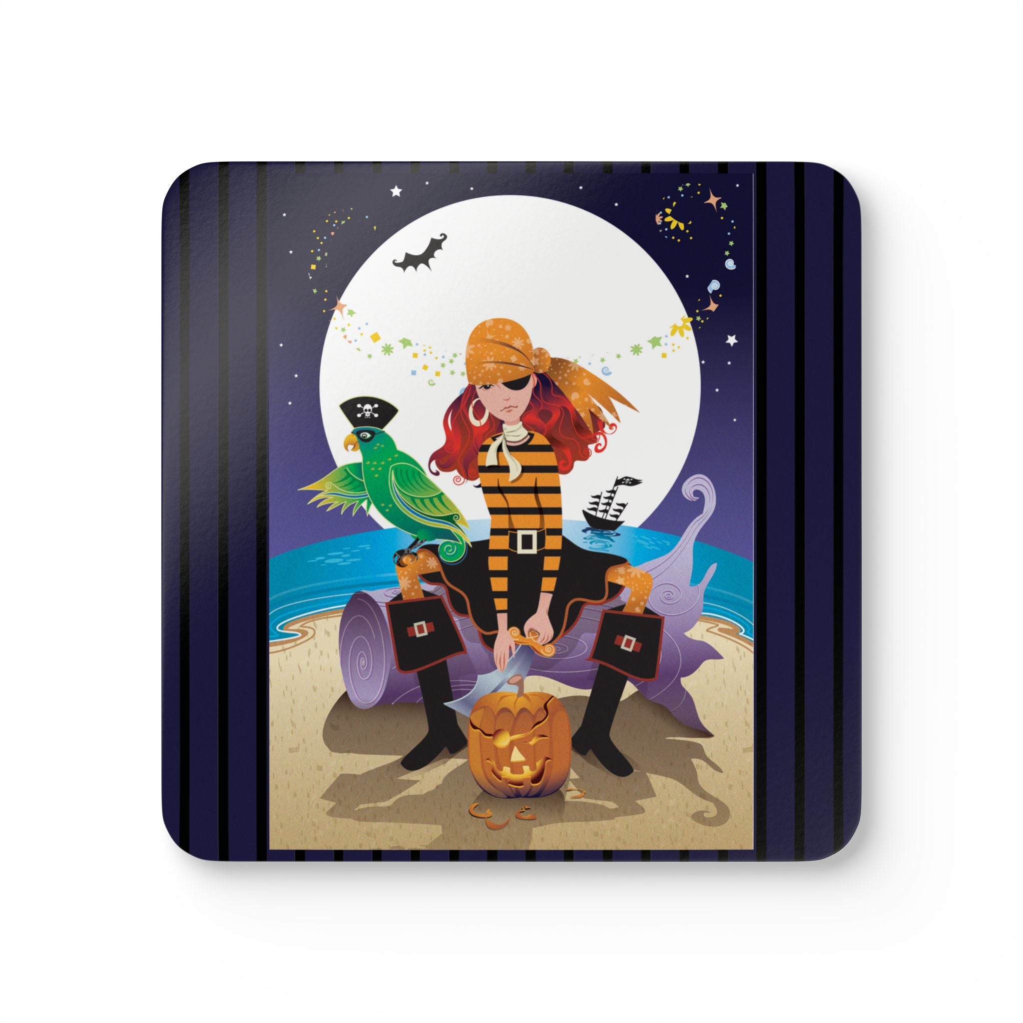 Artwork created, designed and digitally remastered by Sarasvati Designs. A teenage young woman, dressed as a pirate, sits on a moonlit beach embodying adventure and mystery. She wears a black skirt, knee-high boots, a brown and orange shirt, and an orange scarf tied as a pirate bandana, while a large green parrot perches on her right knee, wearing a black pirate's hat adorned with a skull and crossbones. The full moon casts a bright glow behind her, with a bat silhouetted against it. The ocean stretches out behind, where a pirate ship is faintly visible on the horizon. Holding a large knife in her right hand, she has just carved the pumpkin in front of her, its eerie grin adding to the spooky atmosphere of the Halloween night.