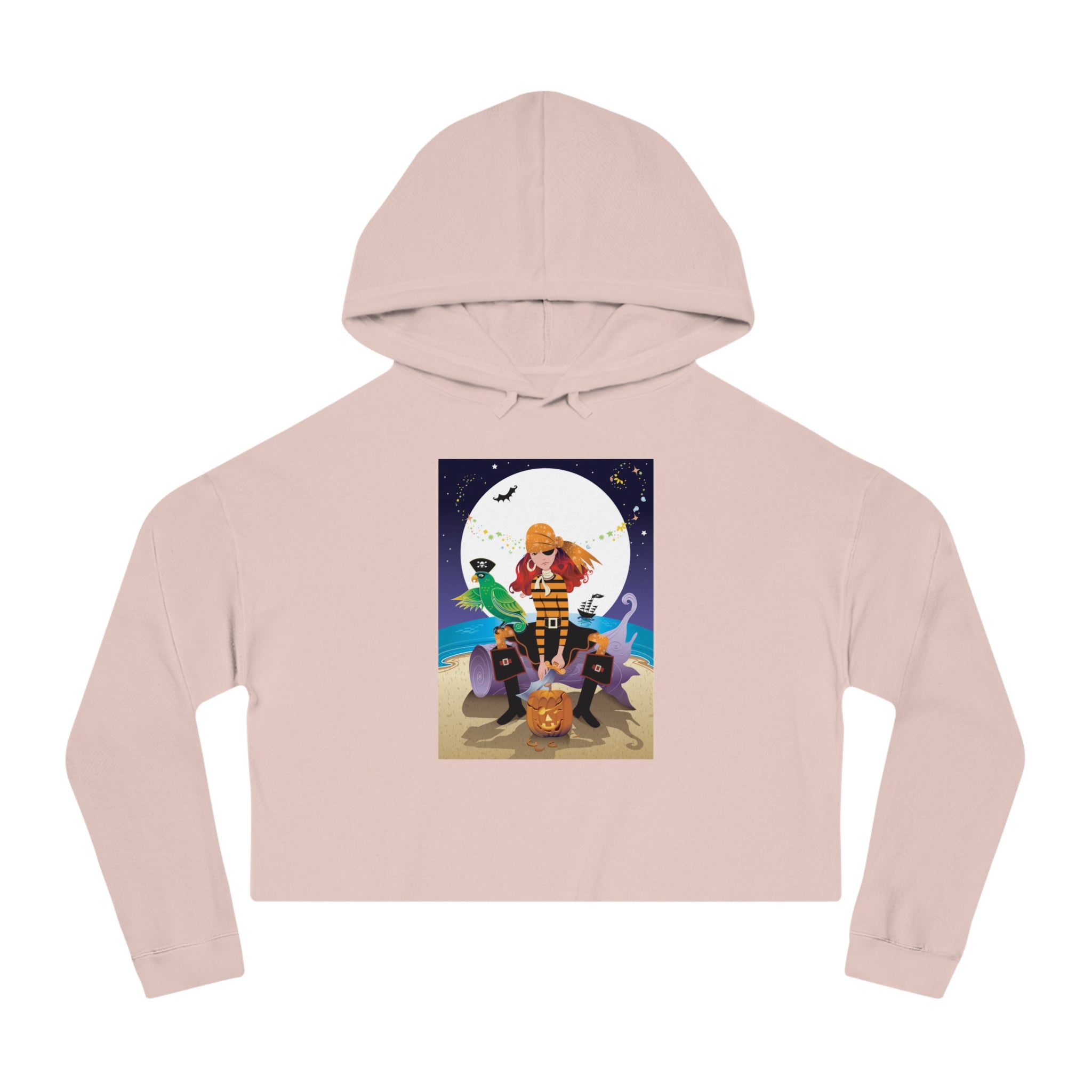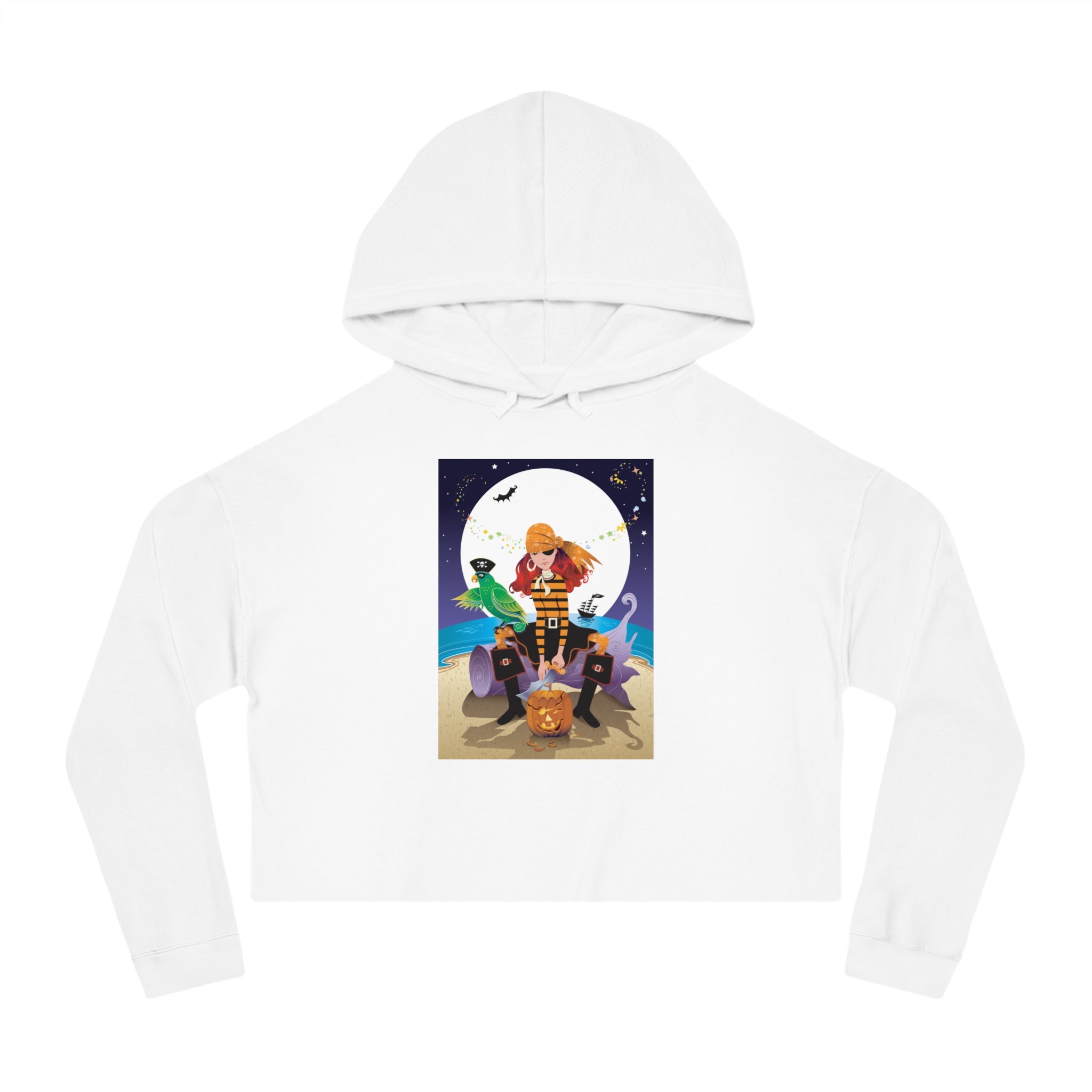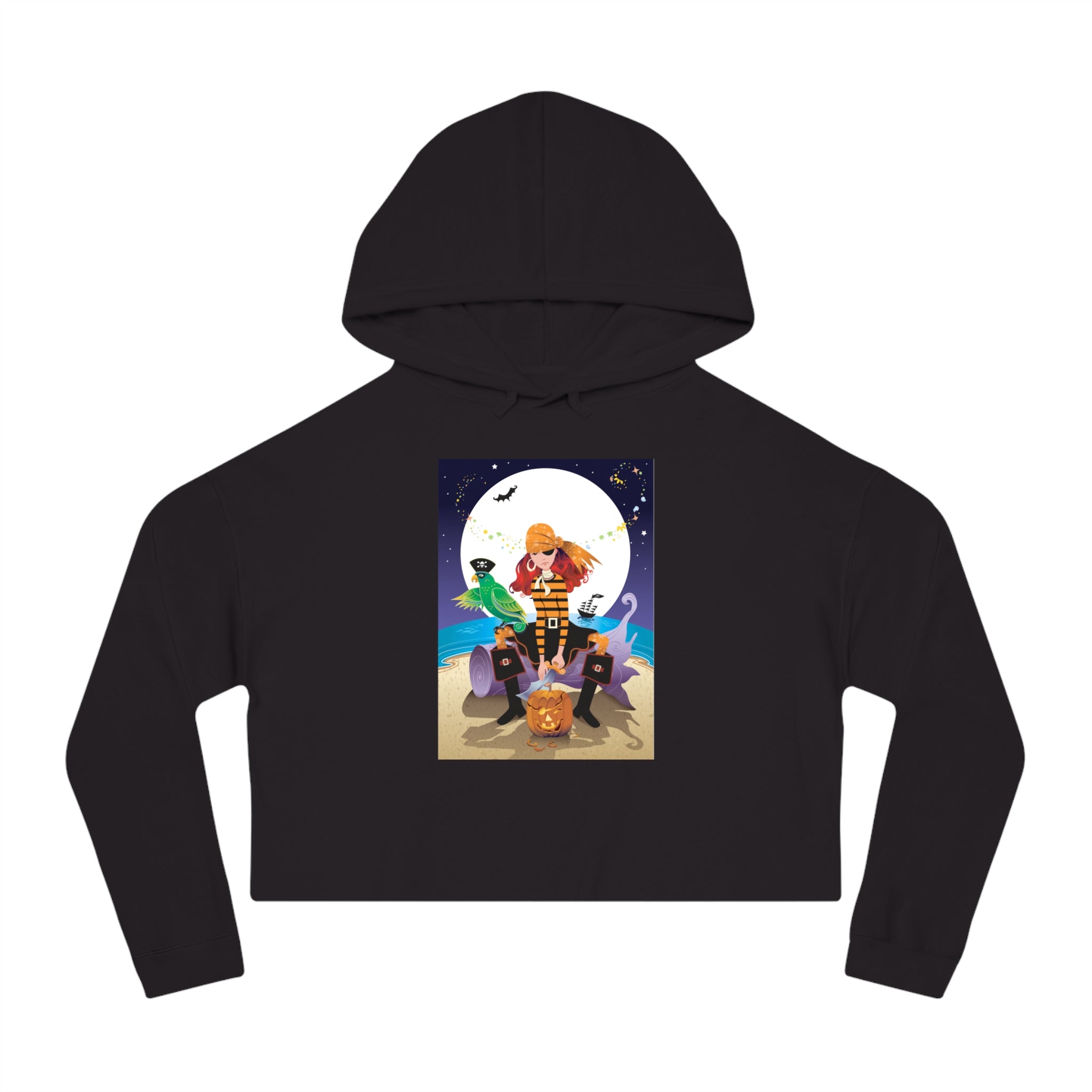 Artwork created, designed and digitally remastered by Sarasvati Designs. A teenage young woman, dressed as a pirate, sits on a moonlit beach embodying adventure and mystery. She wears a black skirt, knee-high boots, a brown and orange shirt, and an orange scarf tied as a pirate bandana, while a large green parrot perches on her right knee, wearing a black pirate's hat adorned with a skull and crossbones. The full moon casts a bright glow behind her, with a bat silhouetted against it. The ocean stretches out behind, where a pirate ship is faintly visible on the horizon. Holding a large knife in her right hand, she has just carved the pumpkin in front of her, its eerie grin adding to the spooky atmosphere of the Halloween night.