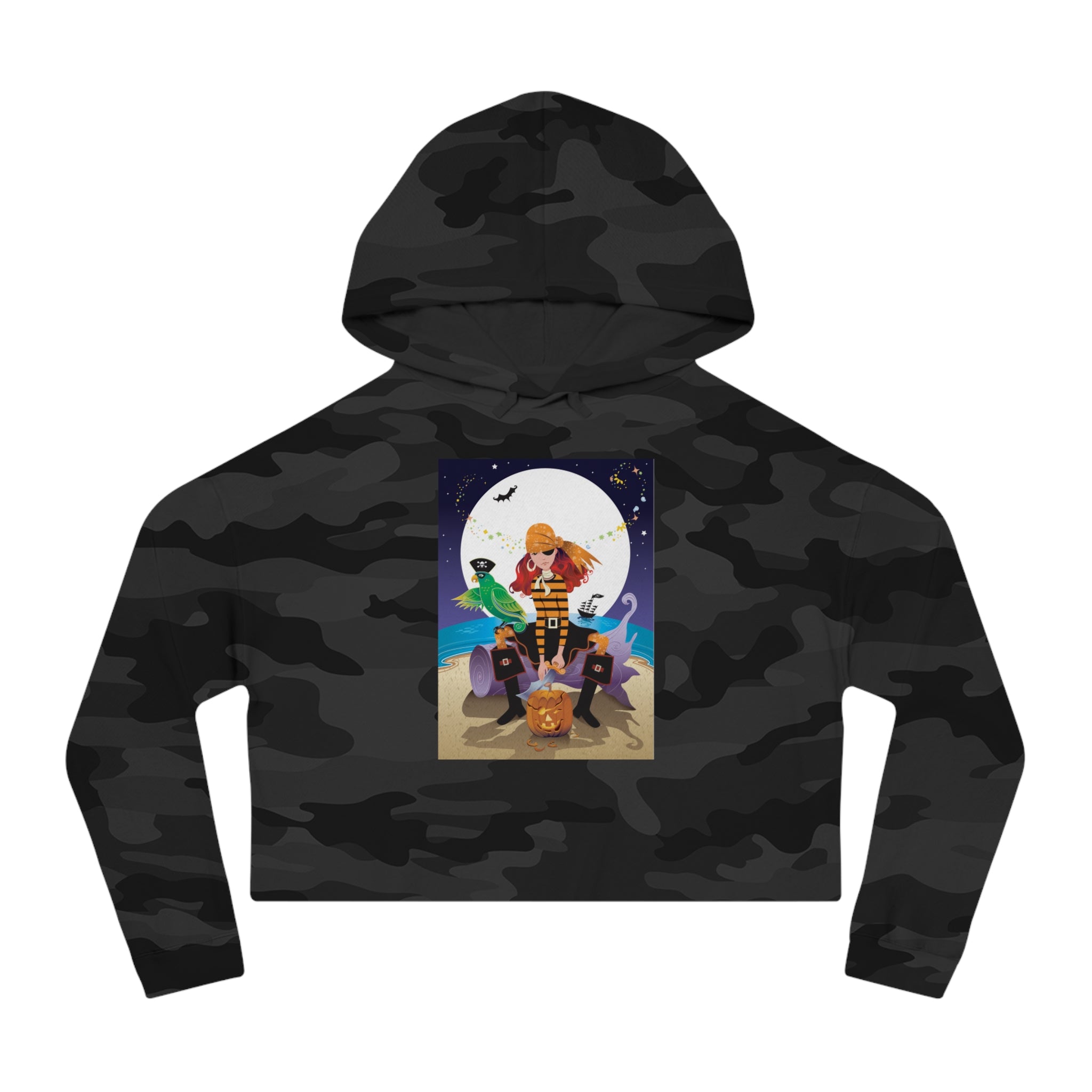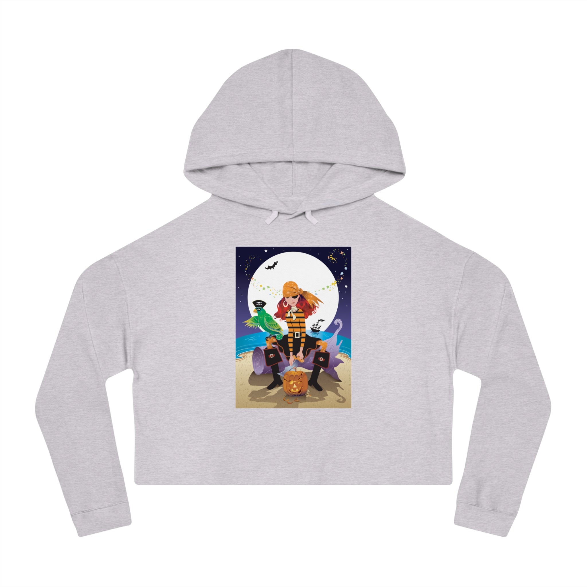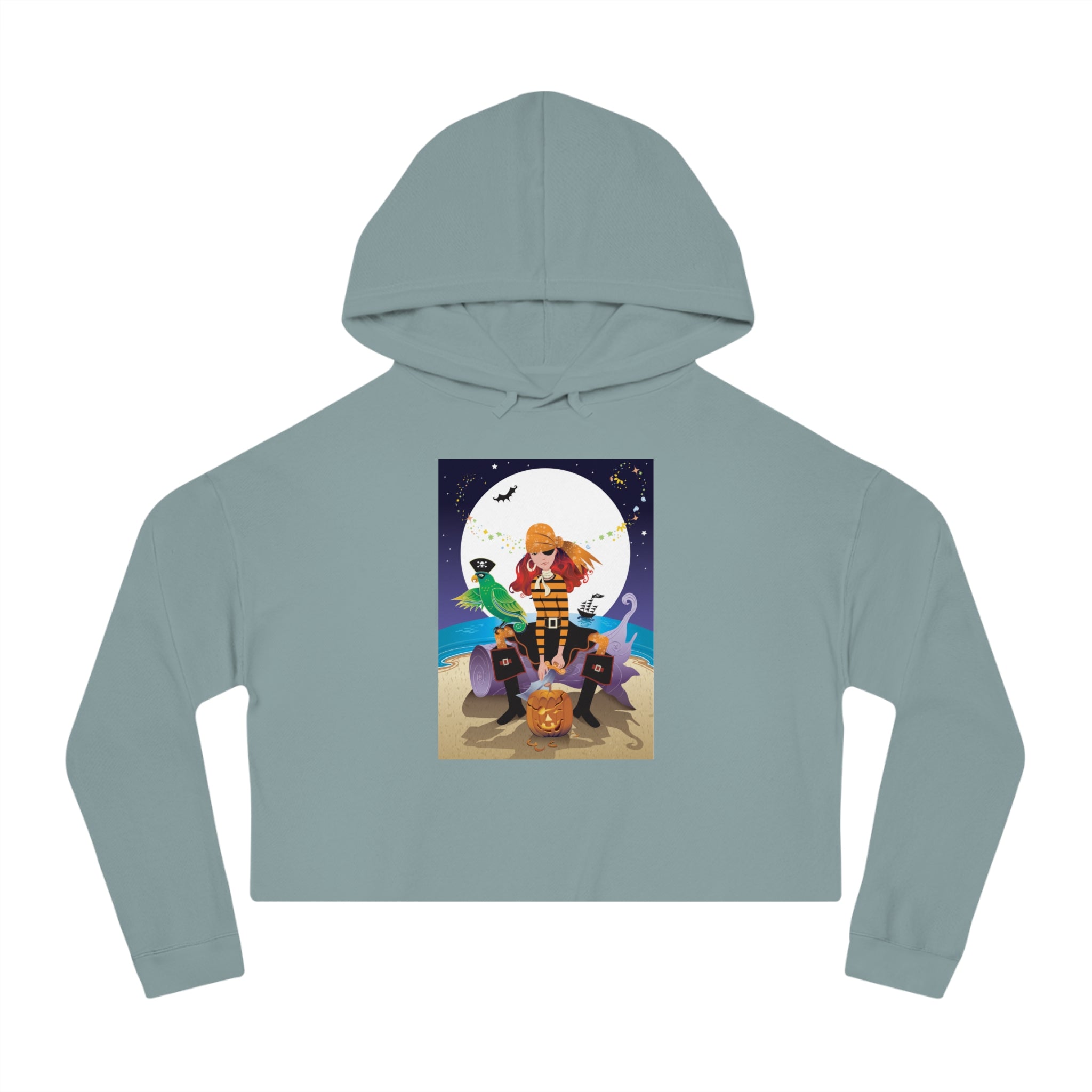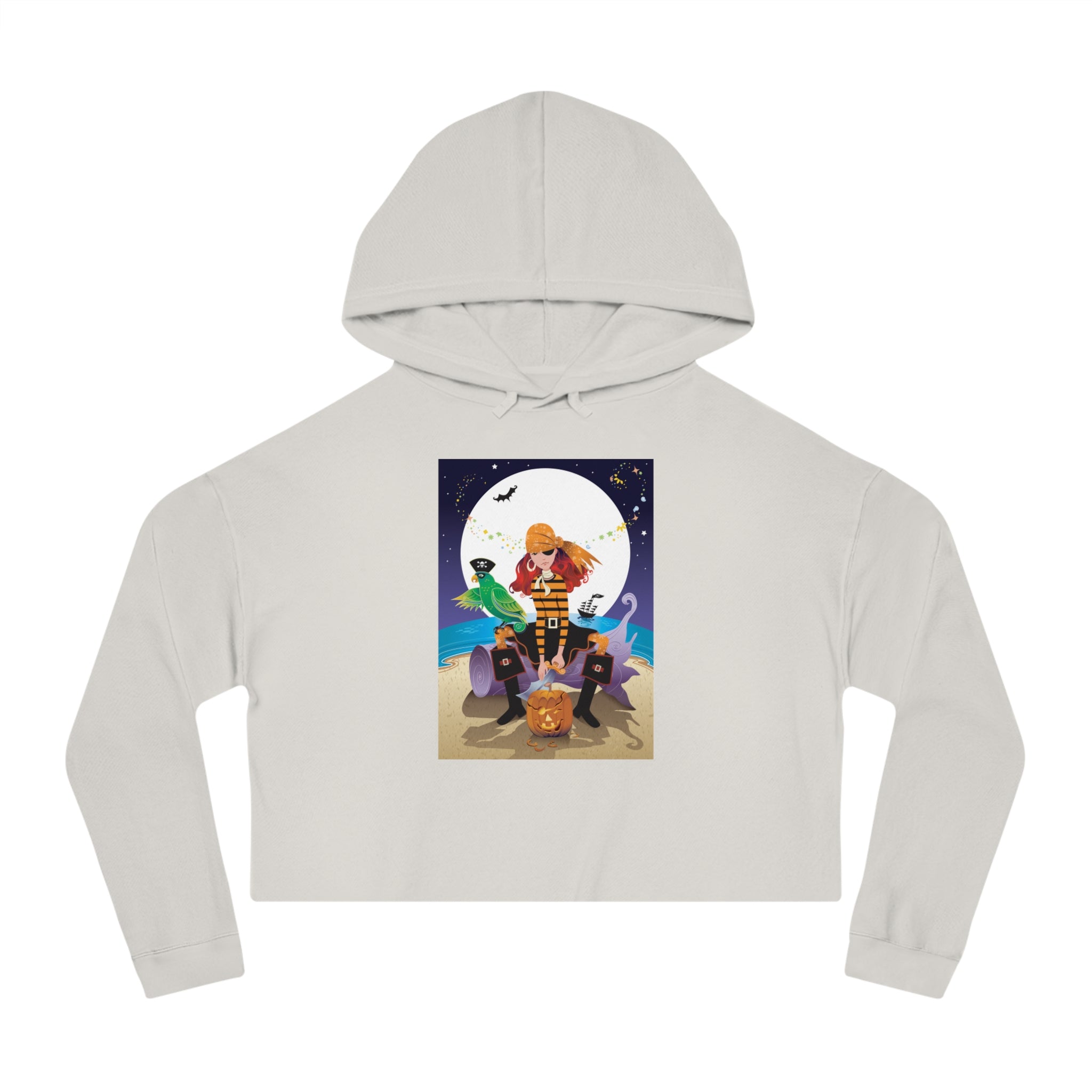 Artwork created, designed and digitally remastered by Sarasvati Designs. A teenage young woman, dressed as a pirate, sits on a moonlit beach embodying adventure and mystery. She wears a black skirt, knee-high boots, a brown and orange shirt, and an orange scarf tied as a pirate bandana, while a large green parrot perches on her right knee, wearing a black pirate's hat adorned with a skull and crossbones. The full moon casts a bright glow behind her, with a bat silhouetted against it. The ocean stretches out behind, where a pirate ship is faintly visible on the horizon. Holding a large knife in her right hand, she has just carved the pumpkin in front of her, its eerie grin adding to the spooky atmosphere of the Halloween night.