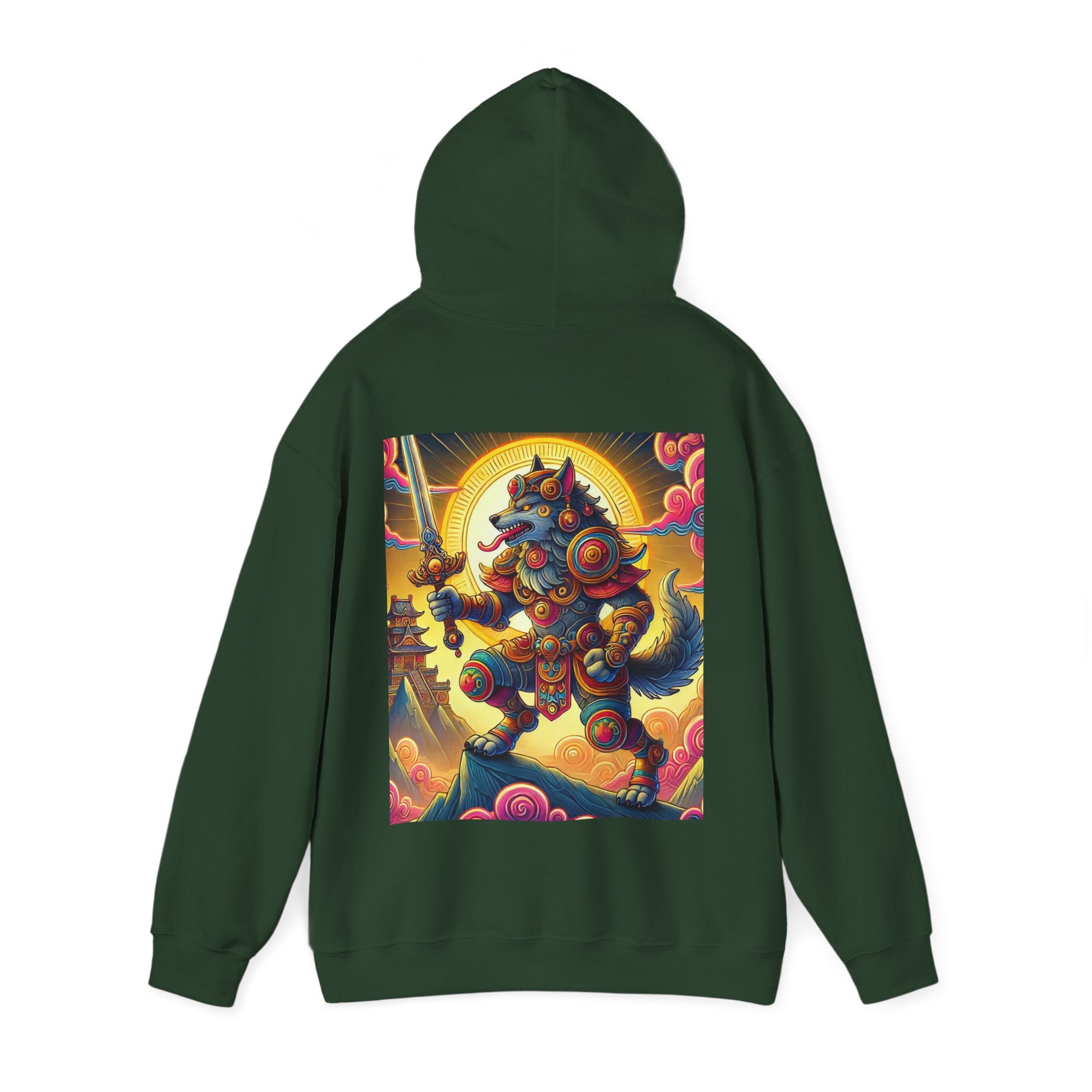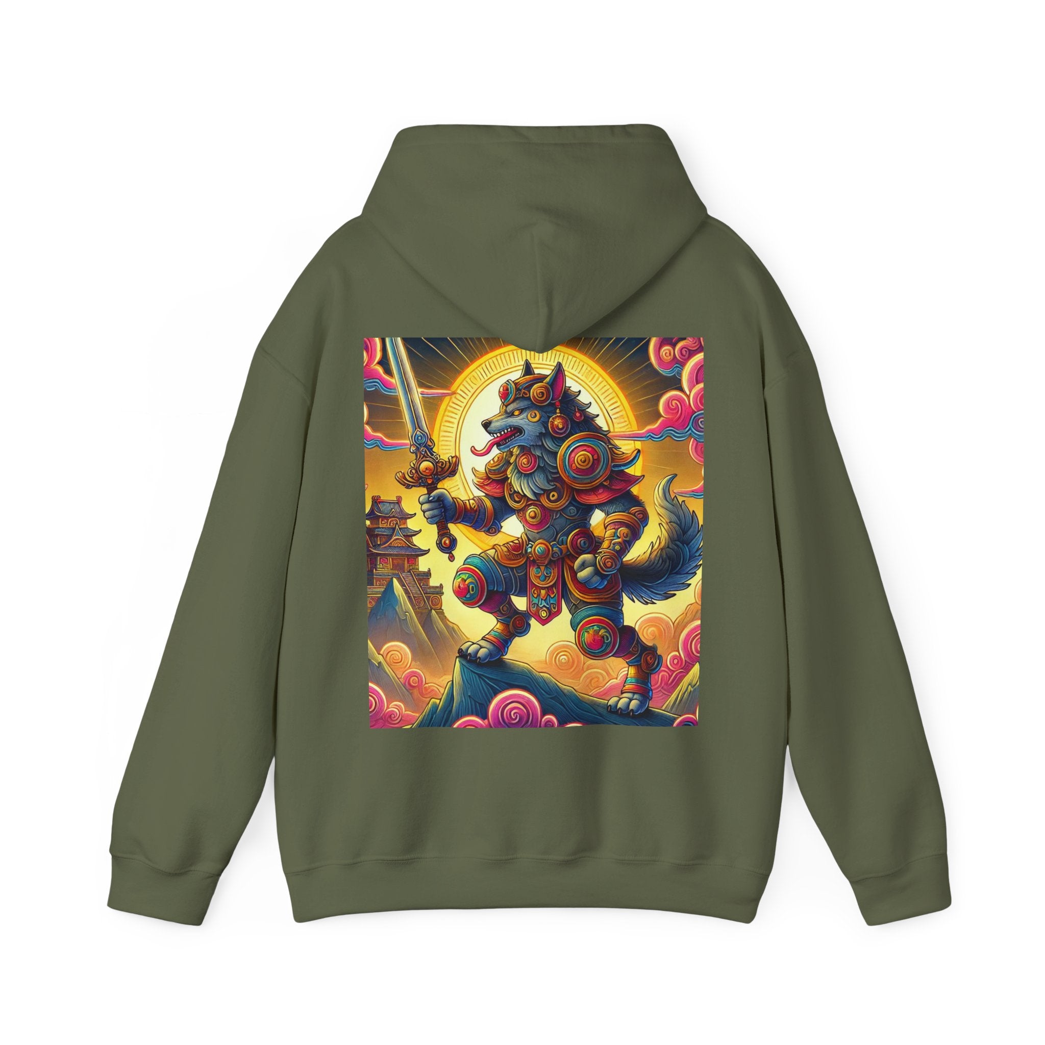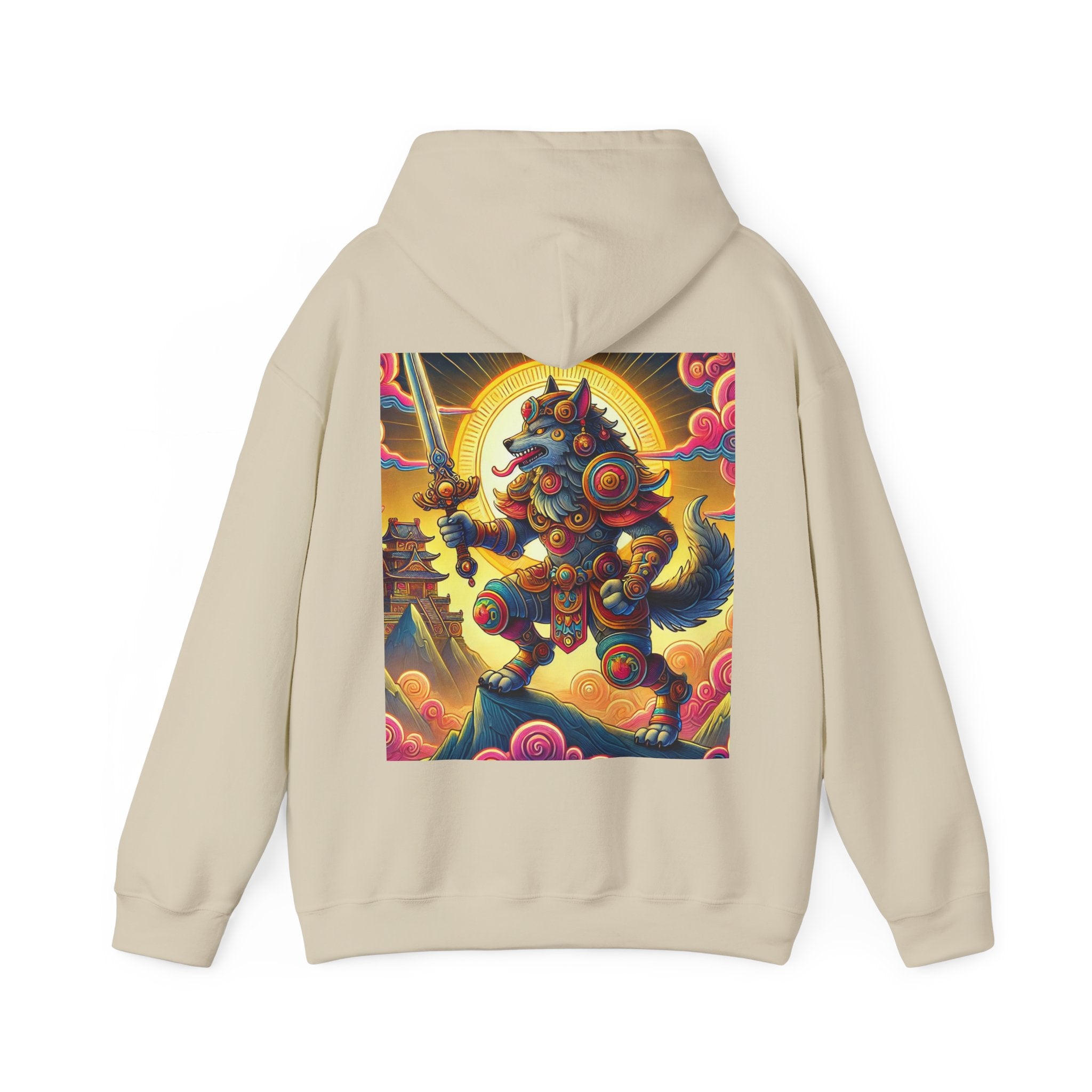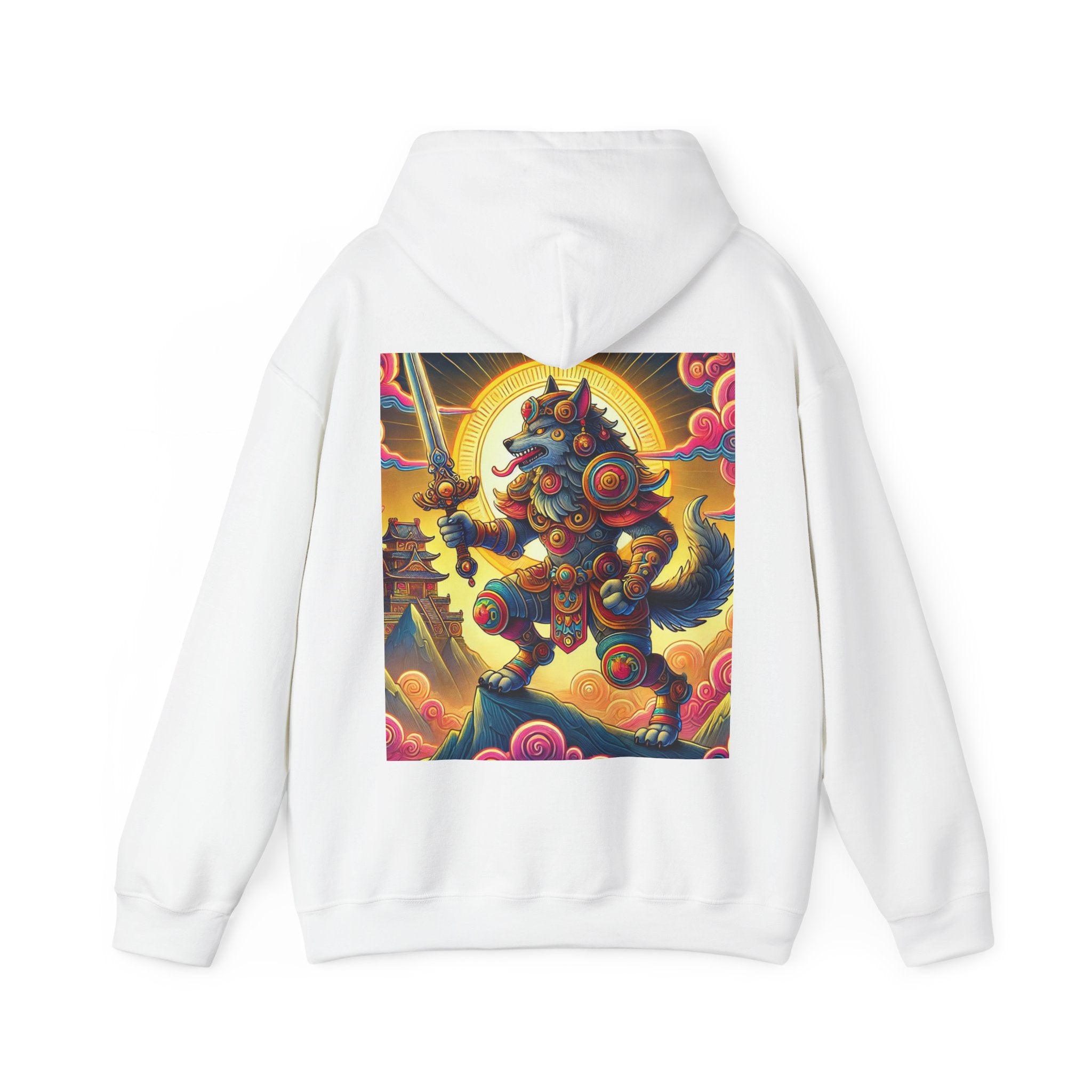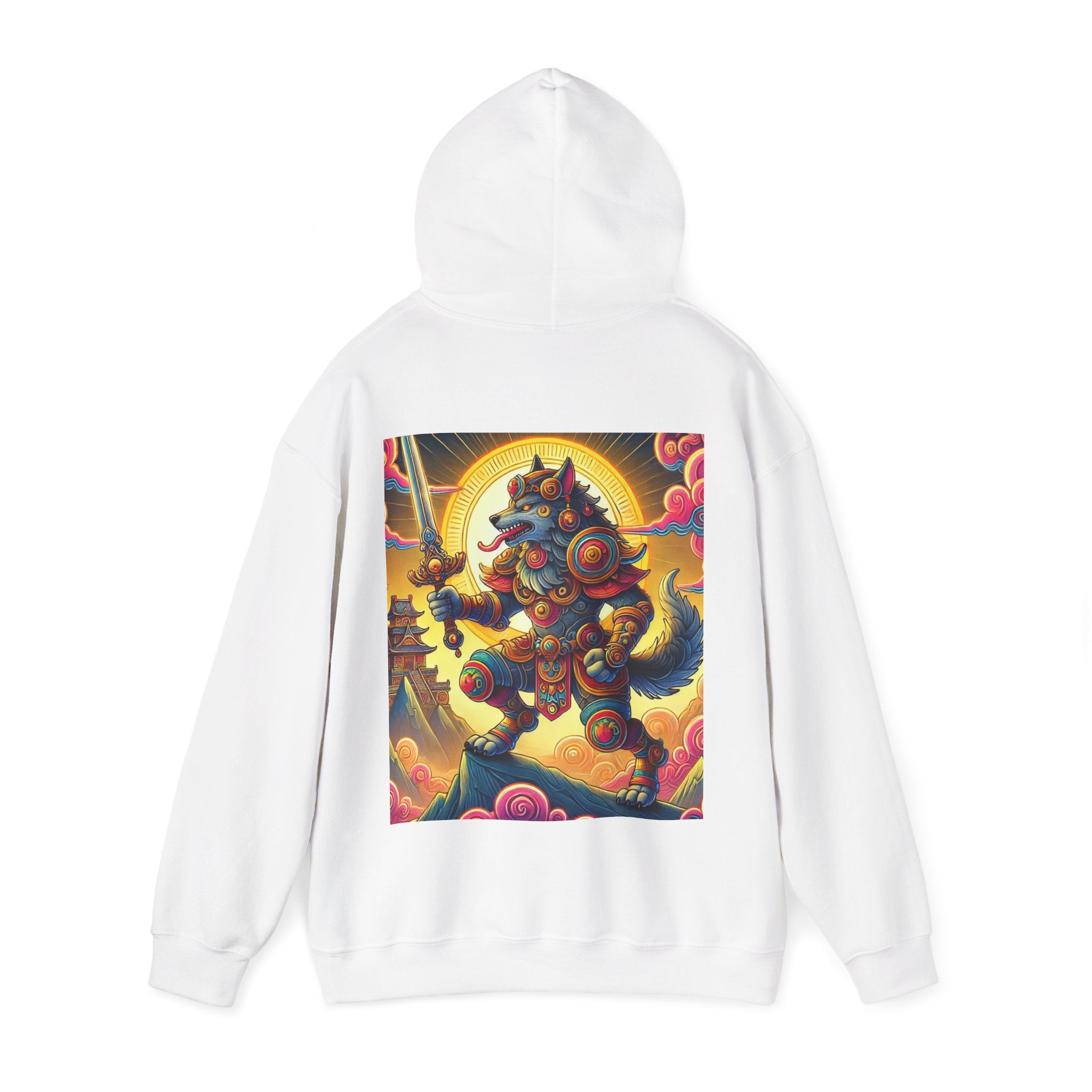 Mountain Wolf – Heavy Blend™ Hooded Sweatshirt brings mythic strength and high-peak serenity together in one atmospheric piece. At the center of the artwork stands a majestic wolf clad in intricate battle armor, poised with an ornate sword resting confidently in its grasp. It overlooks the world from a towering mountain summit, where a radiant golden sun casts warm light across swirling clouds painted in rich, shifting colors. Far in the distance, sacred temples and rugged mountaintops rise through the haze, creating a landscape that feels equal parts legend and spiritual guardianship. The scene captures a quiet, commanding power—a timeless protector watching over the world from the heights.