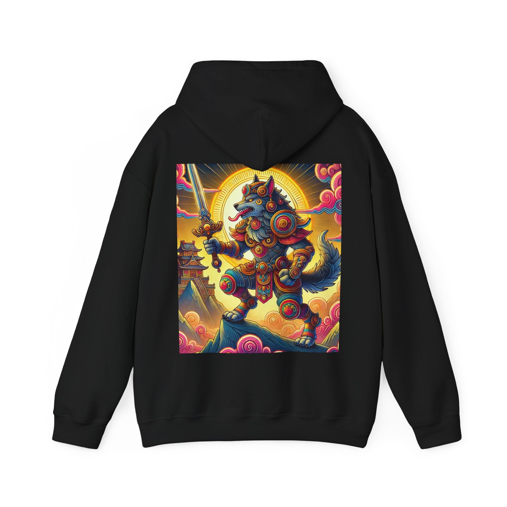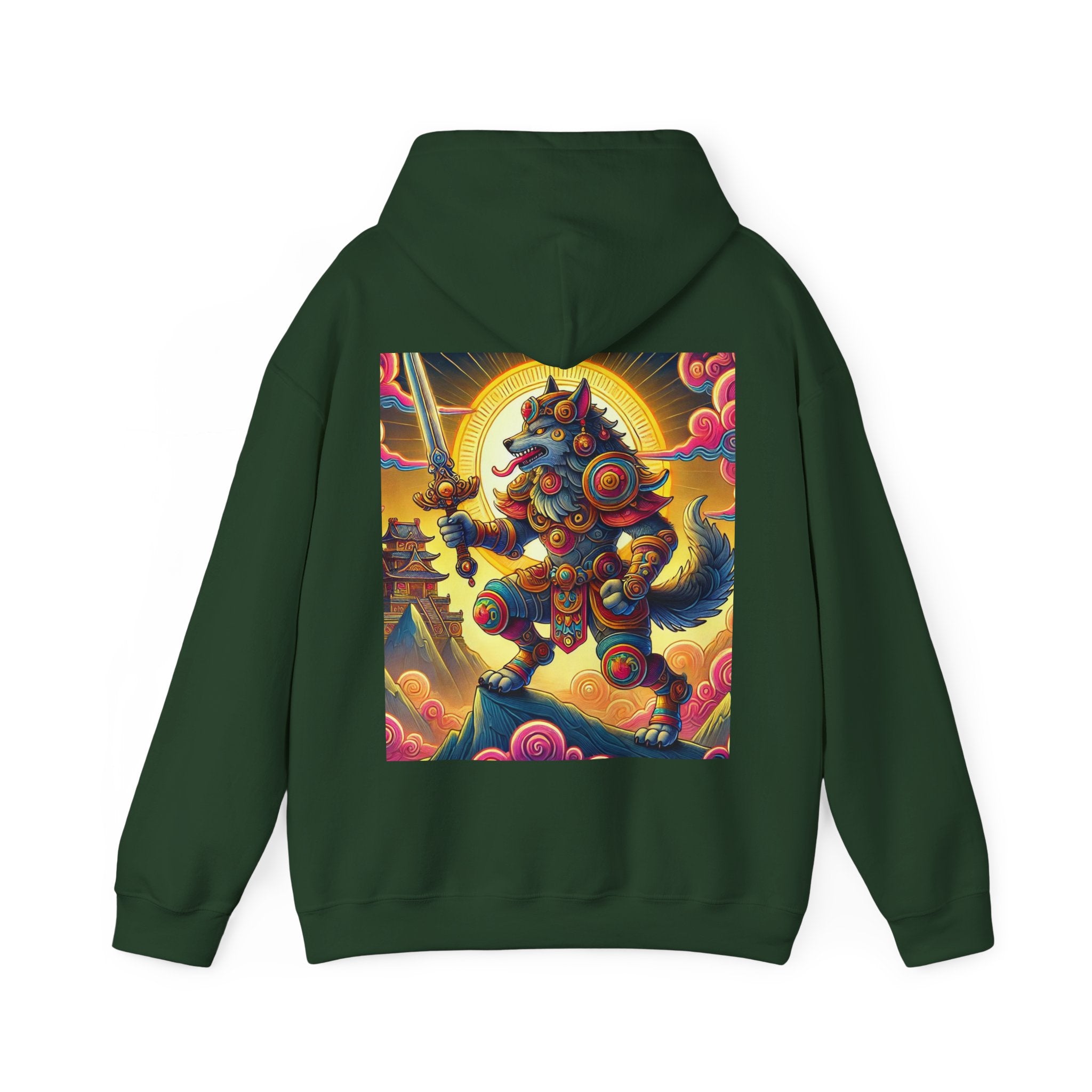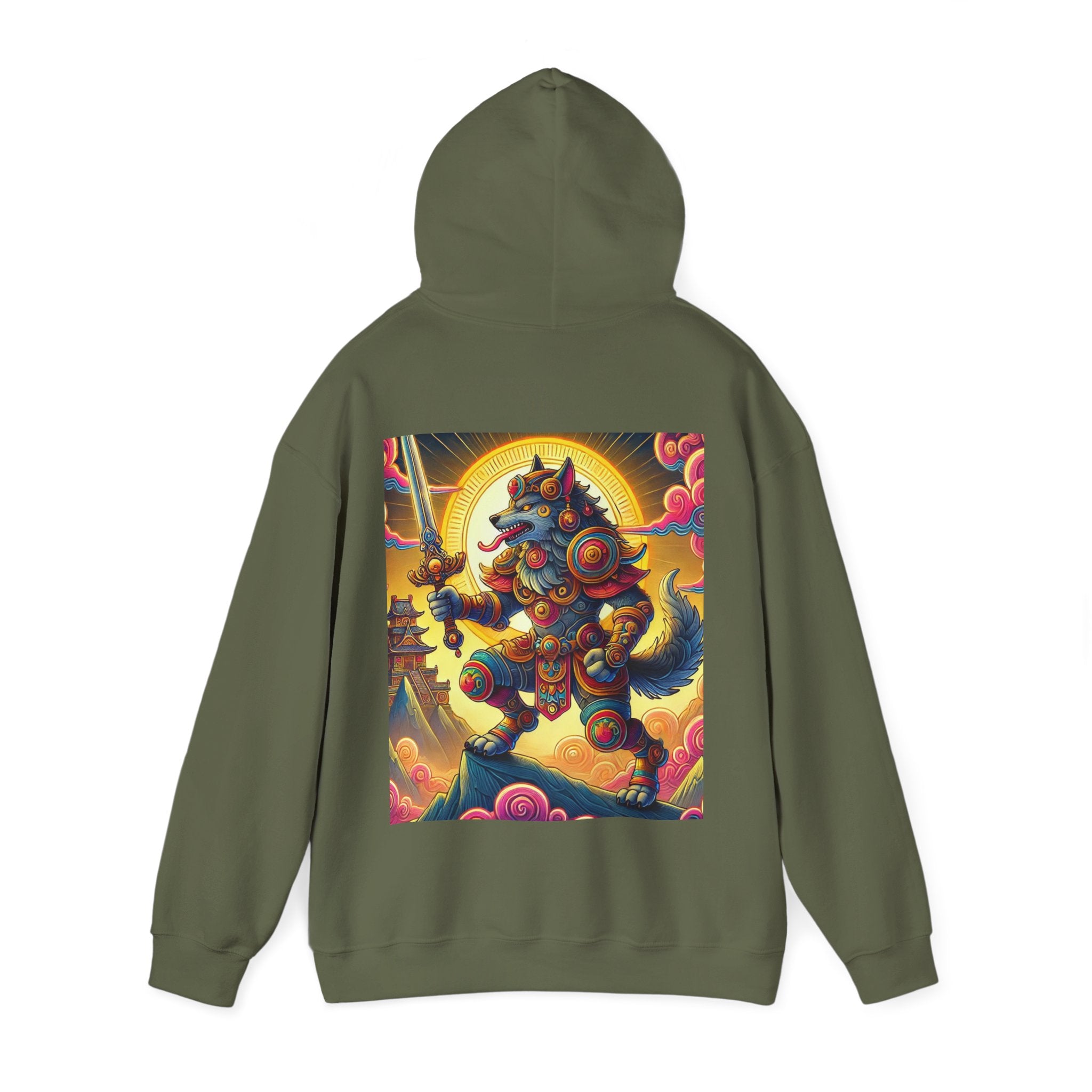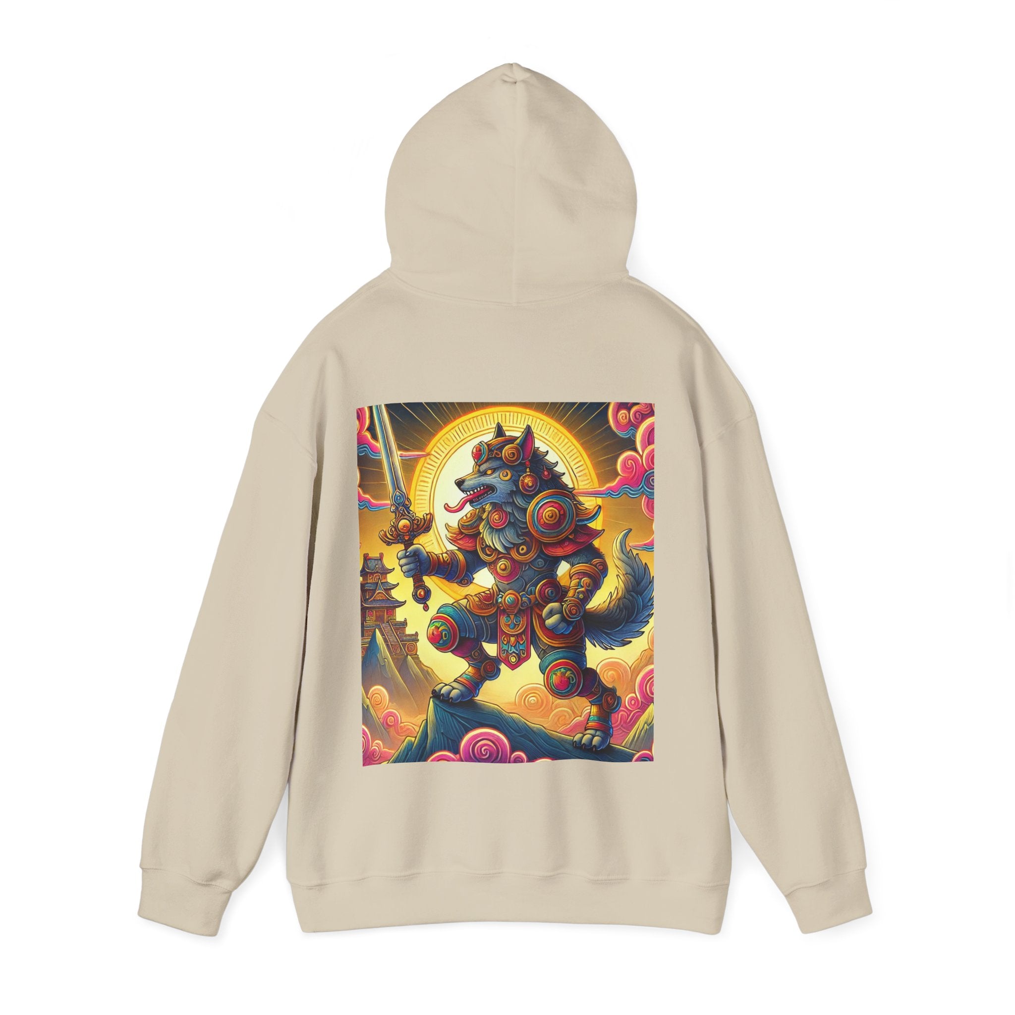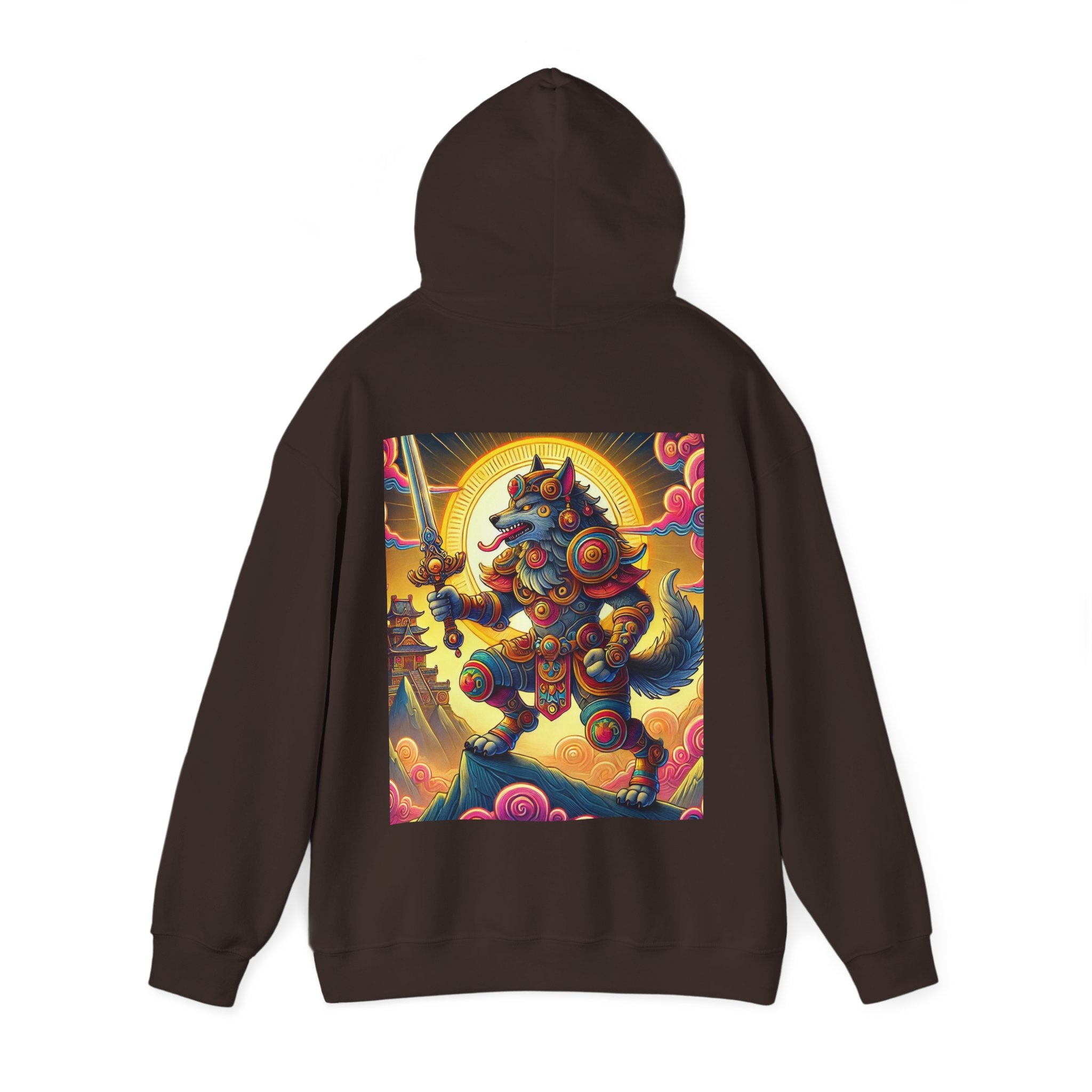 Mountain Wolf – Heavy Blend™ Hooded Sweatshirt brings mythic strength and high-peak serenity together in one atmospheric piece. At the center of the artwork stands a majestic wolf clad in intricate battle armor, poised with an ornate sword resting confidently in its grasp. It overlooks the world from a towering mountain summit, where a radiant golden sun casts warm light across swirling clouds painted in rich, shifting colors. Far in the distance, sacred temples and rugged mountaintops rise through the haze, creating a landscape that feels equal parts legend and spiritual guardianship. The scene captures a quiet, commanding power—a timeless protector watching over the world from the heights.