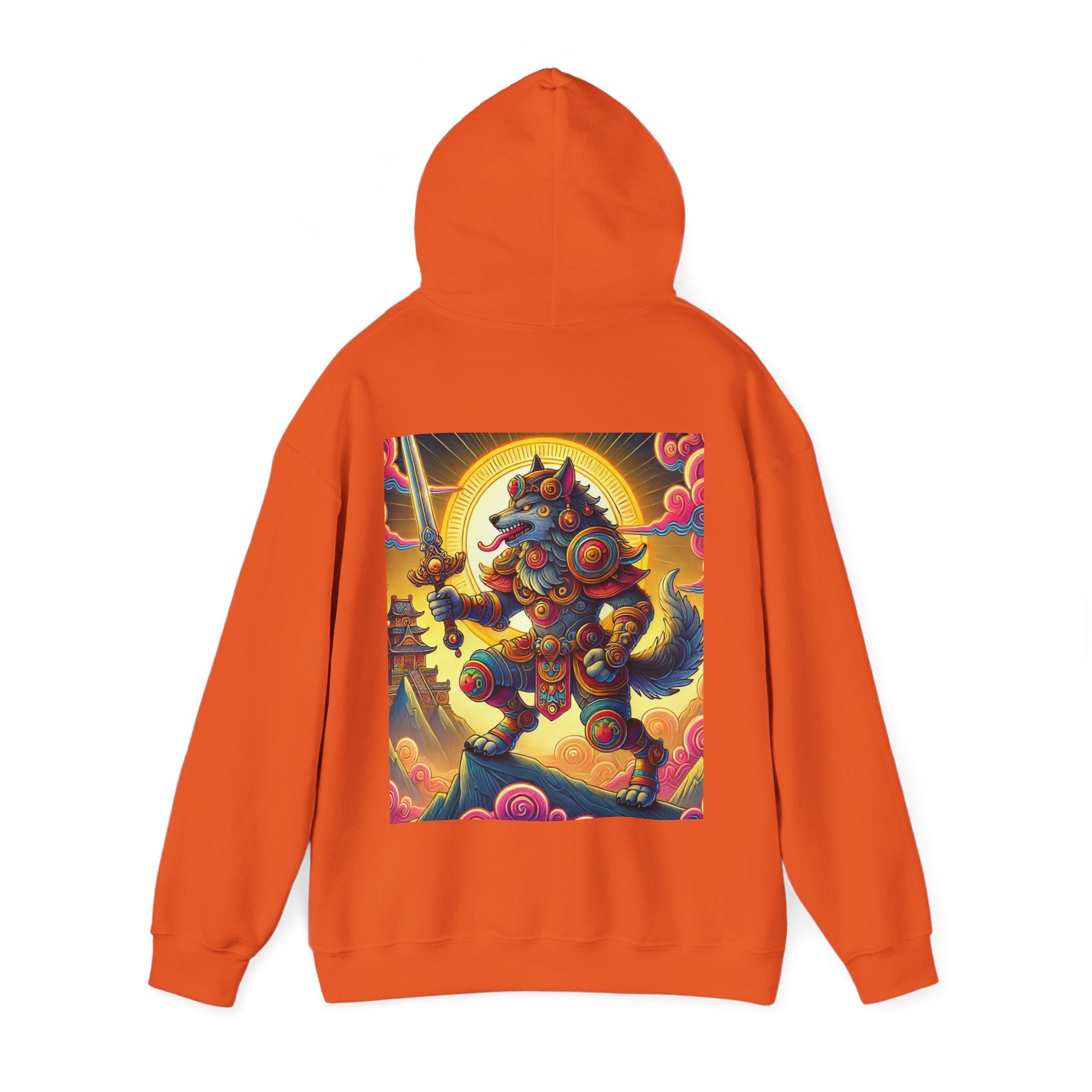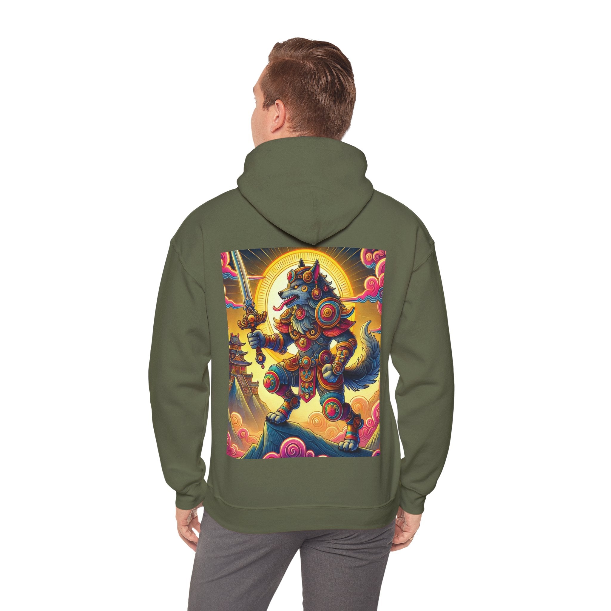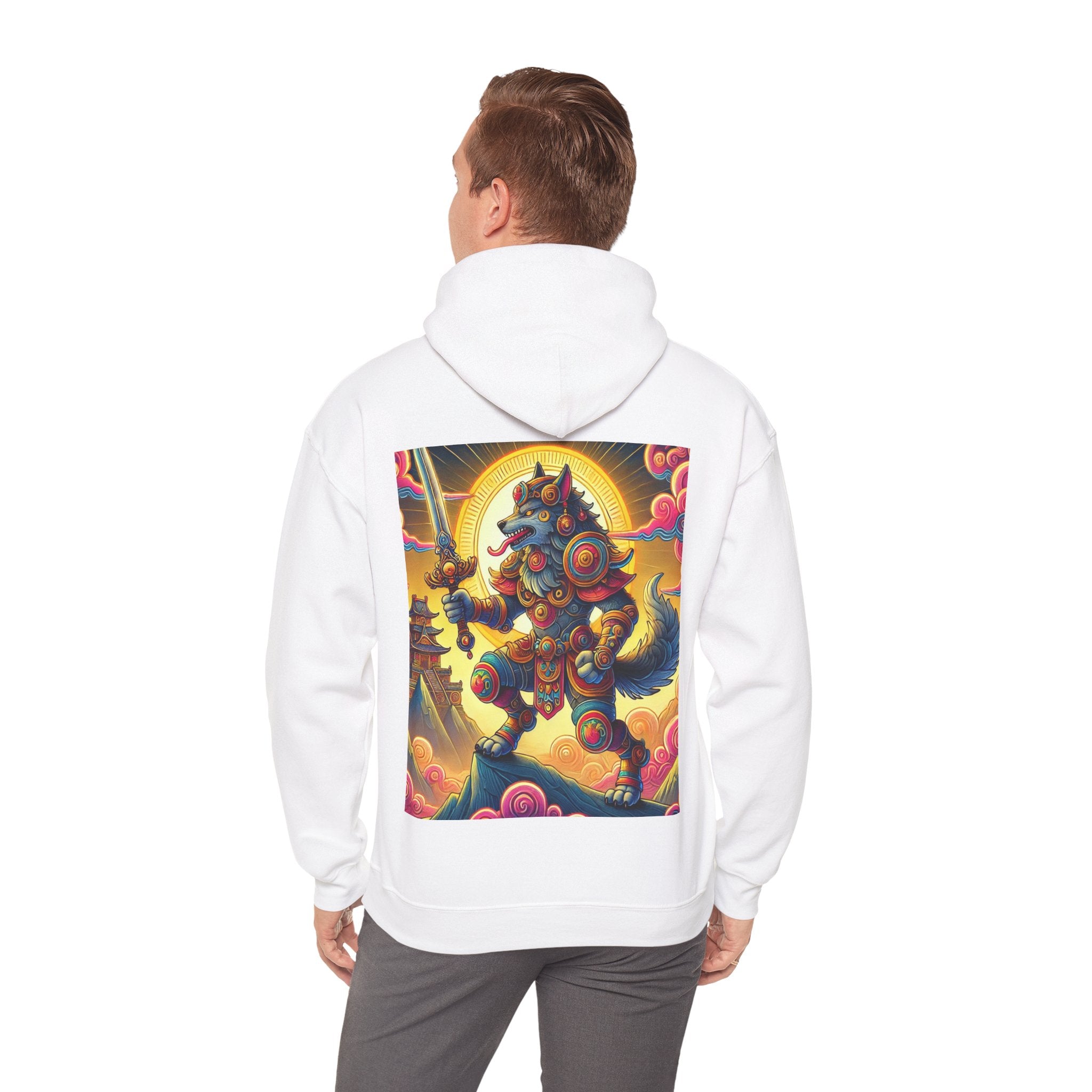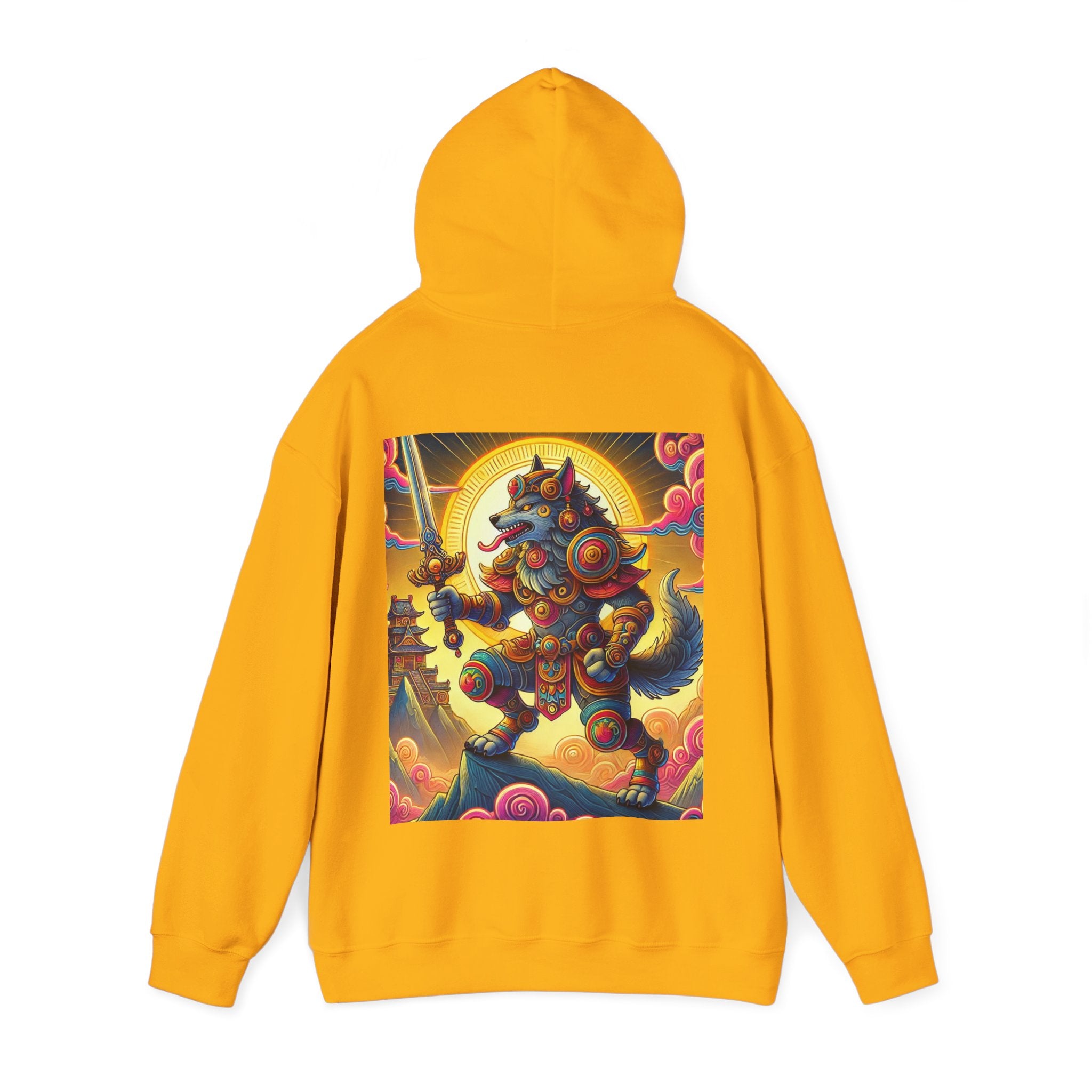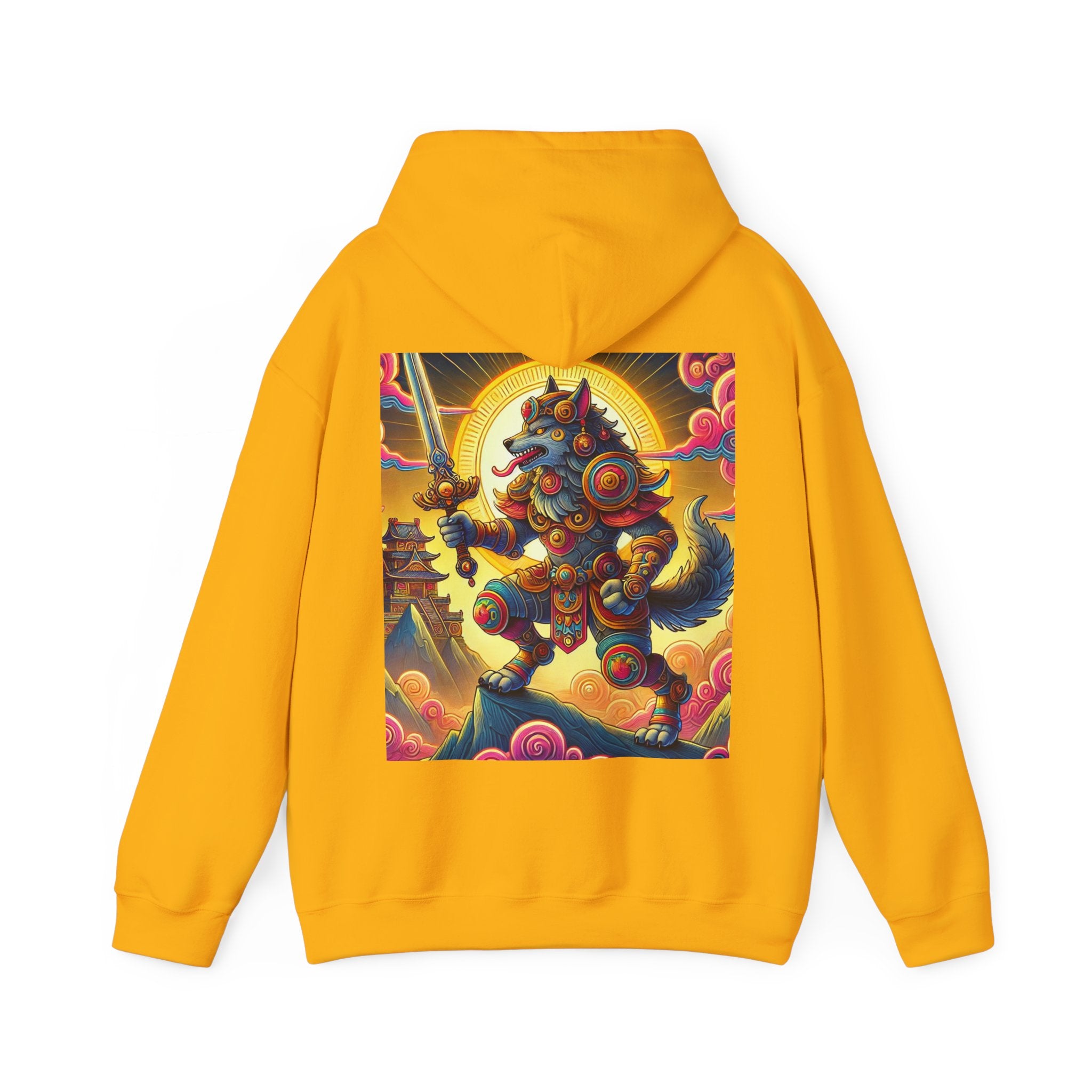 Mountain Wolf – Heavy Blend™ Hooded Sweatshirt brings mythic strength and high-peak serenity together in one atmospheric piece. At the center of the artwork stands a majestic wolf clad in intricate battle armor, poised with an ornate sword resting confidently in its grasp. It overlooks the world from a towering mountain summit, where a radiant golden sun casts warm light across swirling clouds painted in rich, shifting colors. Far in the distance, sacred temples and rugged mountaintops rise through the haze, creating a landscape that feels equal parts legend and spiritual guardianship. The scene captures a quiet, commanding power—a timeless protector watching over the world from the heights.