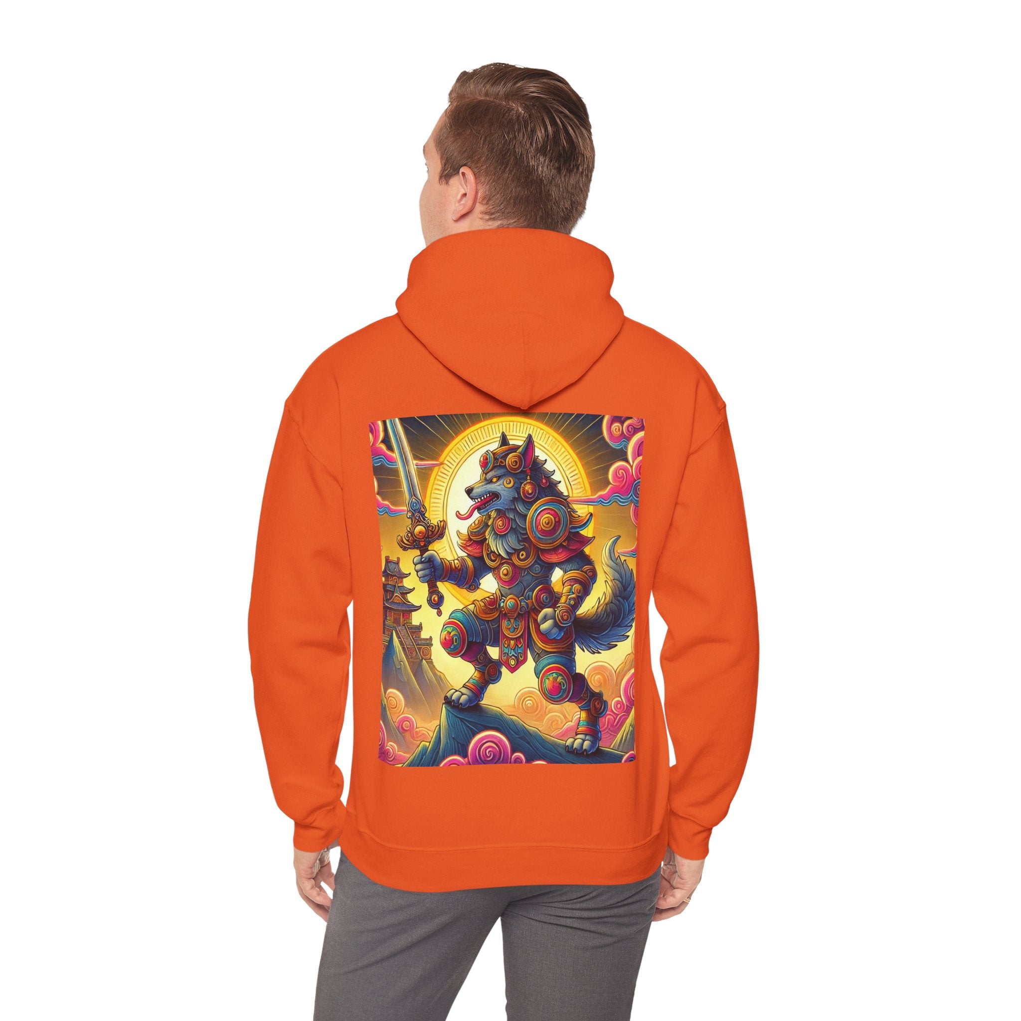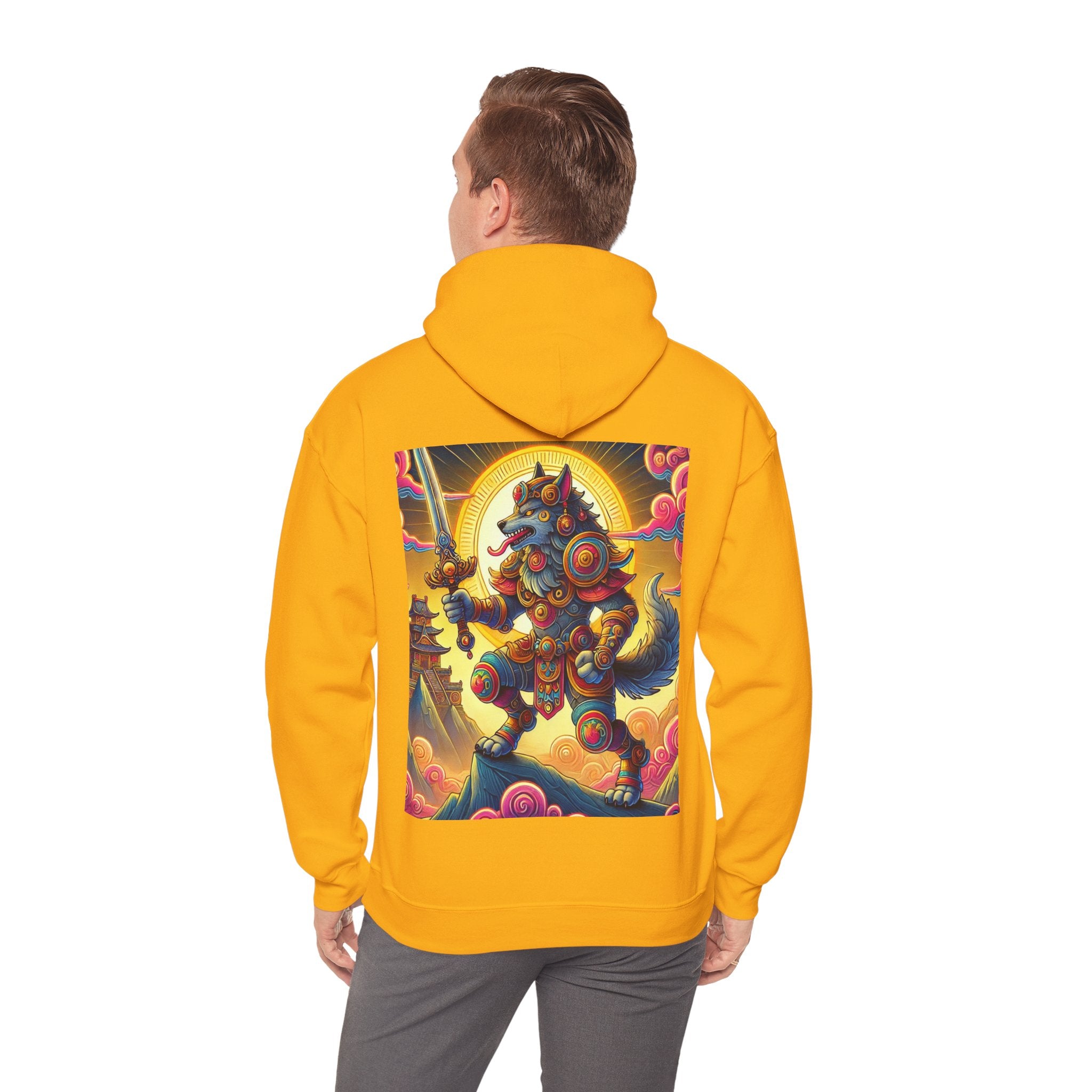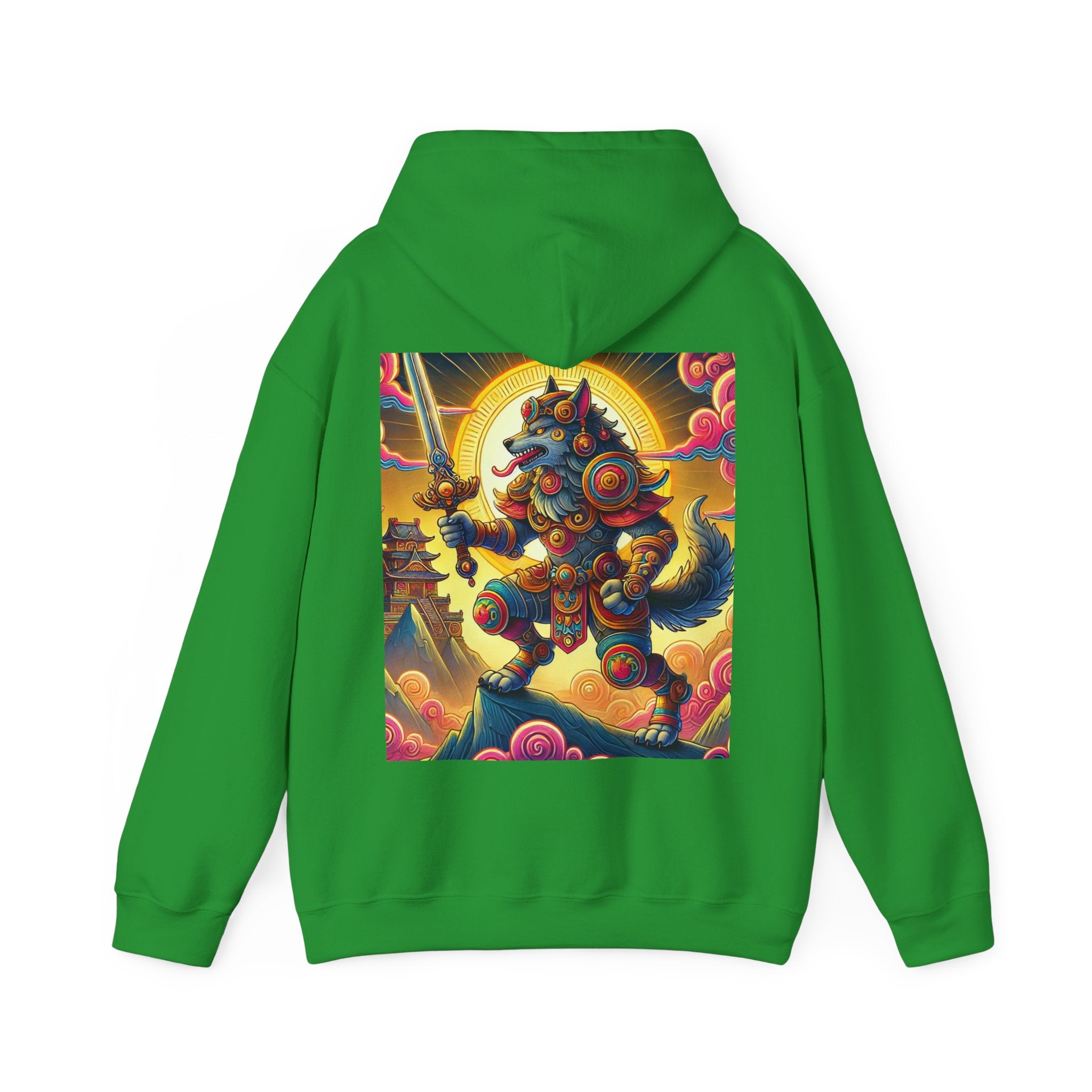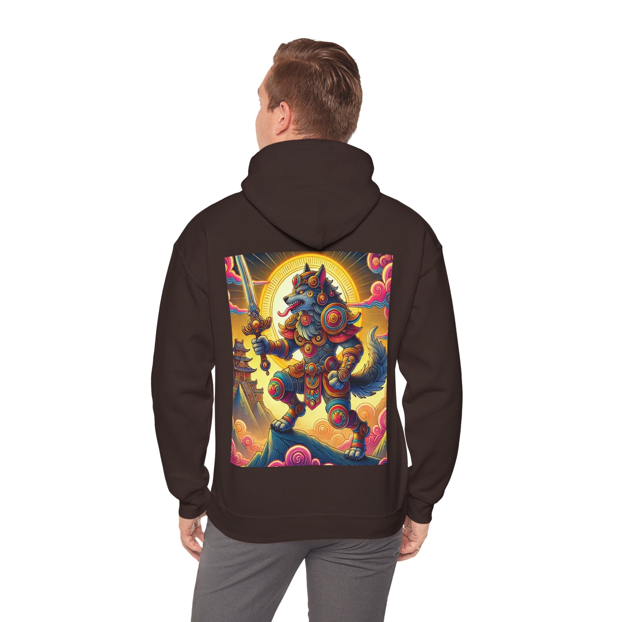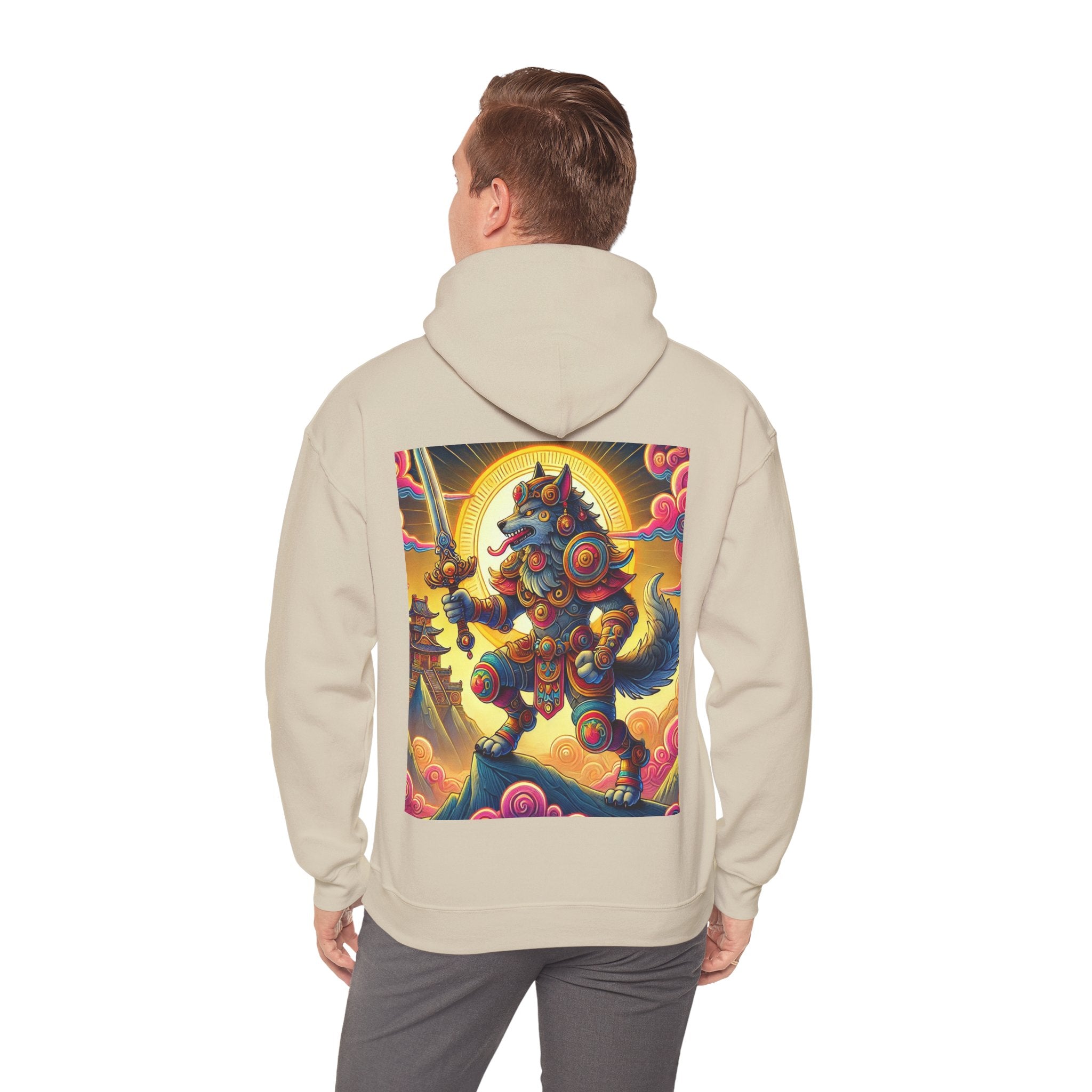 Mountain Wolf – Heavy Blend™ Hooded Sweatshirt brings mythic strength and high-peak serenity together in one atmospheric piece. At the center of the artwork stands a majestic wolf clad in intricate battle armor, poised with an ornate sword resting confidently in its grasp. It overlooks the world from a towering mountain summit, where a radiant golden sun casts warm light across swirling clouds painted in rich, shifting colors. Far in the distance, sacred temples and rugged mountaintops rise through the haze, creating a landscape that feels equal parts legend and spiritual guardianship. The scene captures a quiet, commanding power—a timeless protector watching over the world from the heights.