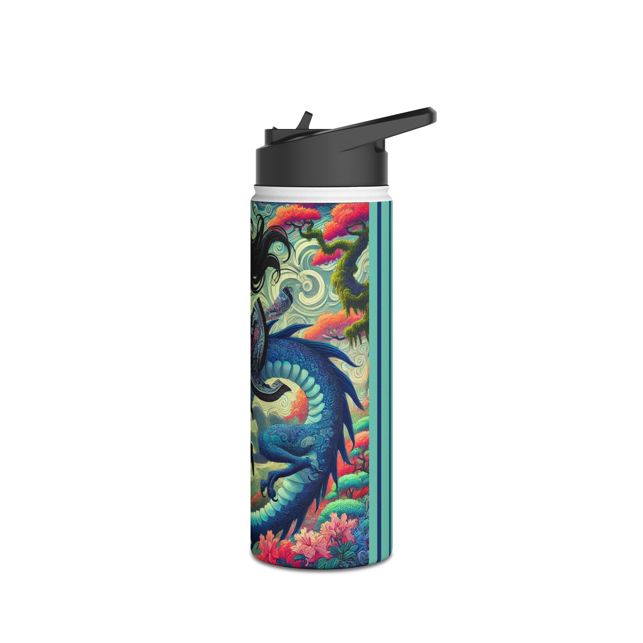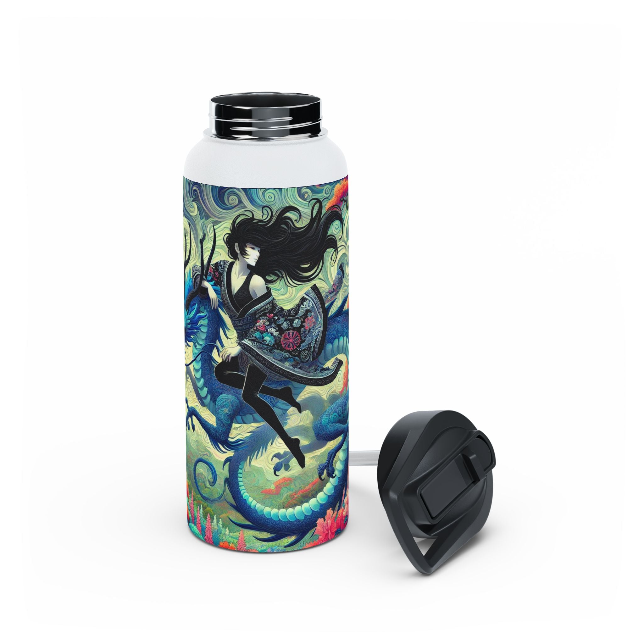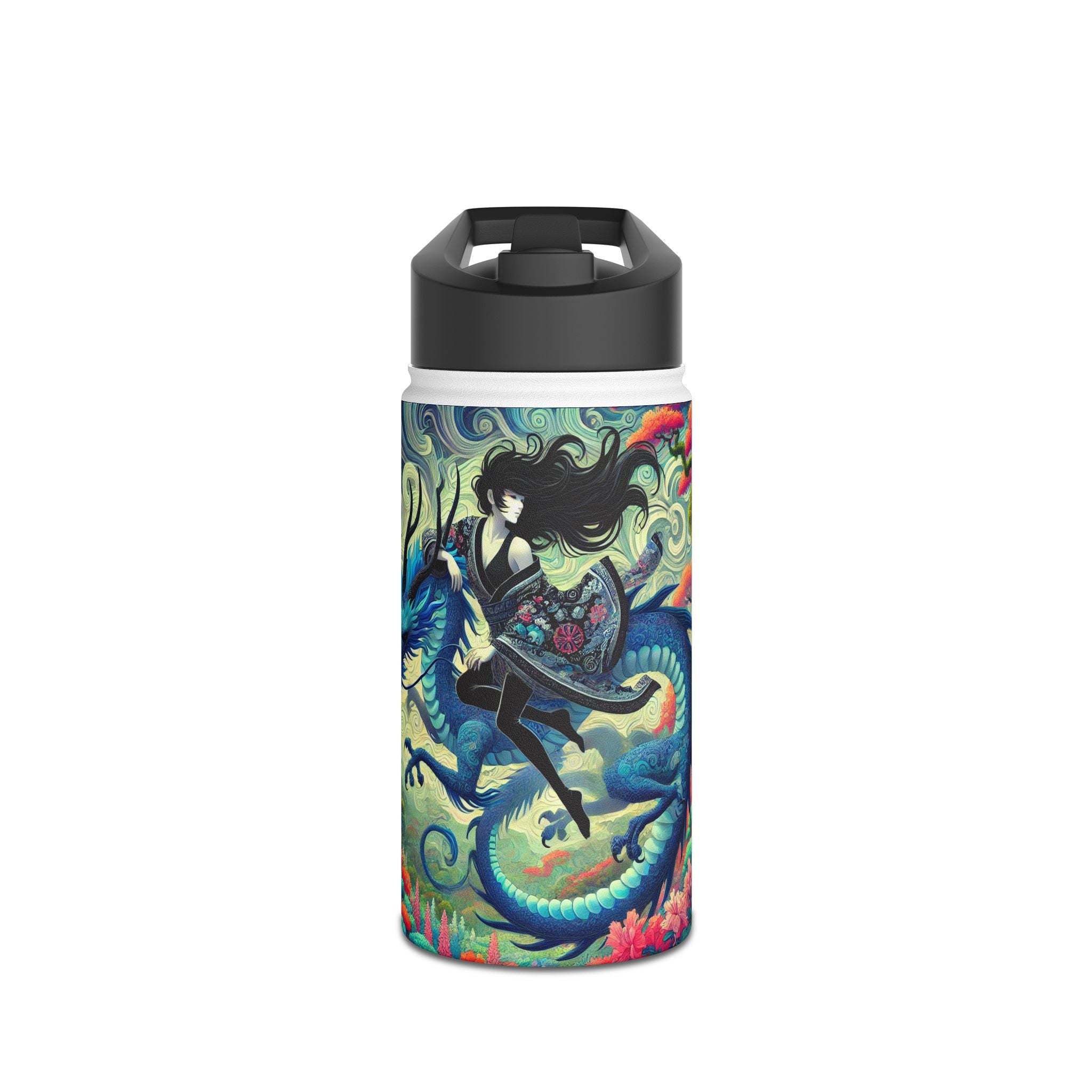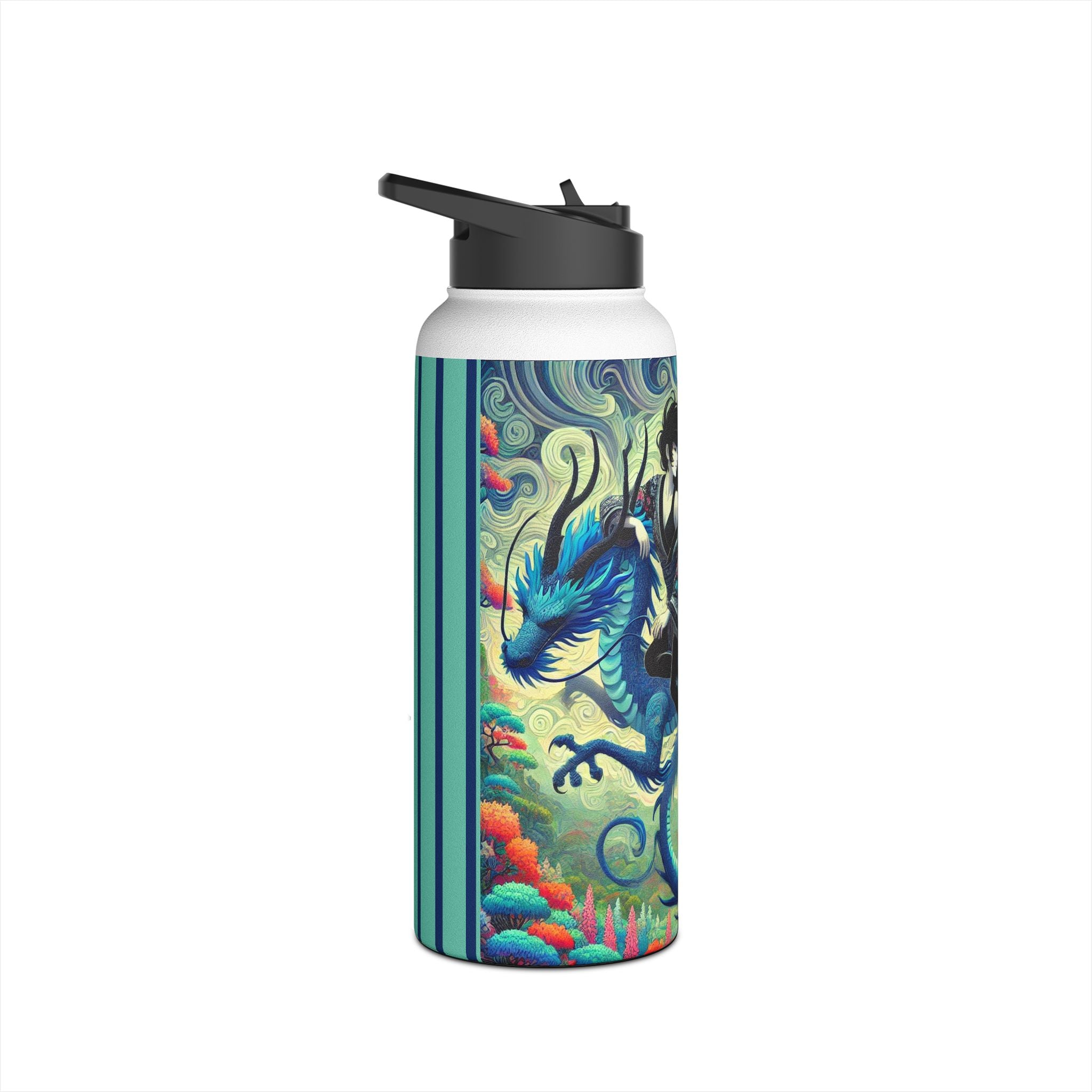 The mesmerizing Mystic Guardian of the Sky artwork depicts a fearless warrior fairy soaring high above the clouds on the back of a turquoise dragon. Her flowing kimono dances with the wind as they glide over a glowing forest canopy, illuminated with vivid blossoms and shifting light. The scene brims with energy and magic—symbolizing courage, harmony, and freedom. A breathtaking fusion of strength and serenity, this piece transforms an ordinary water bottle into a moving work of art.