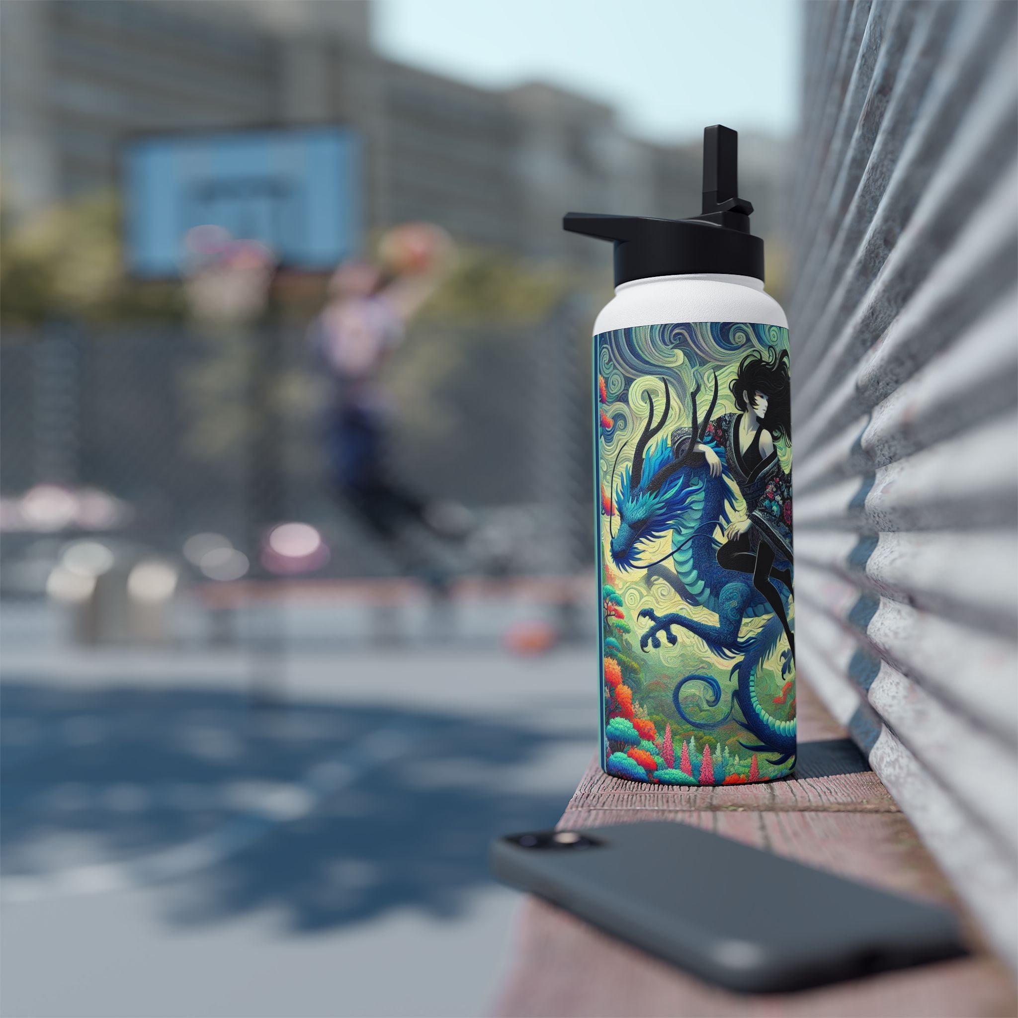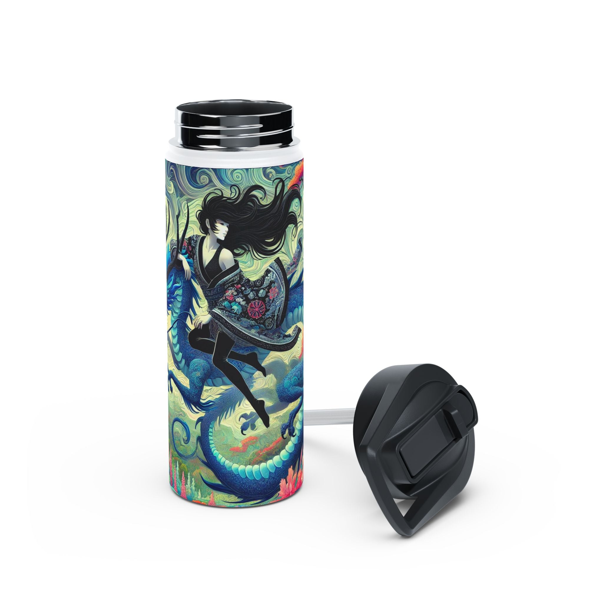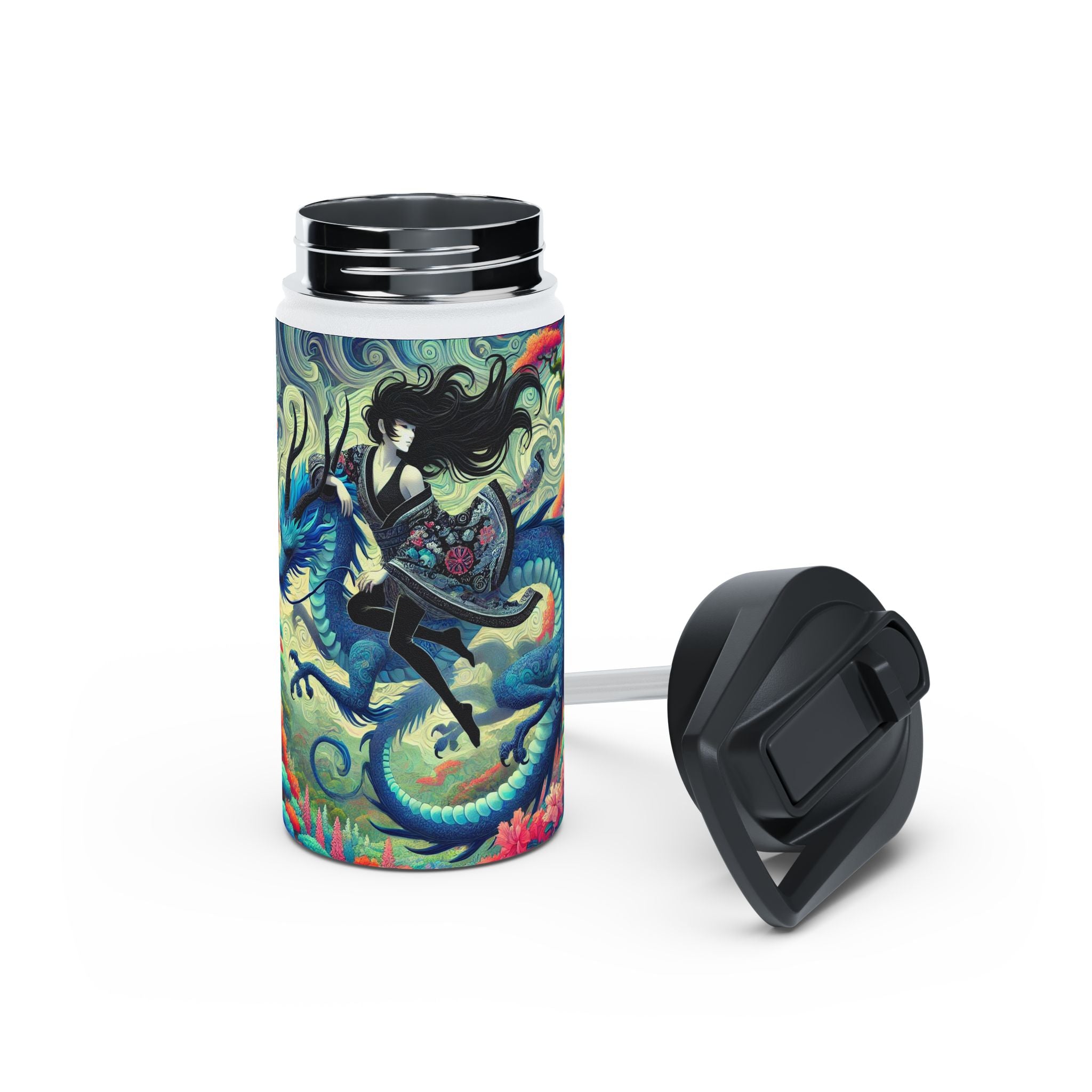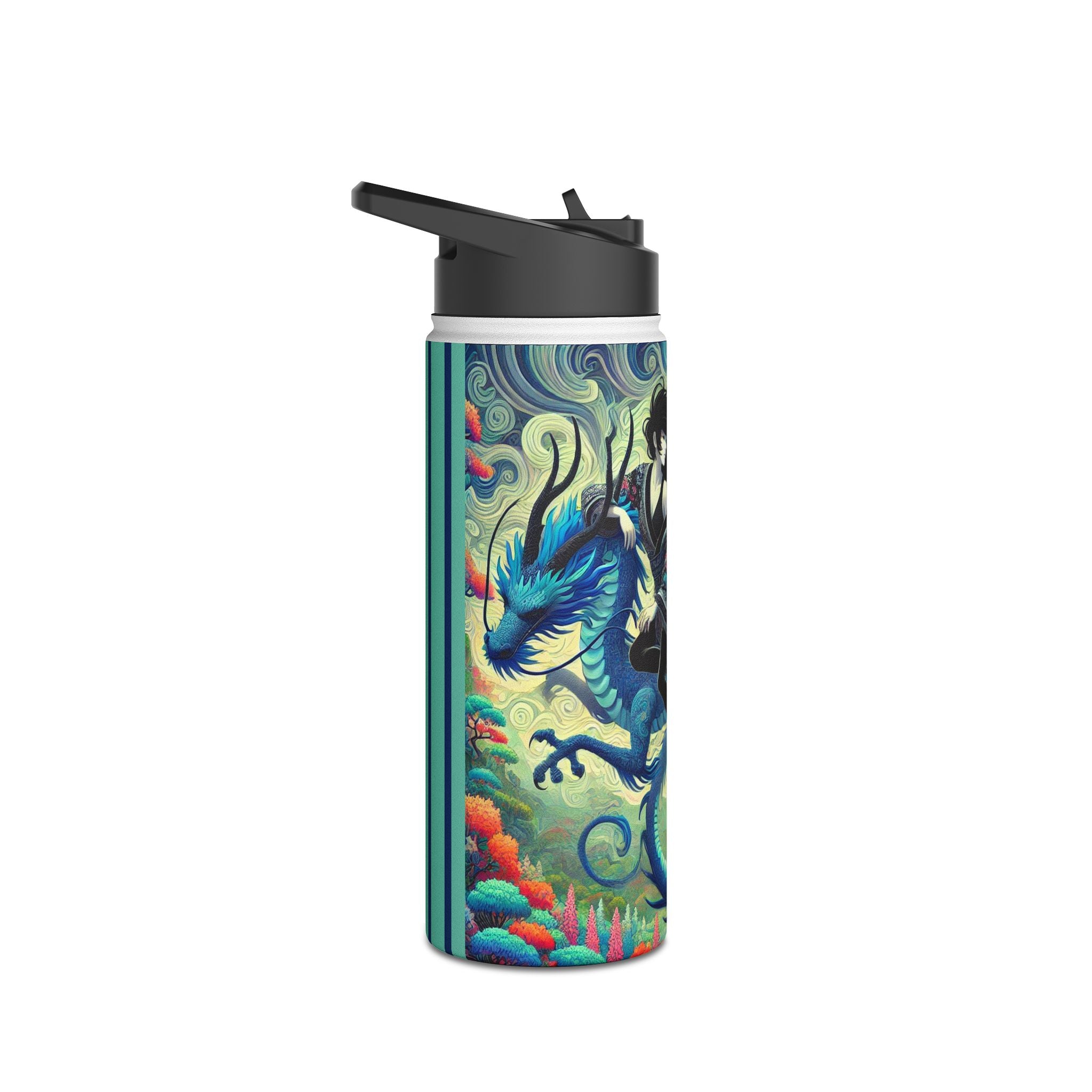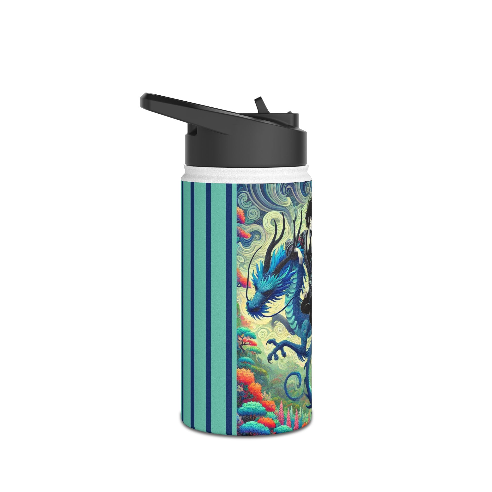 The mesmerizing Mystic Guardian of the Sky artwork depicts a fearless warrior fairy soaring high above the clouds on the back of a turquoise dragon. Her flowing kimono dances with the wind as they glide over a glowing forest canopy, illuminated with vivid blossoms and shifting light. The scene brims with energy and magic—symbolizing courage, harmony, and freedom. A breathtaking fusion of strength and serenity, this piece transforms an ordinary water bottle into a moving work of art.