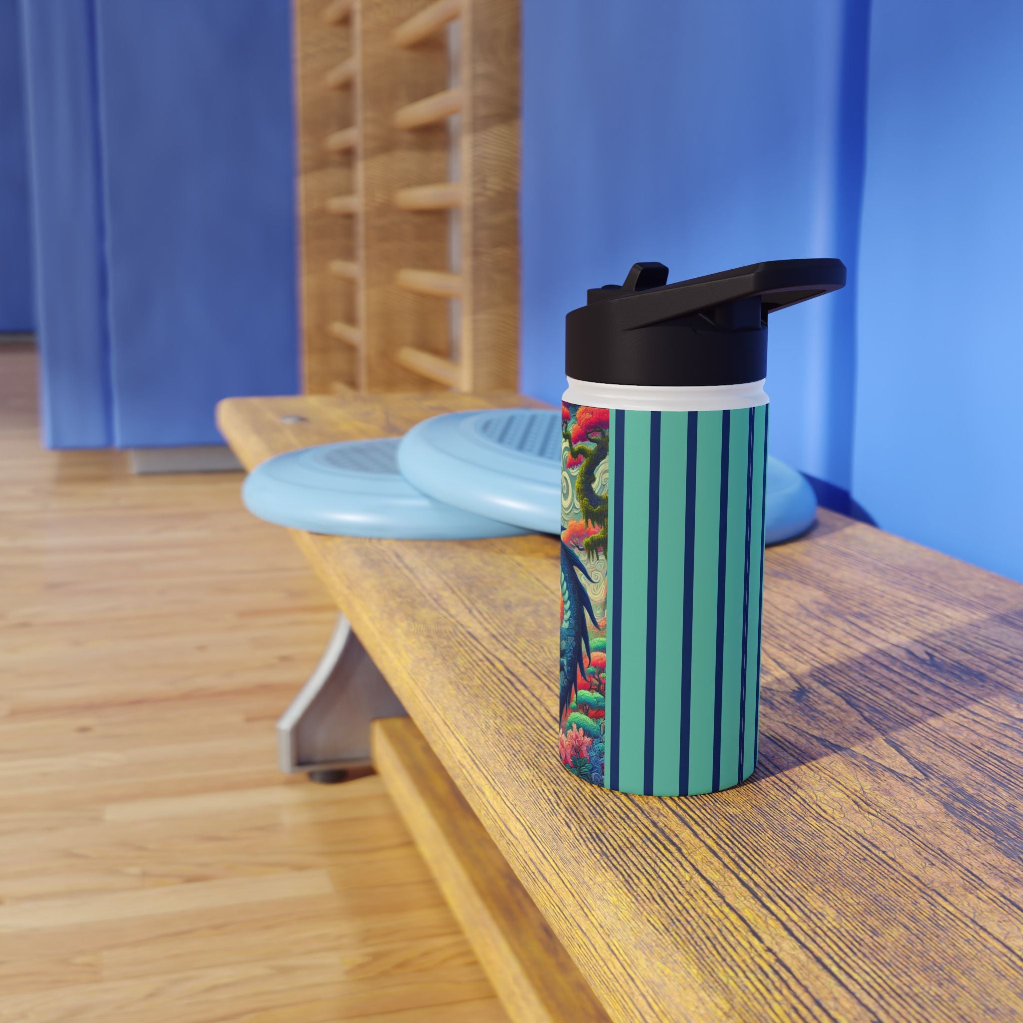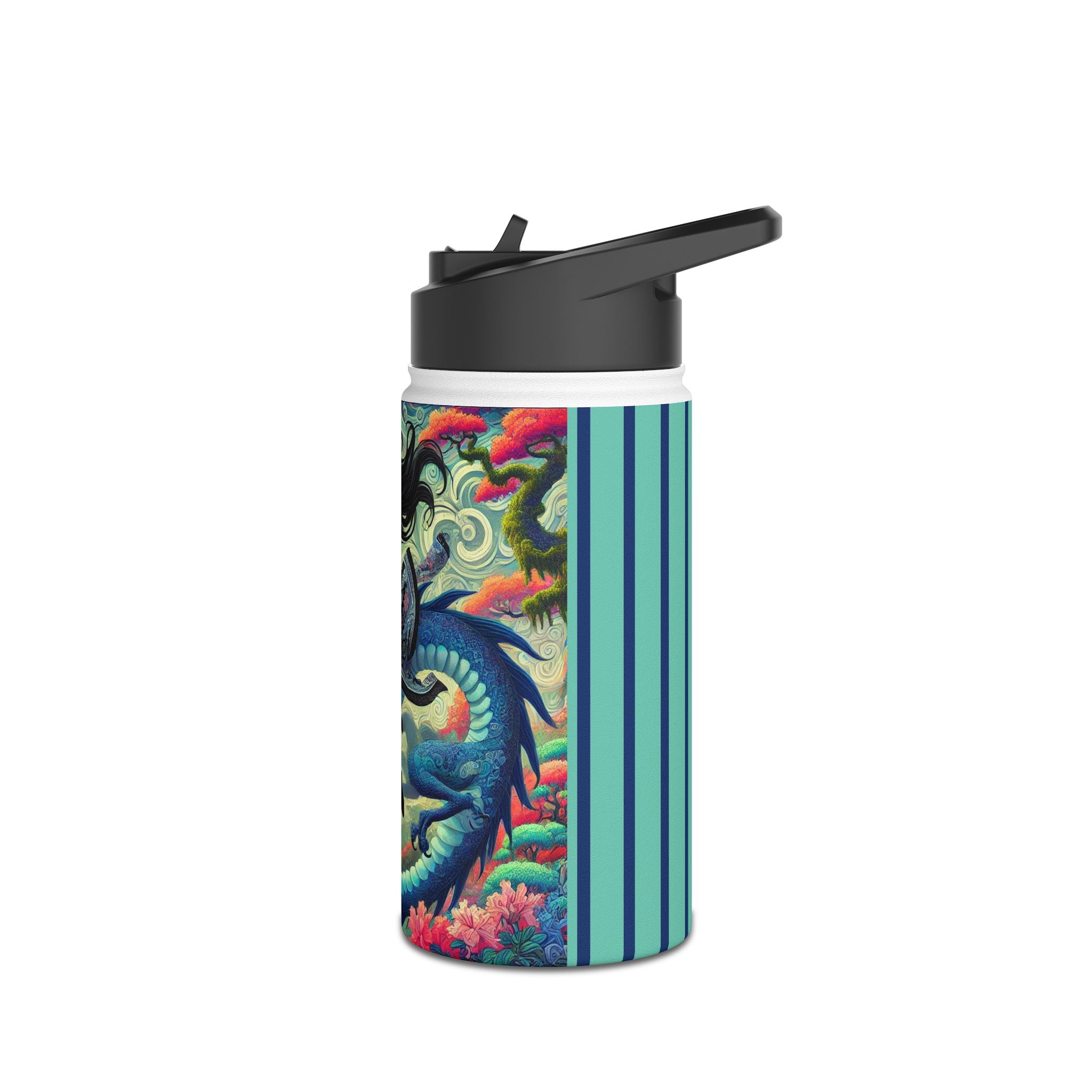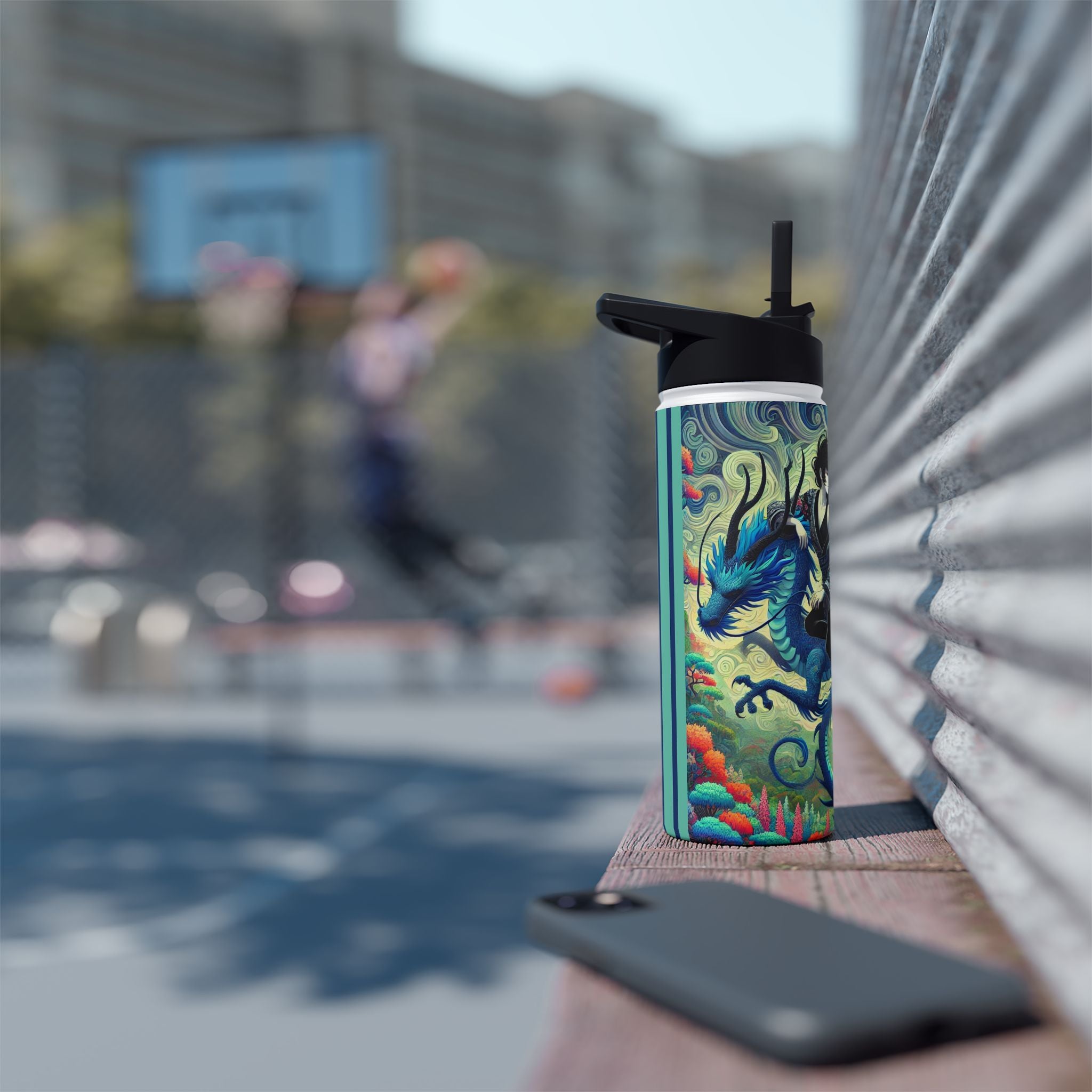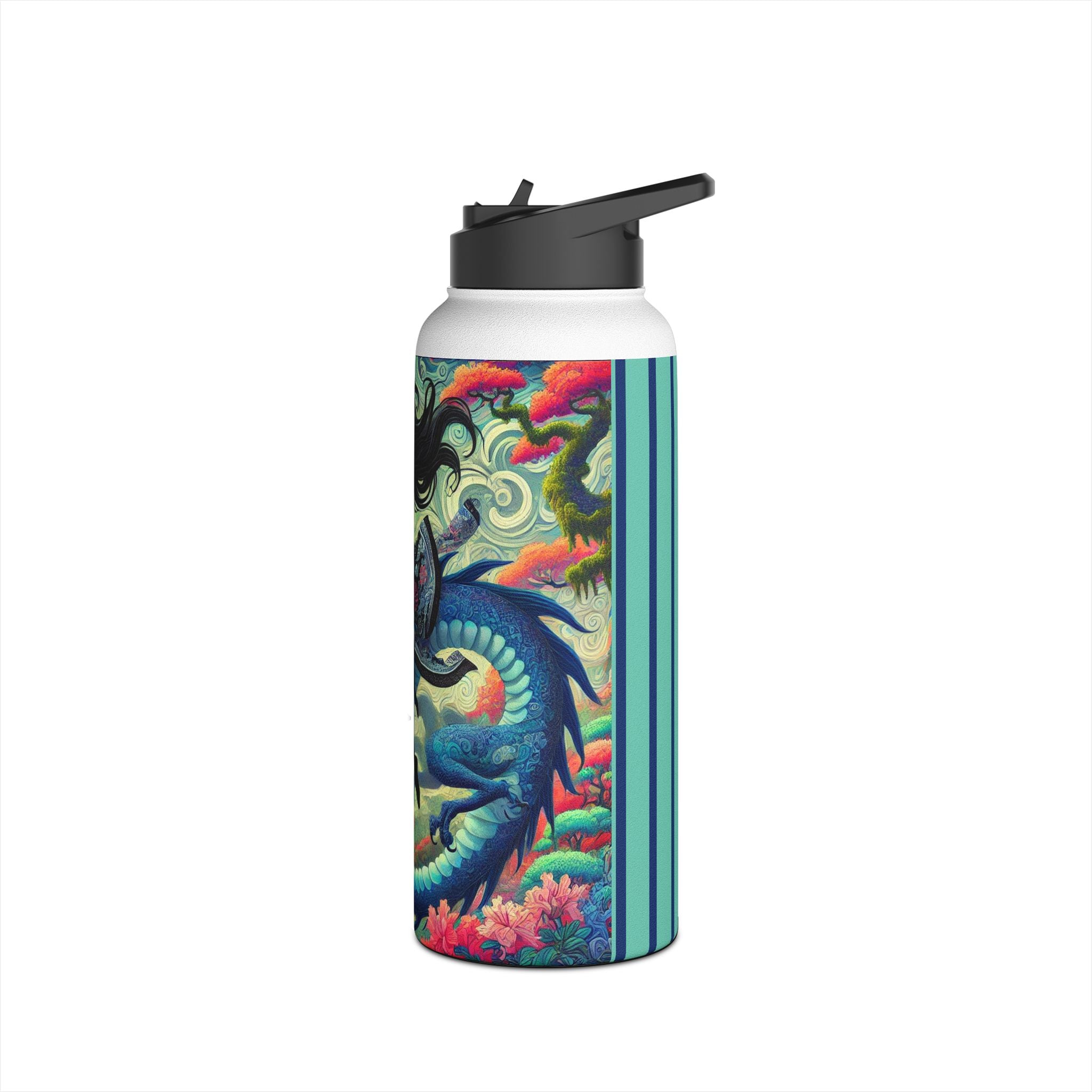 The mesmerizing Mystic Guardian of the Sky artwork depicts a fearless warrior fairy soaring high above the clouds on the back of a turquoise dragon. Her flowing kimono dances with the wind as they glide over a glowing forest canopy, illuminated with vivid blossoms and shifting light. The scene brims with energy and magic—symbolizing courage, harmony, and freedom. A breathtaking fusion of strength and serenity, this piece transforms an ordinary water bottle into a moving work of art.