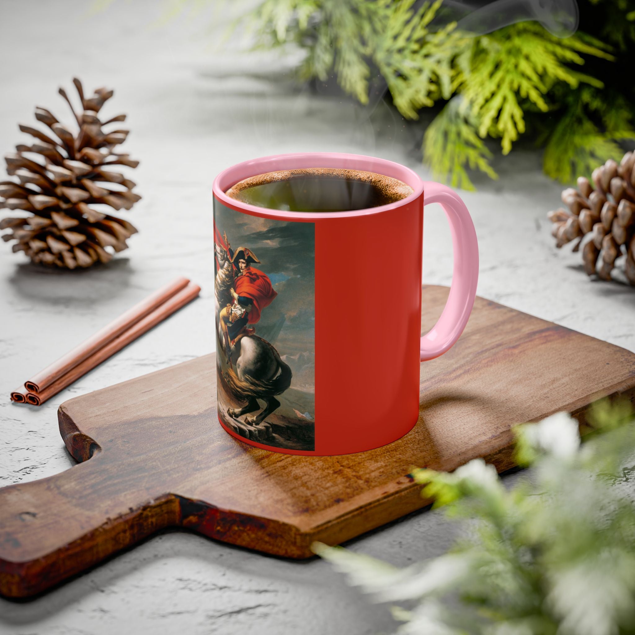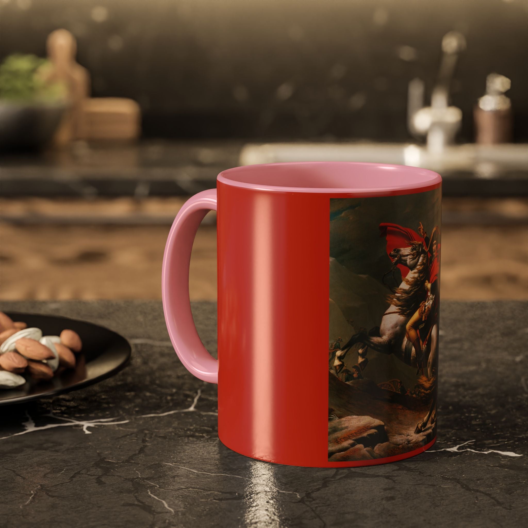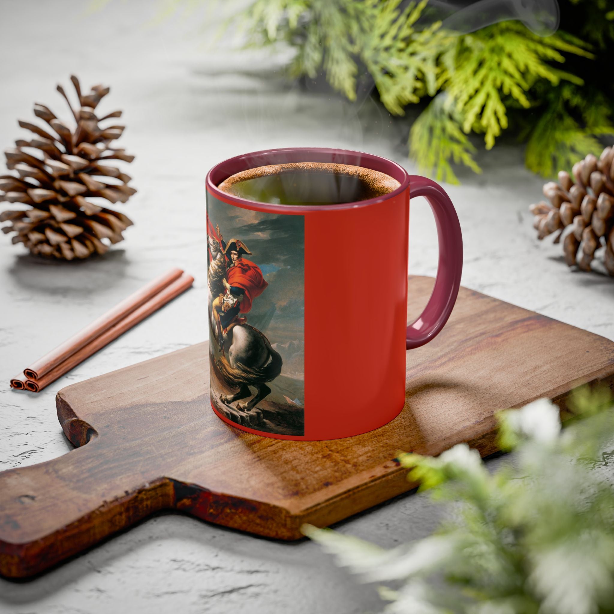 Mugs are a kitchen essential, and when infused with a personalized touch, they transform into cherished favorites. These mugs, offered in 12 vibrant color choices, can hold up to 11oz of your preferred rejuvenating beverage and feature a colored handle and interior. The glossy finish adds an elegant accent that beautifully complements the high-fidelity artwork print, making them not only a delightful addition to your kitchen but also a fantastic choice for thoughtful gifts.