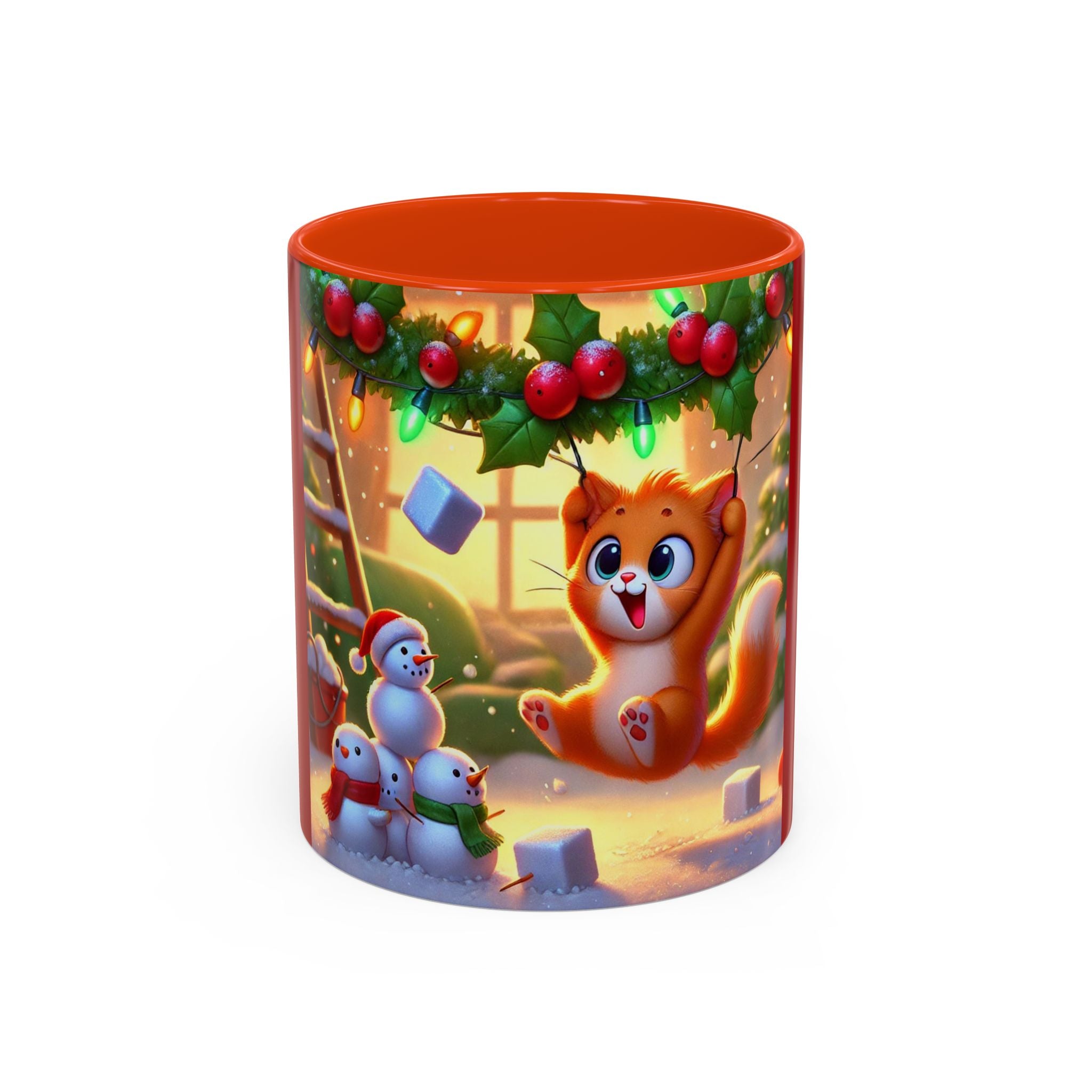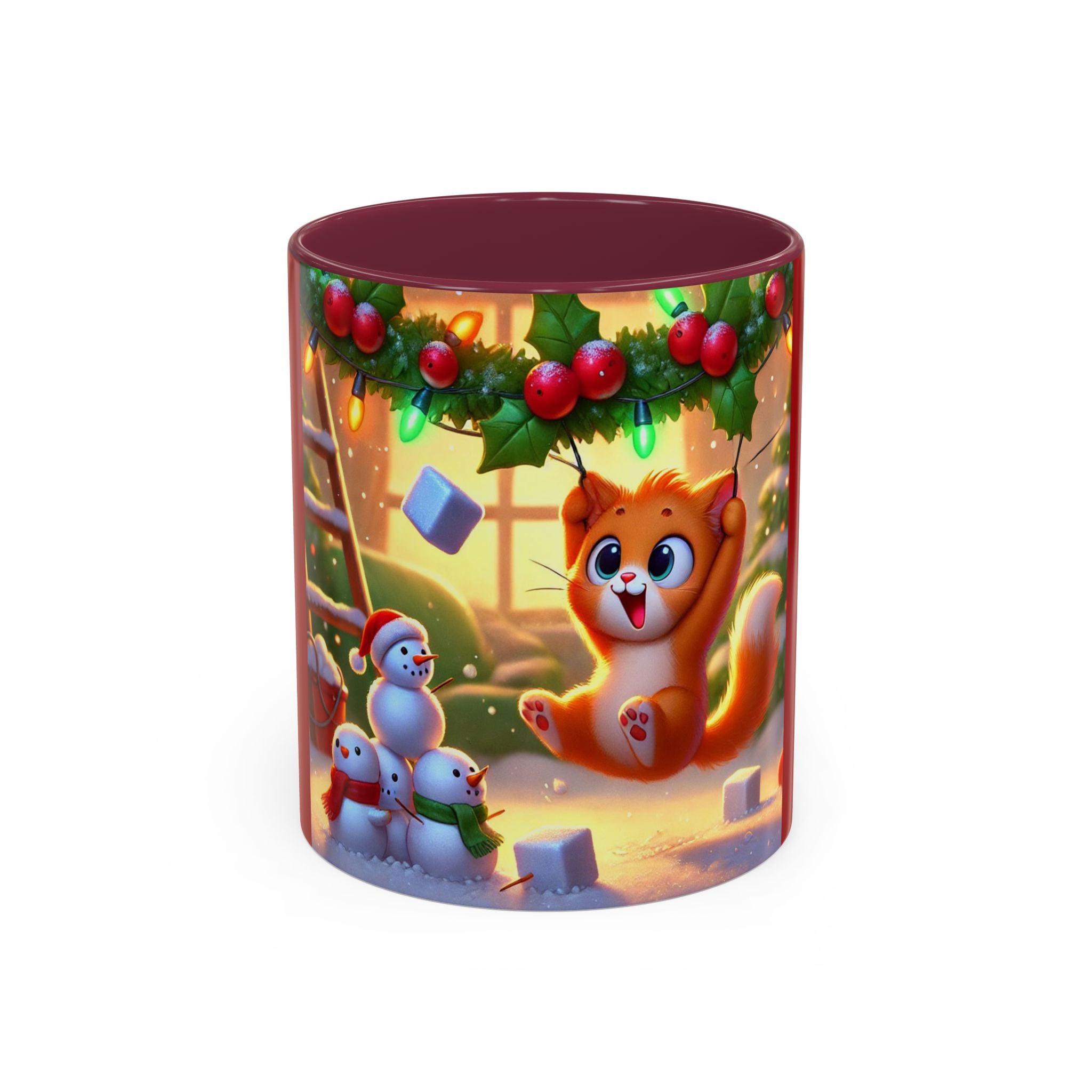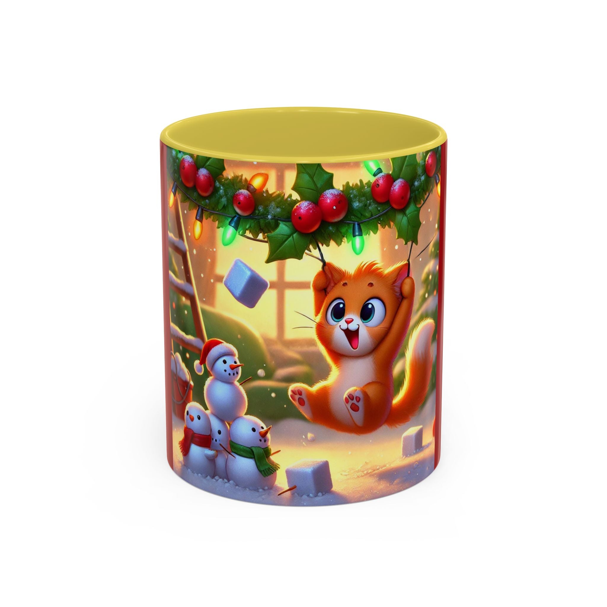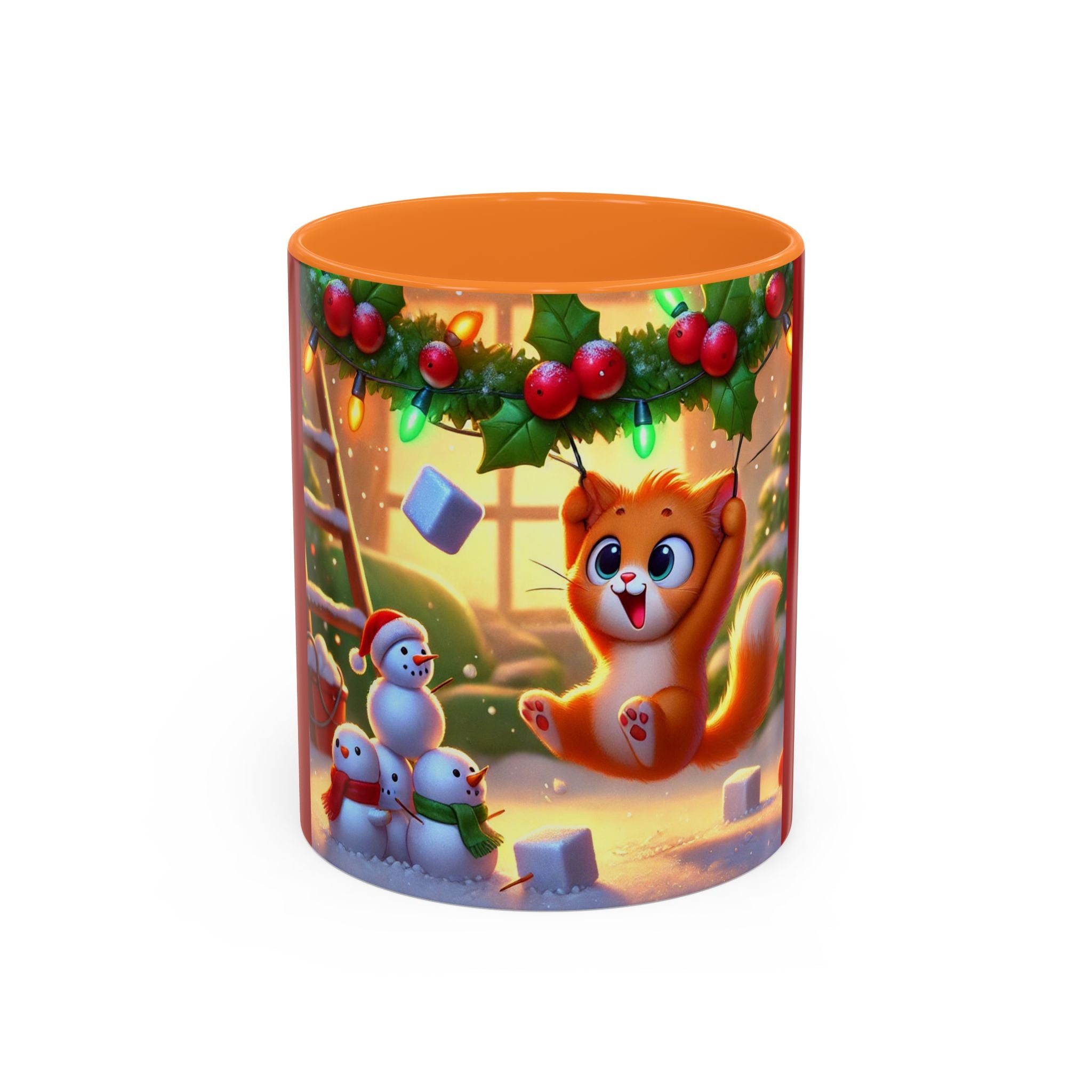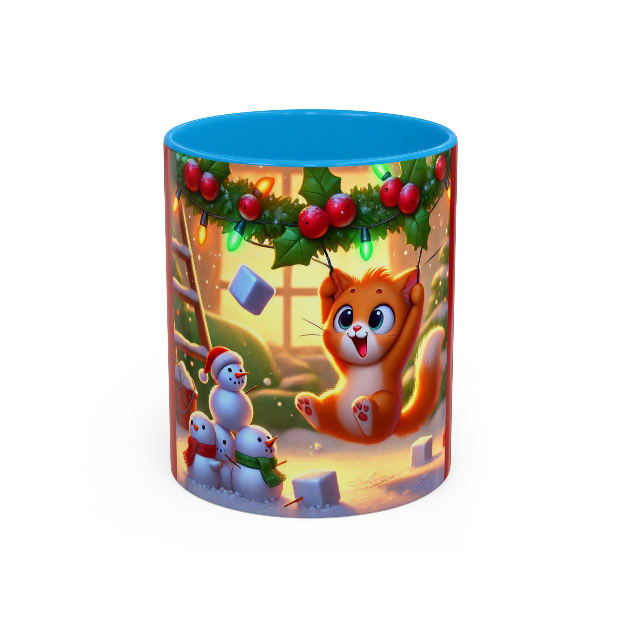 The design shows a playful orange kitten swinging from a garland of holly and Christmas lights as snow cubes tumble through the air. Below, three snowmen in colorful scarves watch with amusement, while warm golden light glows in the background. Cozy, whimsical, and fun, this mug is perfect for holiday mornings—whether you’re feeling naughty or nice.