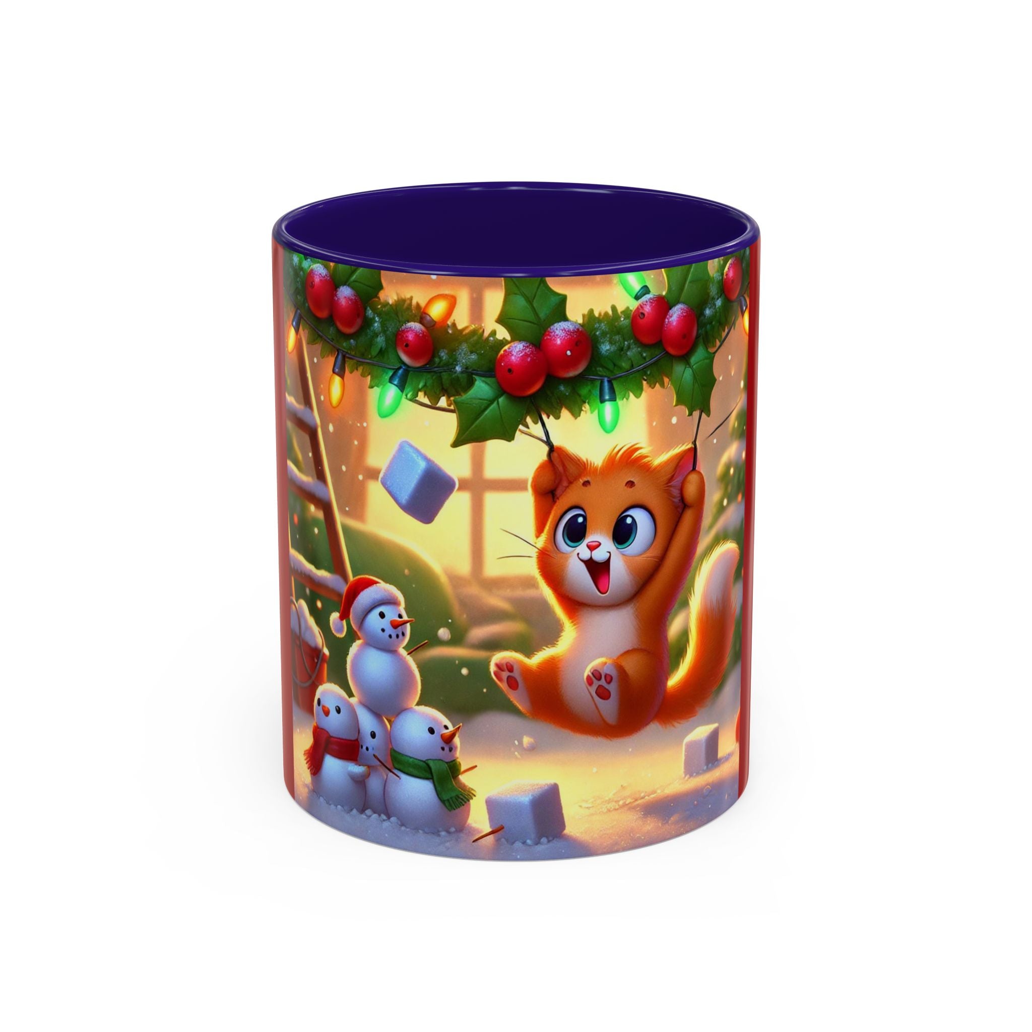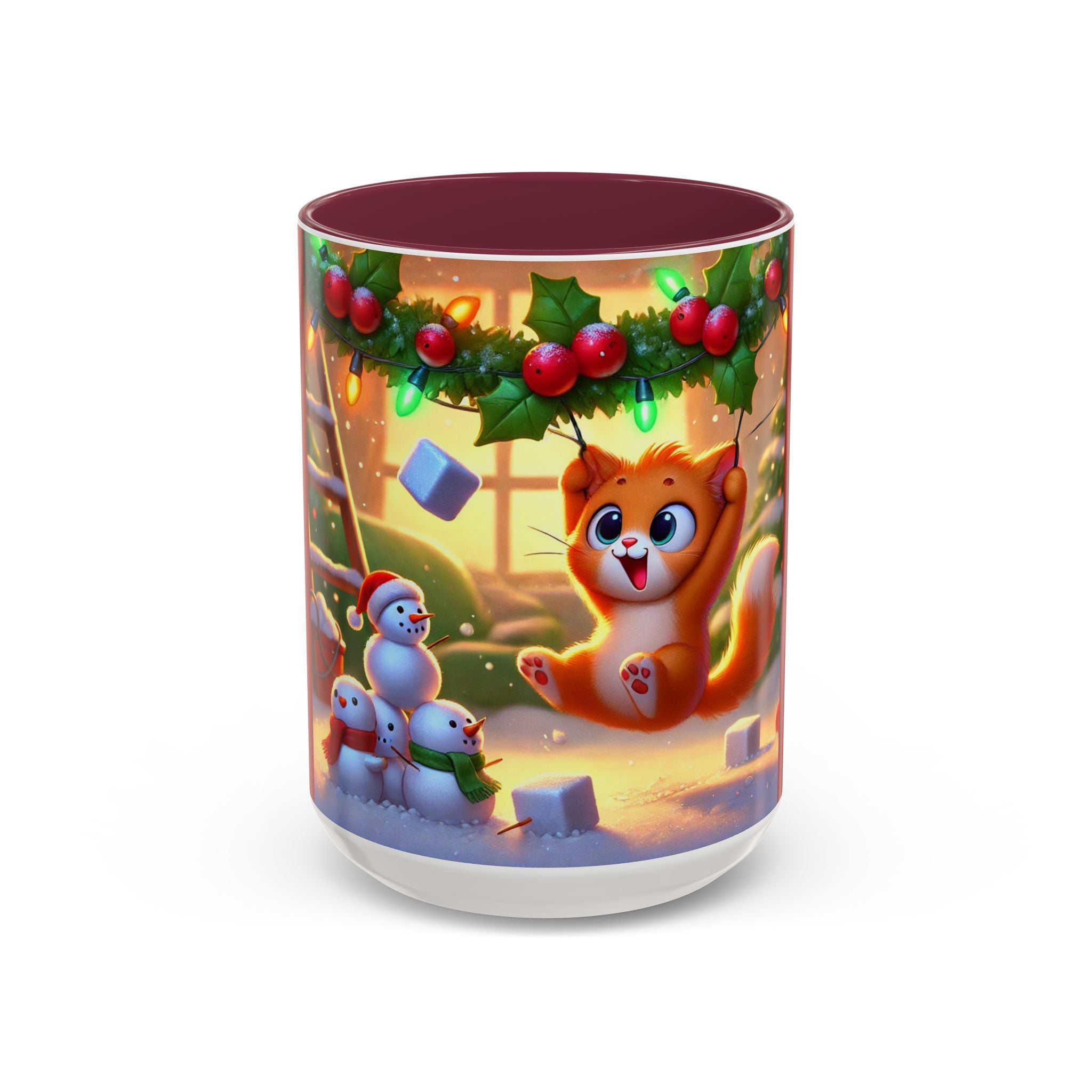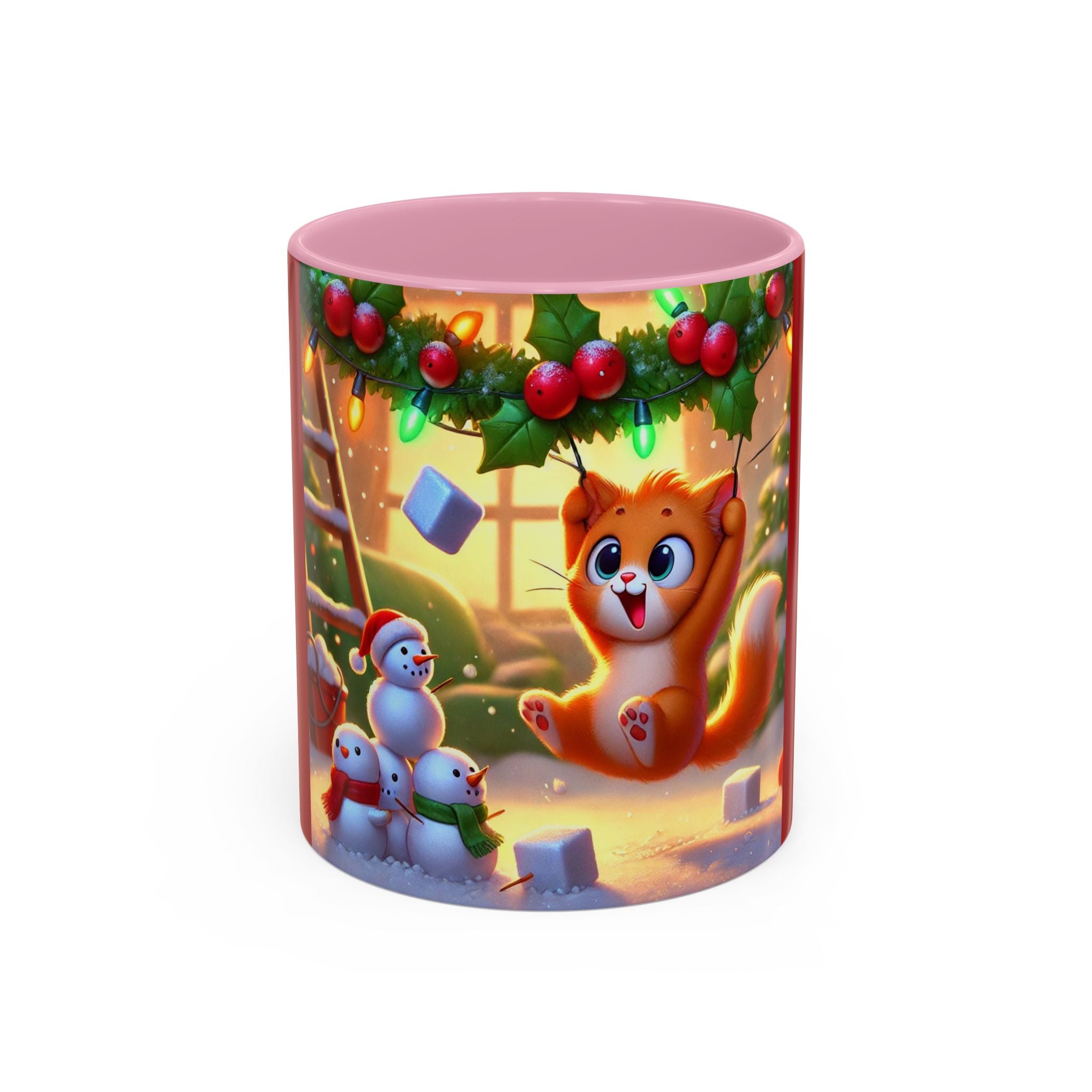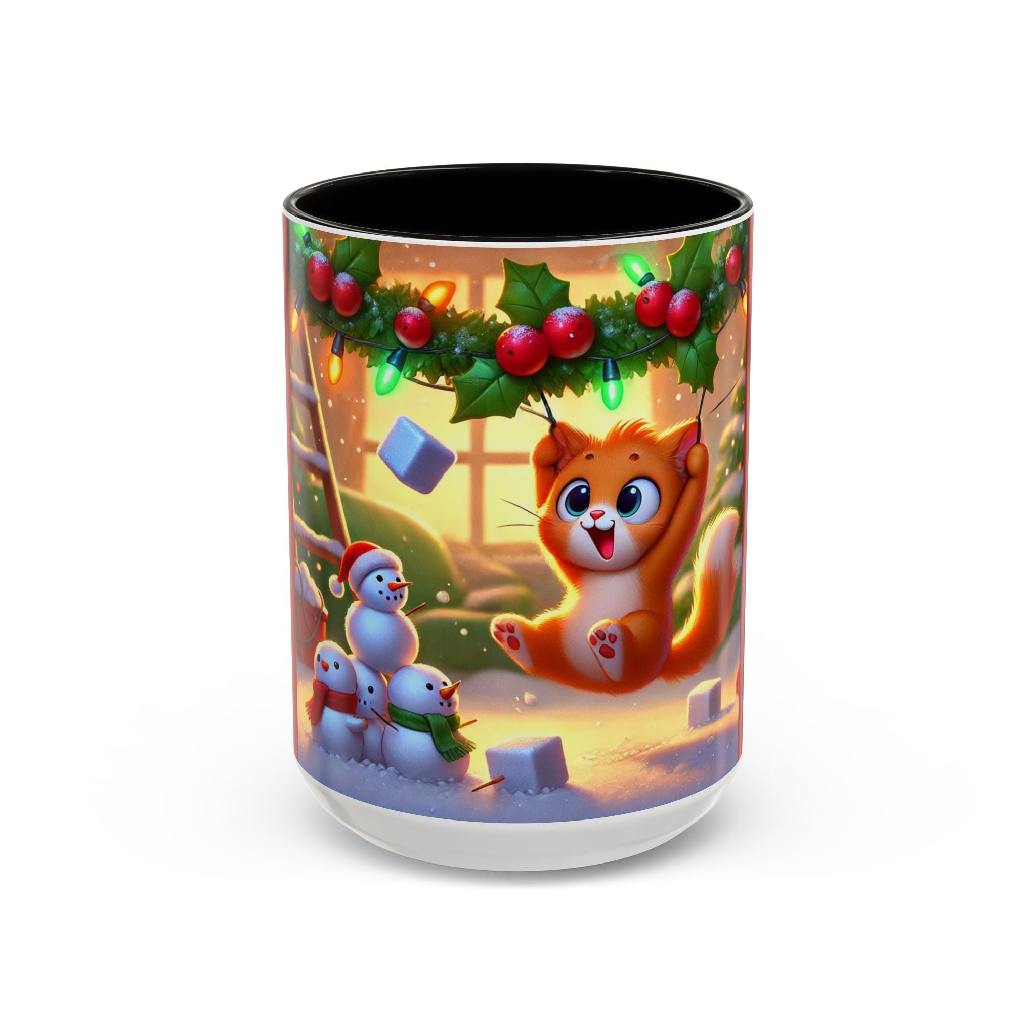 The design shows a playful orange kitten swinging from a garland of holly and Christmas lights as snow cubes tumble through the air. Below, three snowmen in colorful scarves watch with amusement, while warm golden light glows in the background. Cozy, whimsical, and fun, this mug is perfect for holiday mornings—whether you’re feeling naughty or nice.