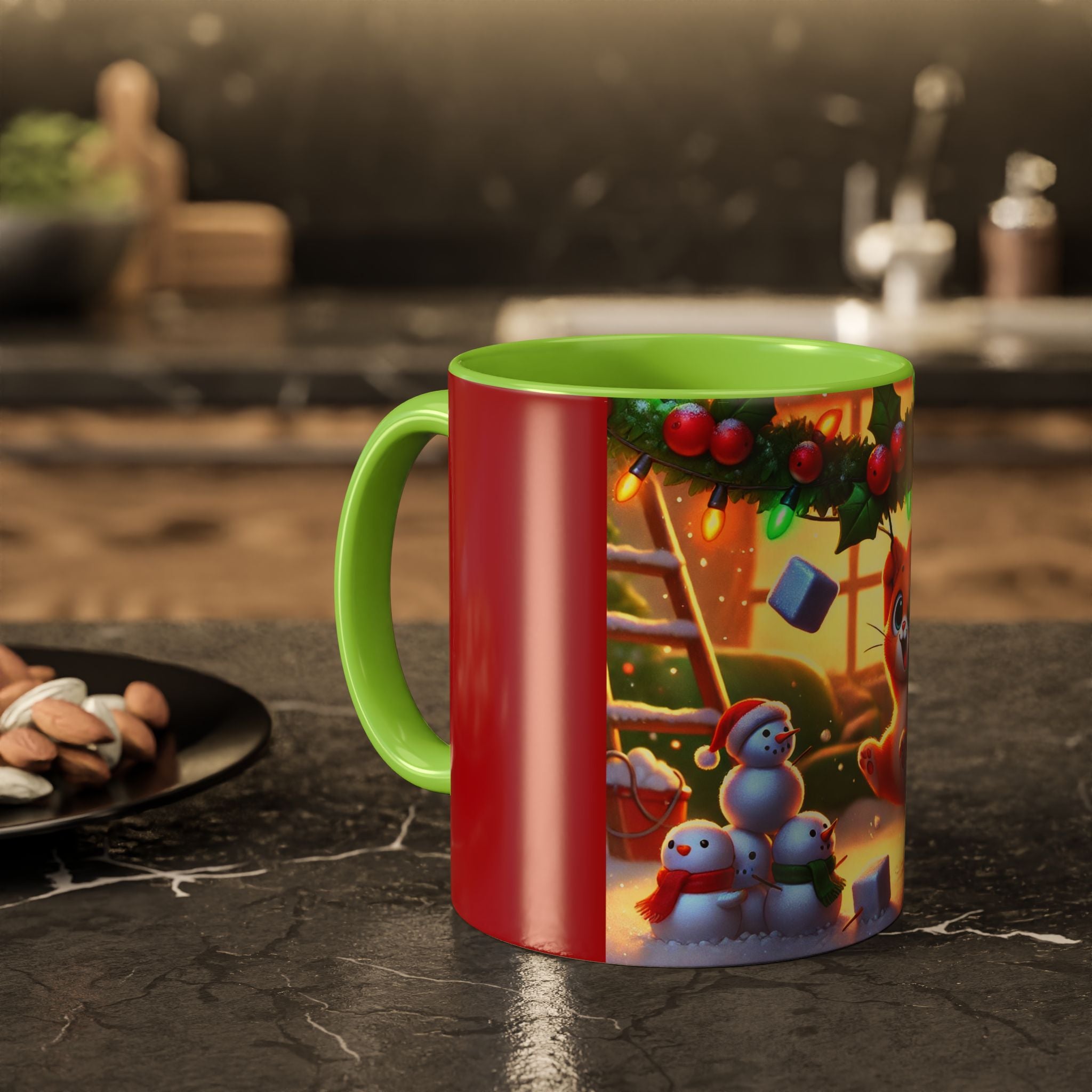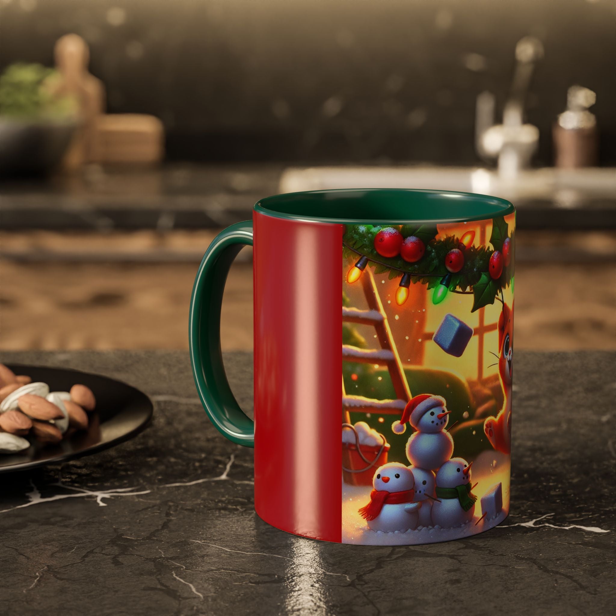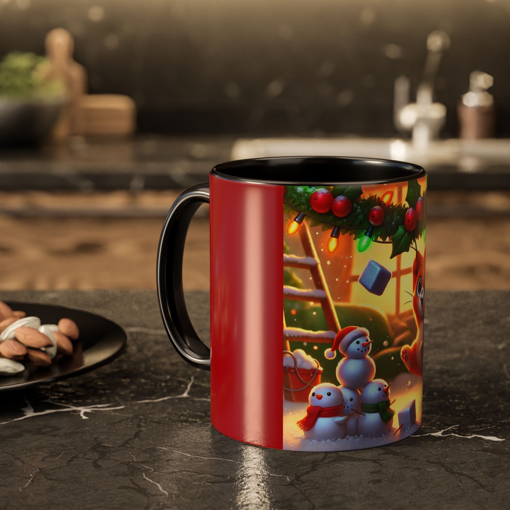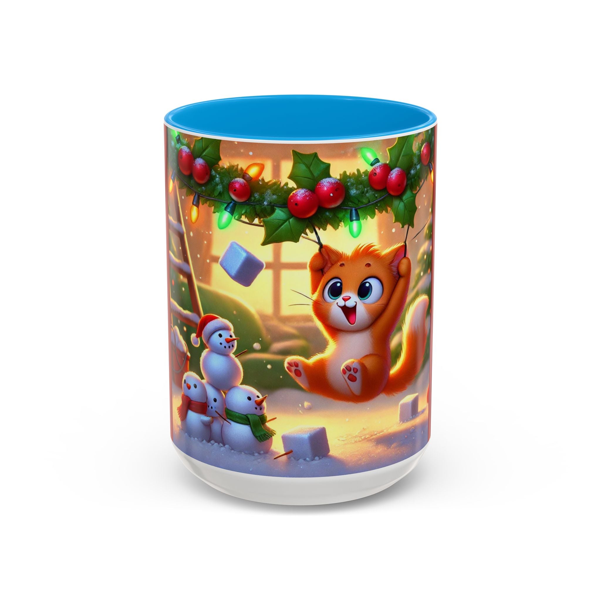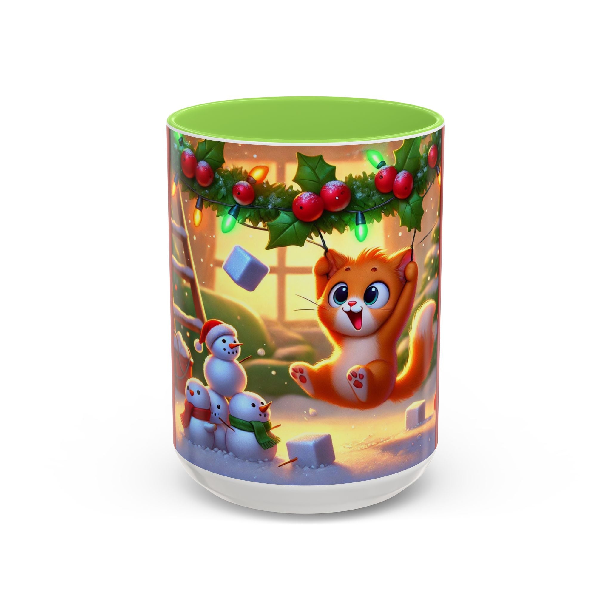 The design shows a playful orange kitten swinging from a garland of holly and Christmas lights as snow cubes tumble through the air. Below, three snowmen in colorful scarves watch with amusement, while warm golden light glows in the background. Cozy, whimsical, and fun, this mug is perfect for holiday mornings—whether you’re feeling naughty or nice.