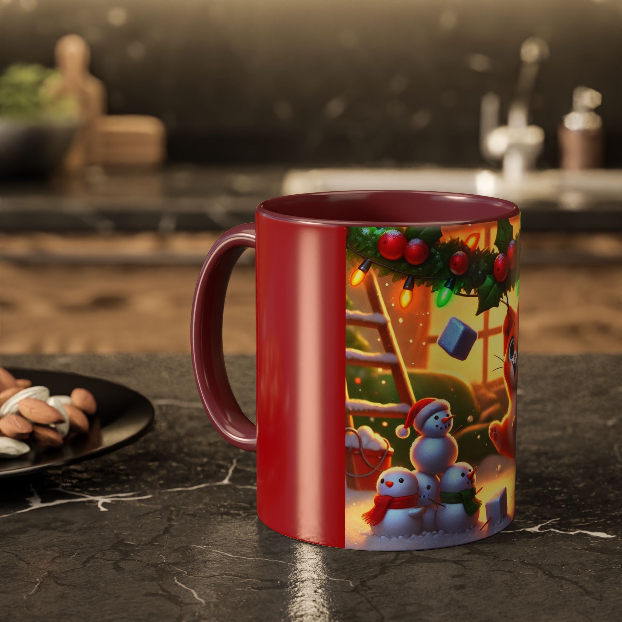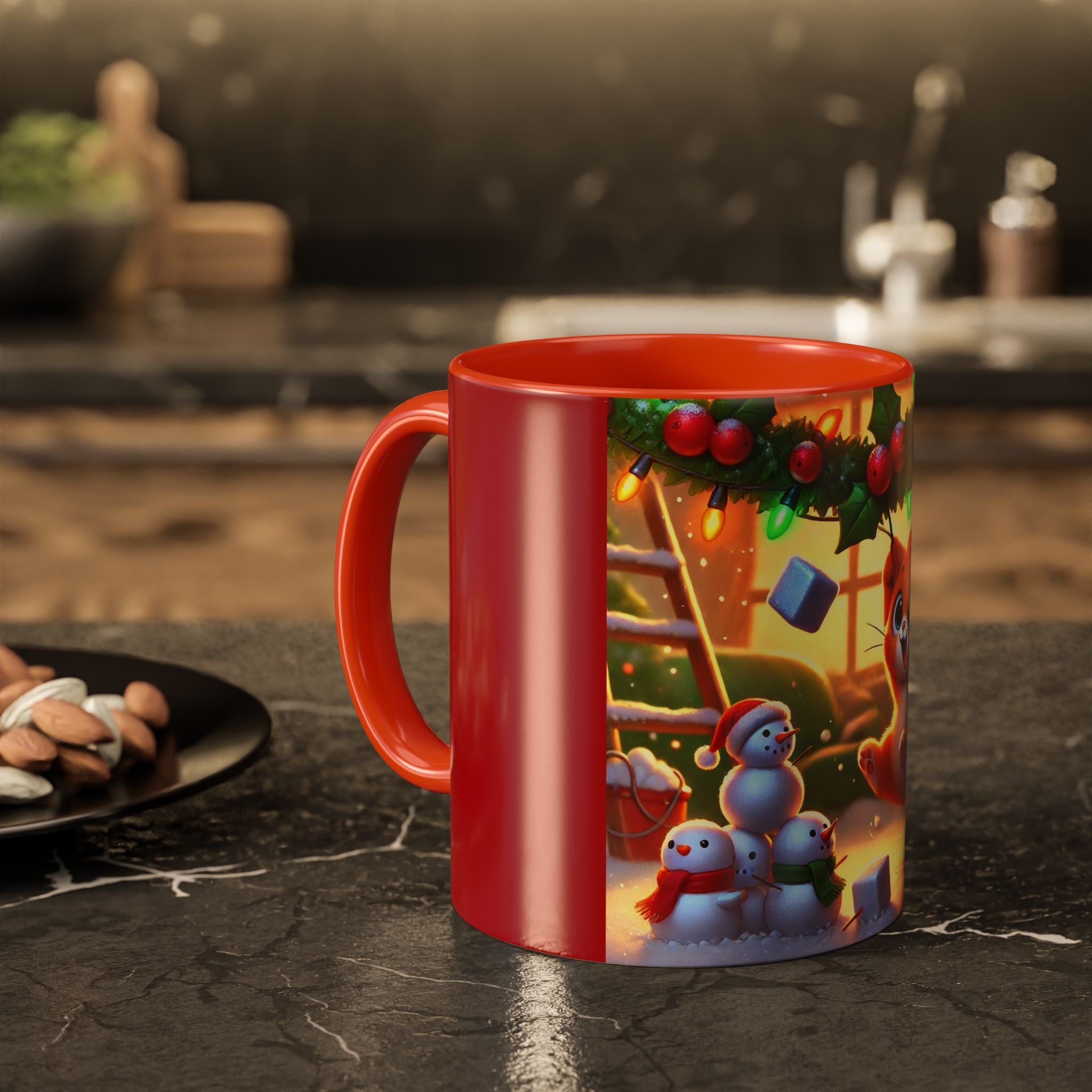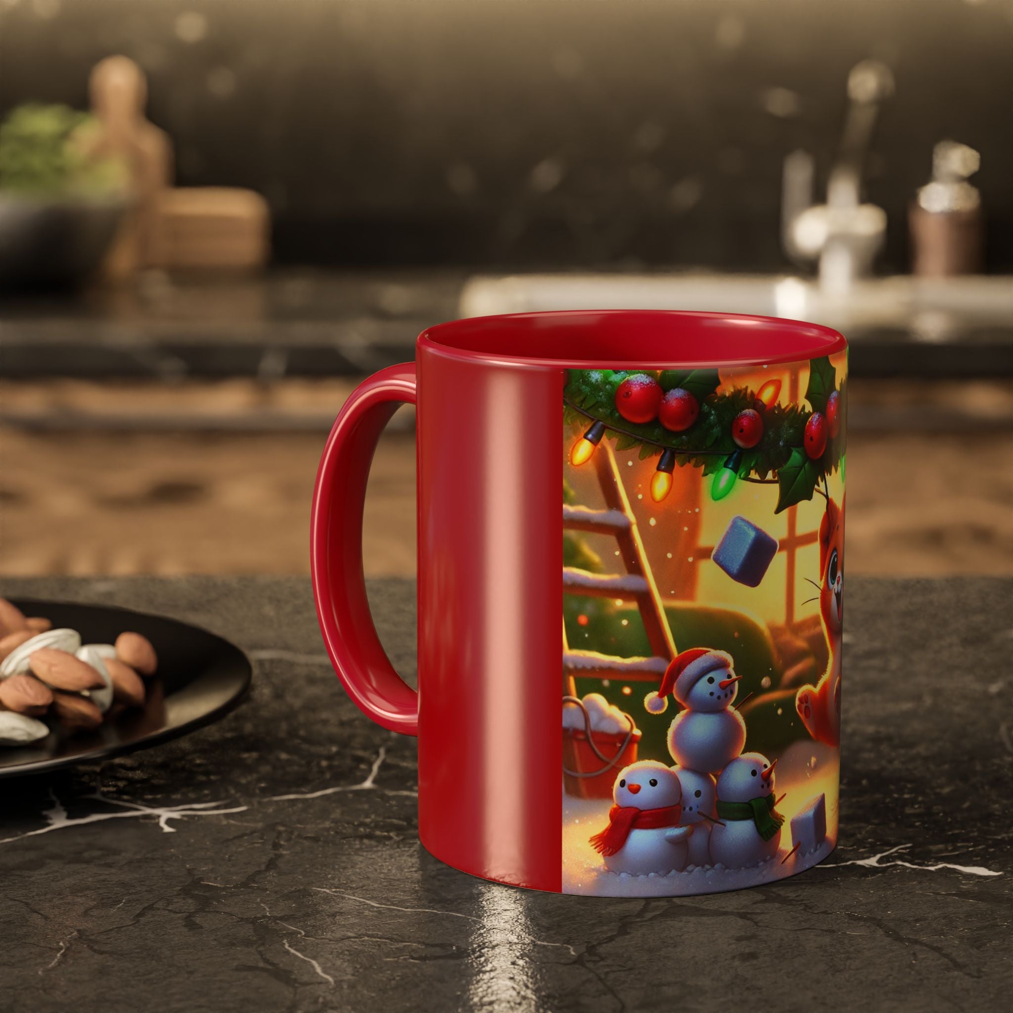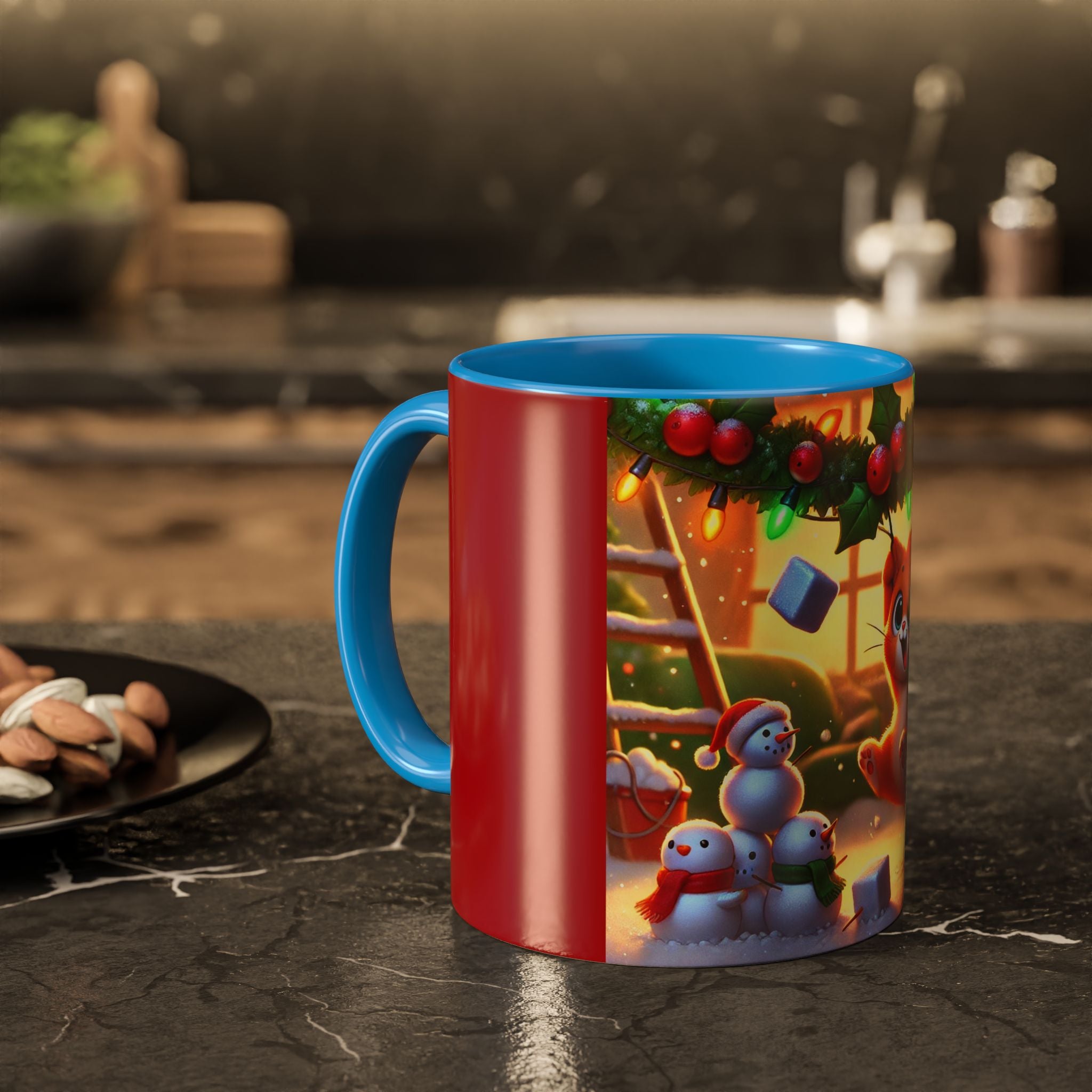 The design shows a playful orange kitten swinging from a garland of holly and Christmas lights as snow cubes tumble through the air. Below, three snowmen in colorful scarves watch with amusement, while warm golden light glows in the background. Cozy, whimsical, and fun, this mug is perfect for holiday mornings—whether you’re feeling naughty or nice.