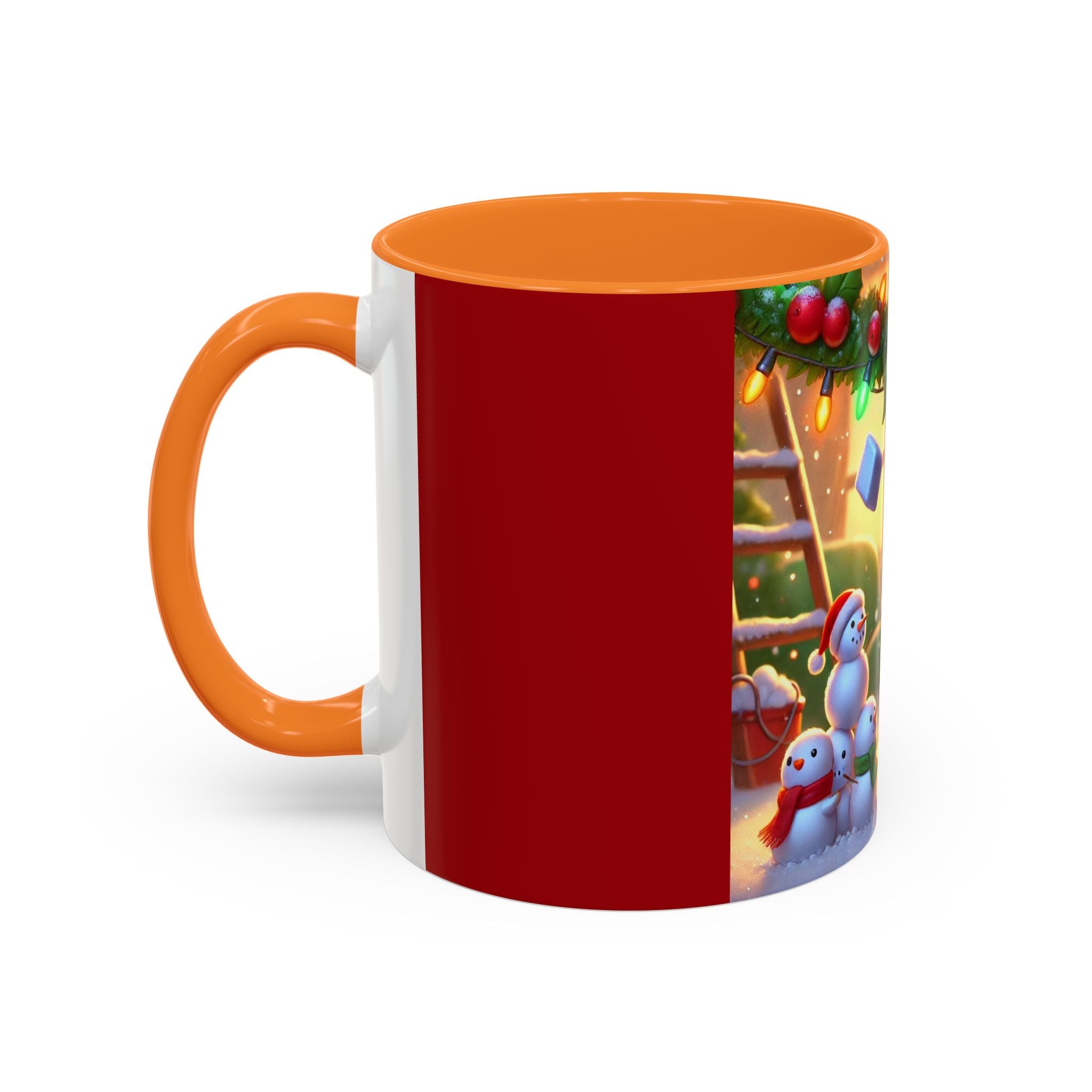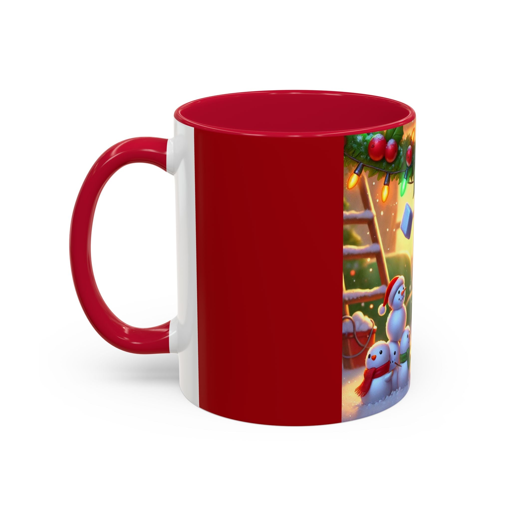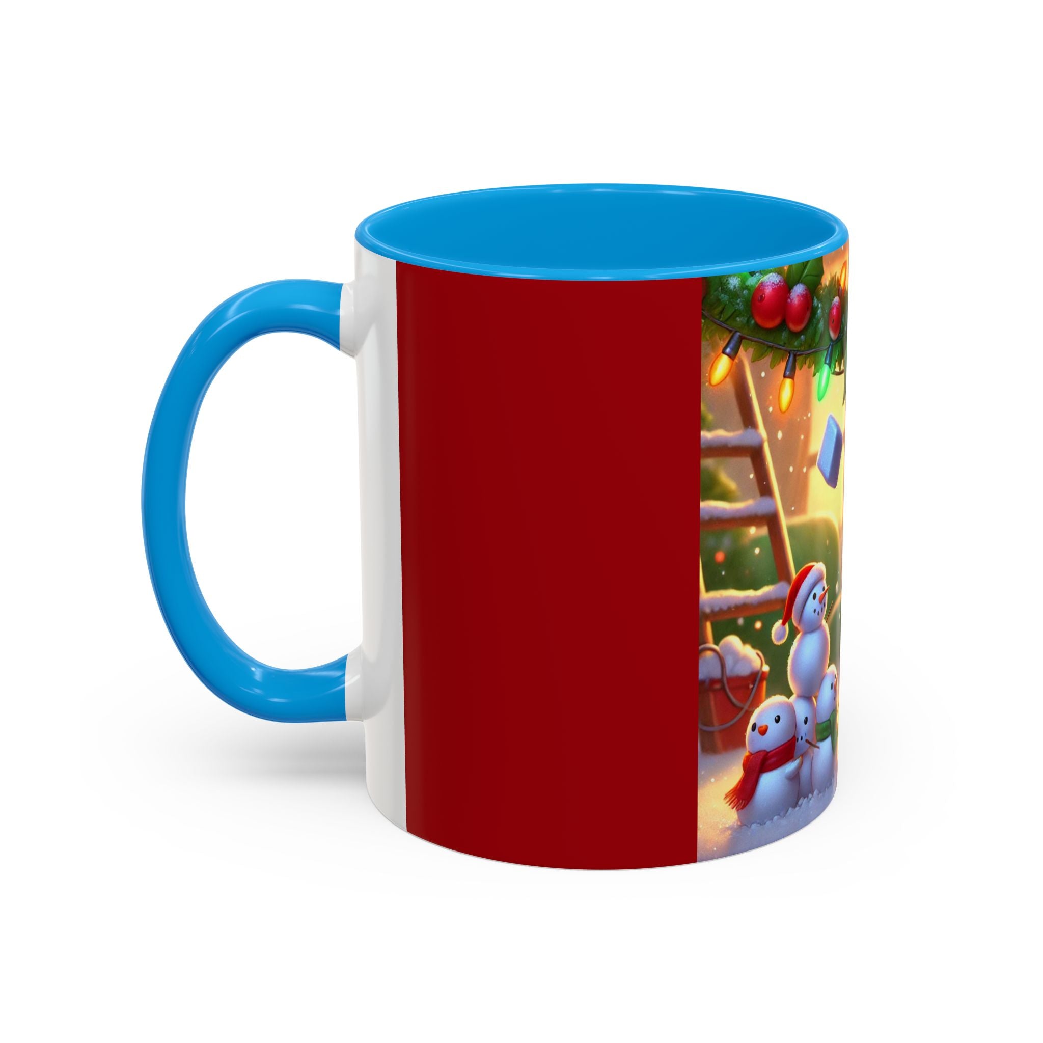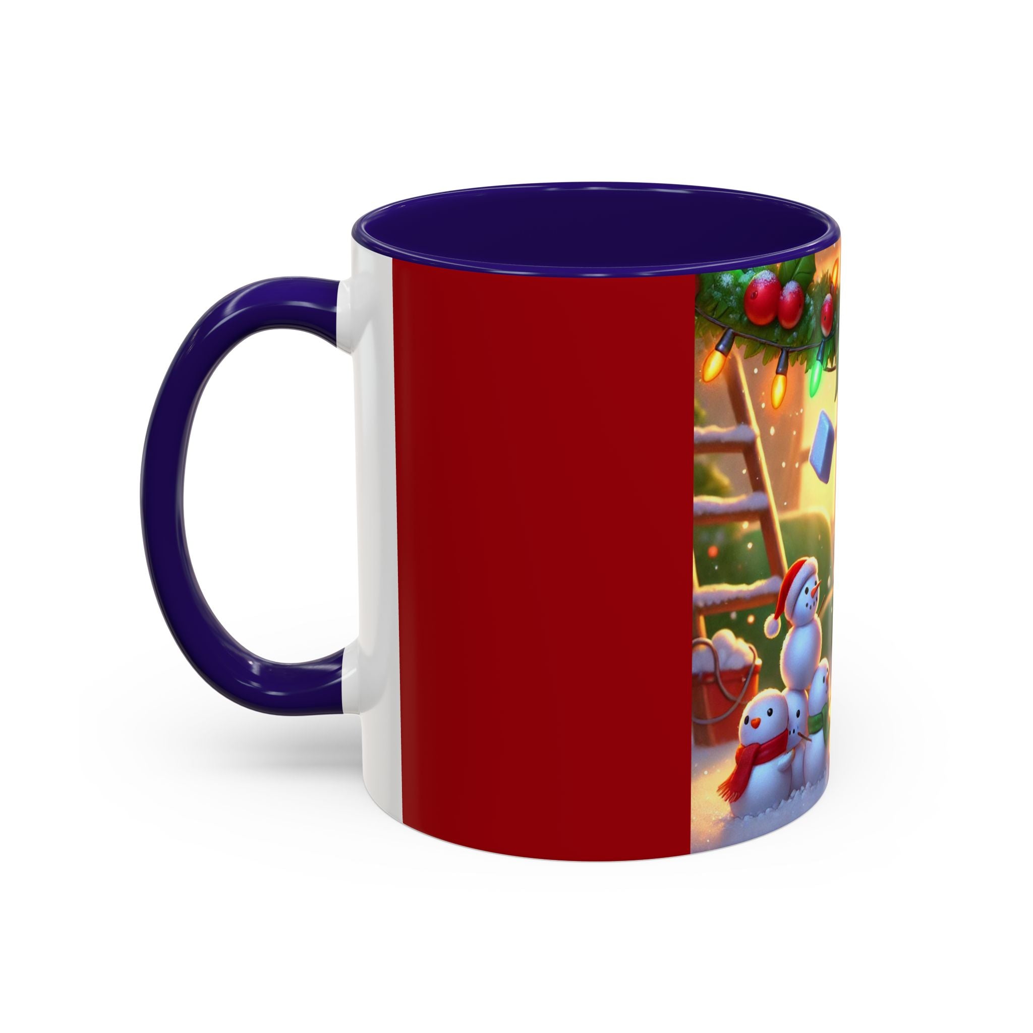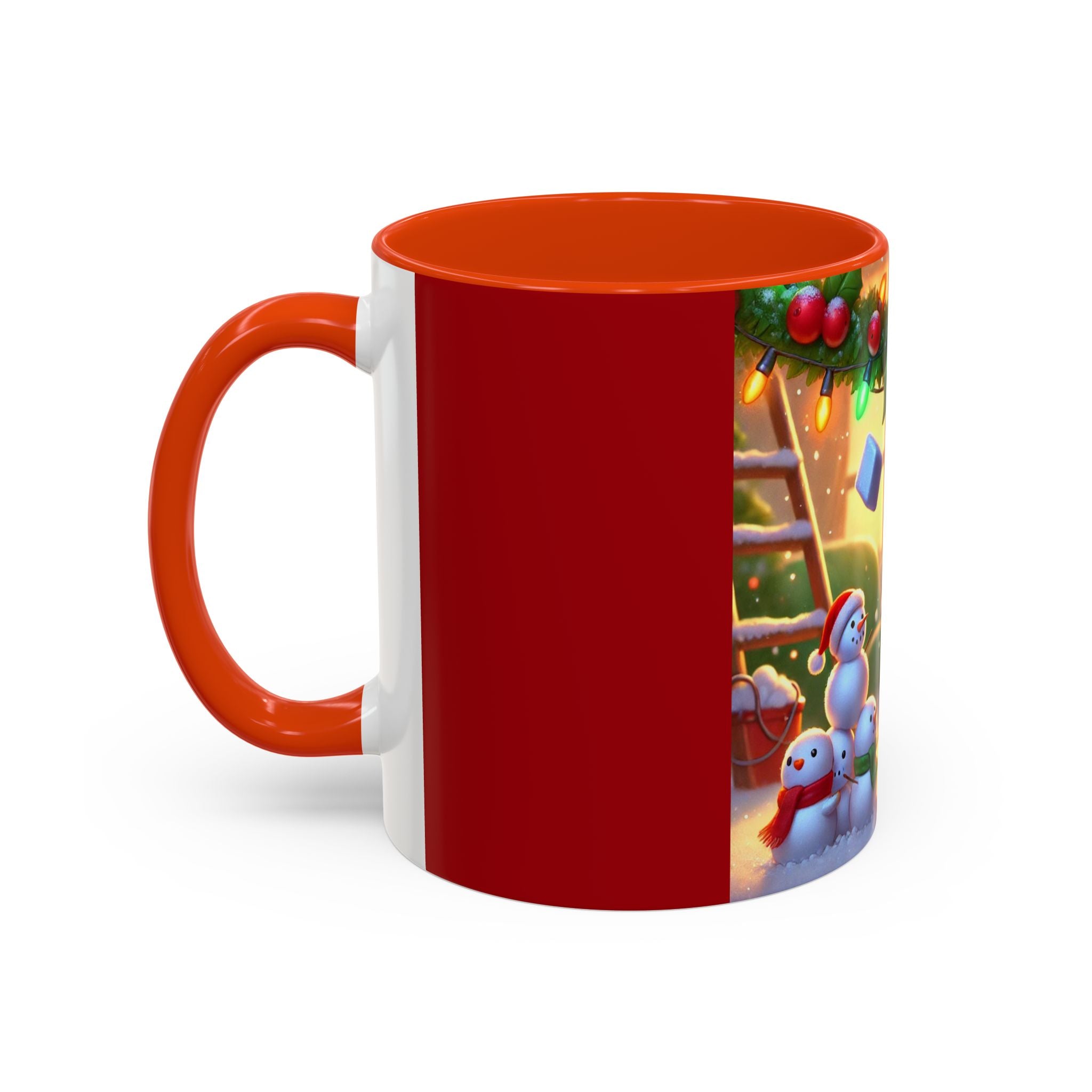 The design shows a playful orange kitten swinging from a garland of holly and Christmas lights as snow cubes tumble through the air. Below, three snowmen in colorful scarves watch with amusement, while warm golden light glows in the background. Cozy, whimsical, and fun, this mug is perfect for holiday mornings—whether you’re feeling naughty or nice.