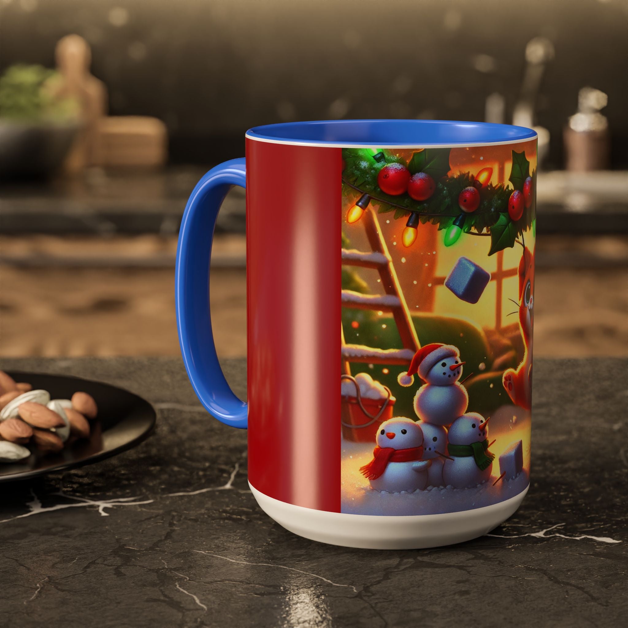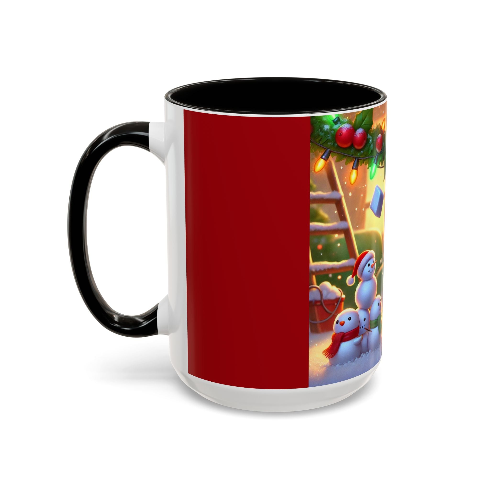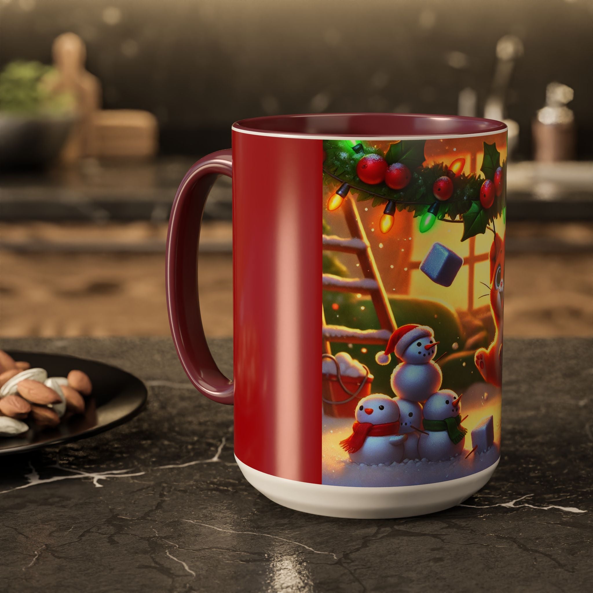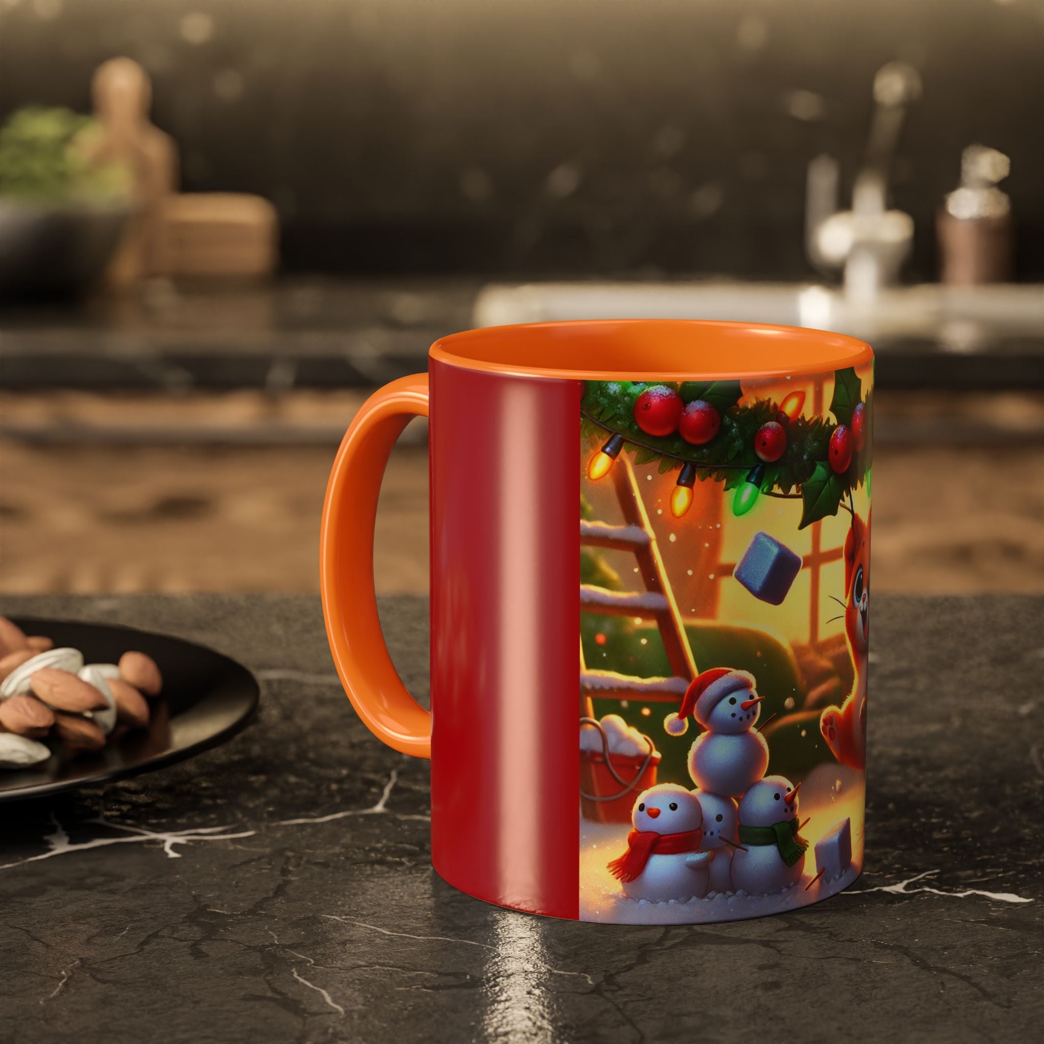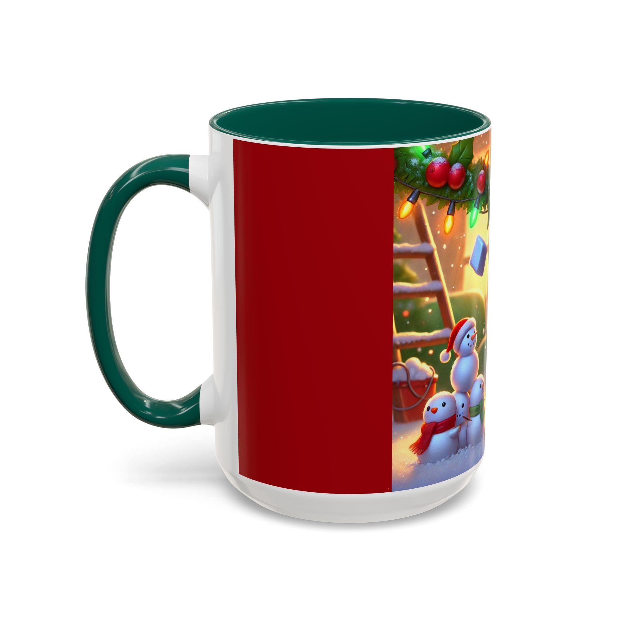 The design shows a playful orange kitten swinging from a garland of holly and Christmas lights as snow cubes tumble through the air. Below, three snowmen in colorful scarves watch with amusement, while warm golden light glows in the background. Cozy, whimsical, and fun, this mug is perfect for holiday mornings—whether you’re feeling naughty or nice.