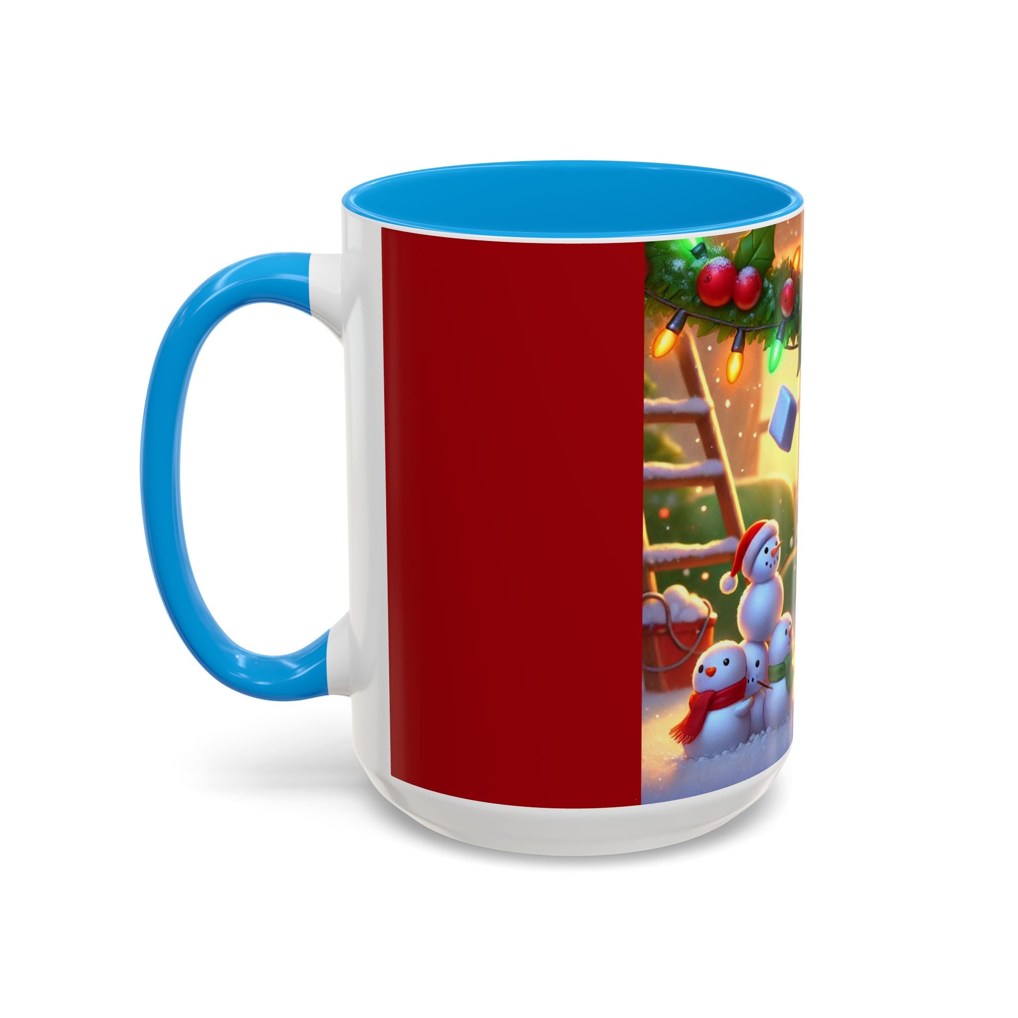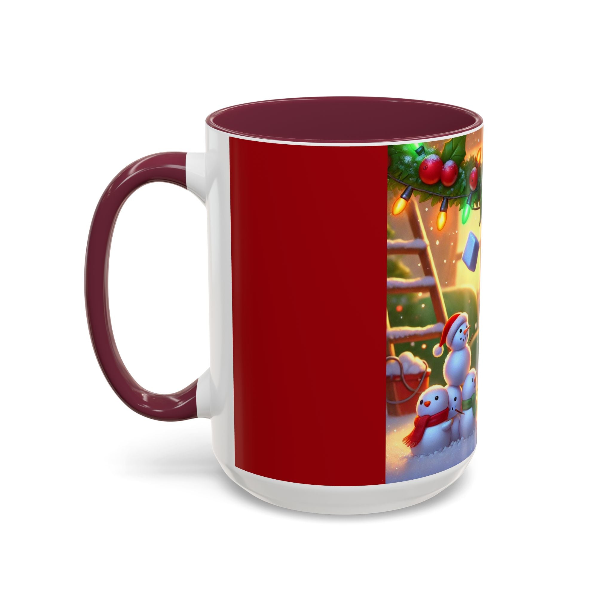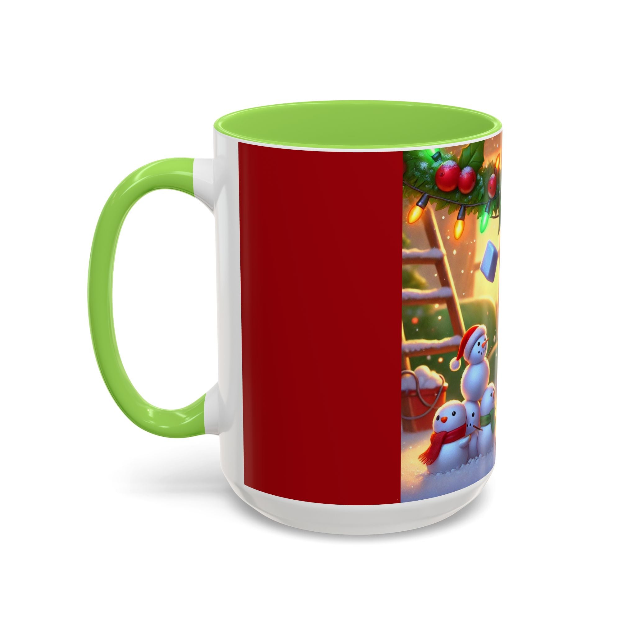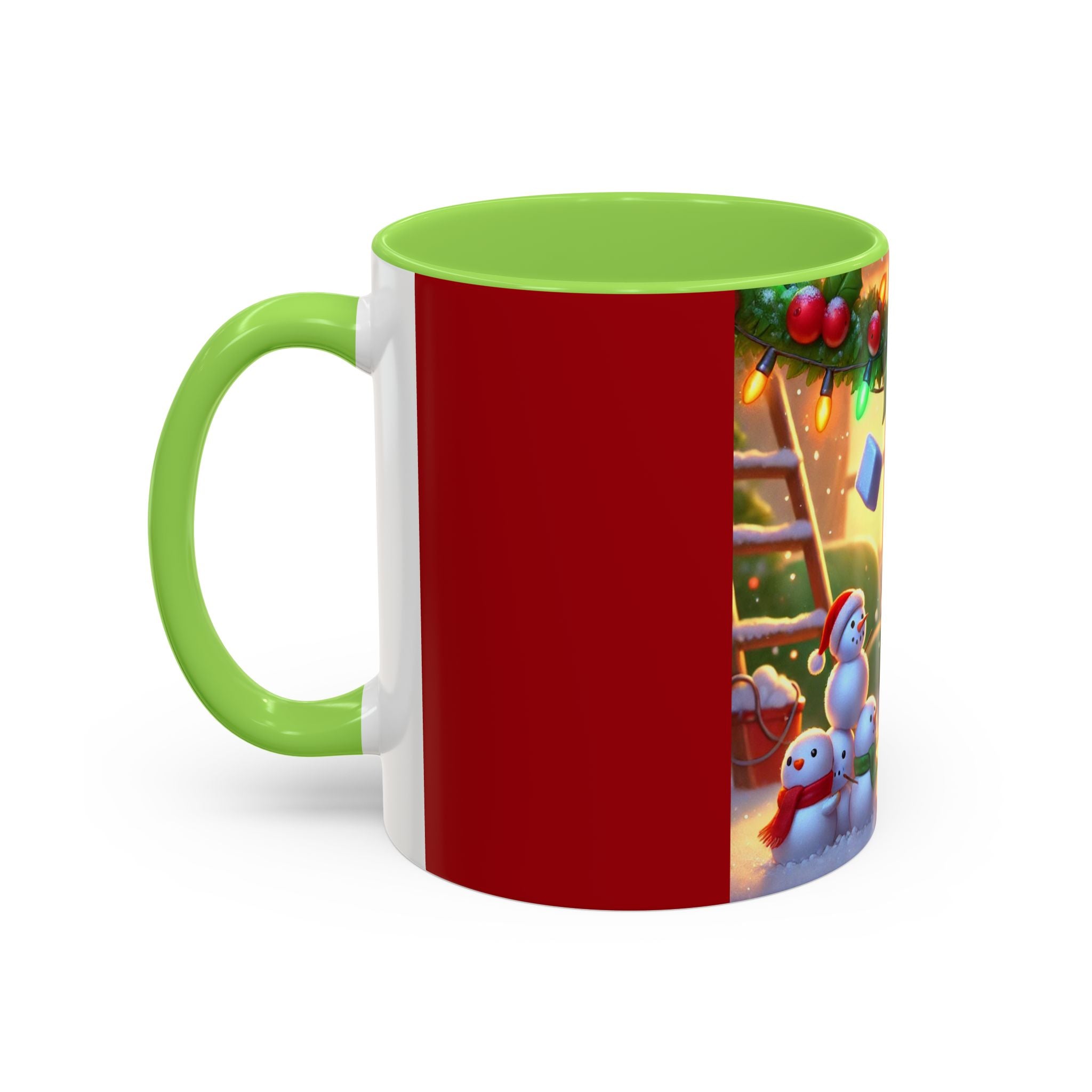 The design shows a playful orange kitten swinging from a garland of holly and Christmas lights as snow cubes tumble through the air. Below, three snowmen in colorful scarves watch with amusement, while warm golden light glows in the background. Cozy, whimsical, and fun, this mug is perfect for holiday mornings—whether you’re feeling naughty or nice.