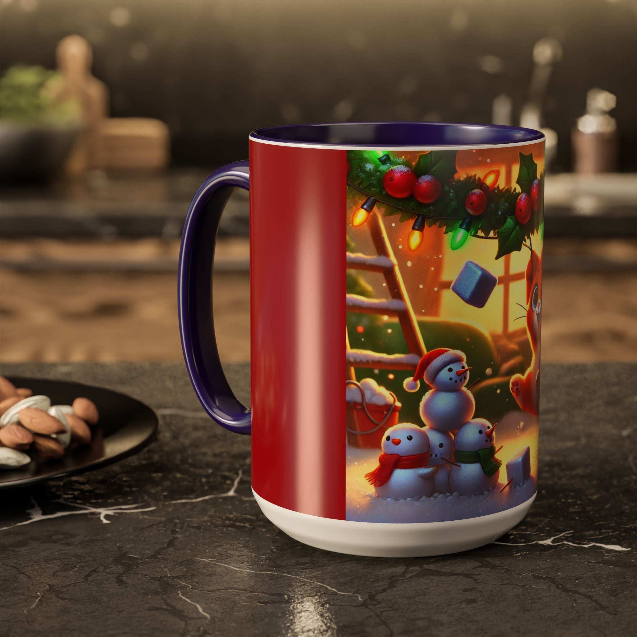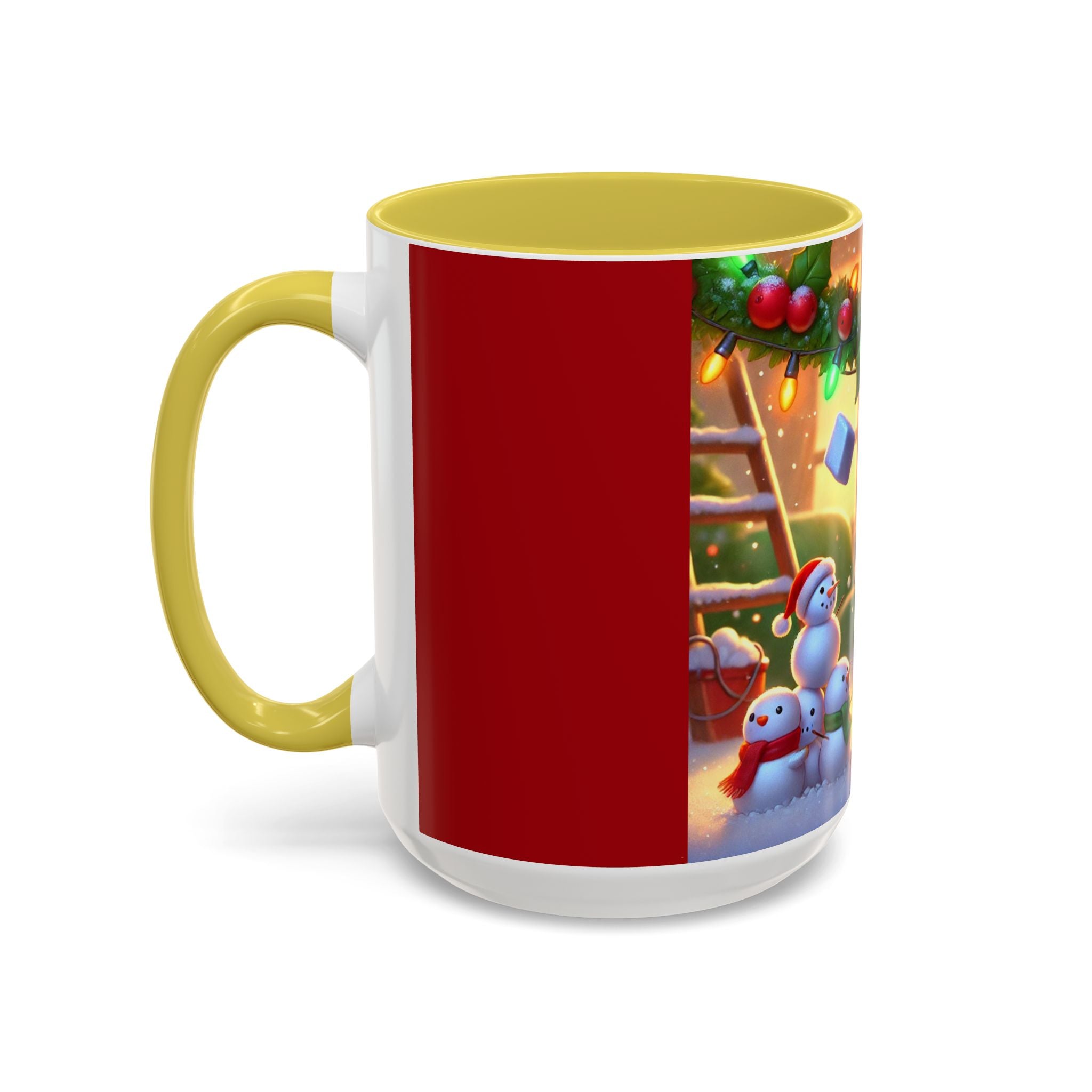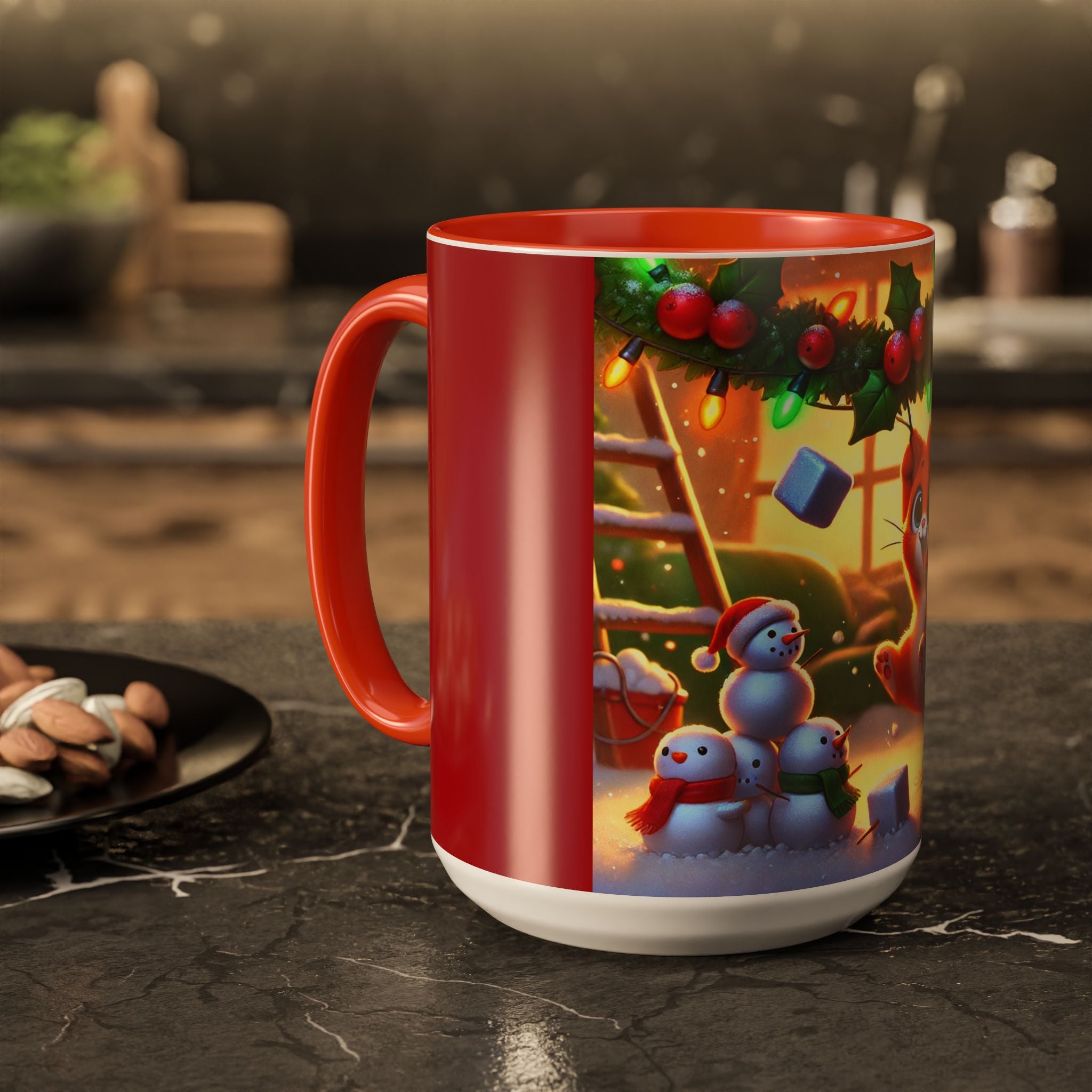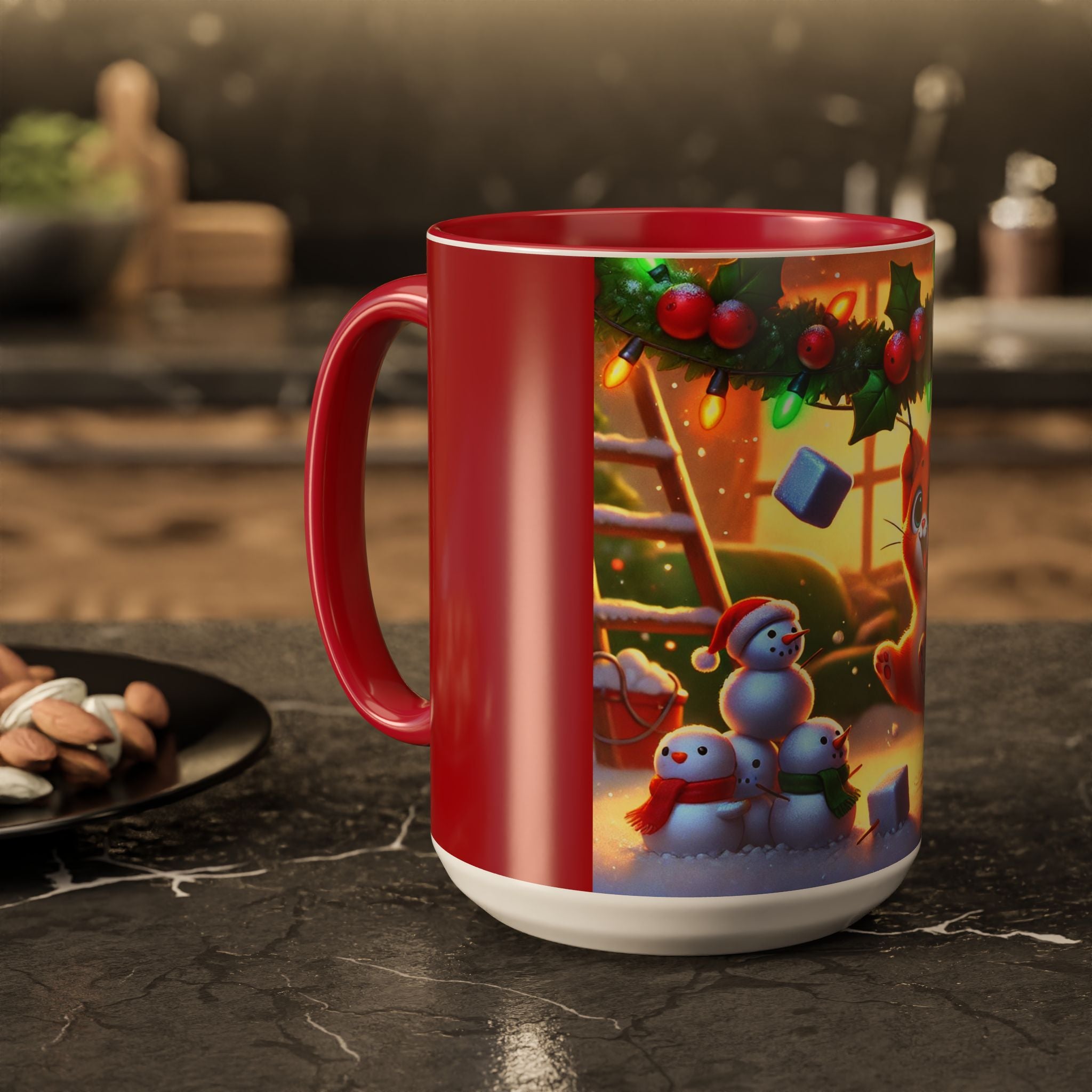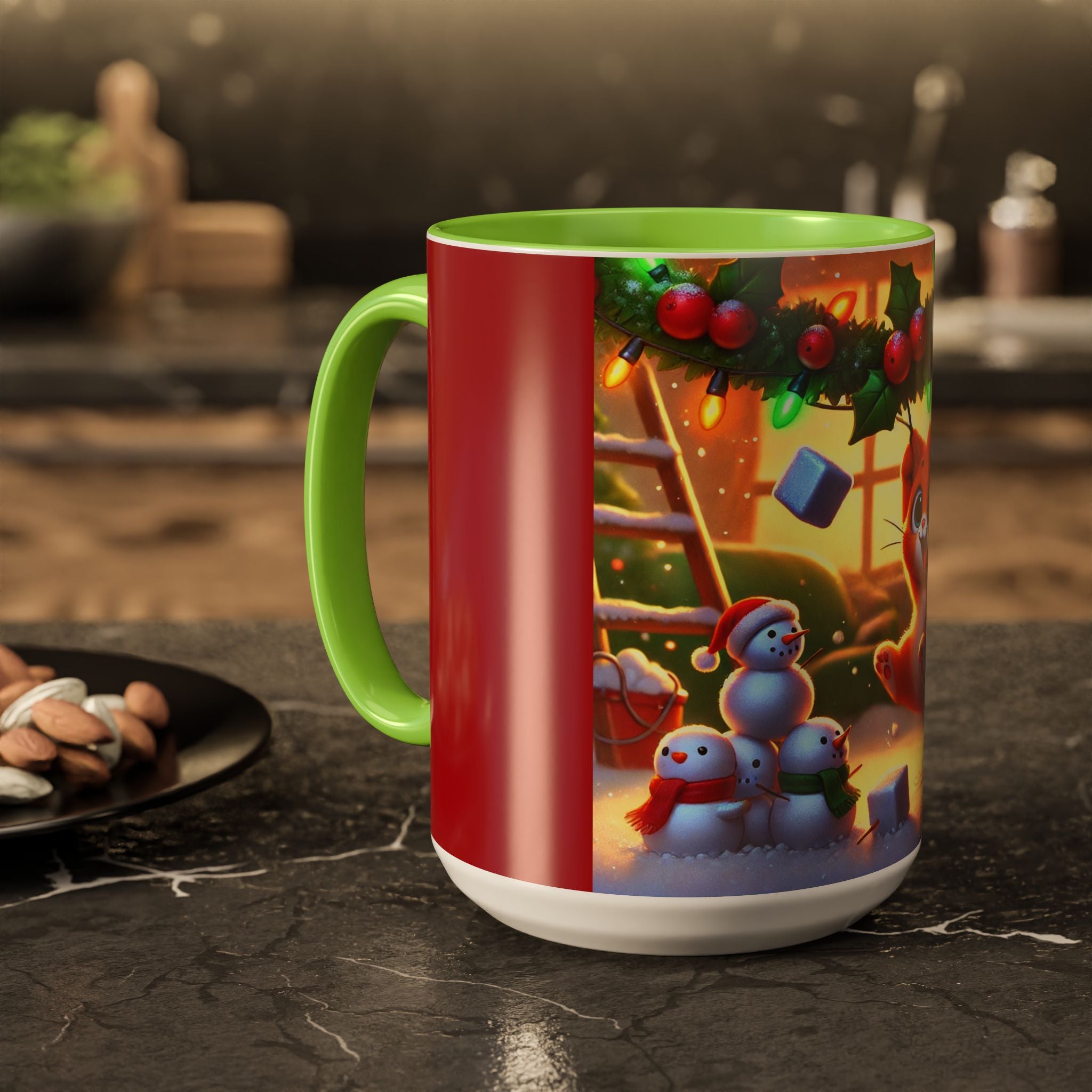 The design shows a playful orange kitten swinging from a garland of holly and Christmas lights as snow cubes tumble through the air. Below, three snowmen in colorful scarves watch with amusement, while warm golden light glows in the background. Cozy, whimsical, and fun, this mug is perfect for holiday mornings—whether you’re feeling naughty or nice.
