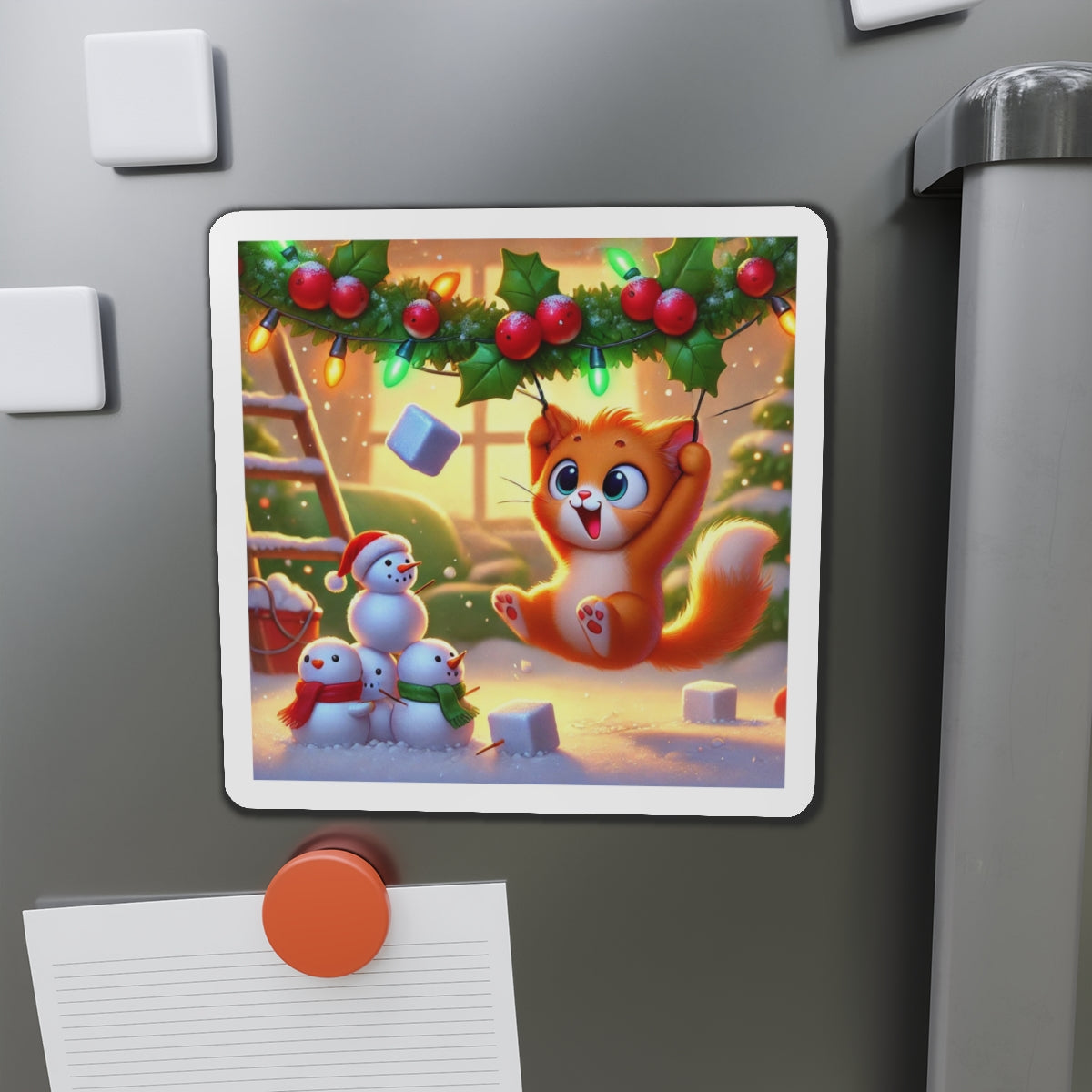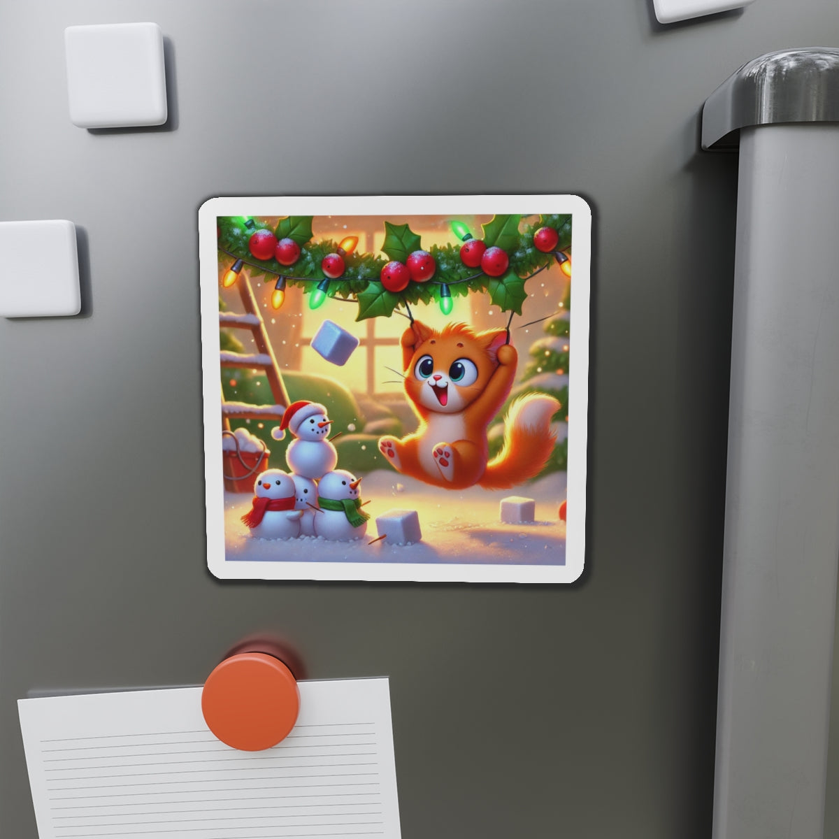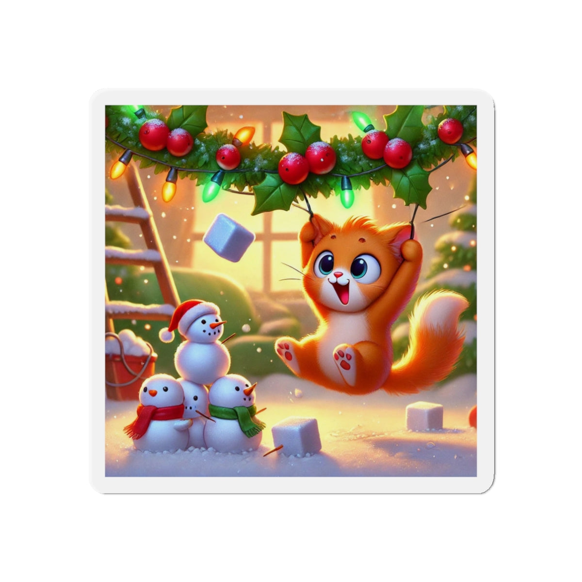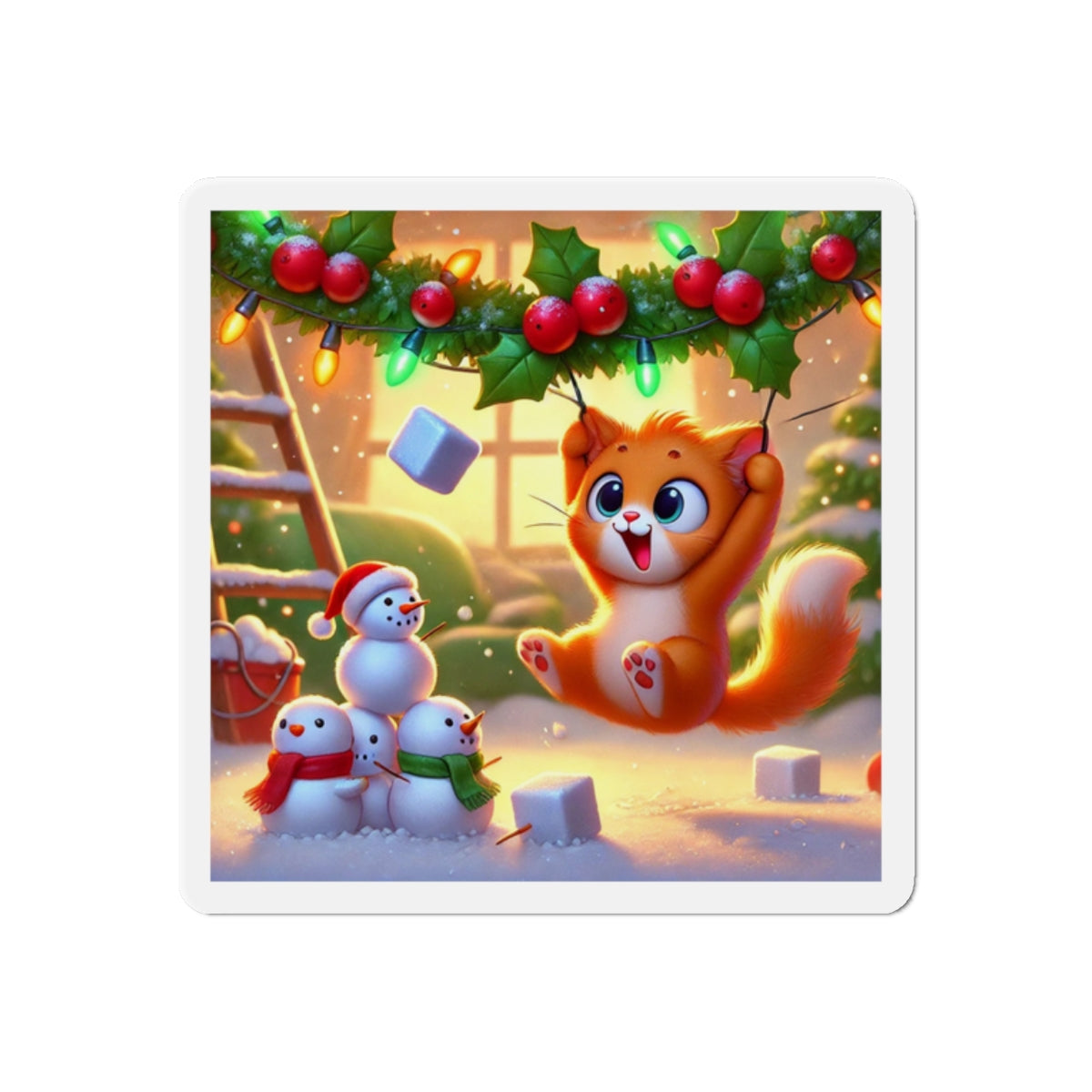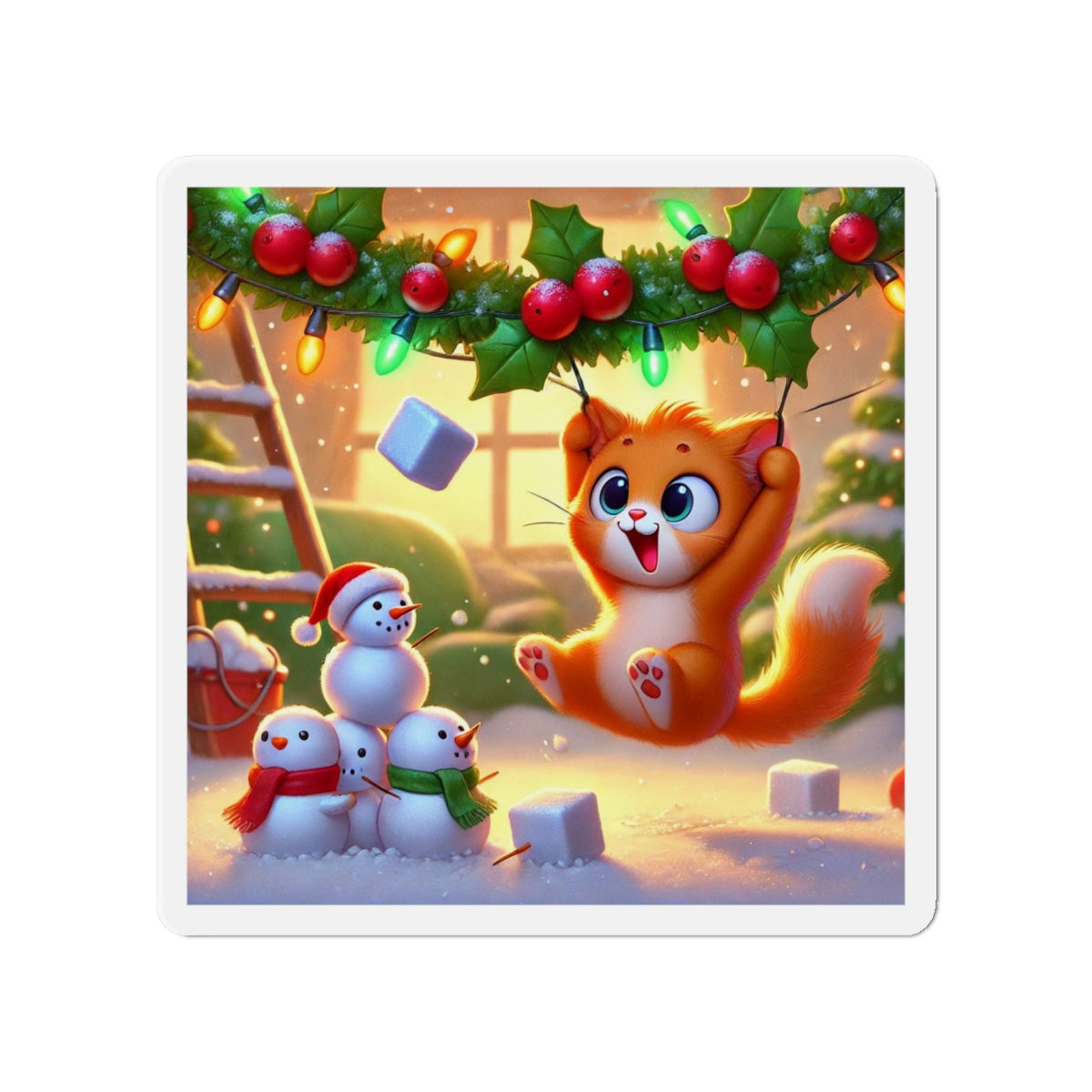 The artwork shows a playful orange kitten swinging from holly and Christmas lights as snow falls, while three cheerful snowmen in colorful scarves watch below. Fun and decorative, these magnets spread holiday cheer—whether you’re naughty or nice.