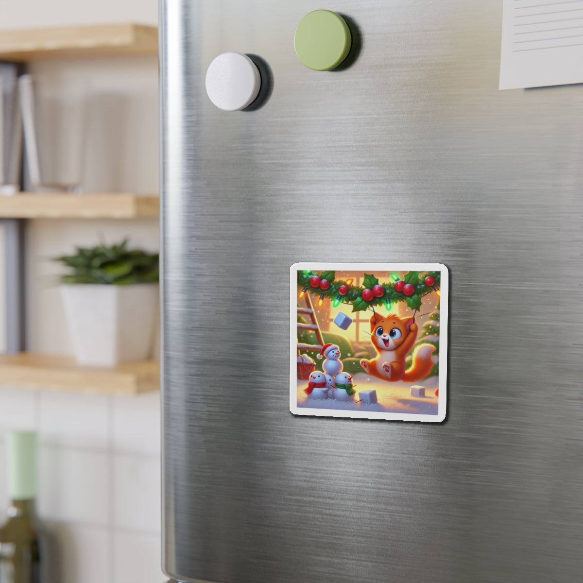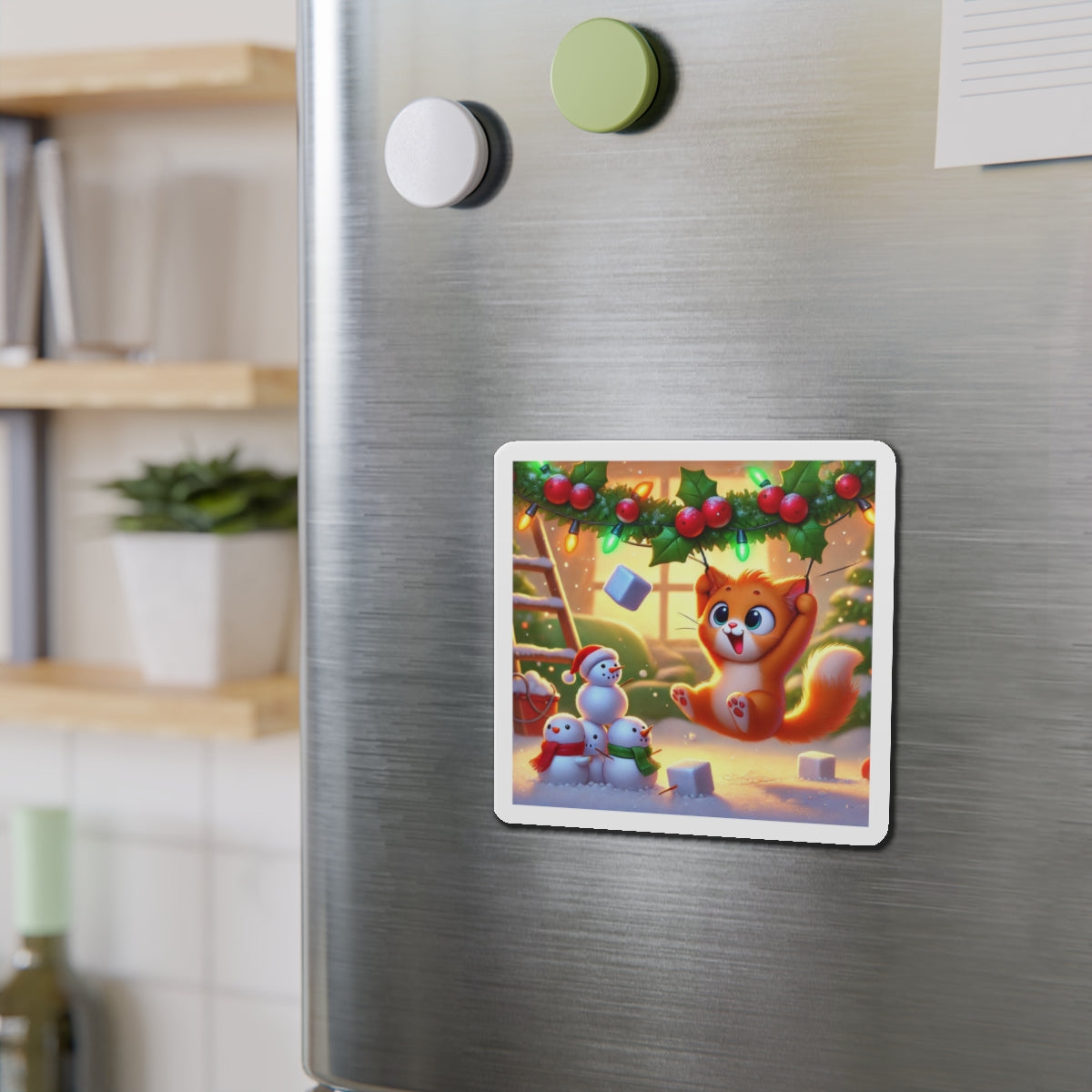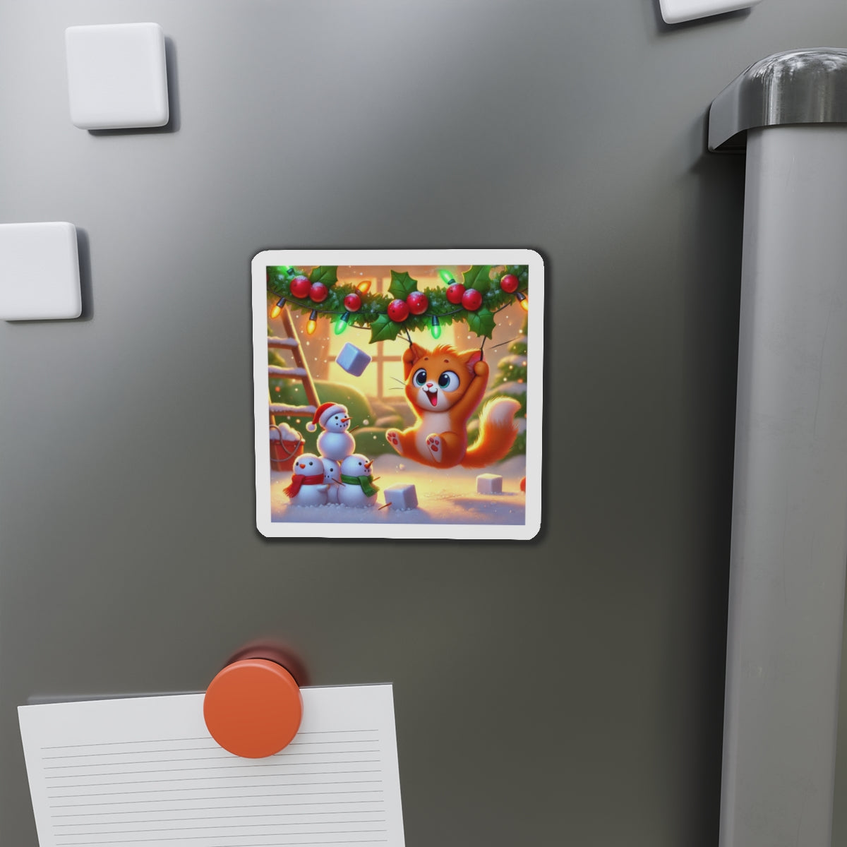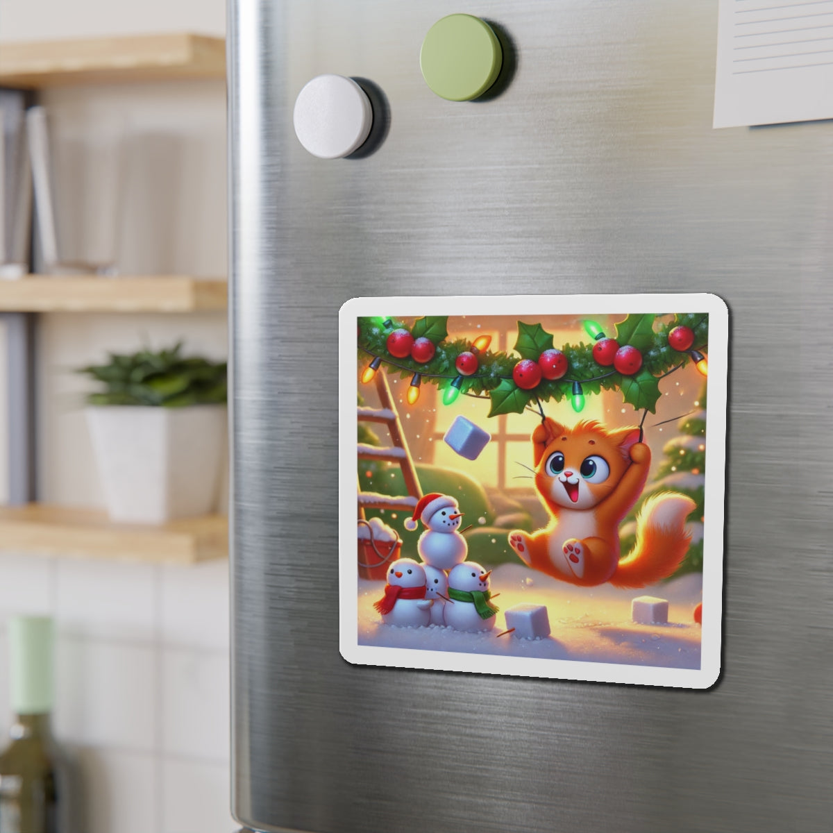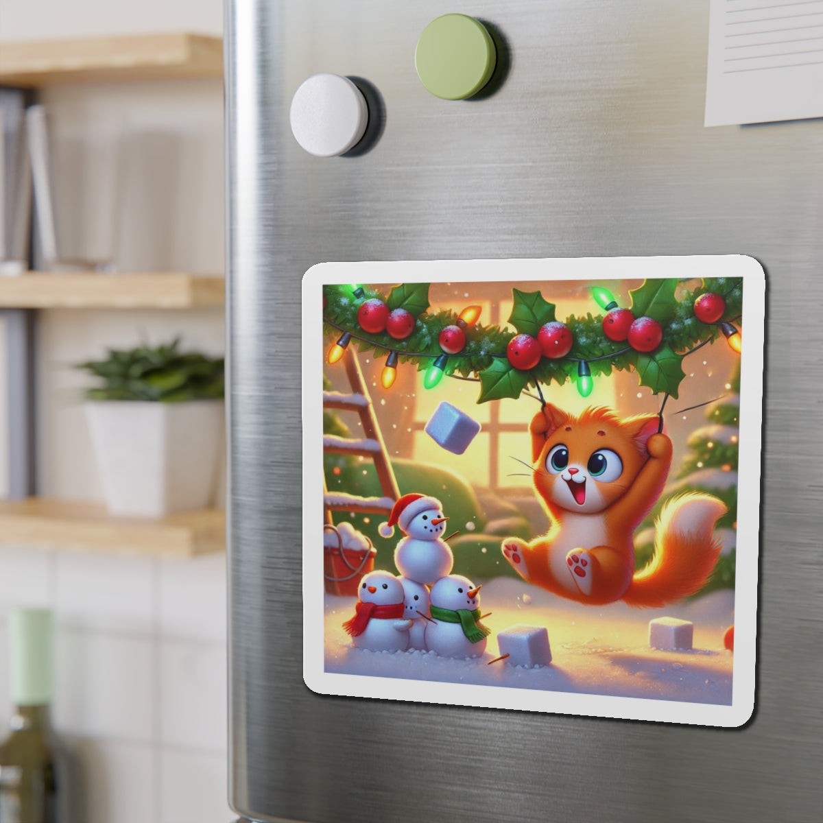 The artwork shows a playful orange kitten swinging from holly and Christmas lights as snow falls, while three cheerful snowmen in colorful scarves watch below. Fun and decorative, these magnets spread holiday cheer—whether you’re naughty or nice.