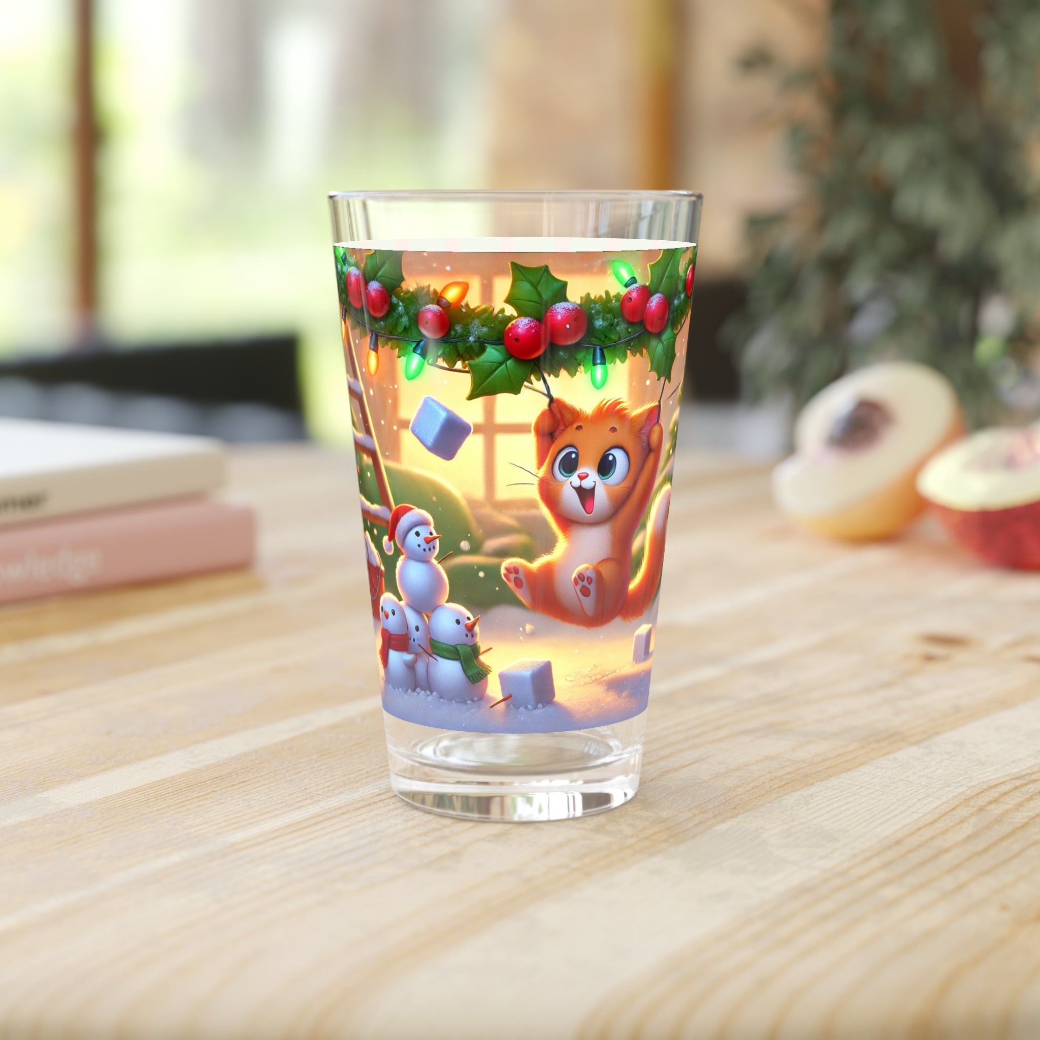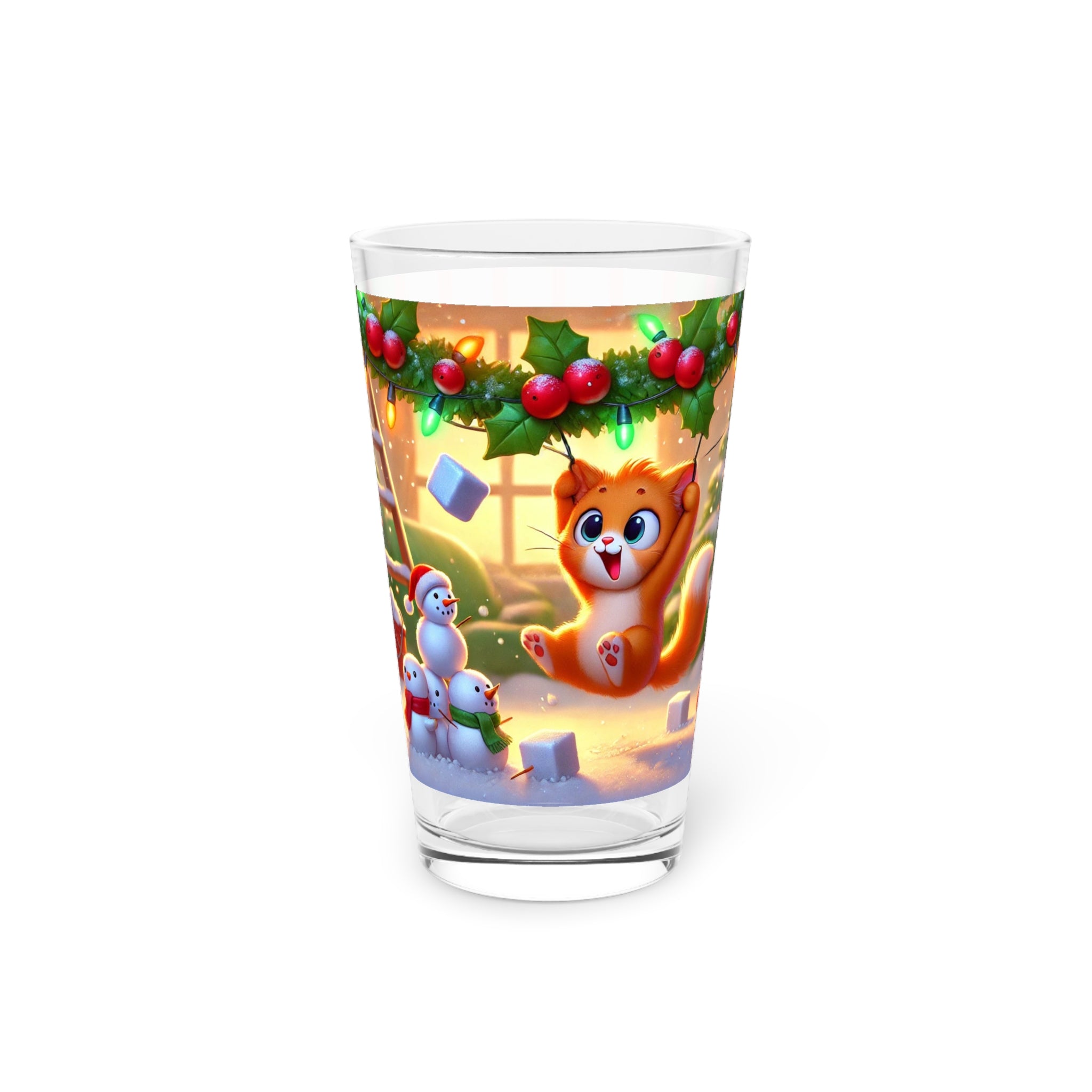 The artwork shows a playful orange kitten swinging from holly and Christmas lights as snow tumbles through the air. Three cheerful snowmen in colorful scarves look on, adding whimsy and warmth to this functional holiday glass—perfect for every celebration, naughty or nice.