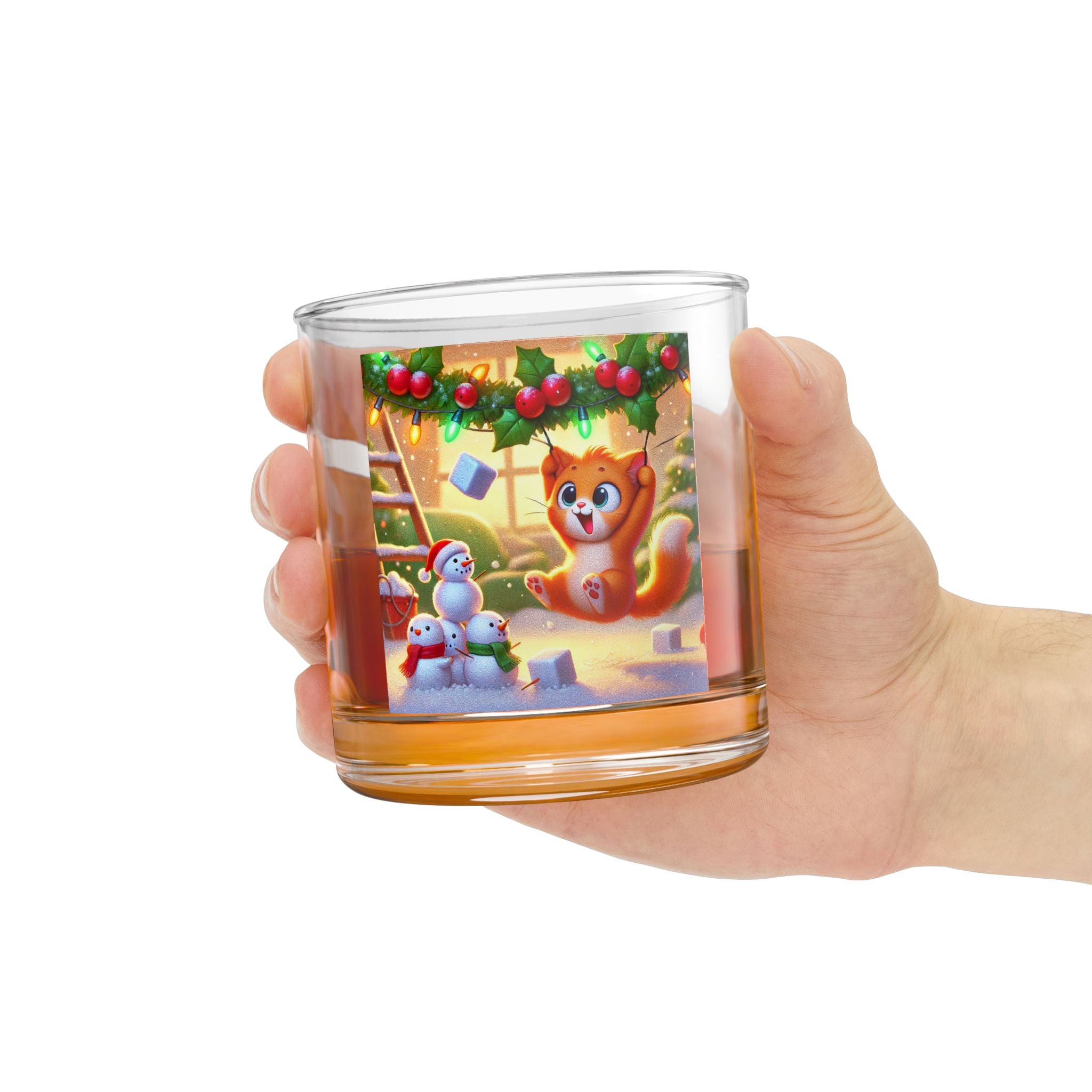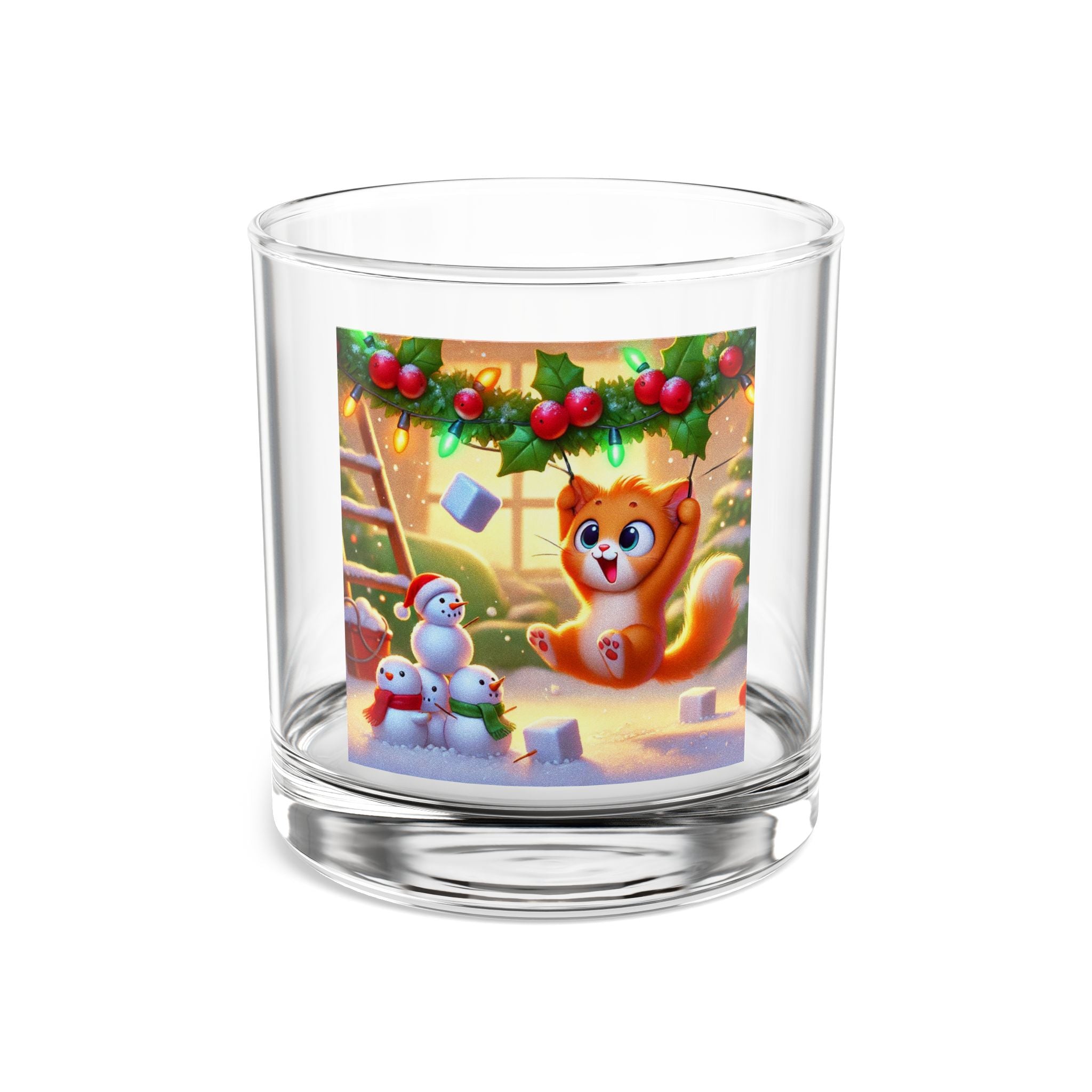 The artwork shows a playful orange kitten swinging from holly and Christmas lights as snow falls, while three cheerful snowmen in colorful scarves look on. Durable, practical, and full of whimsy, it’s the perfect holiday glass—whether you’re naughty or nice.