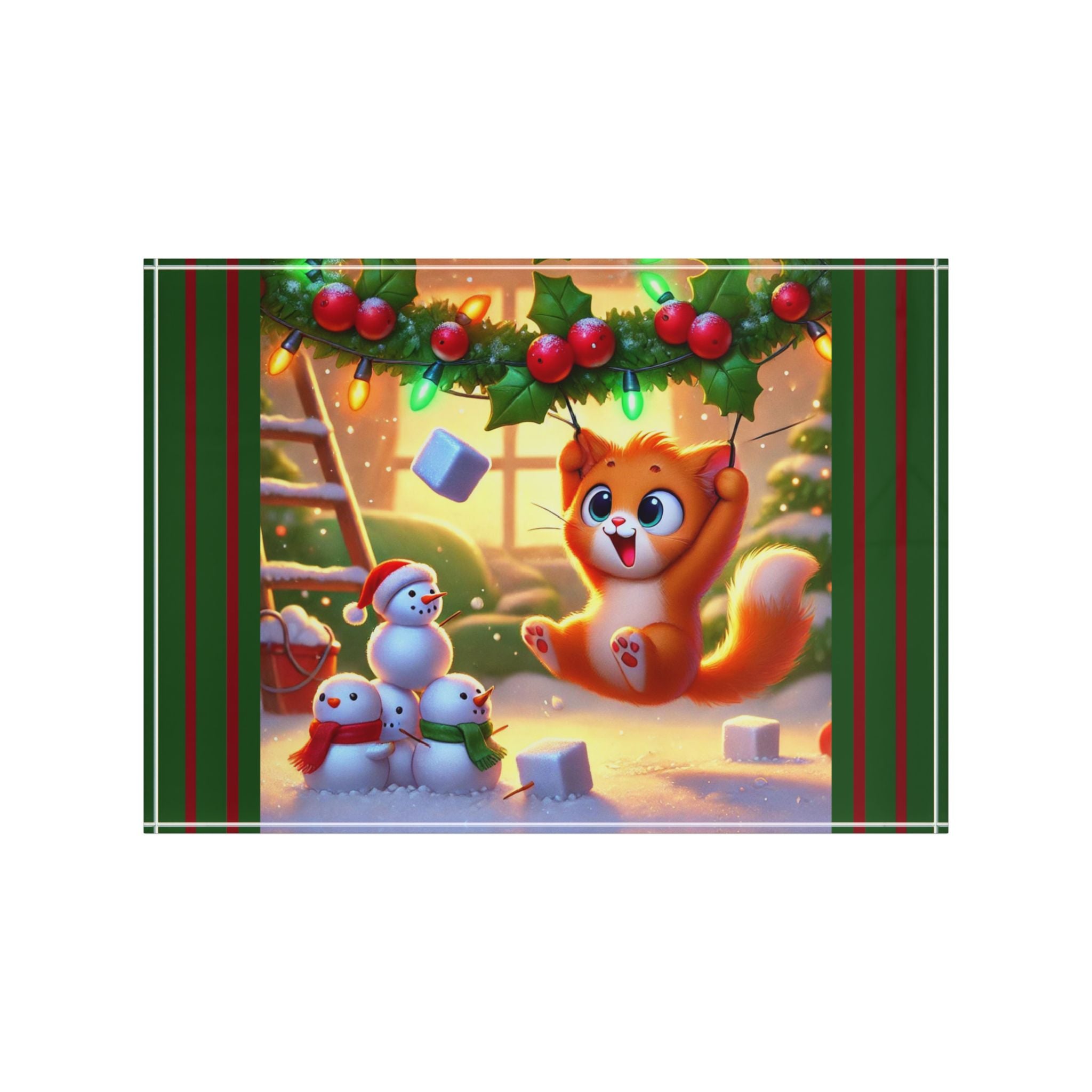 The artwork shows a playful orange kitten swinging from holly and Christmas lights as snow falls, while three cheerful snowmen in colorful scarves watch below. Whimsical and bright, this art block is a holiday keepsake—whether you’re naughty or nice.