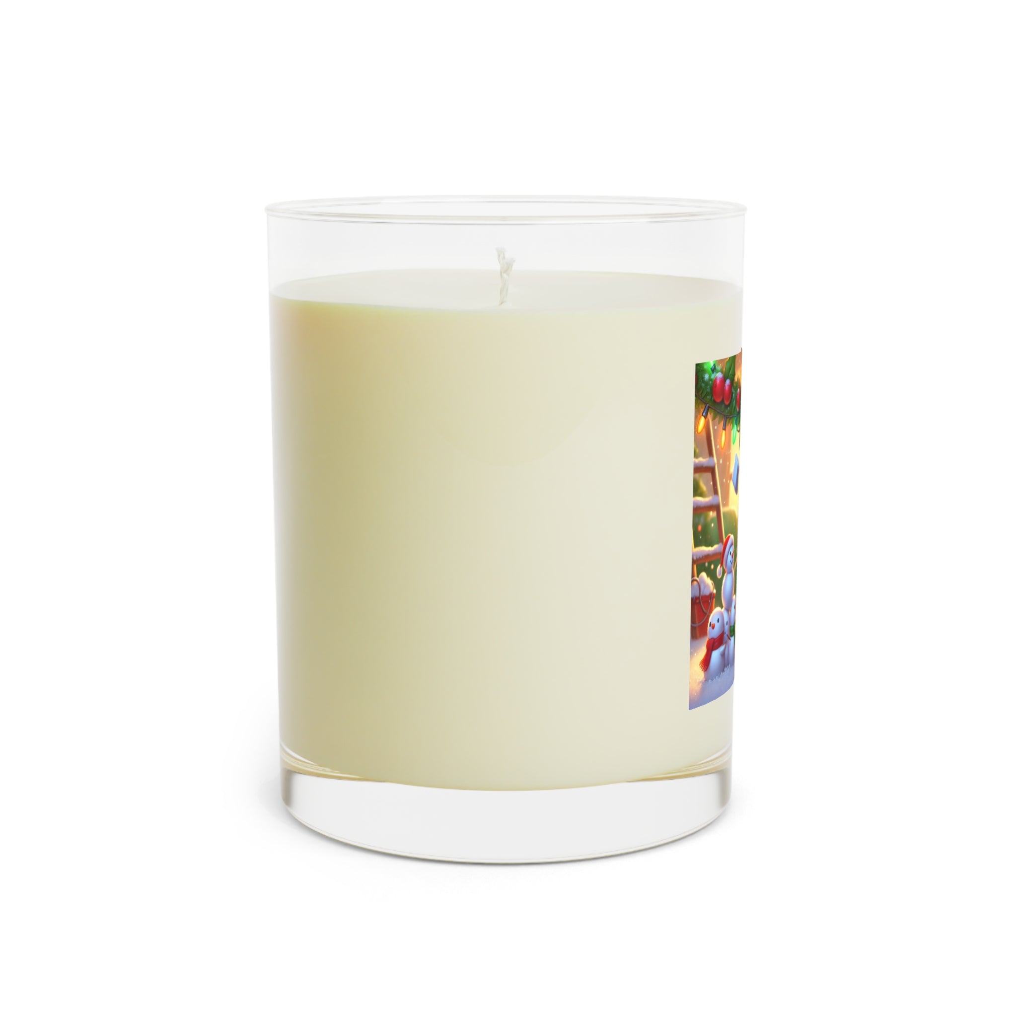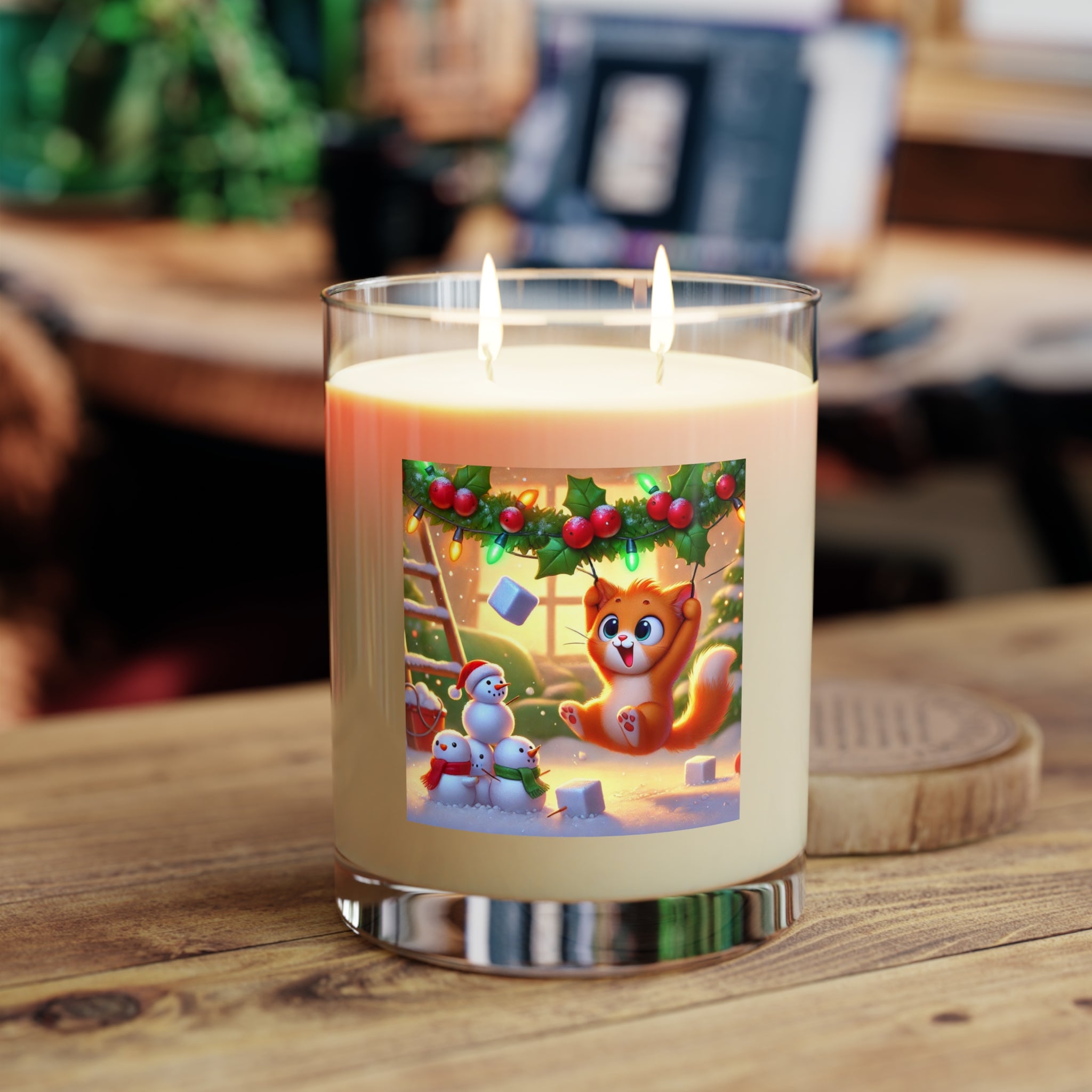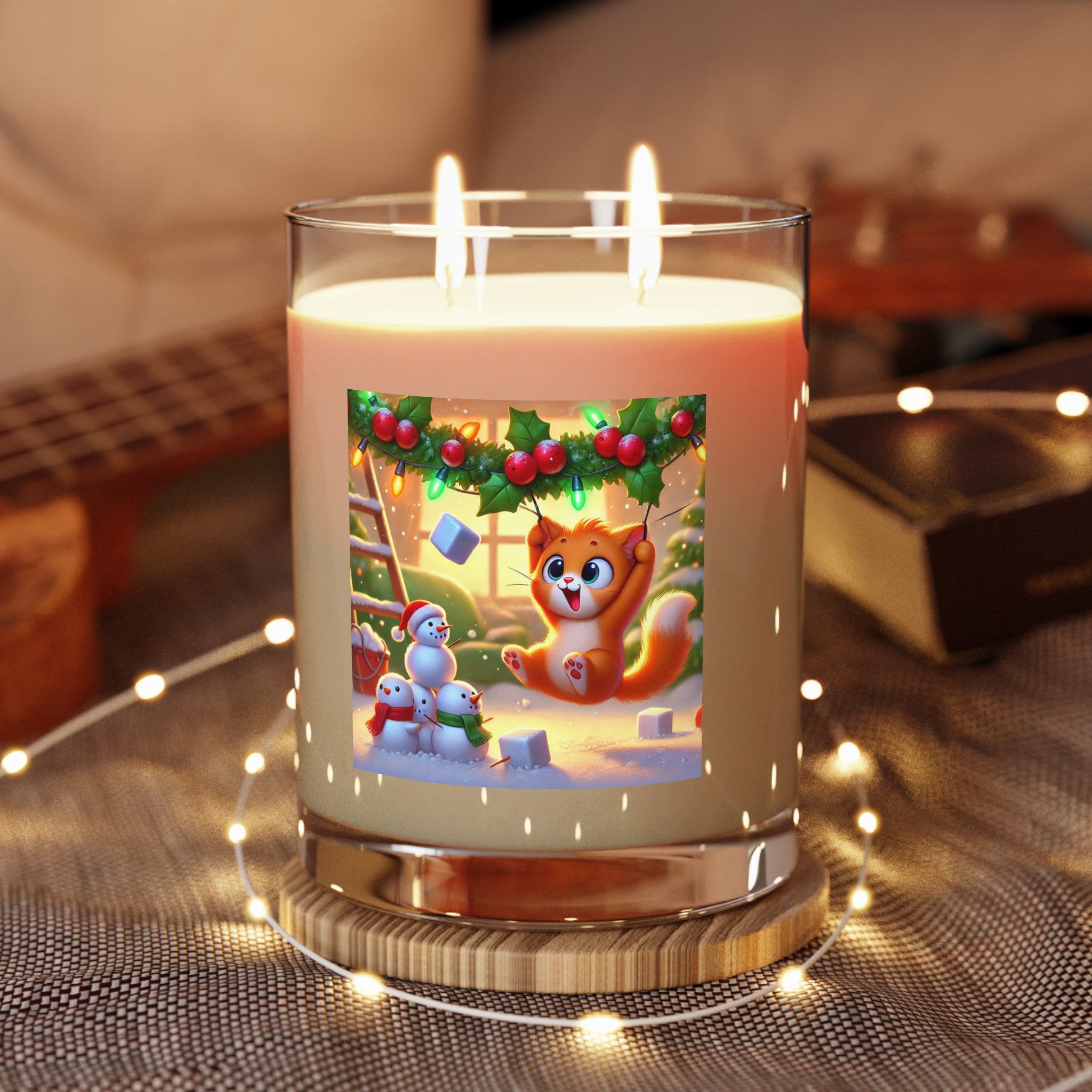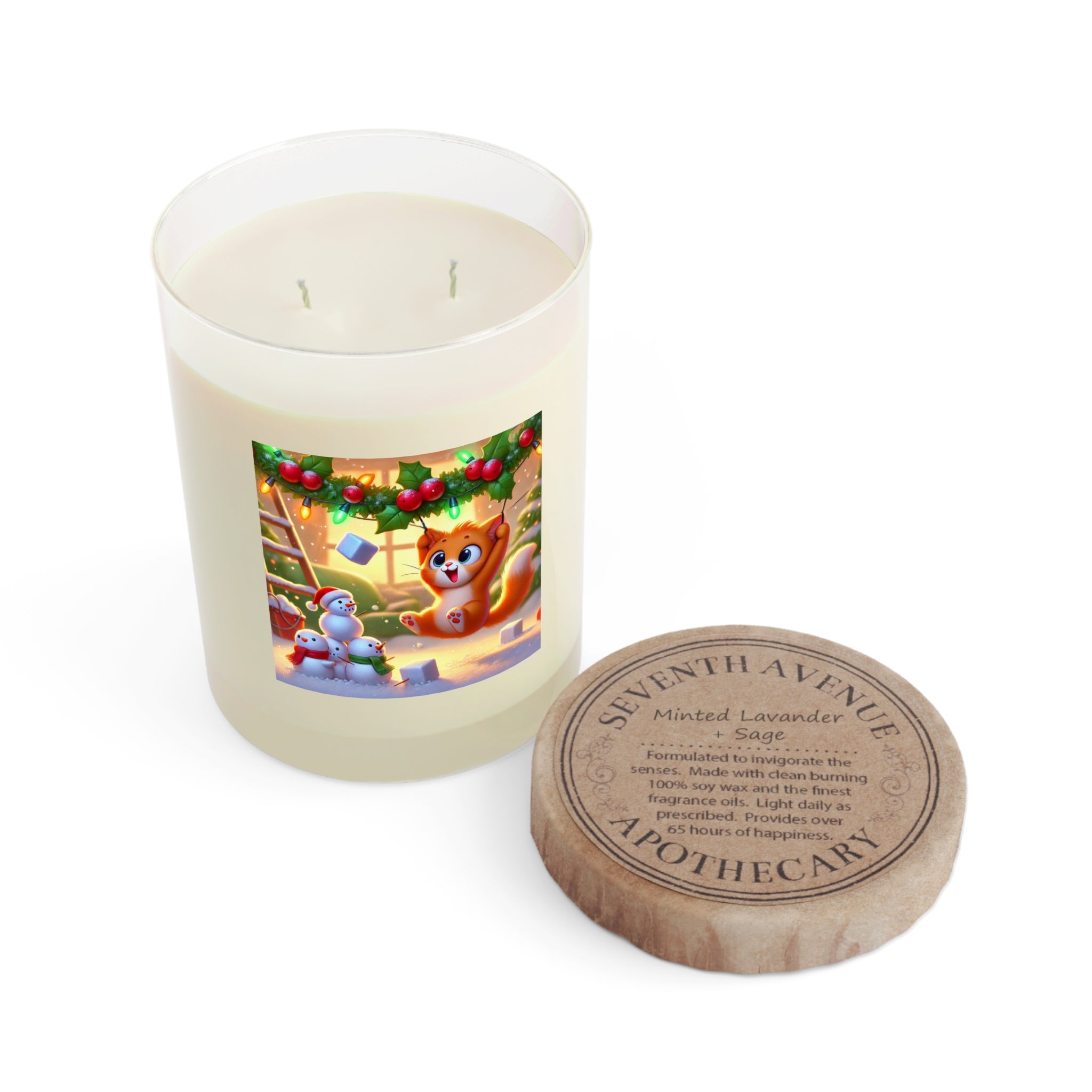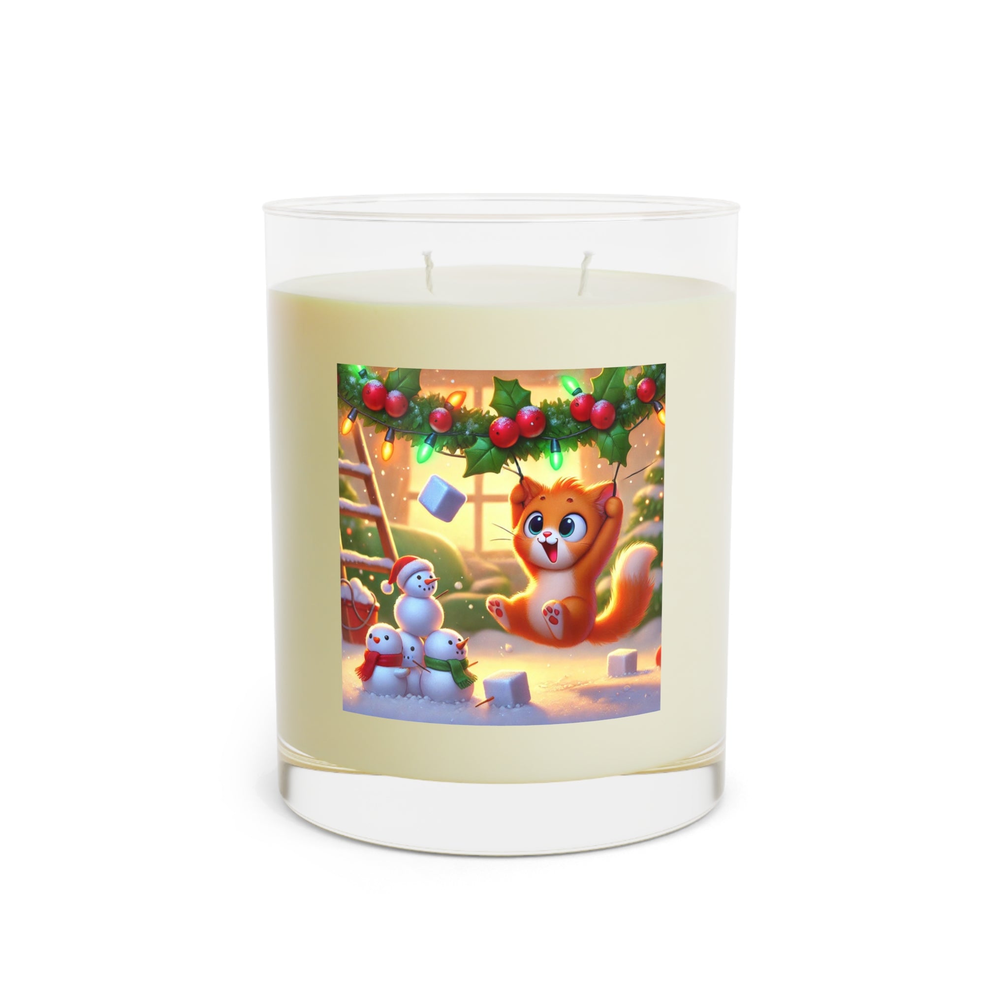 The artwork features a playful orange kitten swinging from holly and Christmas lights as snow falls, while three cheerful snowmen in colorful scarves watch below. A cozy blend of festive design and aromatherapy, this candle makes every moment brighter—whether you’re naughty or nice.