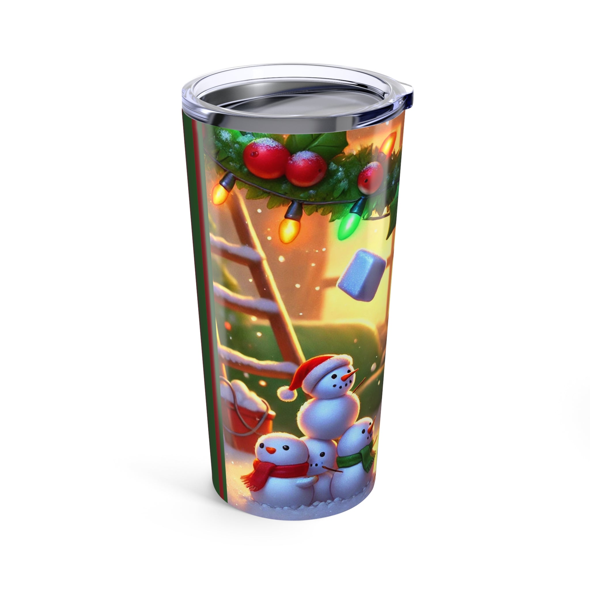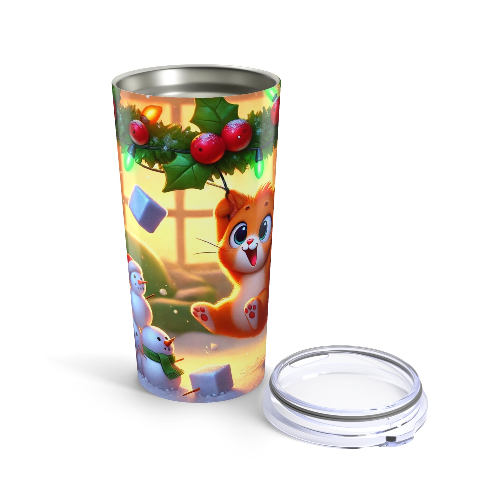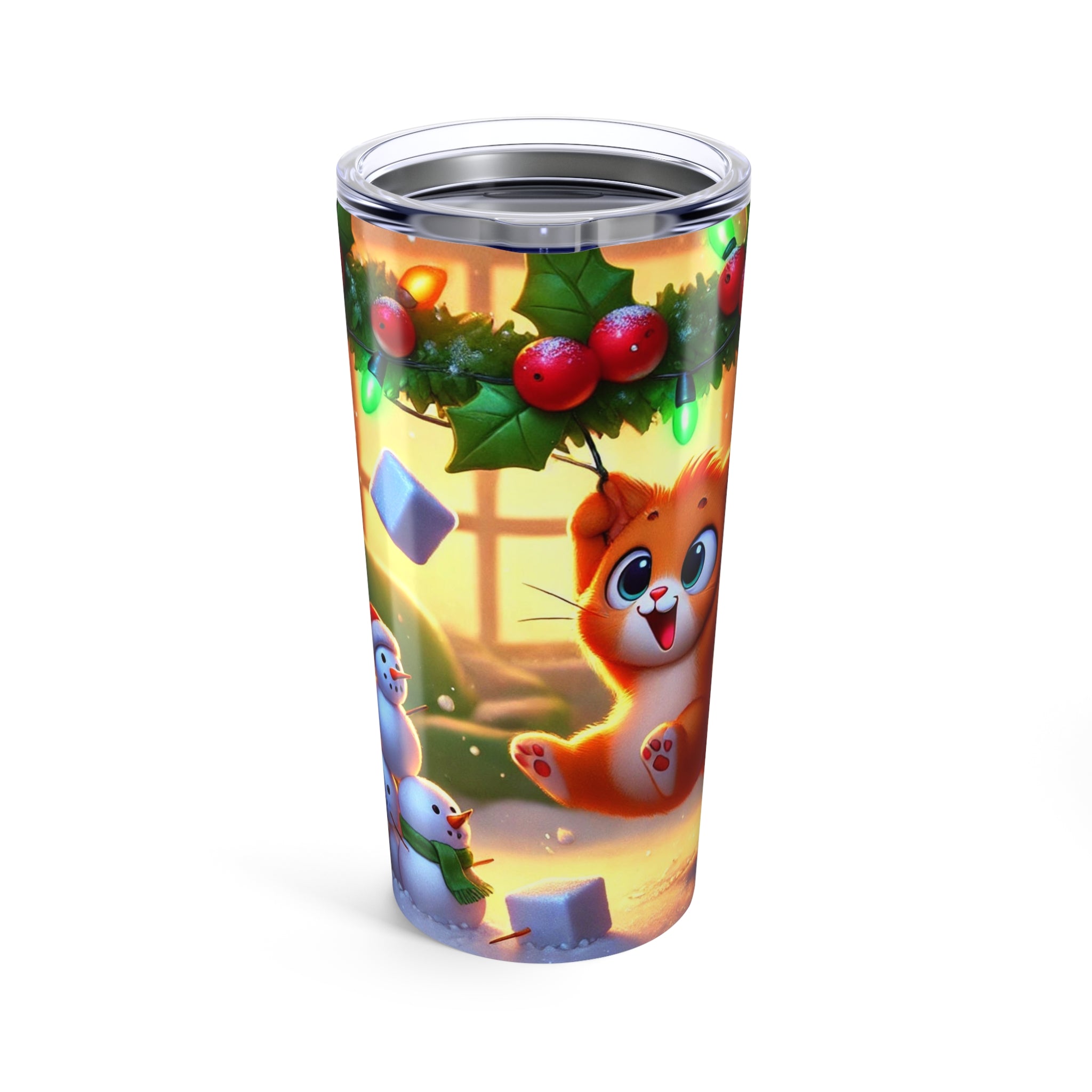 The artwork shows a playful orange kitten swinging from a garland of holly and Christmas lights as snow tumbles through the air. Three cheerful snowmen in colorful scarves watch from below, adding whimsy and warmth to this festive tumbler—perfect for every sip, whether you’re naughty or nice.