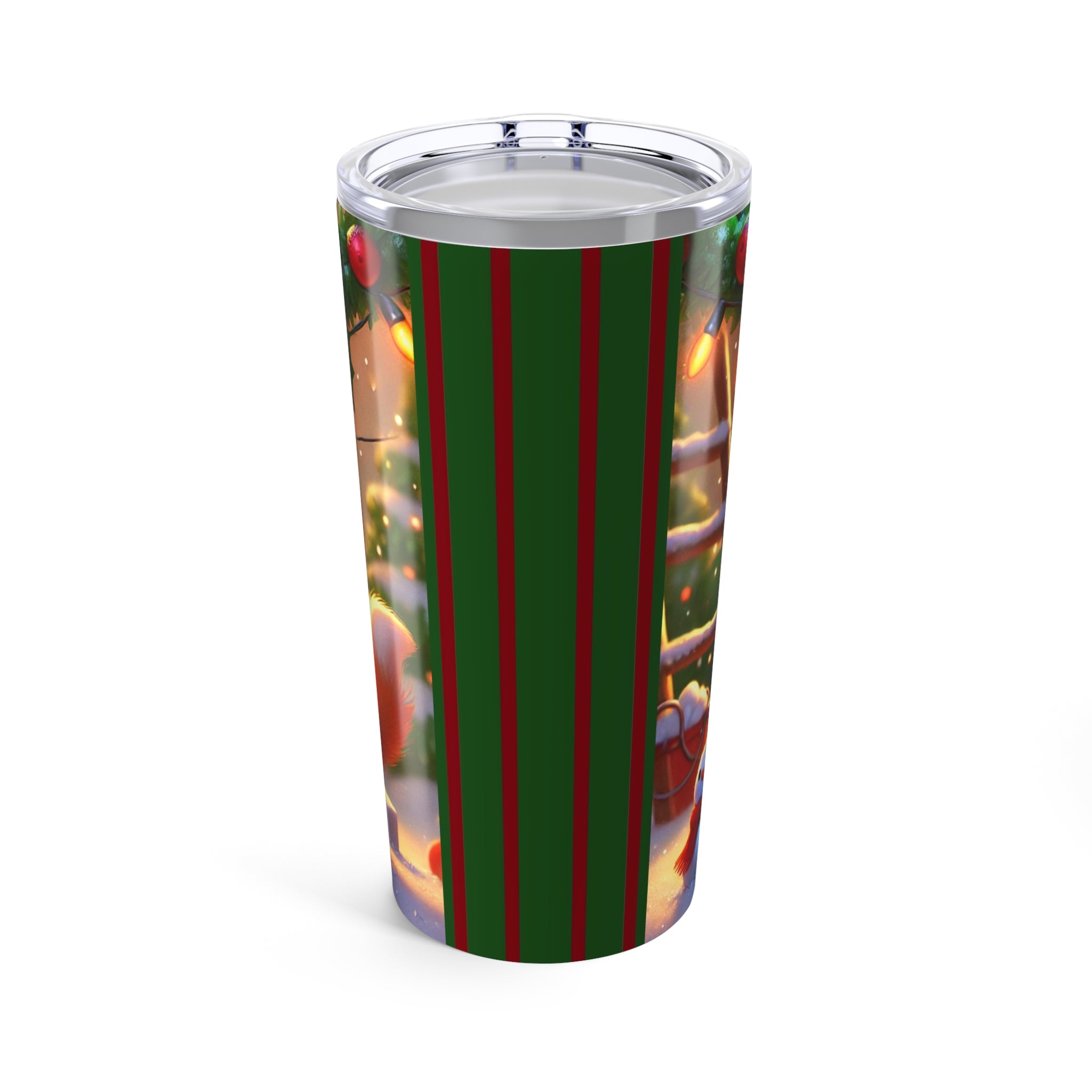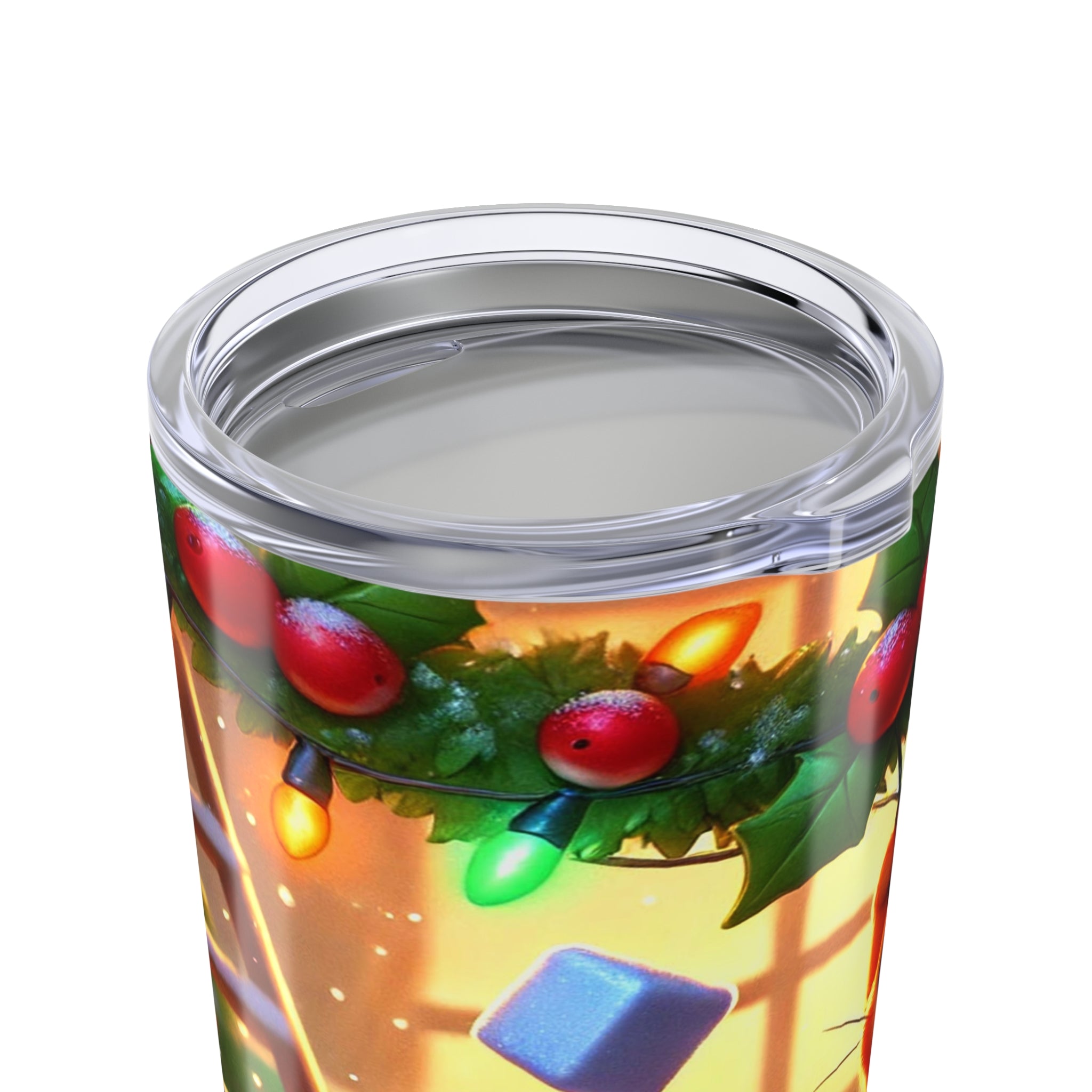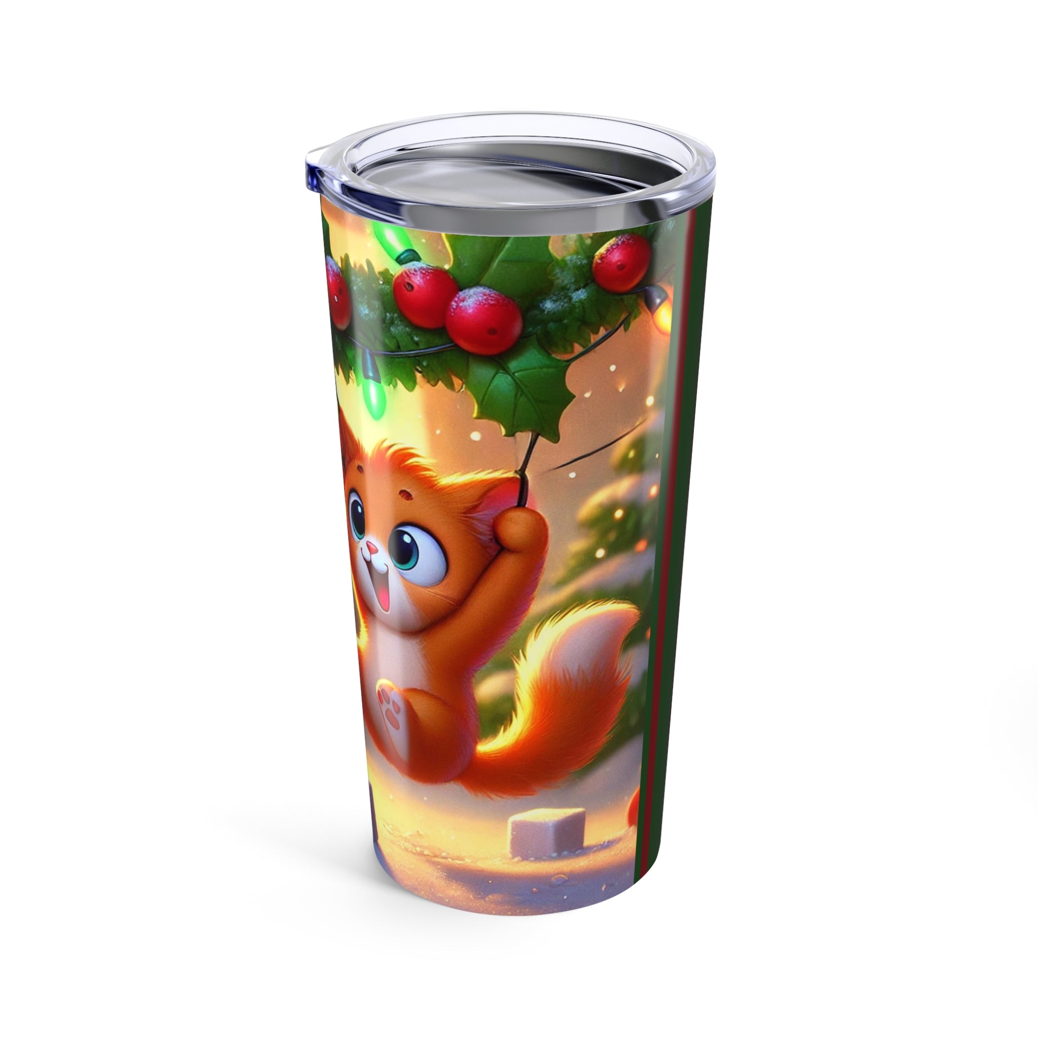 The artwork shows a playful orange kitten swinging from a garland of holly and Christmas lights as snow tumbles through the air. Three cheerful snowmen in colorful scarves watch from below, adding whimsy and warmth to this festive tumbler—perfect for every sip, whether you’re naughty or nice.