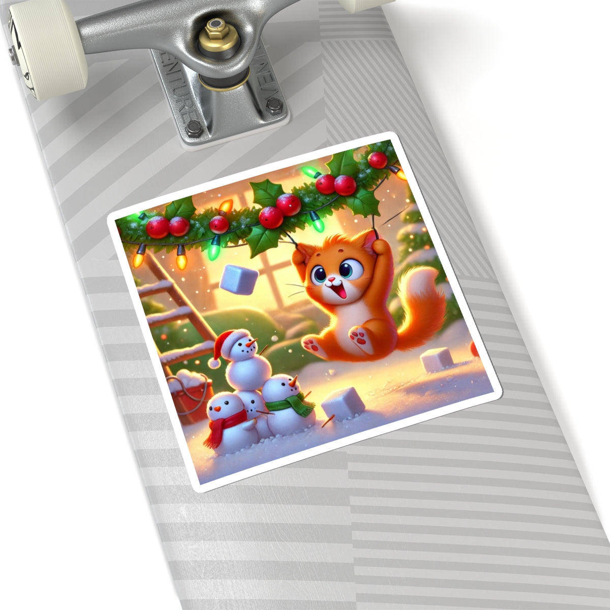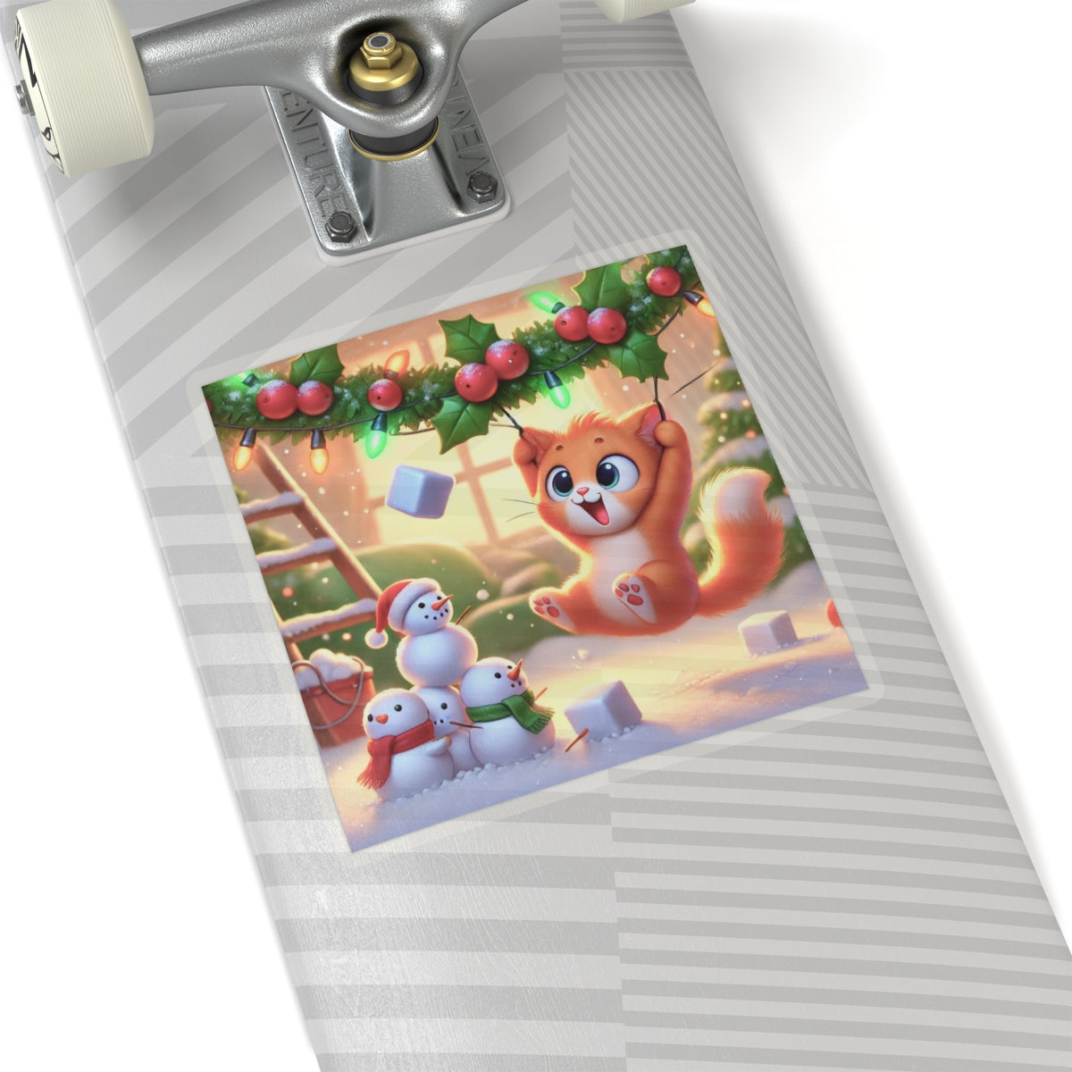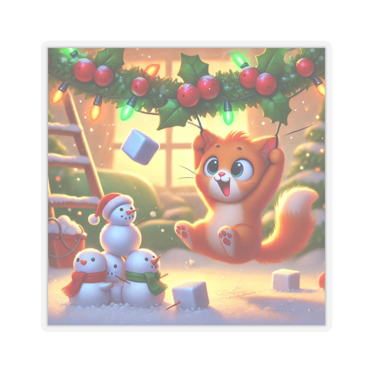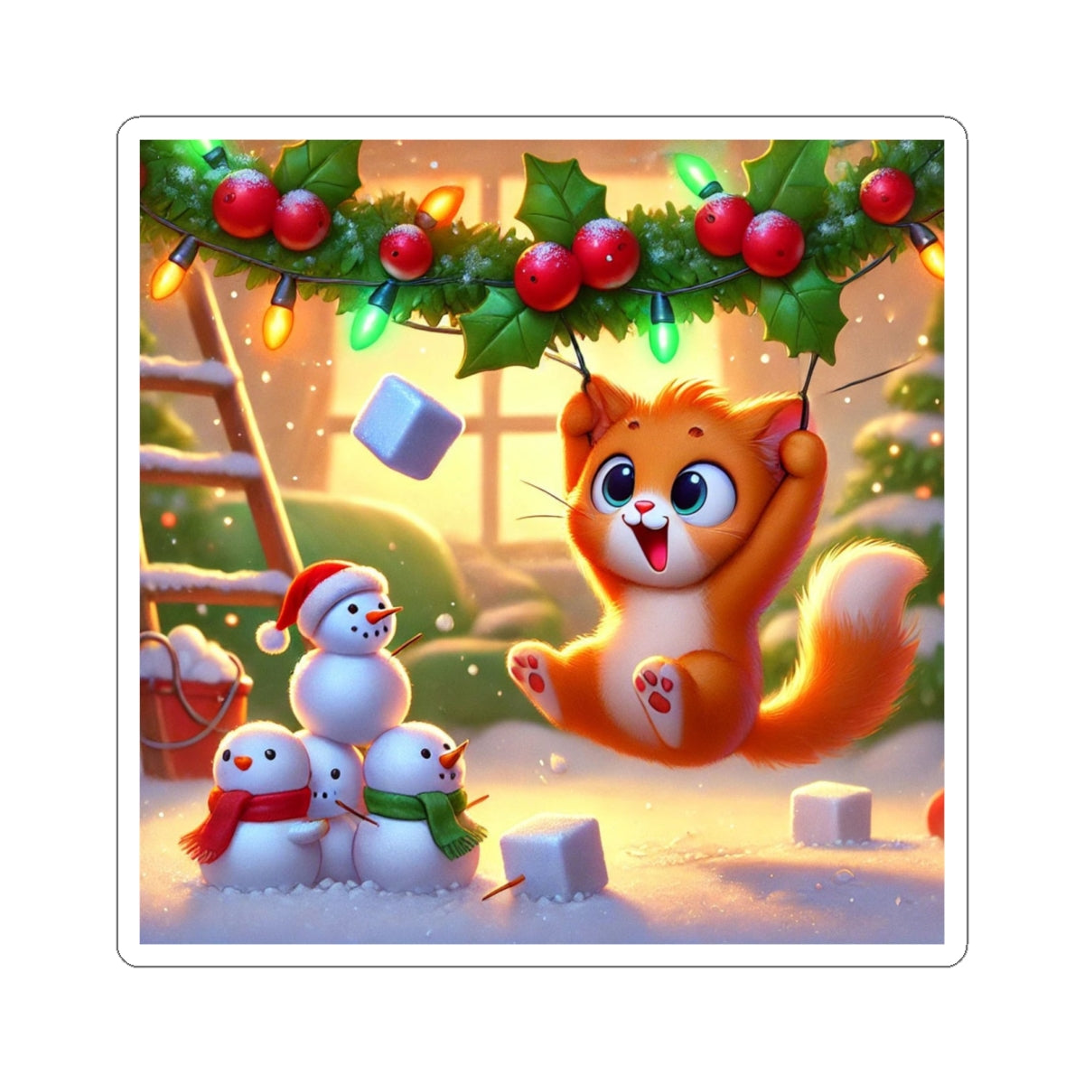 Bring a dose of holiday mischief to your favorite surfaces with this charming design. A playful orange kitten swings gleefully from strands of holly and twinkling Christmas lights as snowflakes drift around. Below, three cheerful snowmen look on in delight, creating a scene bursting with festive warmth and humor.