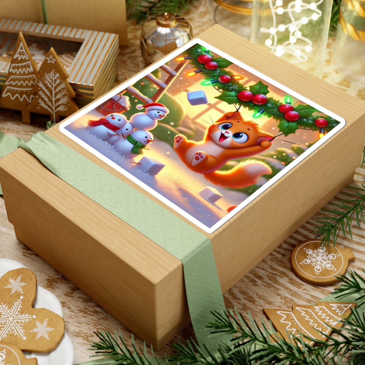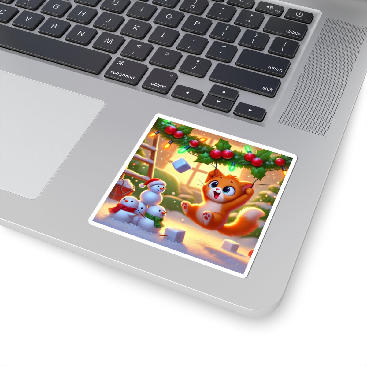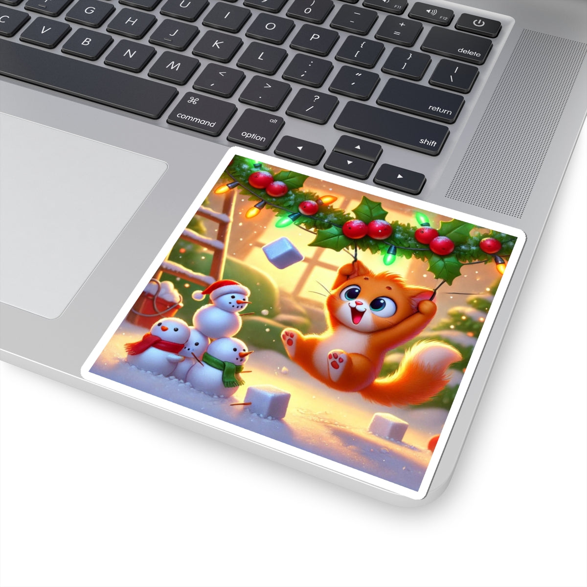 Bring a dose of holiday mischief to your favorite surfaces with this charming design. A playful orange kitten swings gleefully from strands of holly and twinkling Christmas lights as snowflakes drift around. Below, three cheerful snowmen look on in delight, creating a scene bursting with festive warmth and humor.