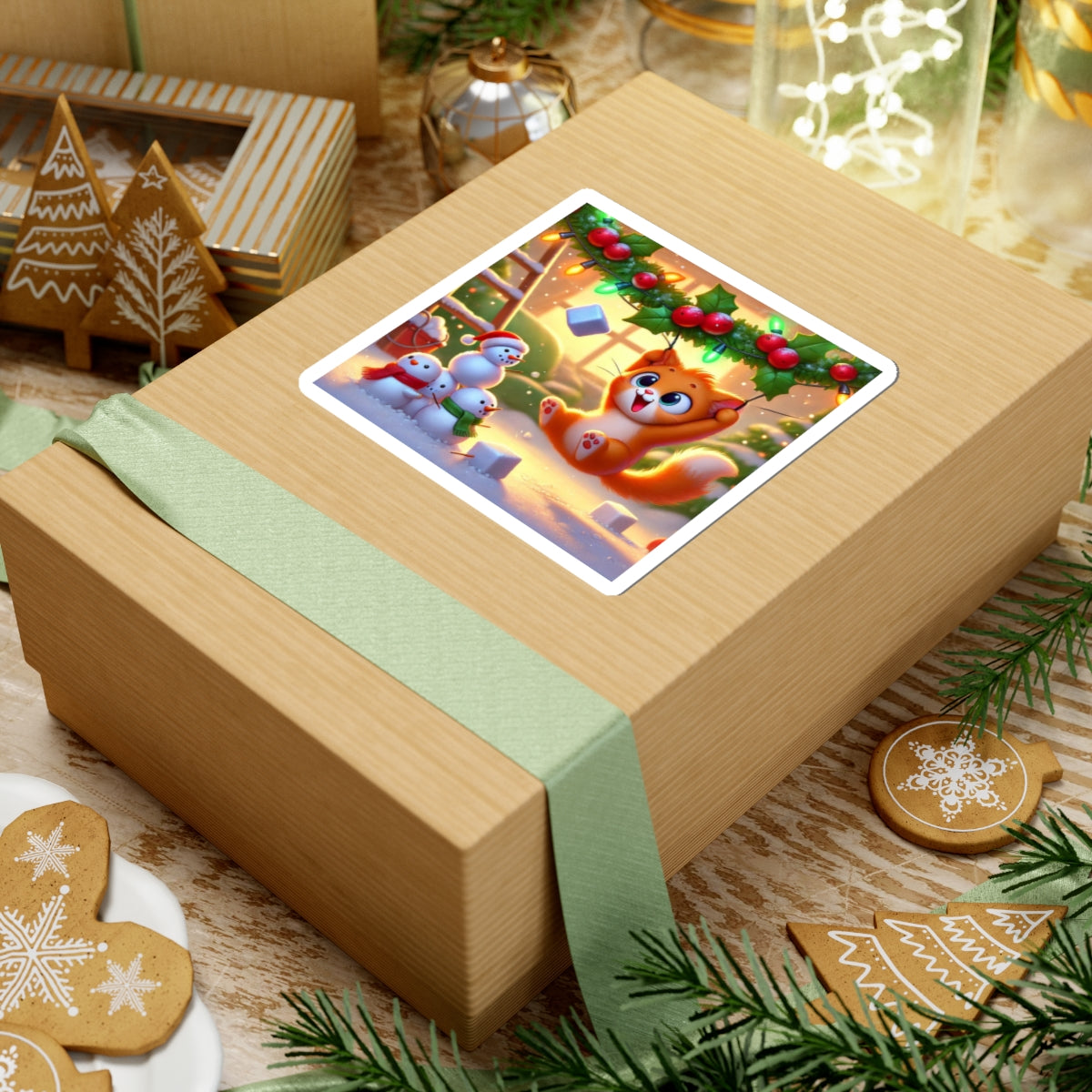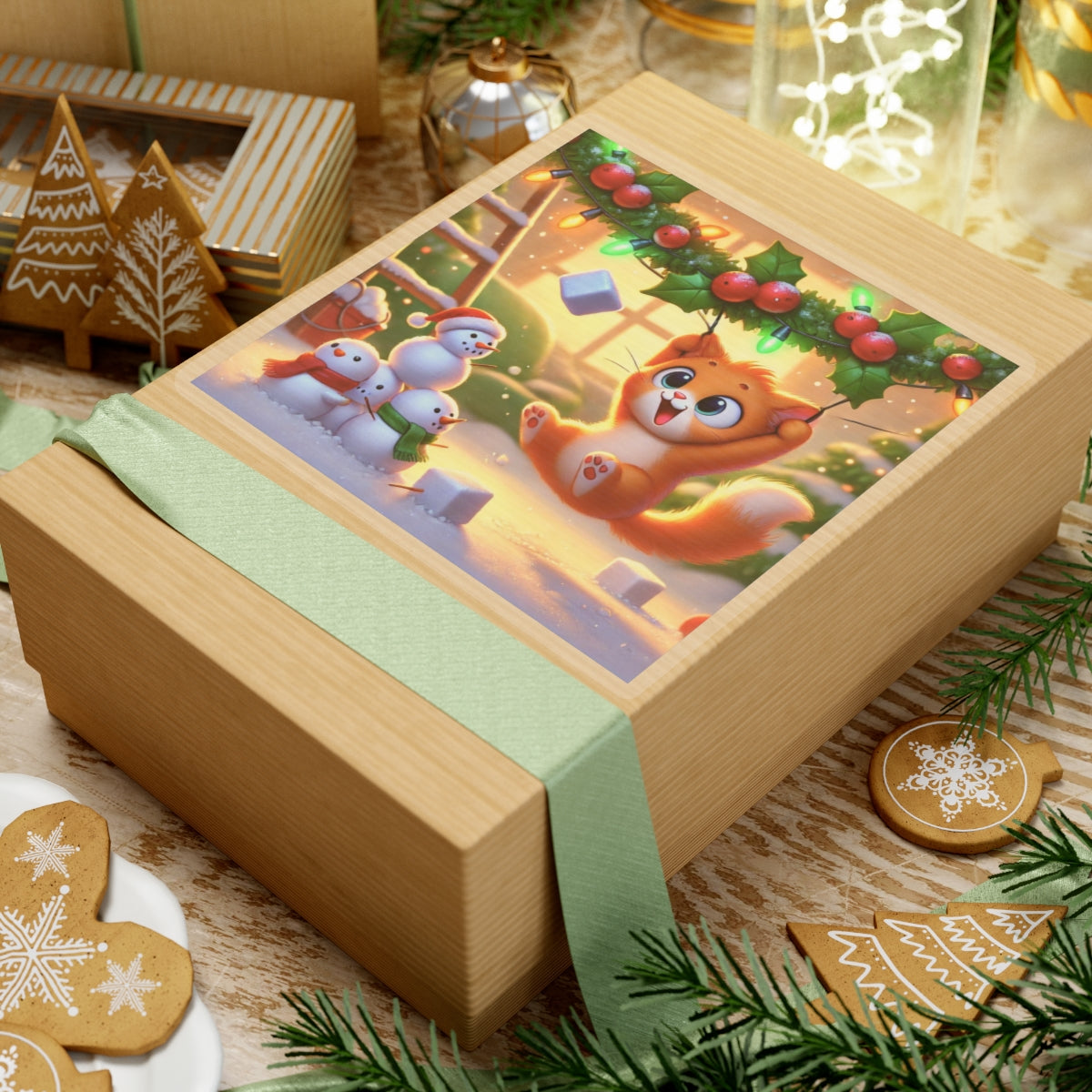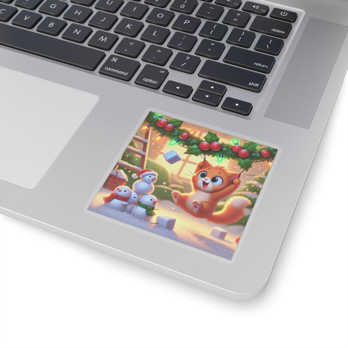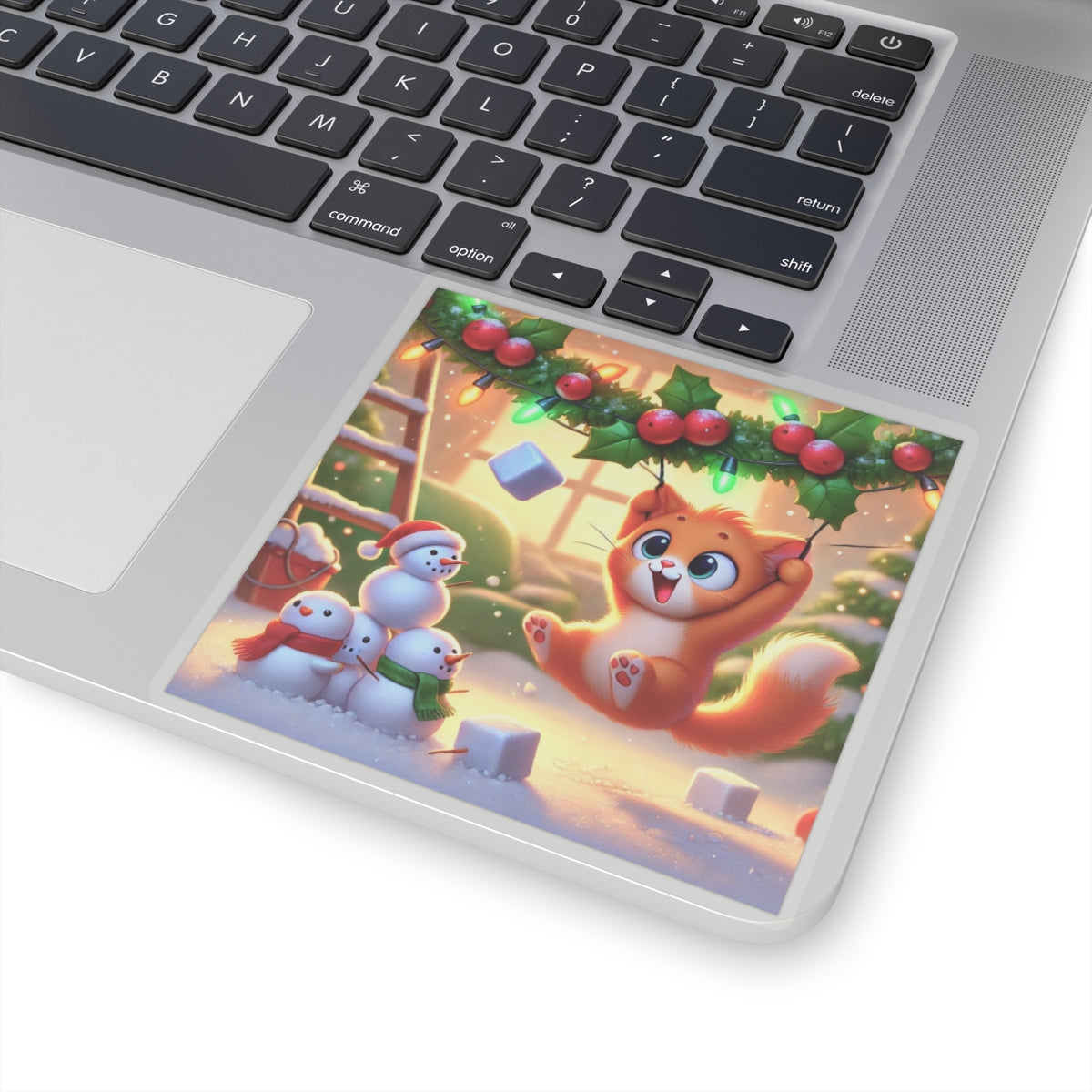 Bring a dose of holiday mischief to your favorite surfaces with this charming design. A playful orange kitten swings gleefully from strands of holly and twinkling Christmas lights as snowflakes drift around. Below, three cheerful snowmen look on in delight, creating a scene bursting with festive warmth and humor.