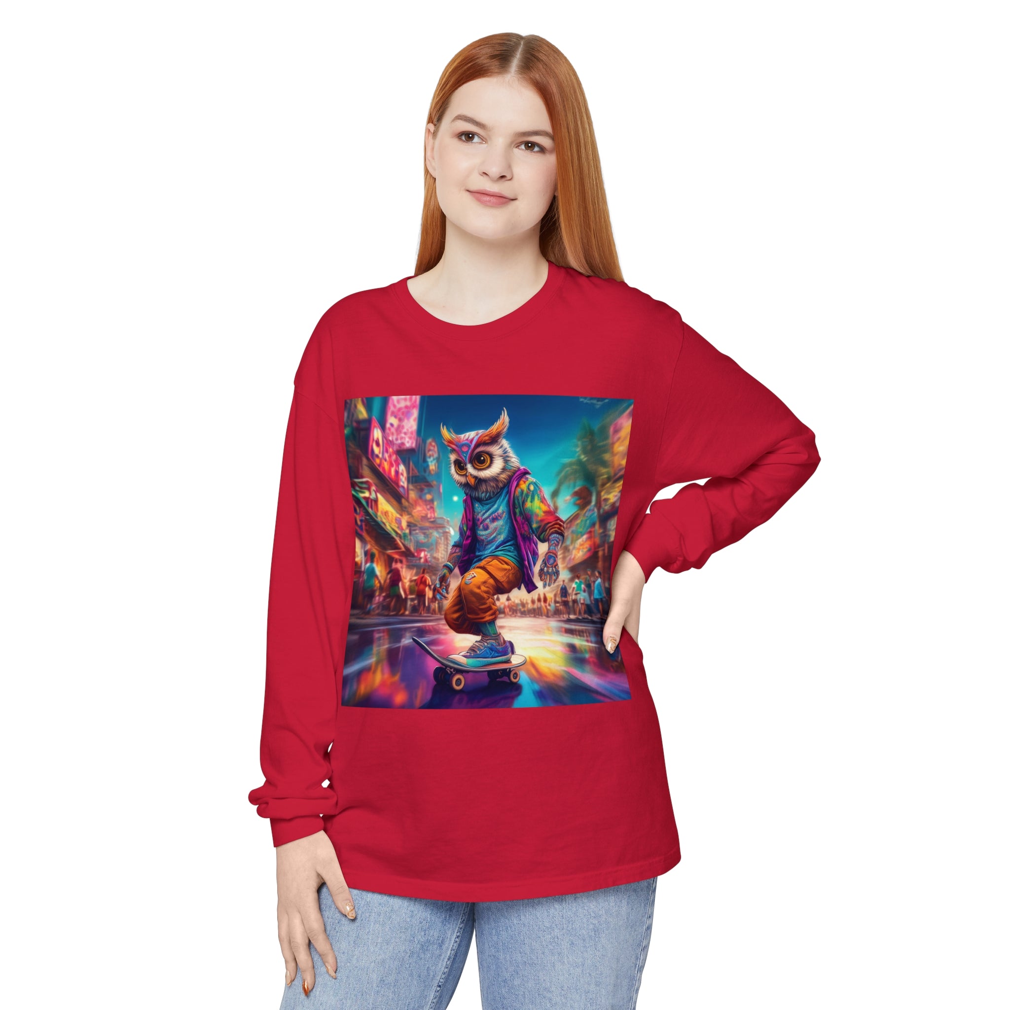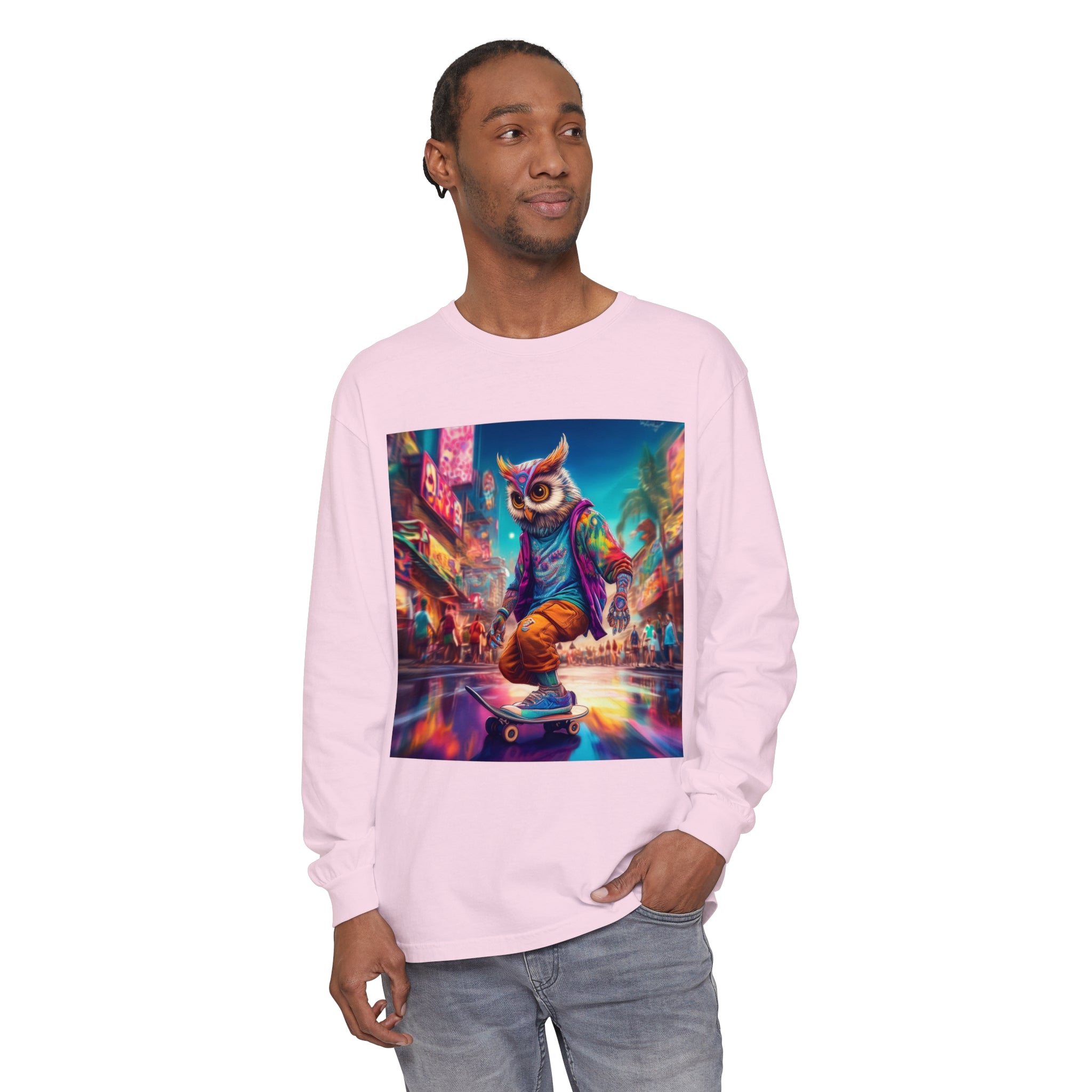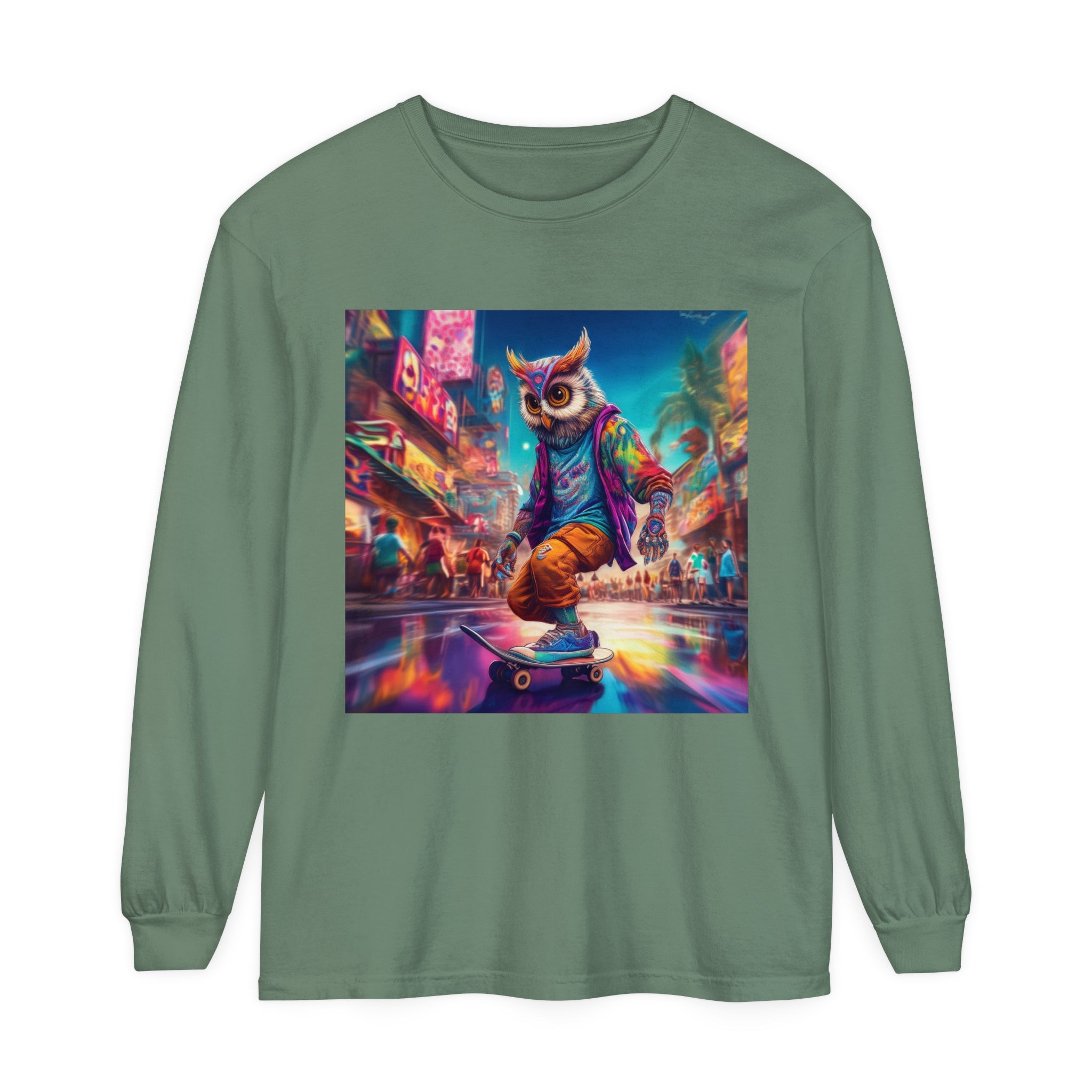 Artwork created, designed and digitally remastered by Sarasvati Designs. In "Neon Skater," a stylish owl captures the essence of futuristic coolness as it effortlessly glides across a high-tech skatepark ramp. Dressed in a vibrant neon-tie-dye t-shirt and cargo shorts, the Neon Skater exudes a carefree and hip attitude.