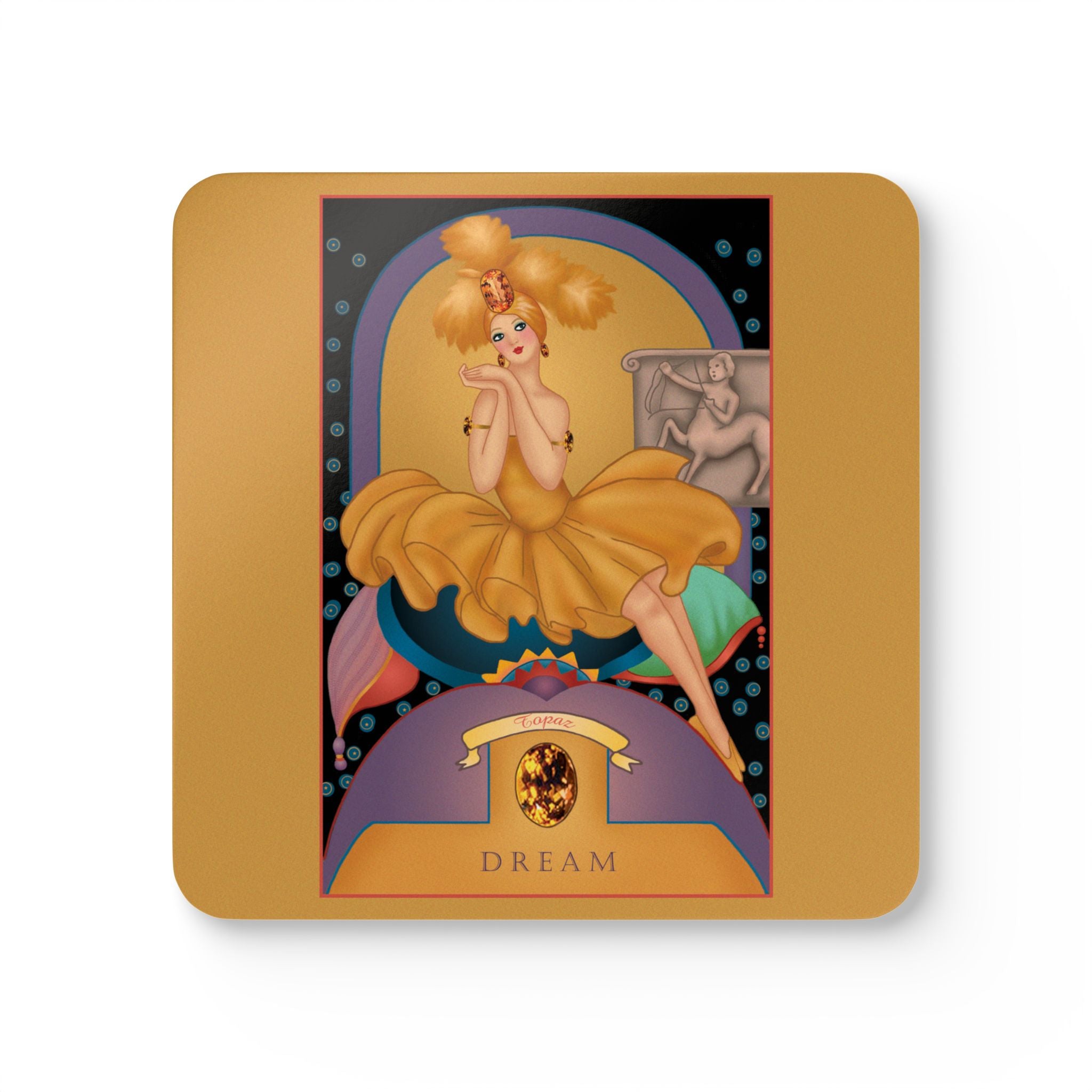 Scorpio Zodiac Design – November & Topaz by Sofia Chiostri | Corkwood Coaster Set embodies mystery, passion, and transformation through the lens of timeless Art Deco elegance. This exquisite 4-piece coaster set combines function and beauty—perfect for adding a bold artistic statement to your home, café, or office. Each coaster showcases a luminous high-gloss MDF surface that enhances the vivid colors of the artwork, paired with a cork backing that ensures slip resistance and surface protection.