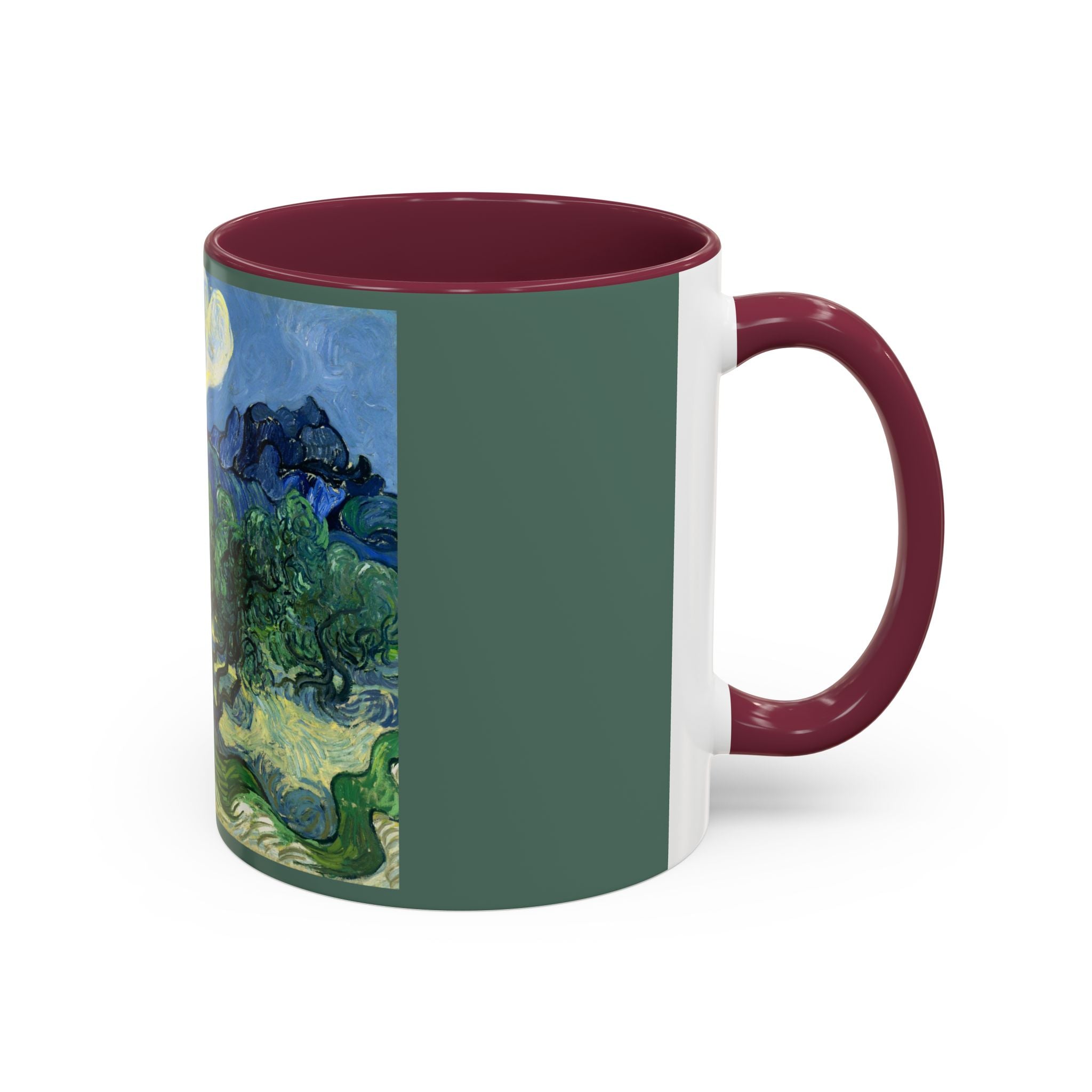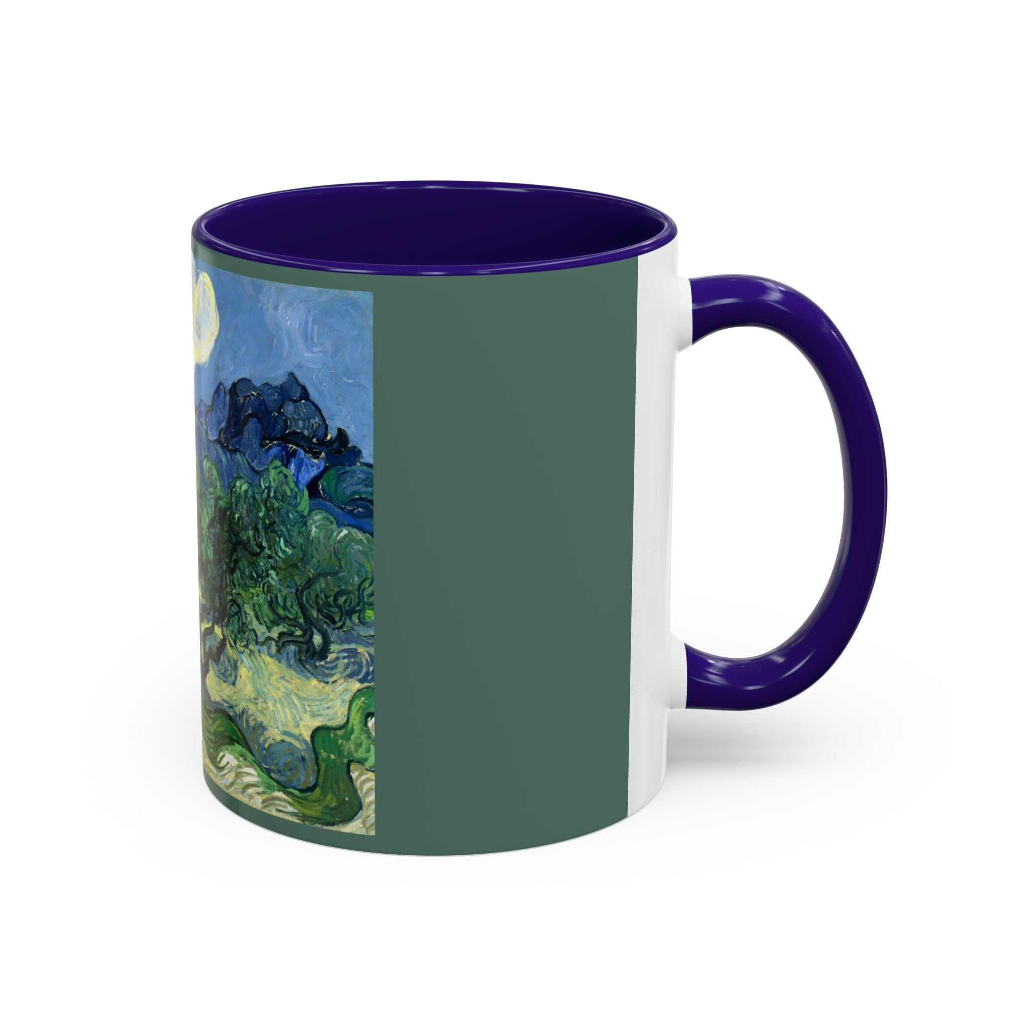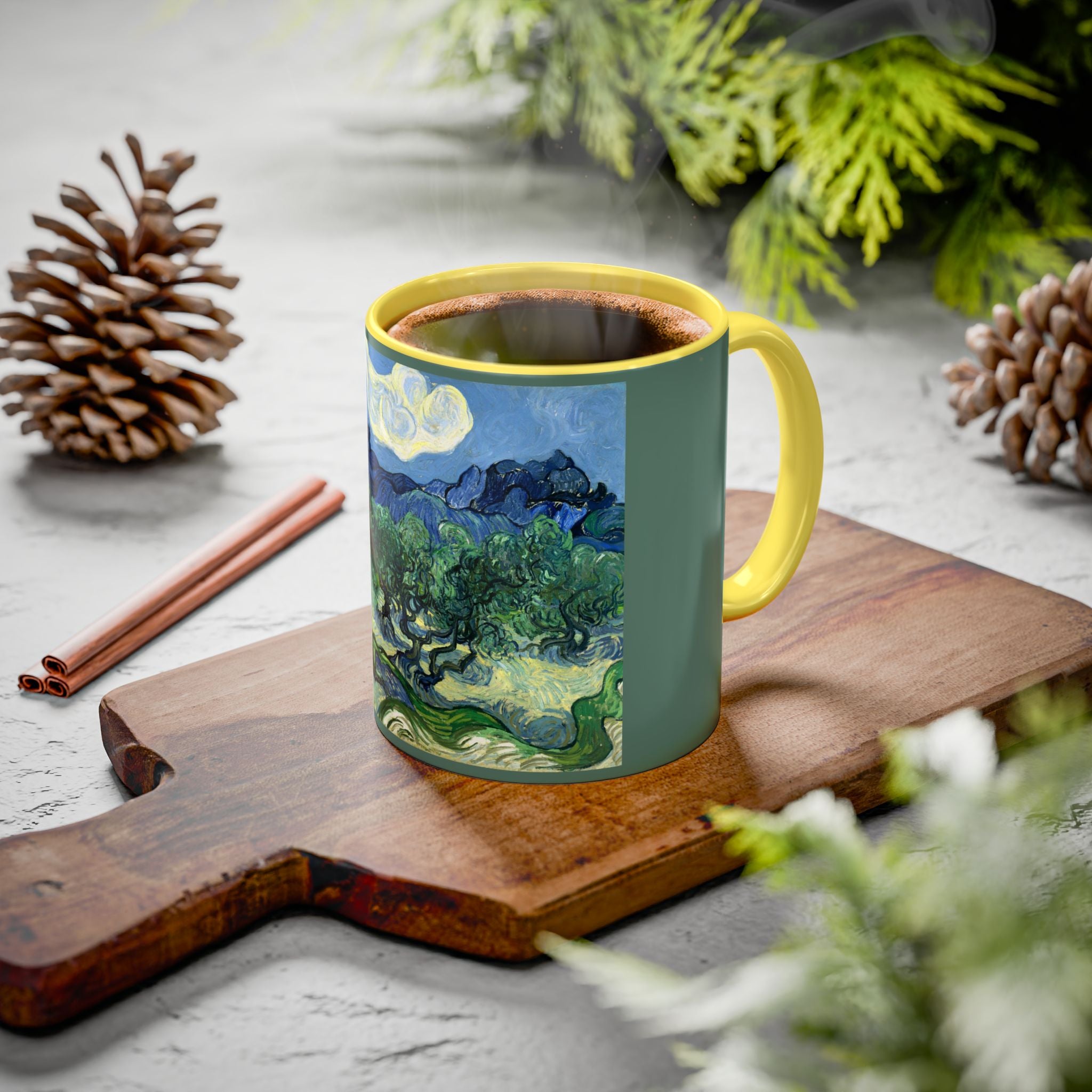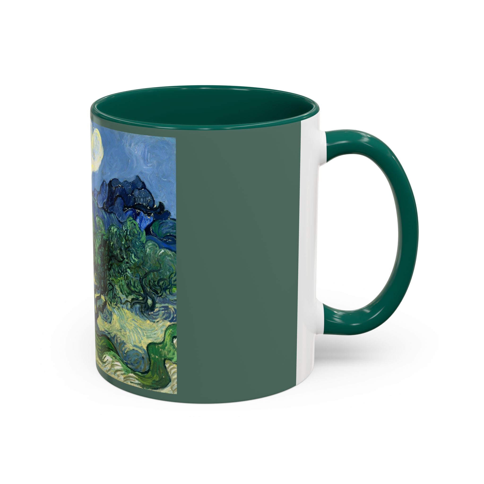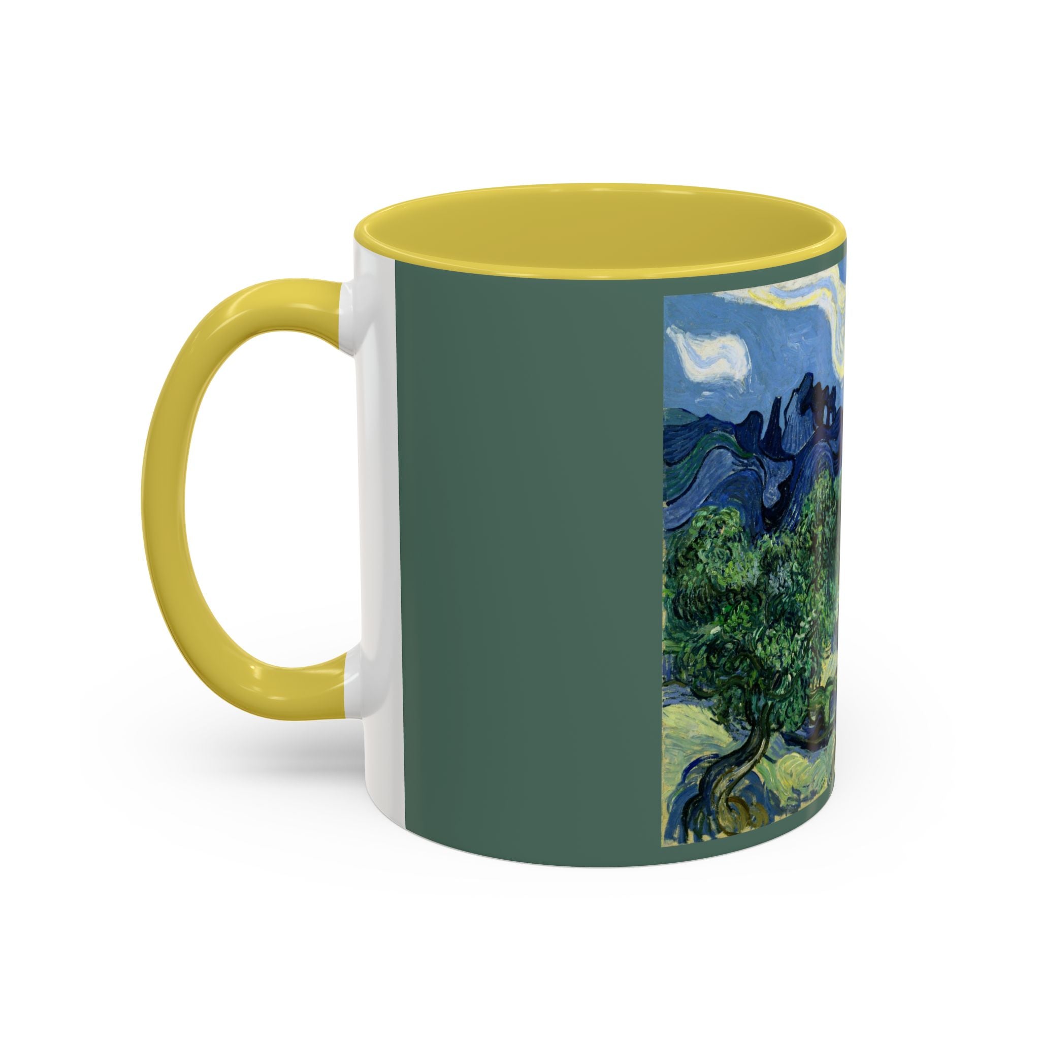 Mugs are a kitchen essential, and when infused with a personalized touch, they transform into cherished favorites. These mugs, offered in 12 vibrant color choices, can hold up to 11oz of your preferred rejuvenating beverage and feature a colored handle and interior. The glossy finish adds an elegant accent that beautifully complements the high-fidelity artwork print, making them not only a delightful addition to your kitchen but also a fantastic choice for thoughtful gifts.