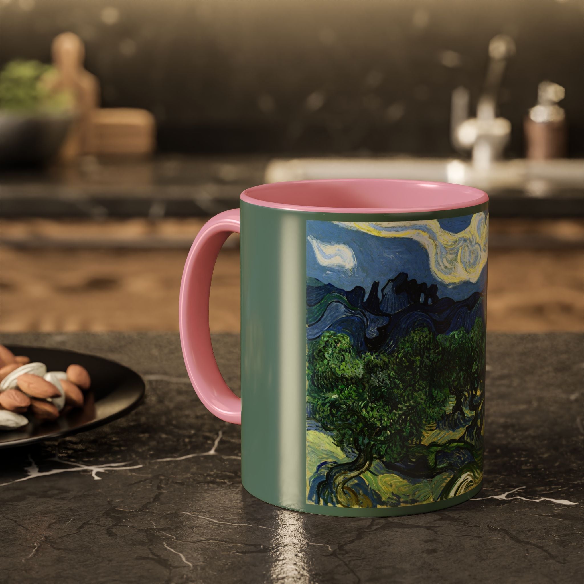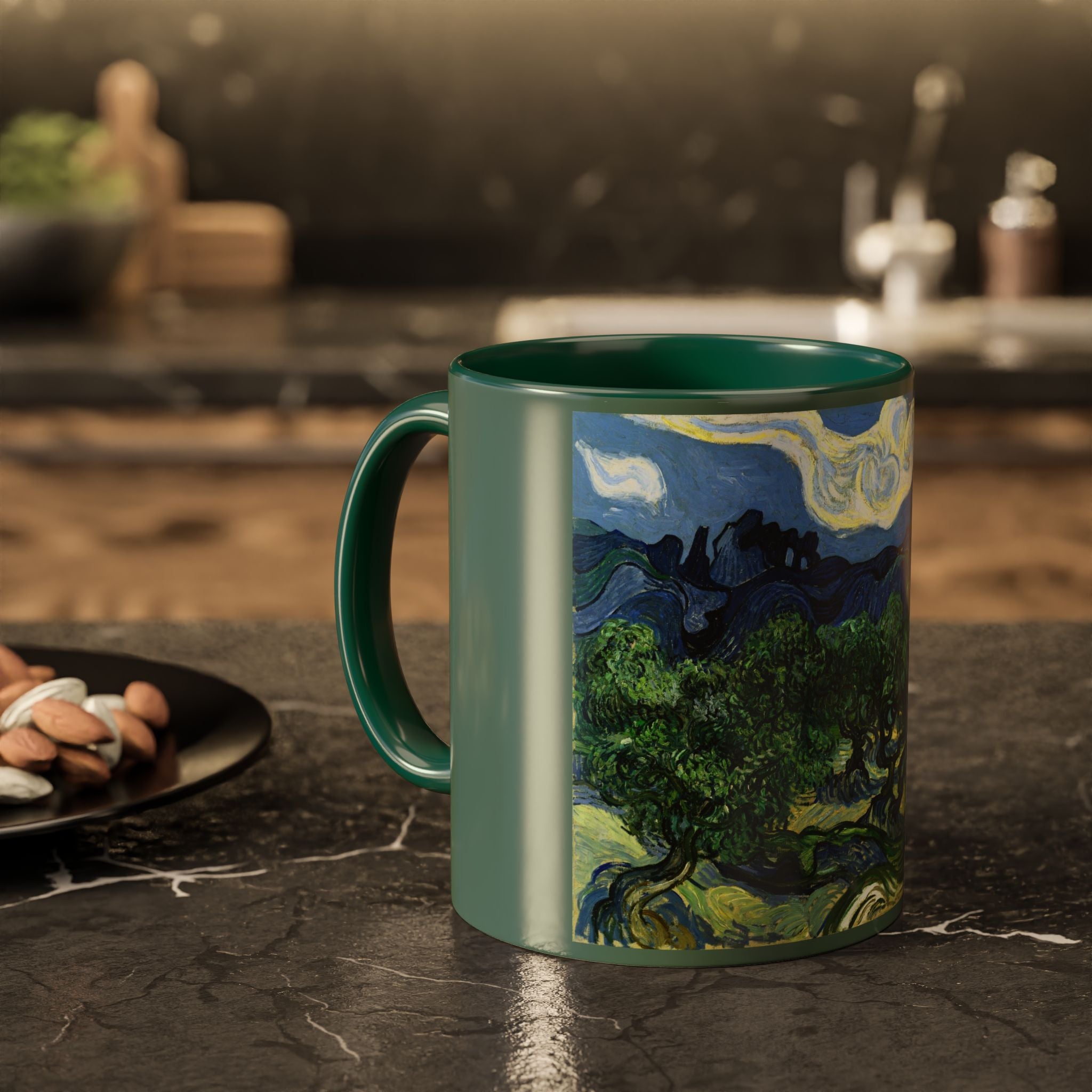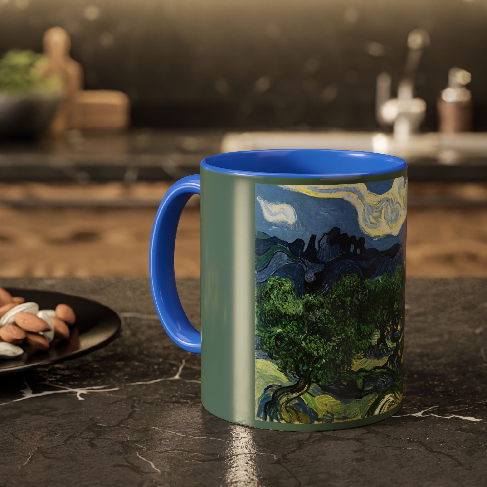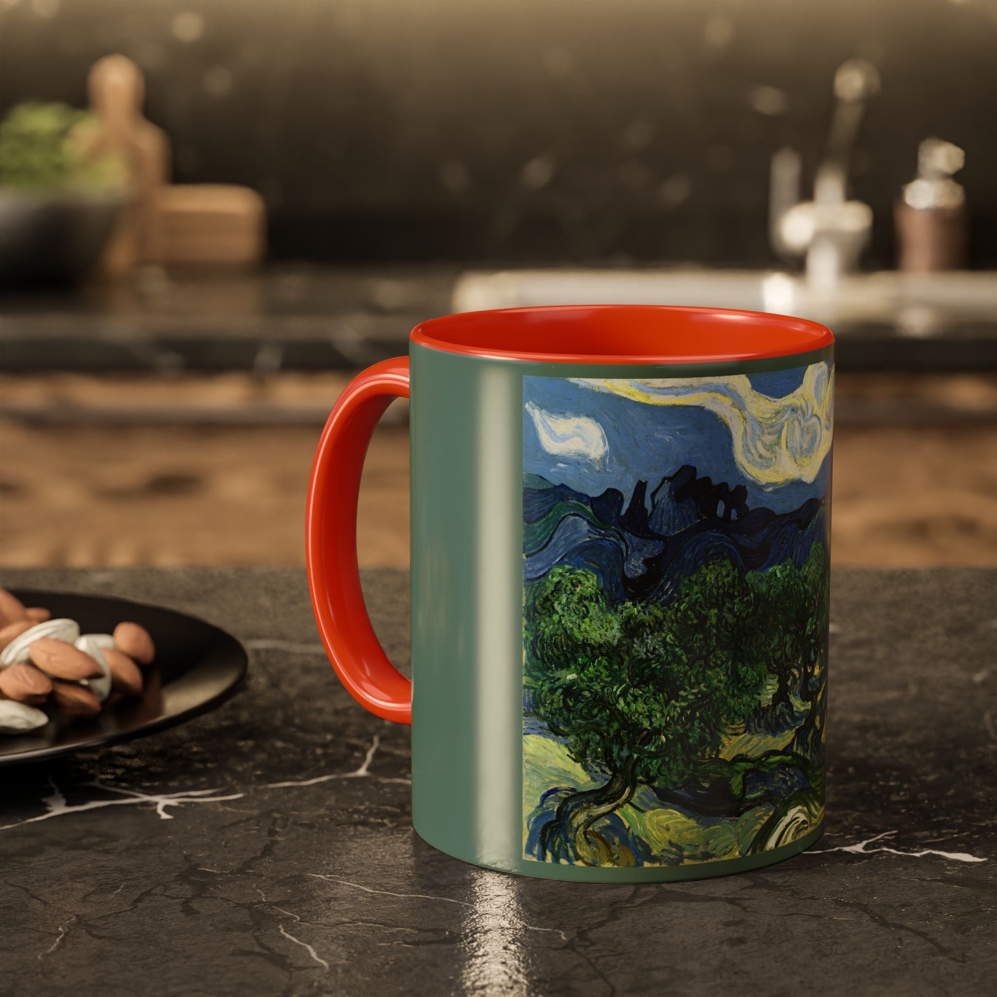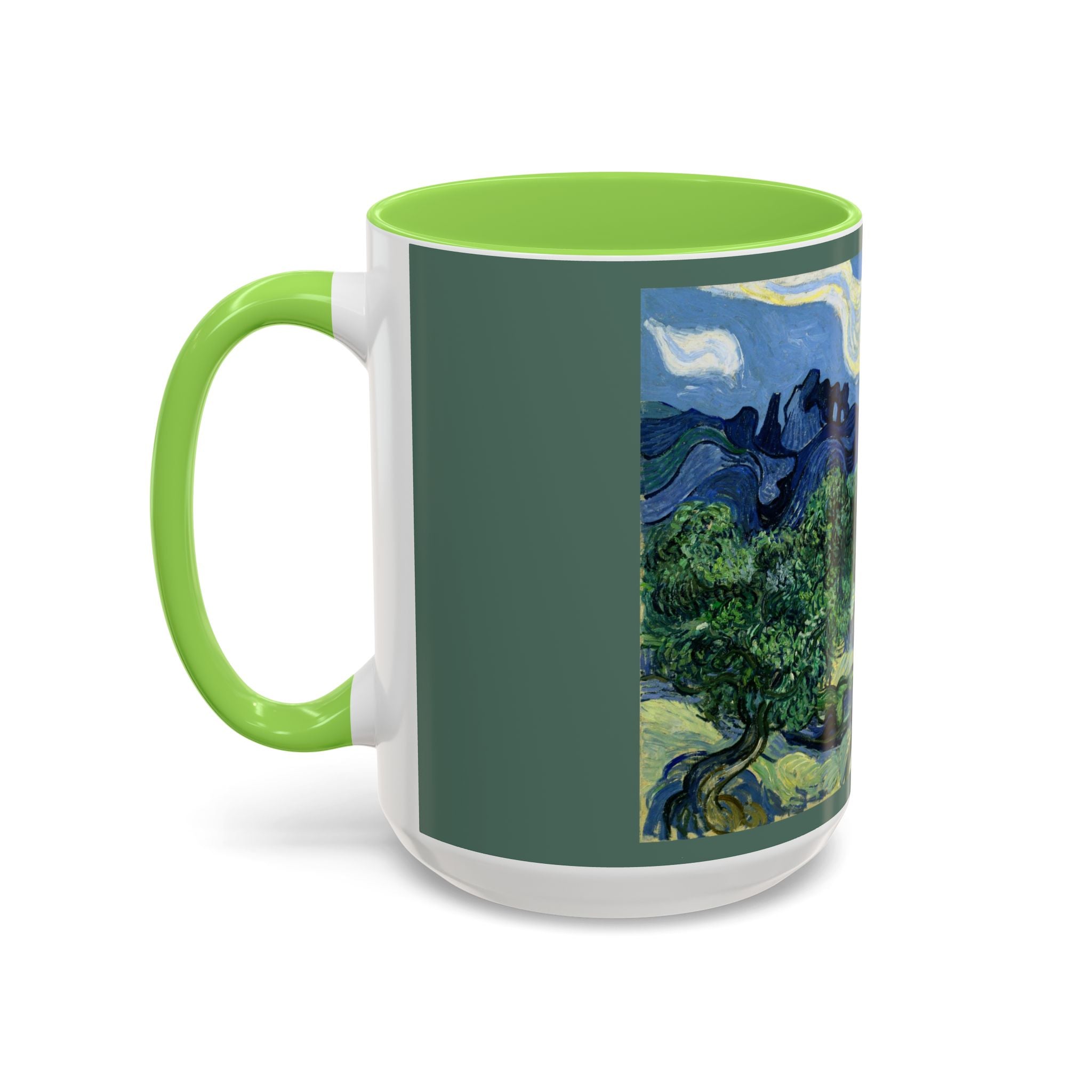 Mugs are a kitchen essential, and when infused with a personalized touch, they transform into cherished favorites. These mugs, offered in 12 vibrant color choices, can hold up to 11oz of your preferred rejuvenating beverage and feature a colored handle and interior. The glossy finish adds an elegant accent that beautifully complements the high-fidelity artwork print, making them not only a delightful addition to your kitchen but also a fantastic choice for thoughtful gifts.