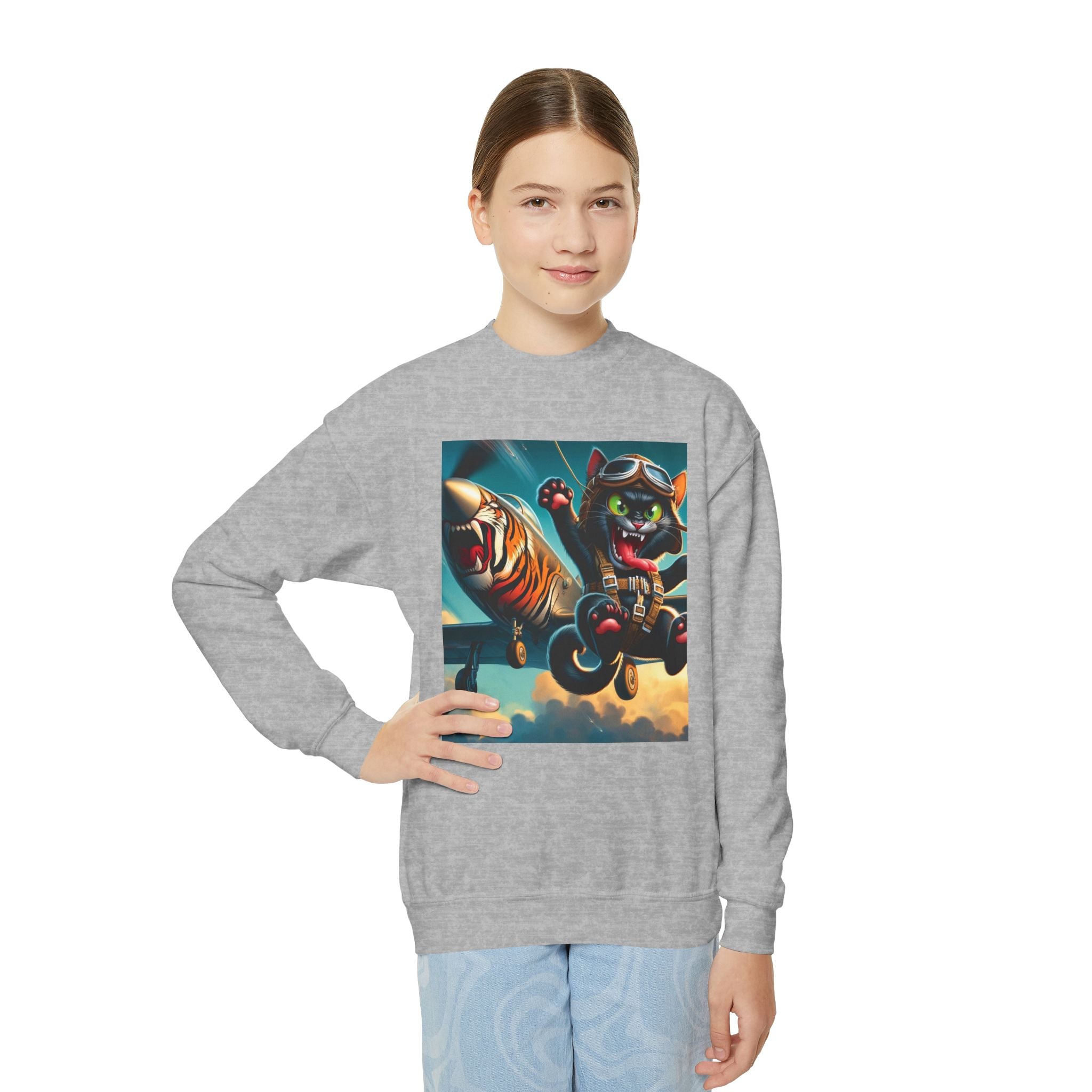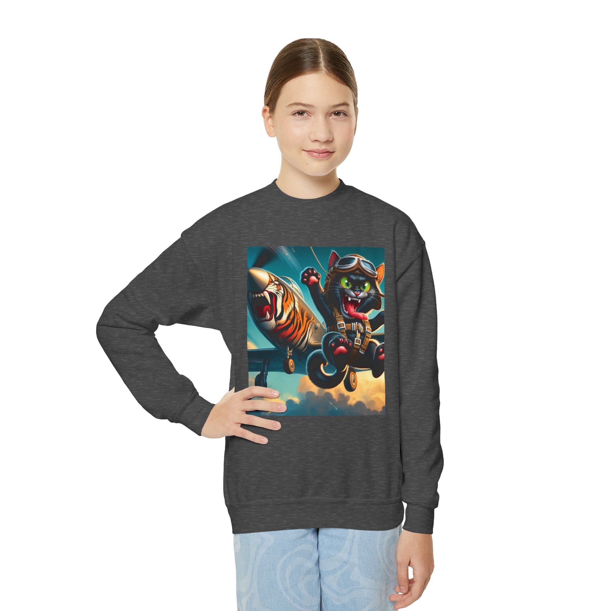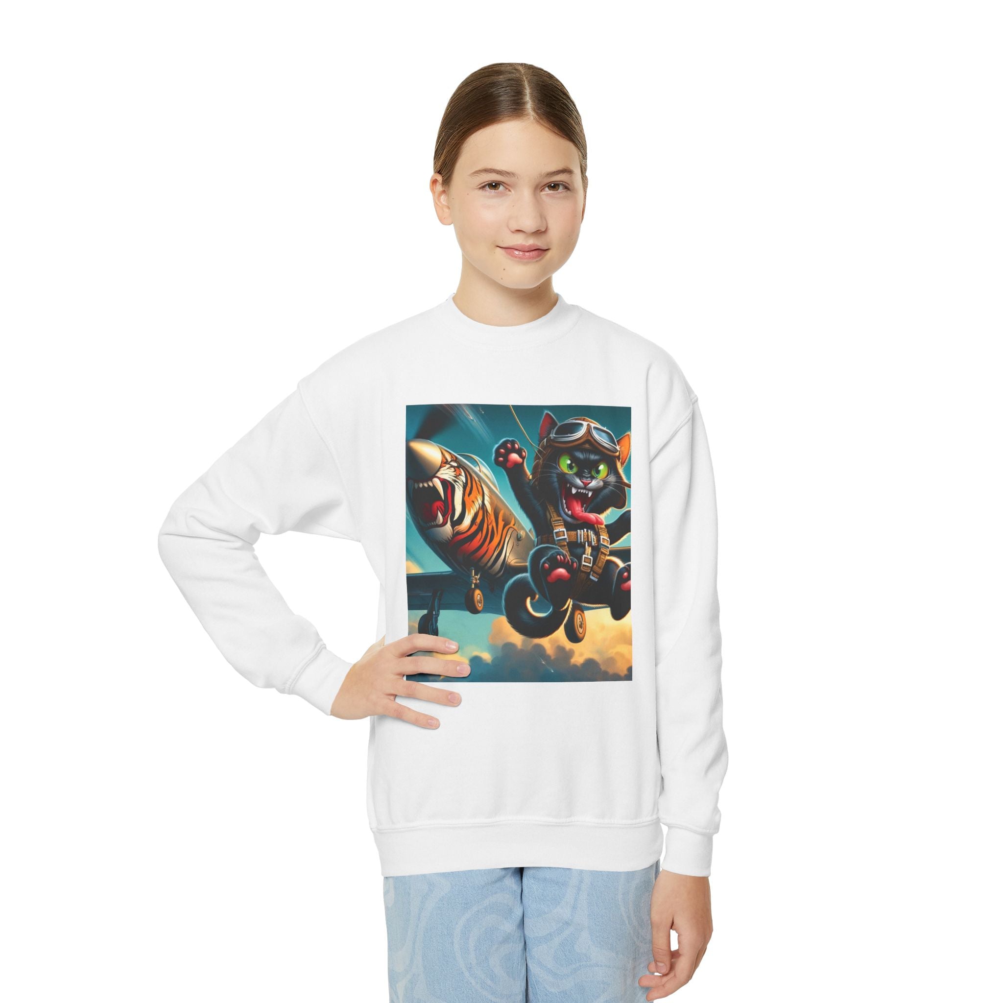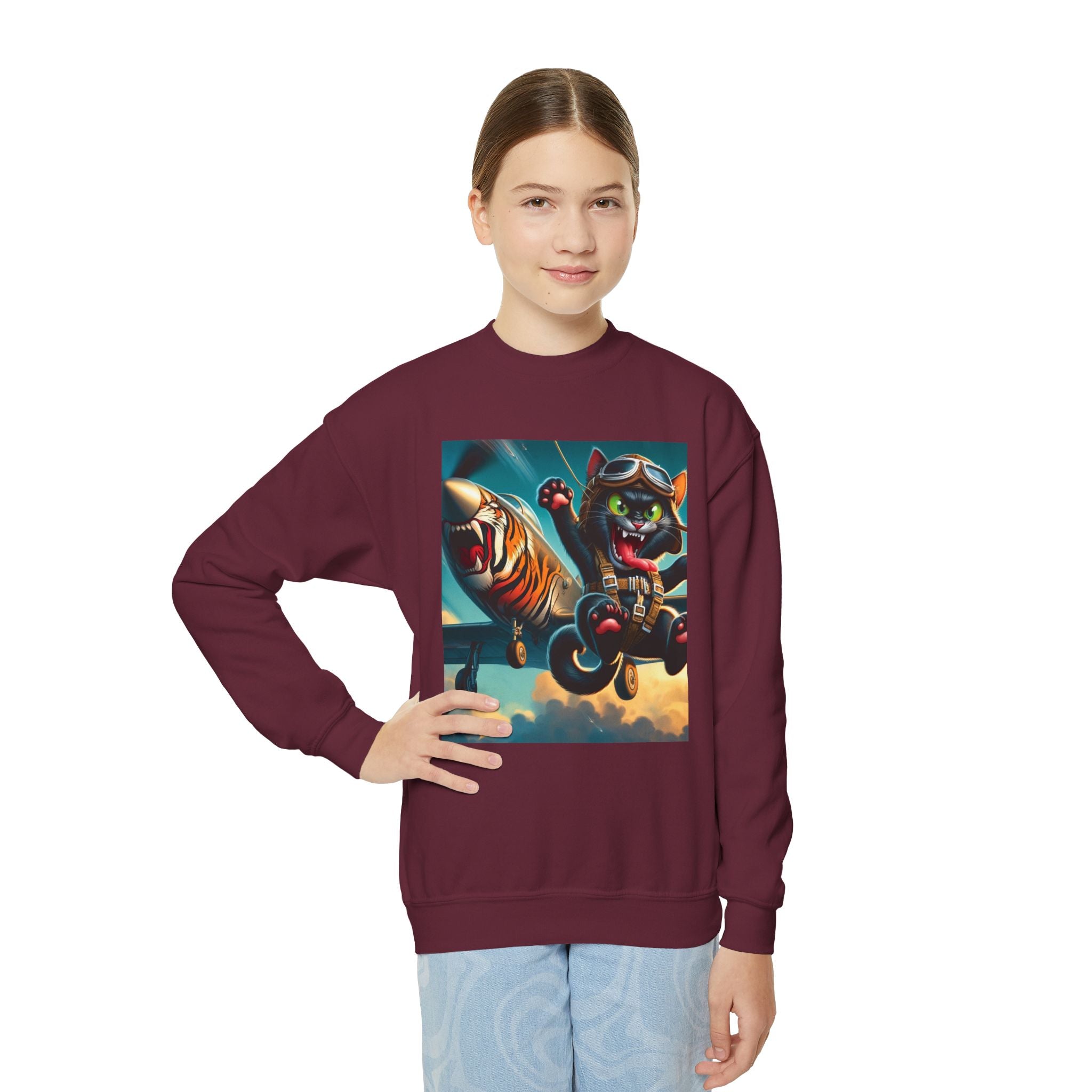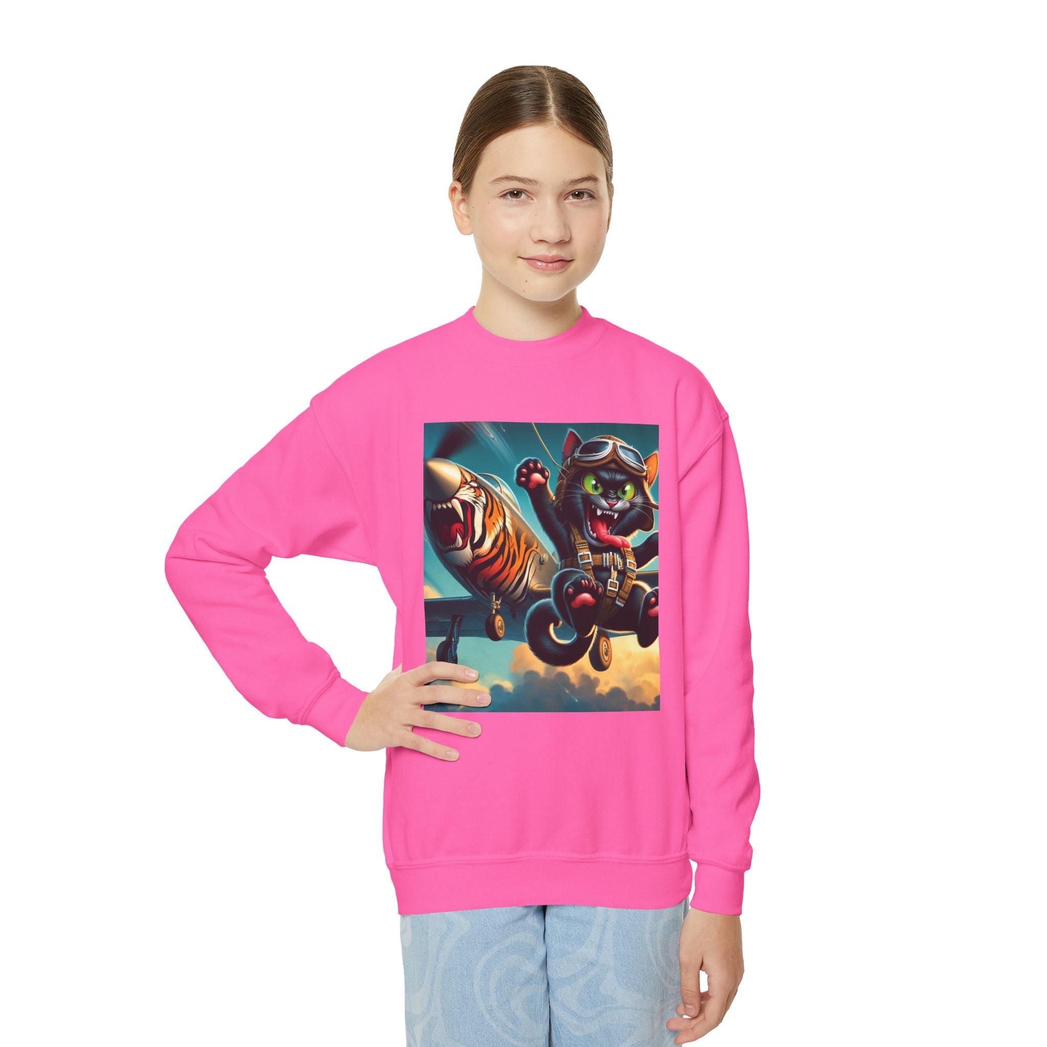 Parachuting Cat Commando Youth Crewneck Sweatshirt combines cozy comfort with sky-high adventure. Made from a balanced blend of 50% cotton and 50% polyester, this Gildan 18000B sweatshirt is perfect for school, playtime, or lounging in fearless style. The medium-heavy fabric keeps it warm and durable, while the loose fit offers easy movement for every mission. Please note: due to the fabric properties, the White color variant may appear slightly off-white.