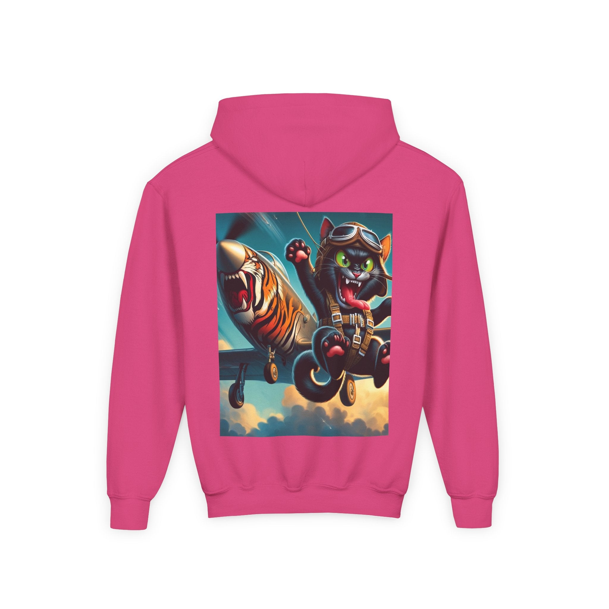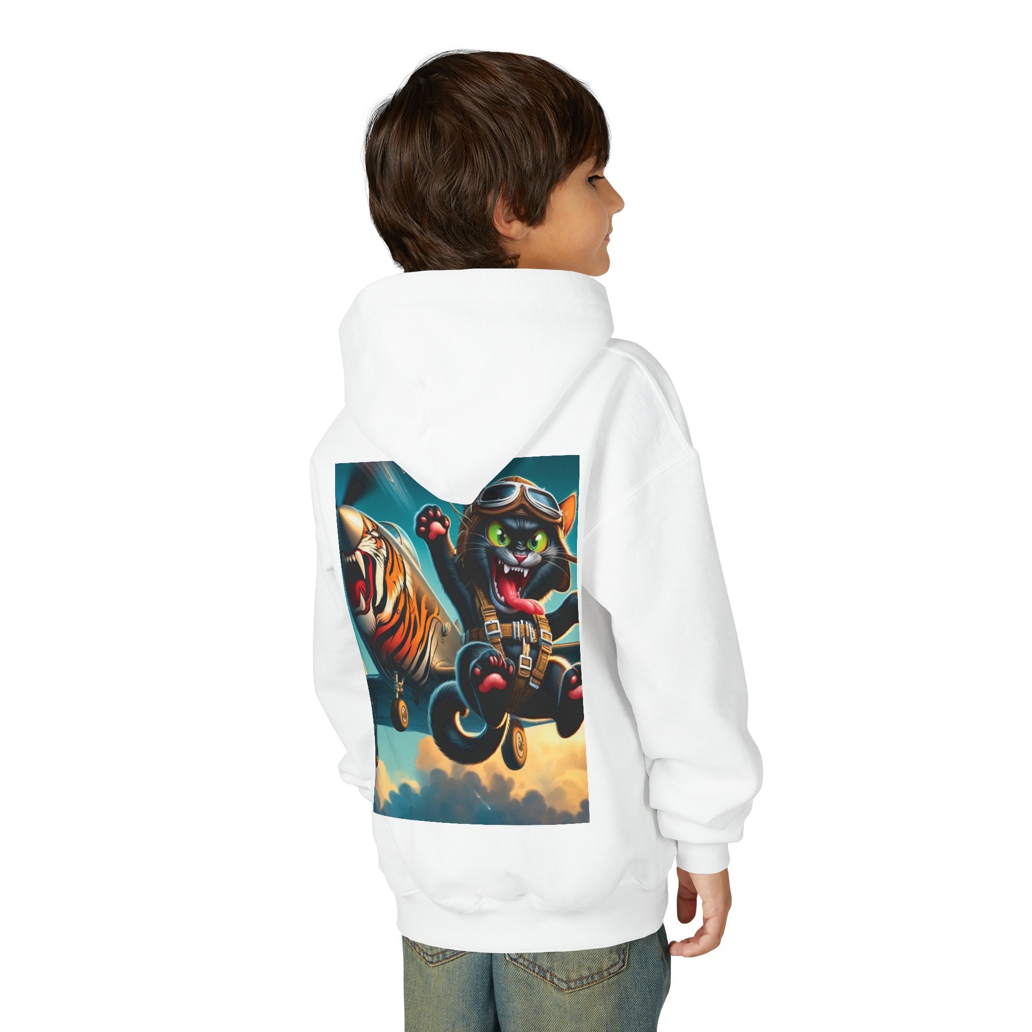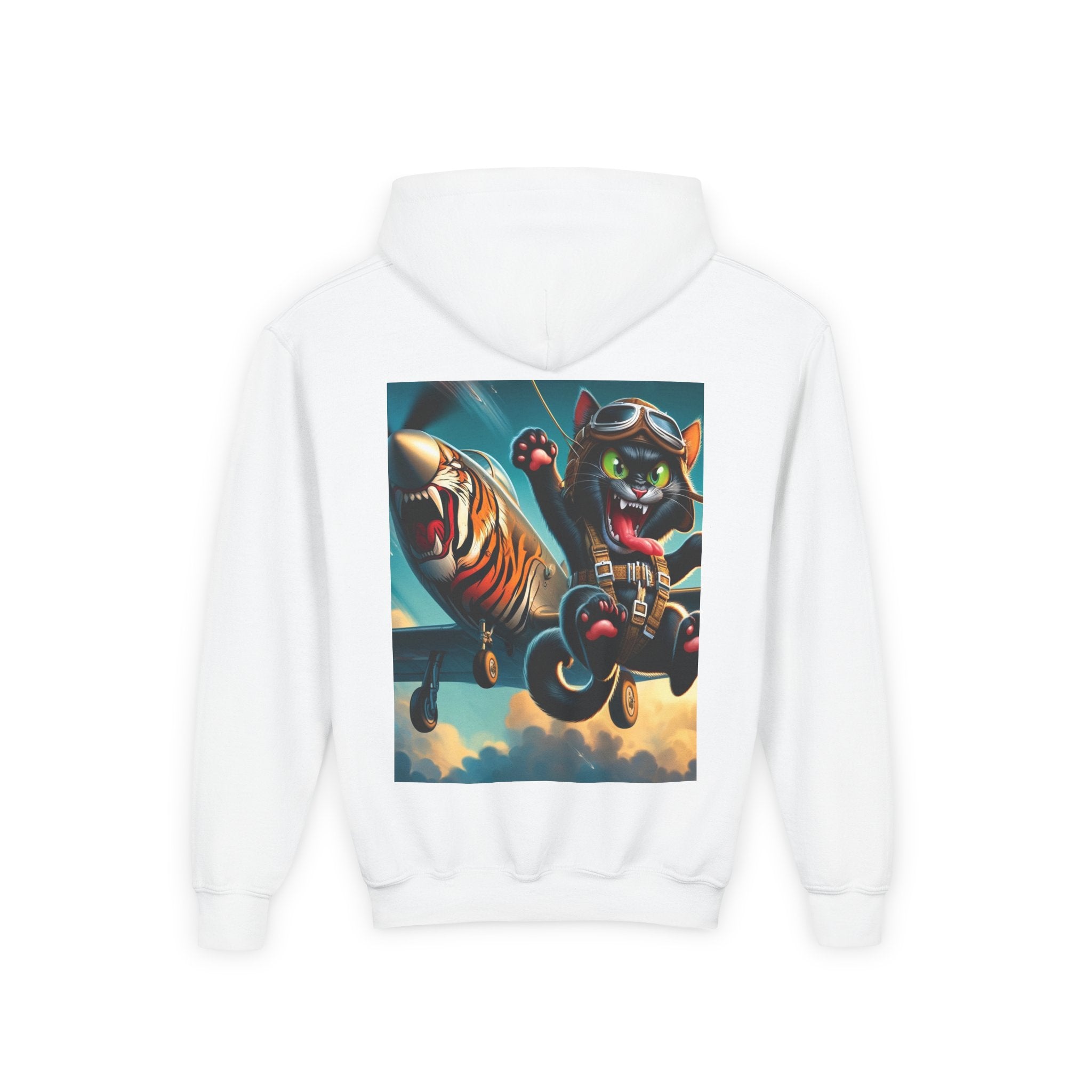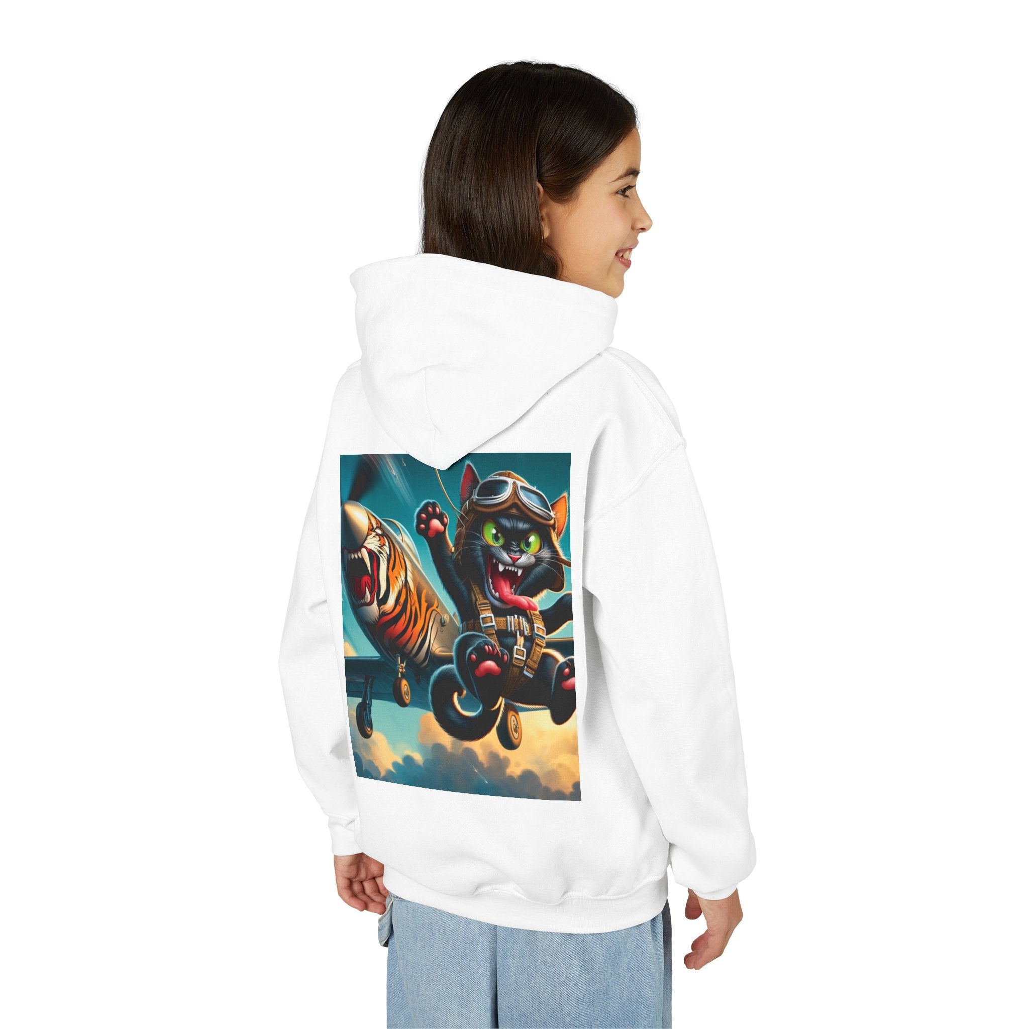 Parachuting Cat Commando Youth Heavy Blend Hooded Sweatshirt delivers cozy comfort and bold imagination. Crafted from ultra-soft, preshrunk fleece, this hoodie feels gentle on the skin while minimizing lint buildup for long-lasting wear. The 50/50 cotton-polyester blend offers the perfect balance of warmth and softness, while the classic kangaroo pocket and twill-reinforced neck add durability and ease. Please note: due to the fabric properties, the White color variant may appear slightly off-white.