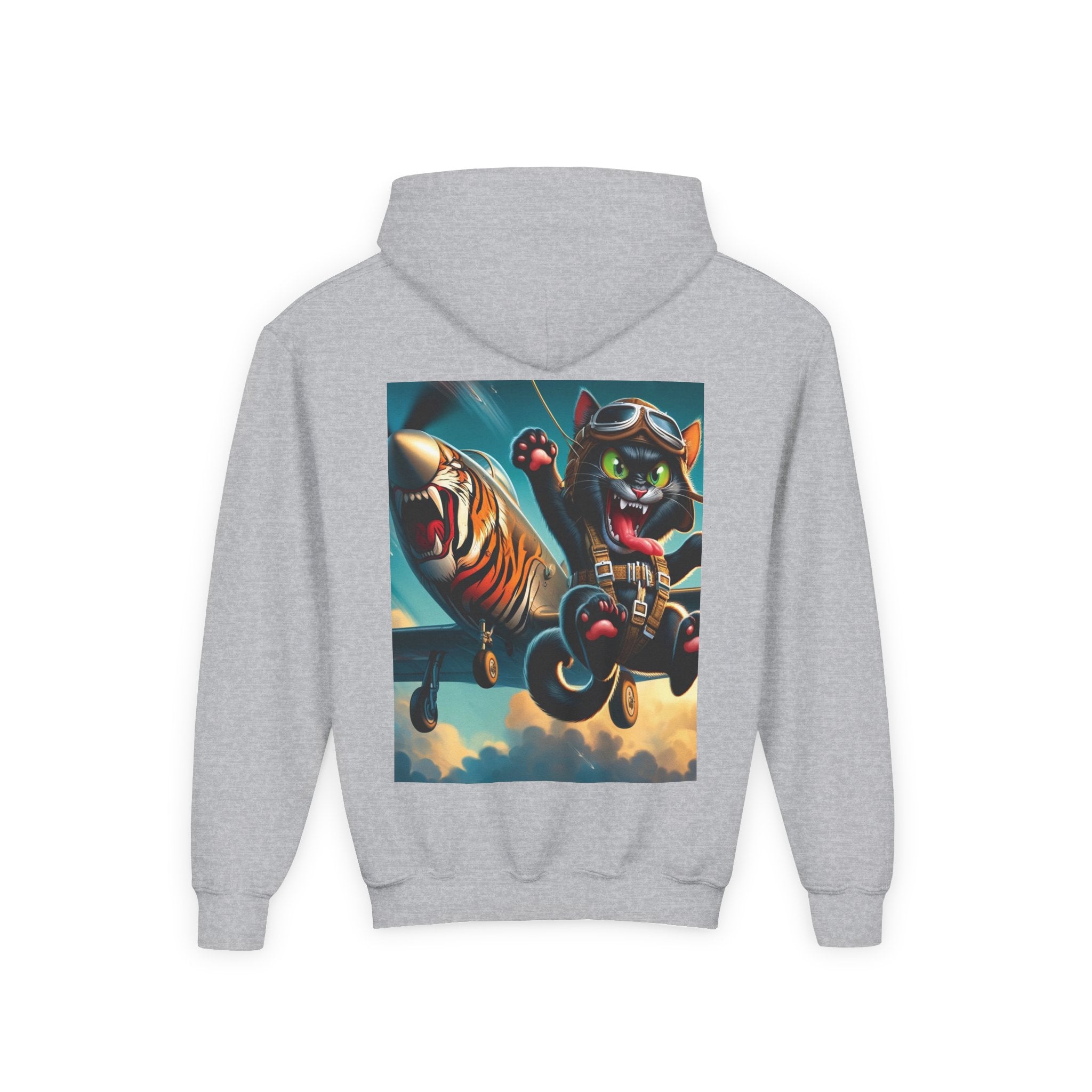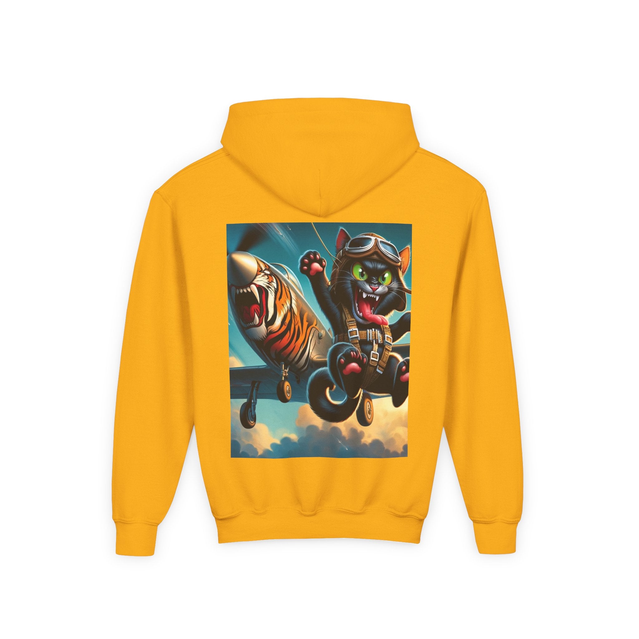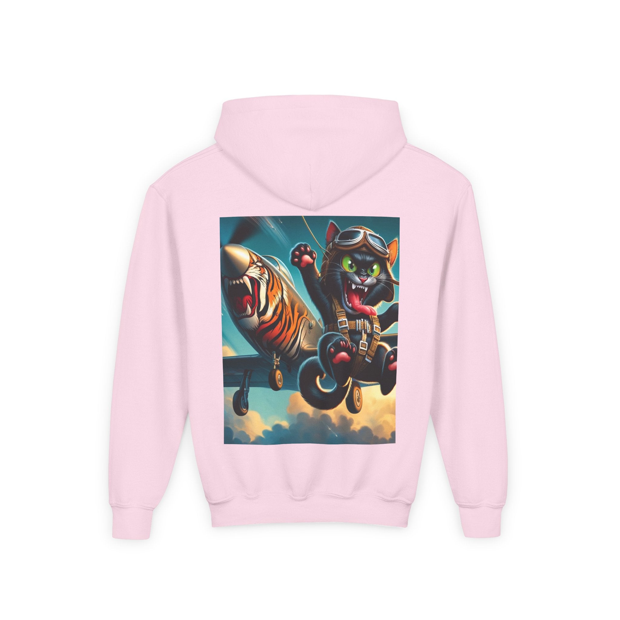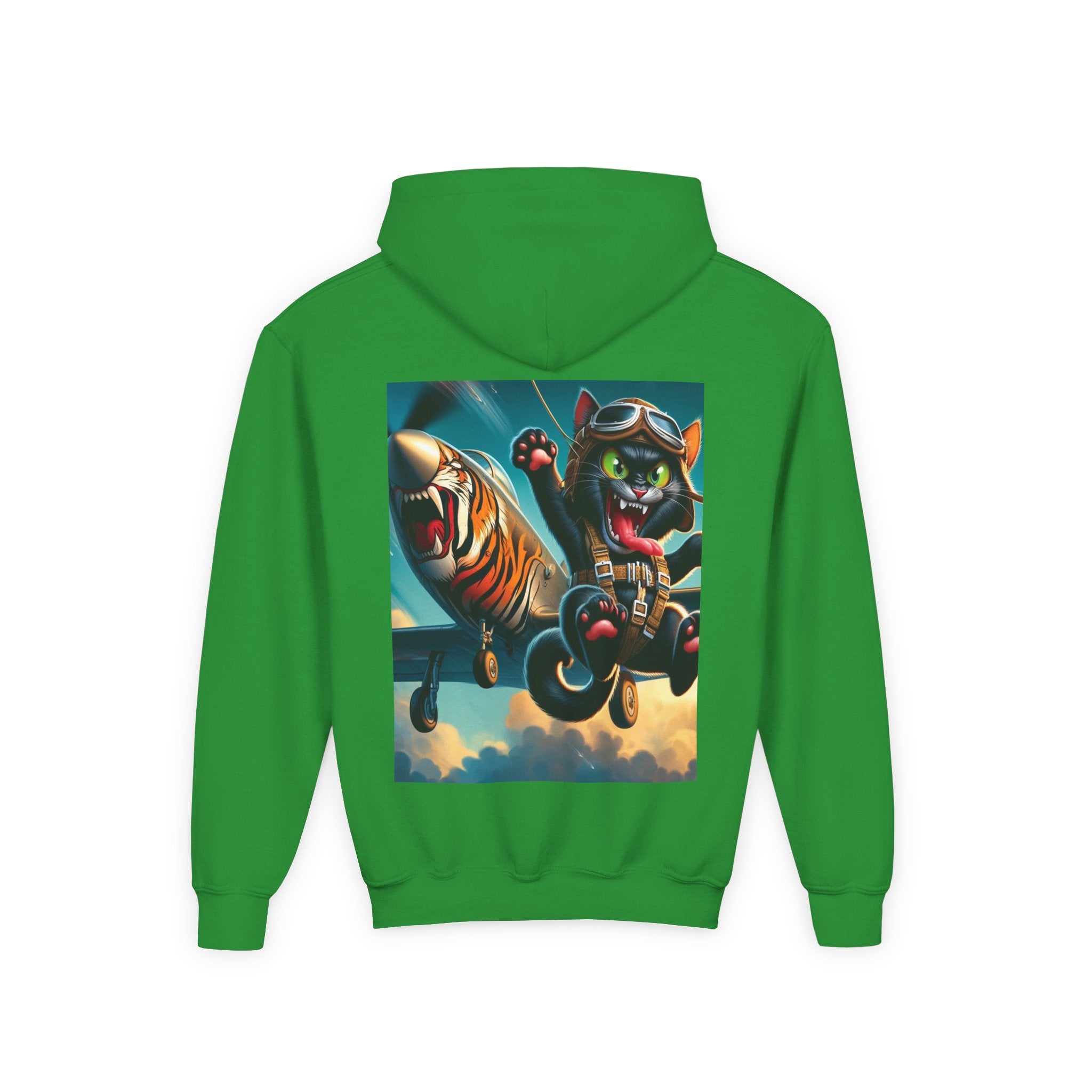 Parachuting Cat Commando Youth Heavy Blend Hooded Sweatshirt delivers cozy comfort and bold imagination. Crafted from ultra-soft, preshrunk fleece, this hoodie feels gentle on the skin while minimizing lint buildup for long-lasting wear. The 50/50 cotton-polyester blend offers the perfect balance of warmth and softness, while the classic kangaroo pocket and twill-reinforced neck add durability and ease. Please note: due to the fabric properties, the White color variant may appear slightly off-white.