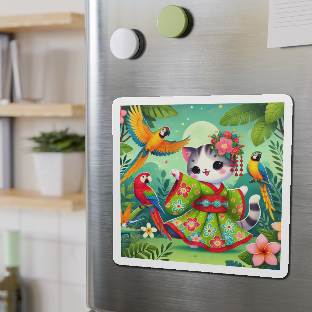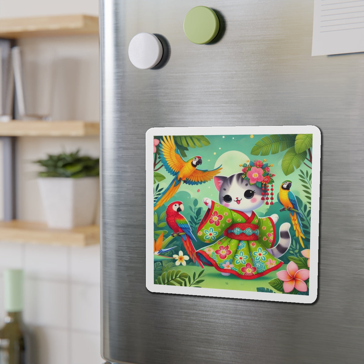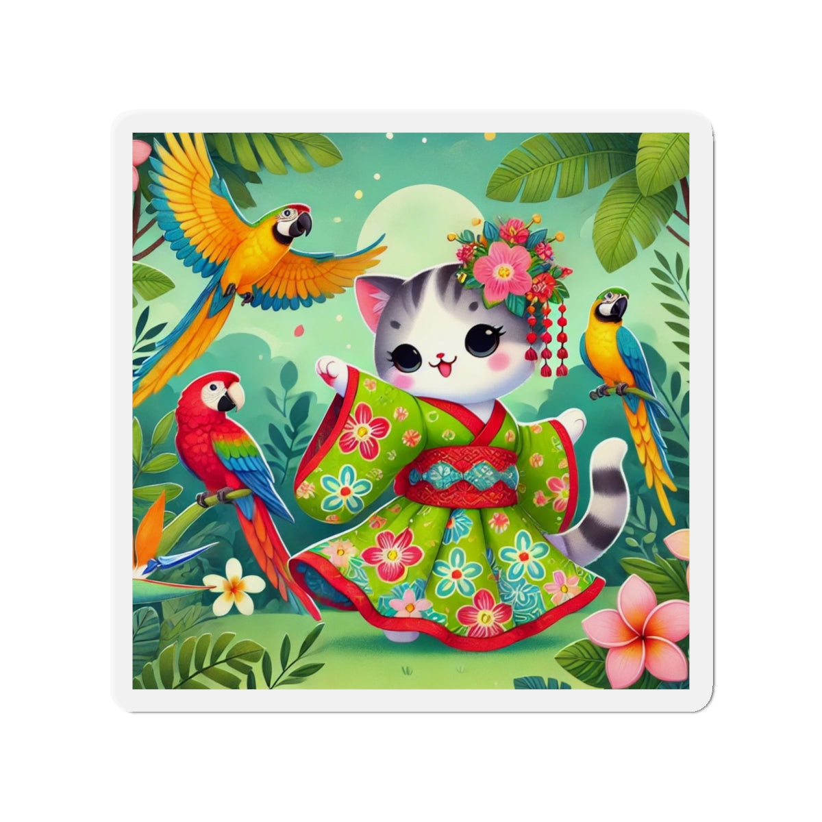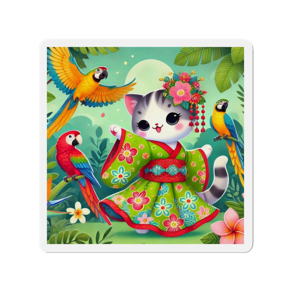 This design features a super cute and whimsical illustration of a vibrant geisha kitten twirling gracefully in a bright kimono adorned with colorful parrot patterns. Playful parrots flutter around in a lush tropical environment, adding to the lively and enchanting atmosphere. Bold outlines and vivid colors enhance the charm and energy of this delightful scene.