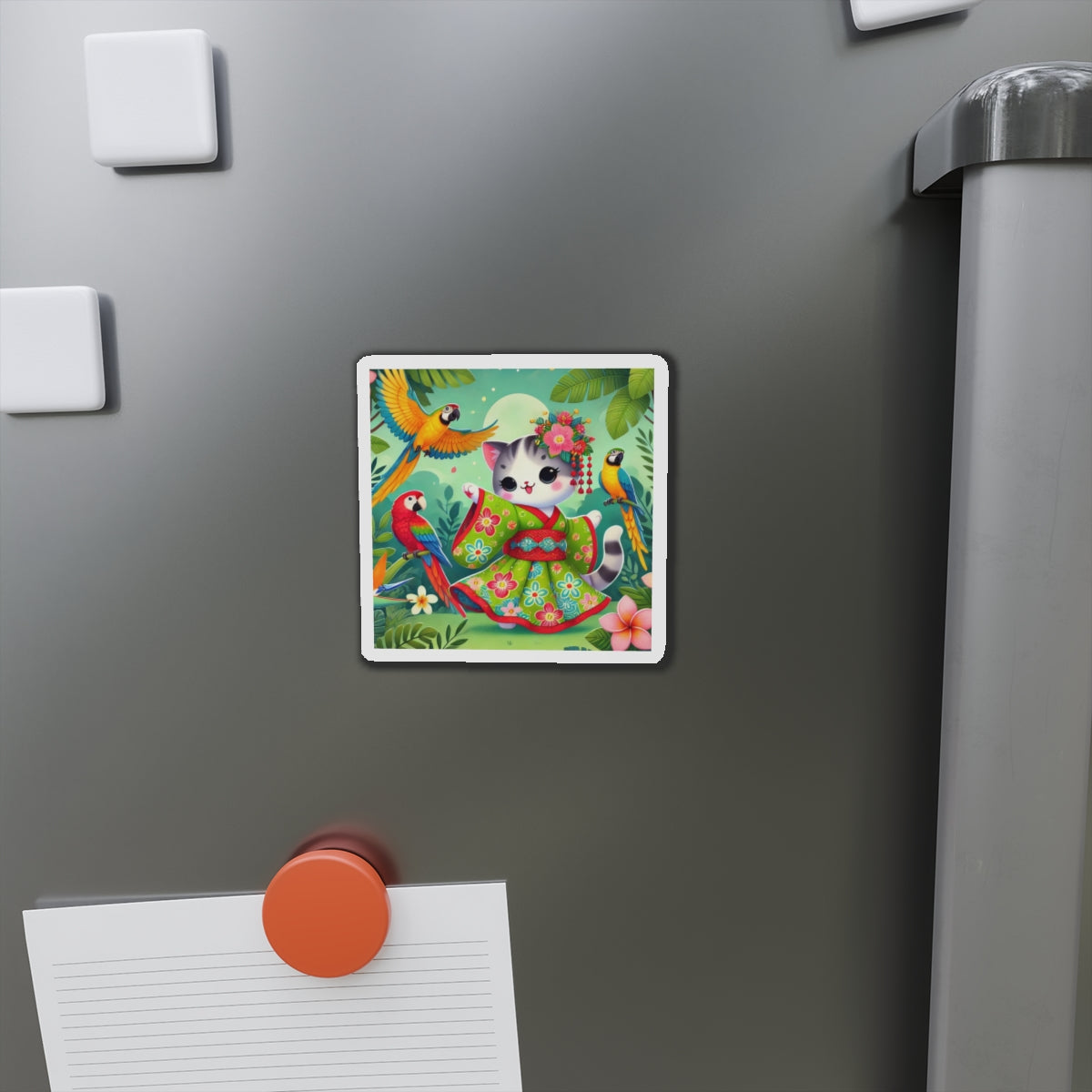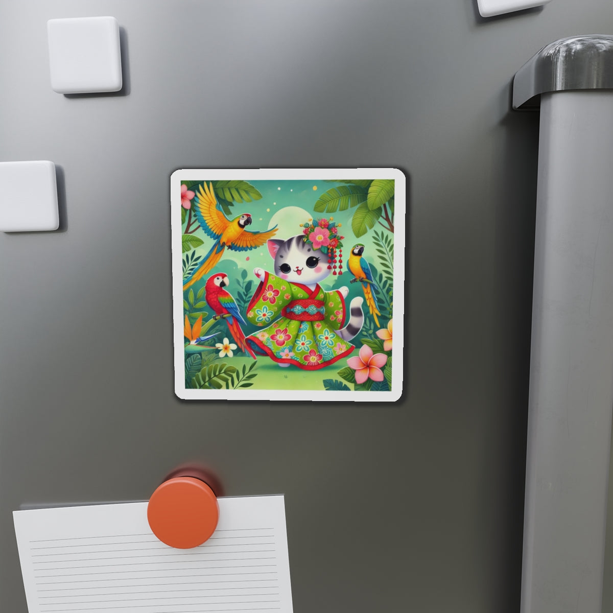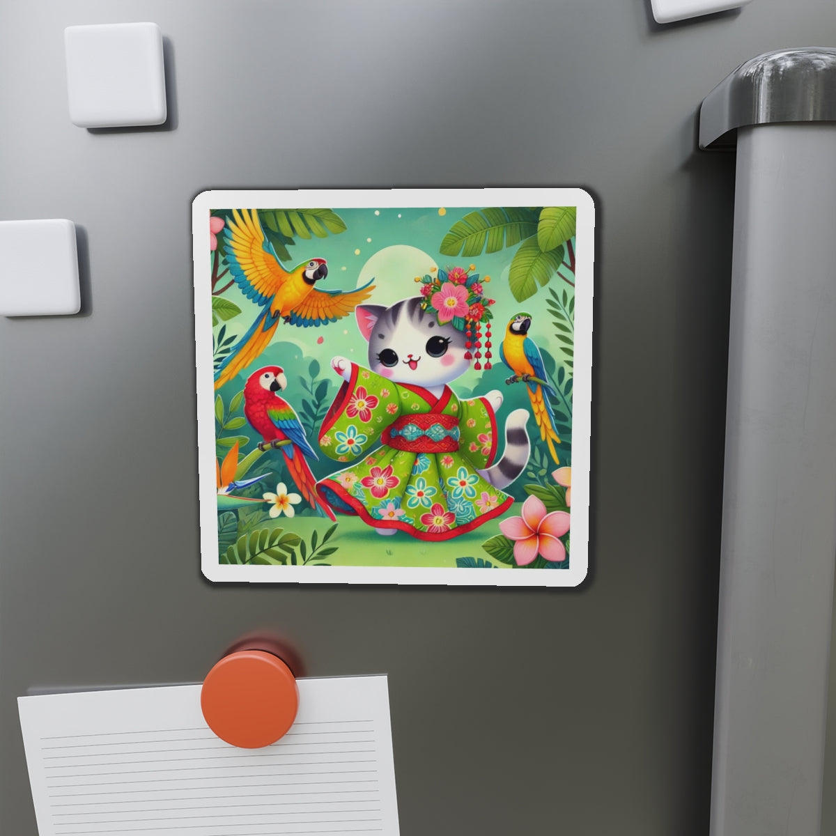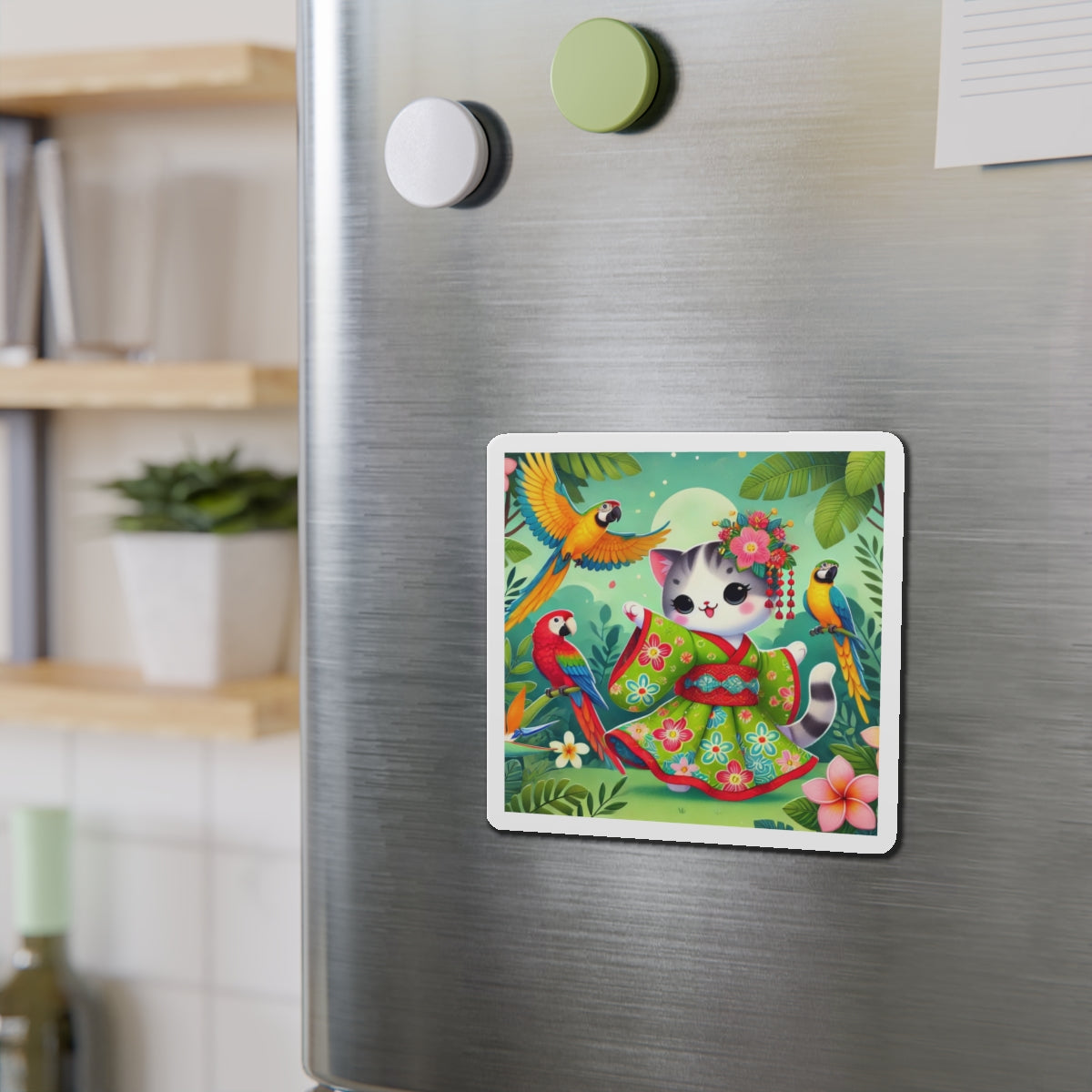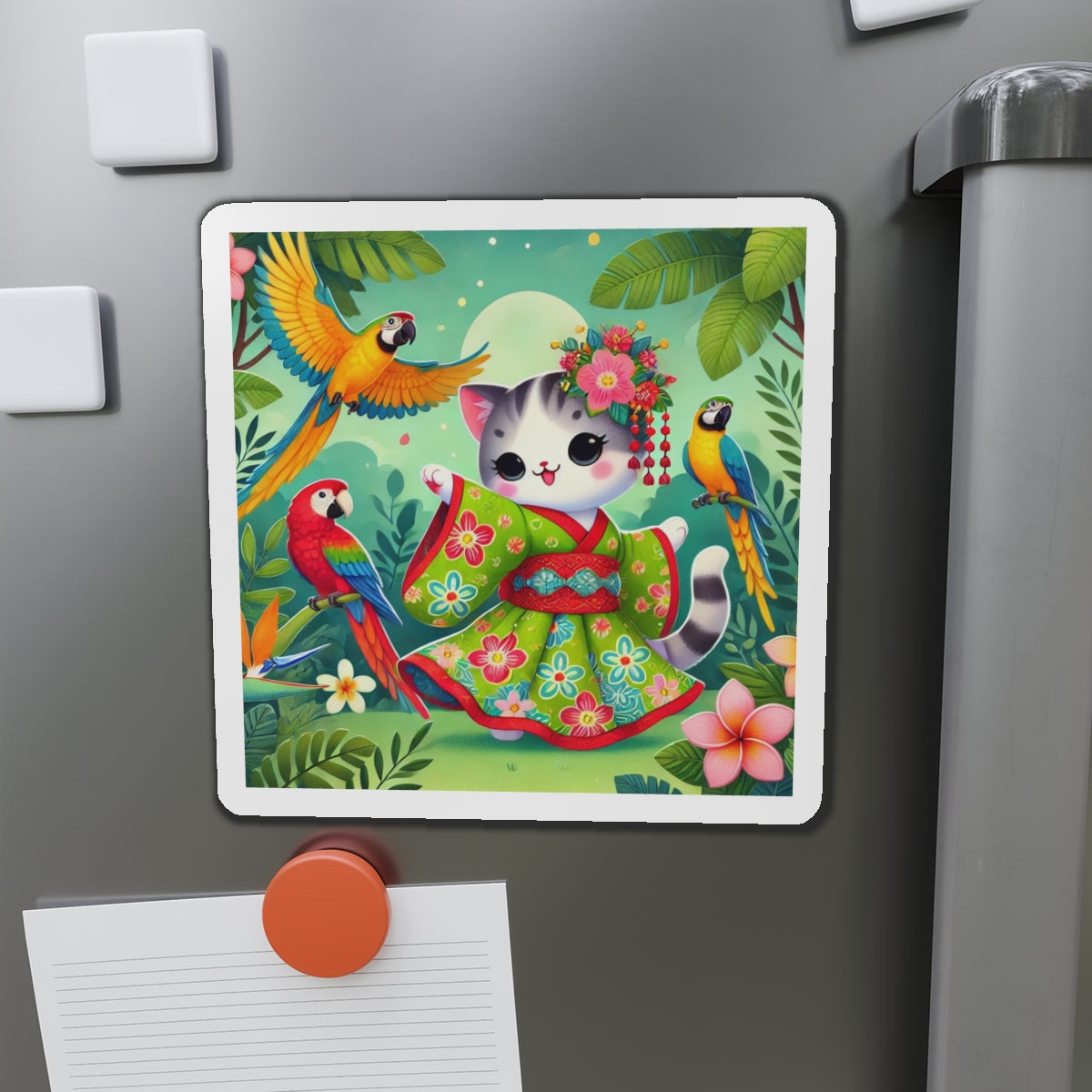 This design features a super cute and whimsical illustration of a vibrant geisha kitten twirling gracefully in a bright kimono adorned with colorful parrot patterns. Playful parrots flutter around in a lush tropical environment, adding to the lively and enchanting atmosphere. Bold outlines and vivid colors enhance the charm and energy of this delightful scene.