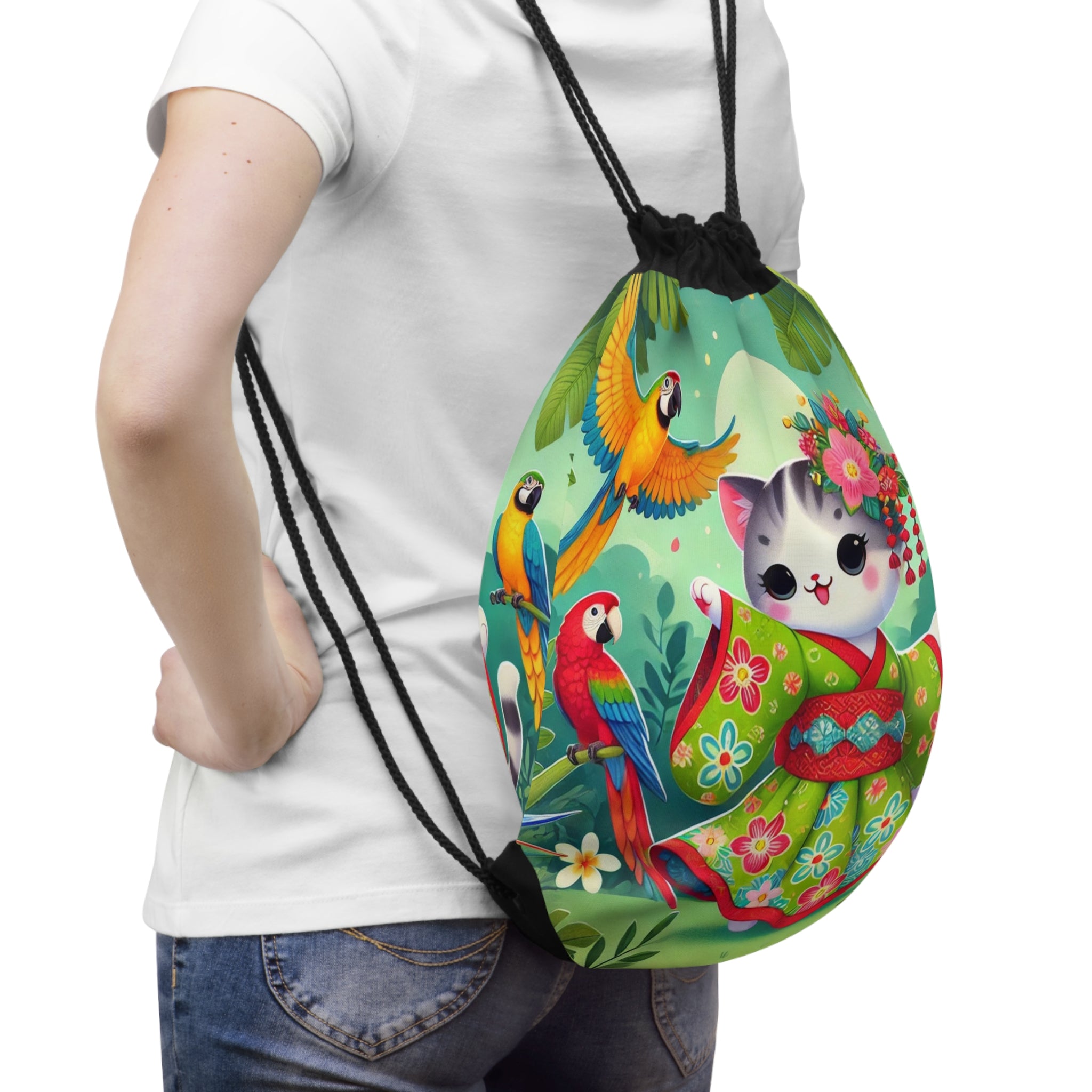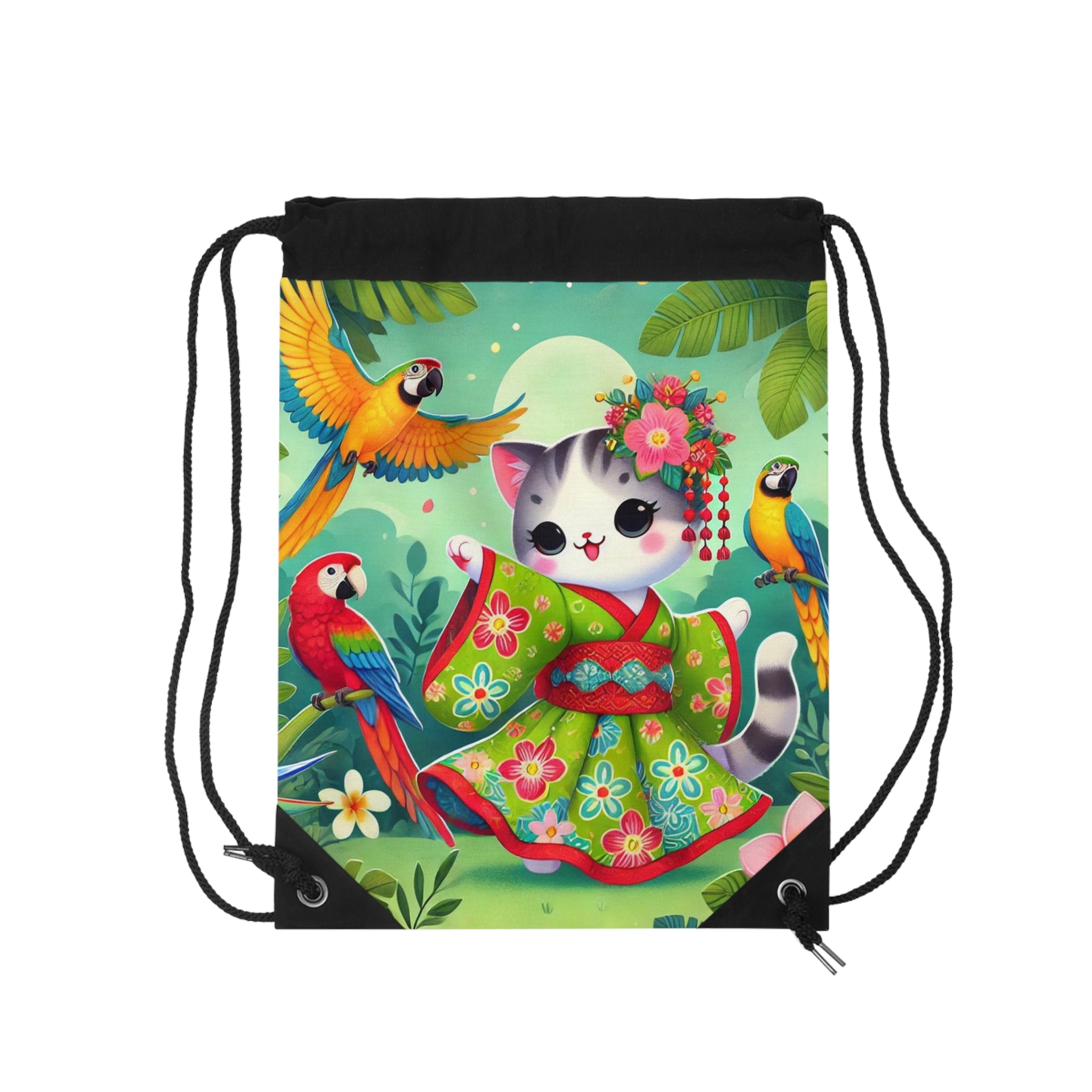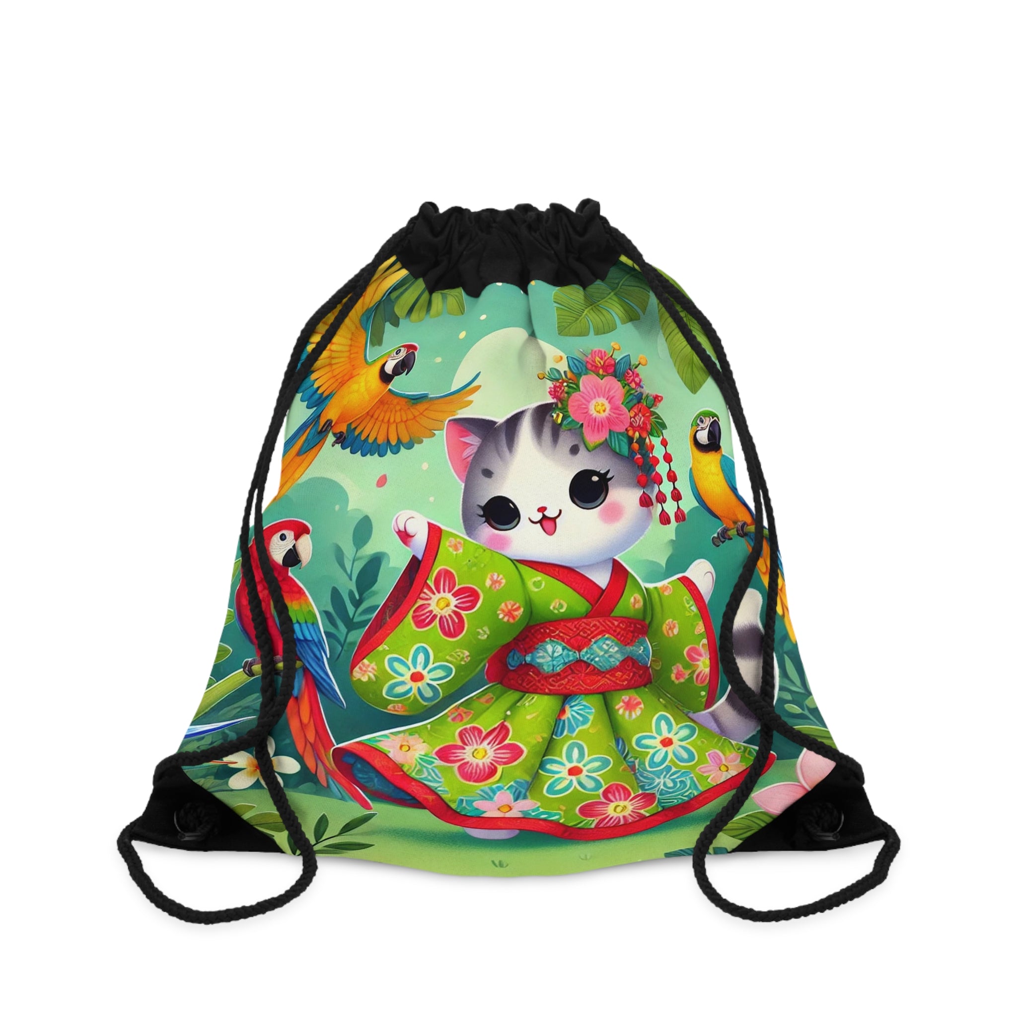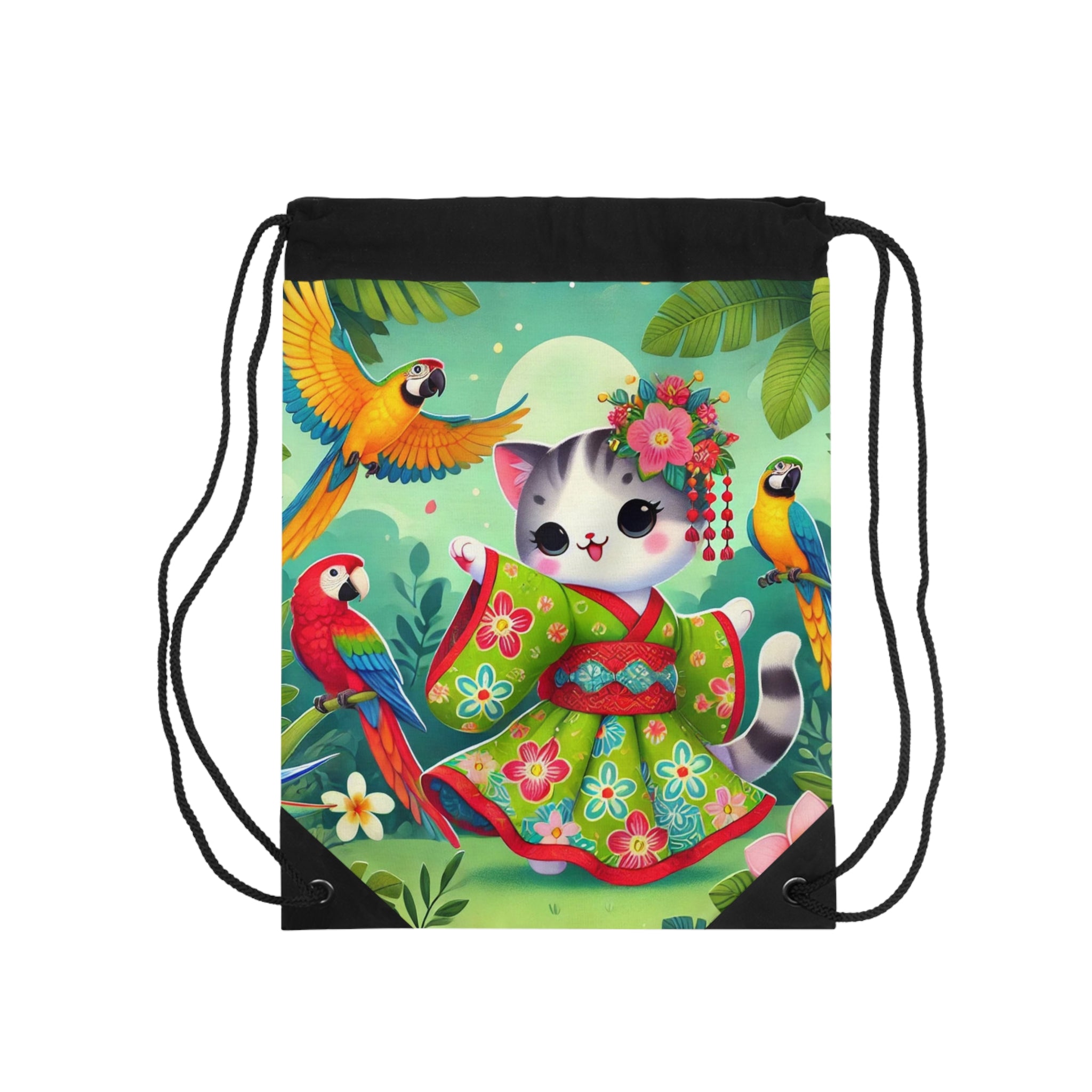 Parrot Dance of the Geisha Kitten Drawstring Bag brings together playful energy and artistic beauty in one lightweight, durable design. Perfect for quick trips to the gym, store, or beach, this versatile drawstring bag blends practicality with vibrant charm for light travels. The Parrot Dance of the Geisha Kitten artwork features an adorable geisha kitten twirling gracefully in a bright kimono adorned with colorful parrot patterns. Around her, lively parrots flutter through a lush tropical setting, creating a joyful and enchanting atmosphere. Bold outlines and vivid colors capture the scene’s exuberance, transforming an everyday accessory into a lively celebration of motion, culture, and whimsy.