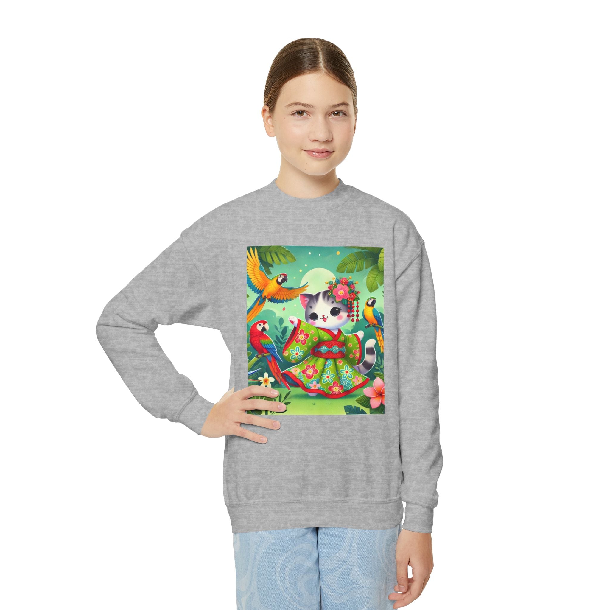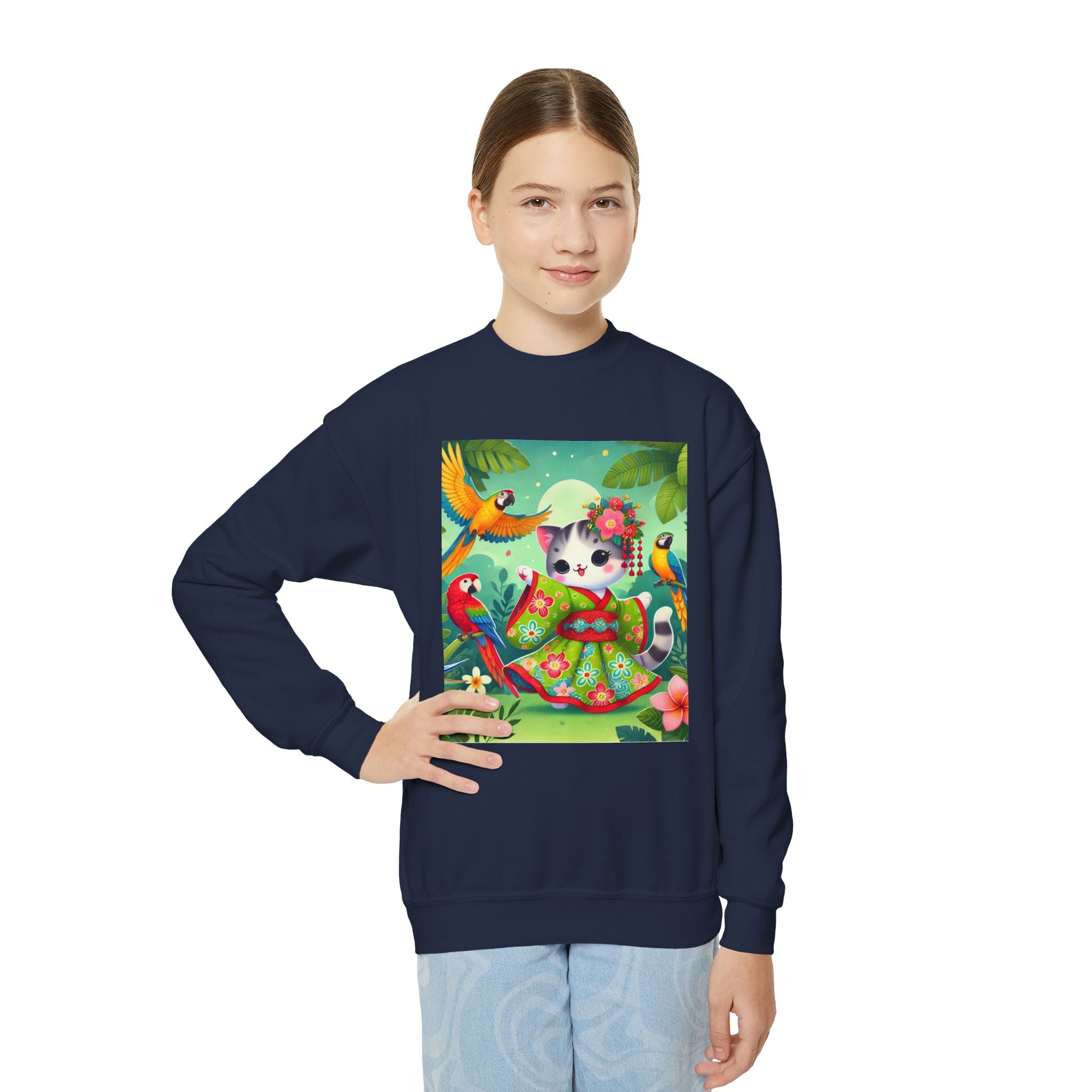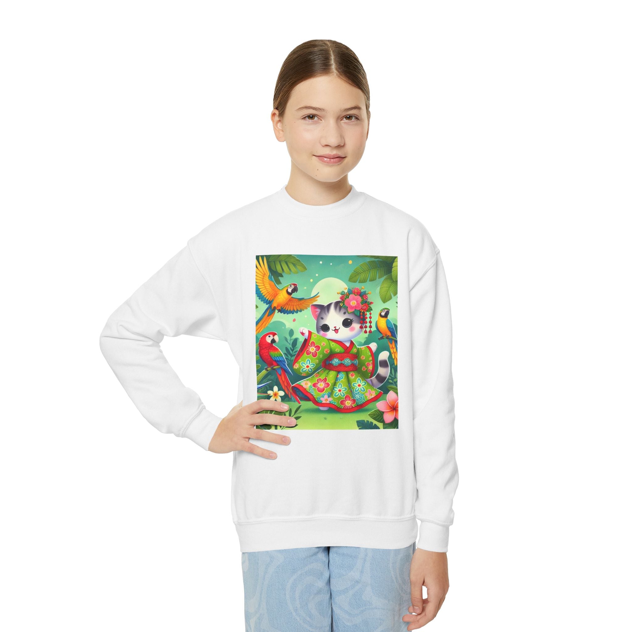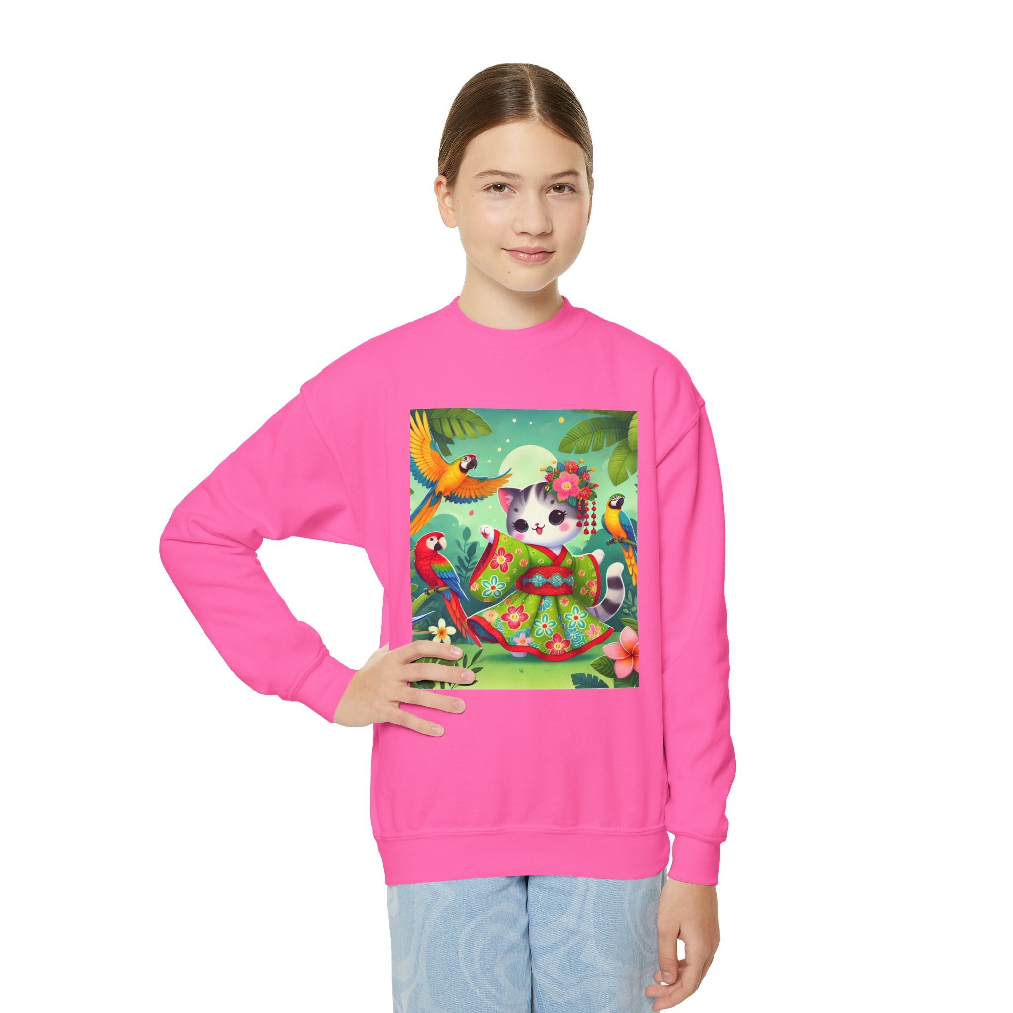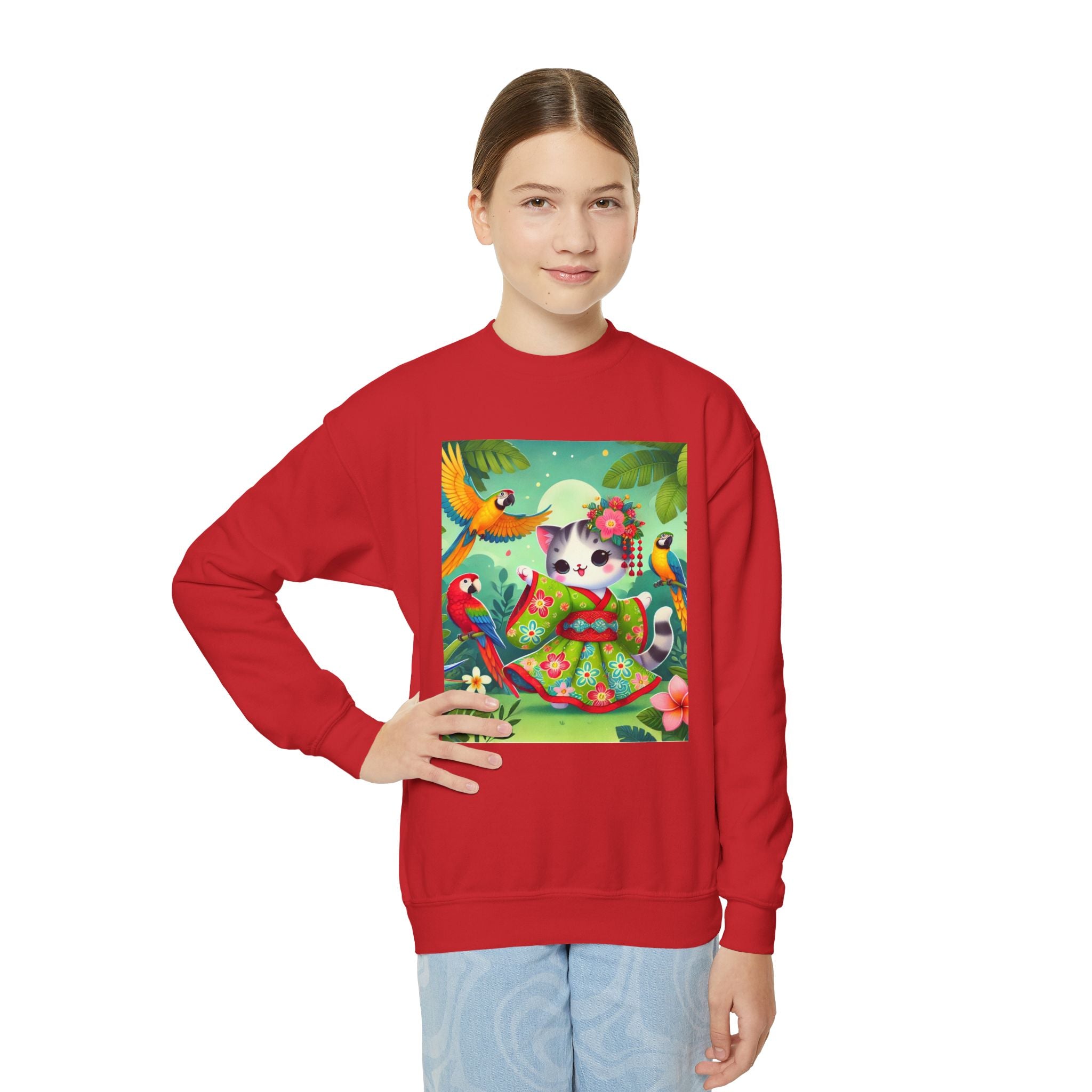 Parrot Dance of the Geisha Kitten Youth Crewneck Sweatshirt brings color, creativity, and comfort together in one delightfully artistic design. Made from a soft and balanced blend of 50% cotton and 50% polyester, this Gildan 18000B sweatshirt provides cozy warmth and lasting comfort for school, play, and relaxation. The medium-heavy fabric offers a premium feel, while the loose fit ensures easy movement. Please note: due to the fabric properties, the White color variant may appear slightly off-white.