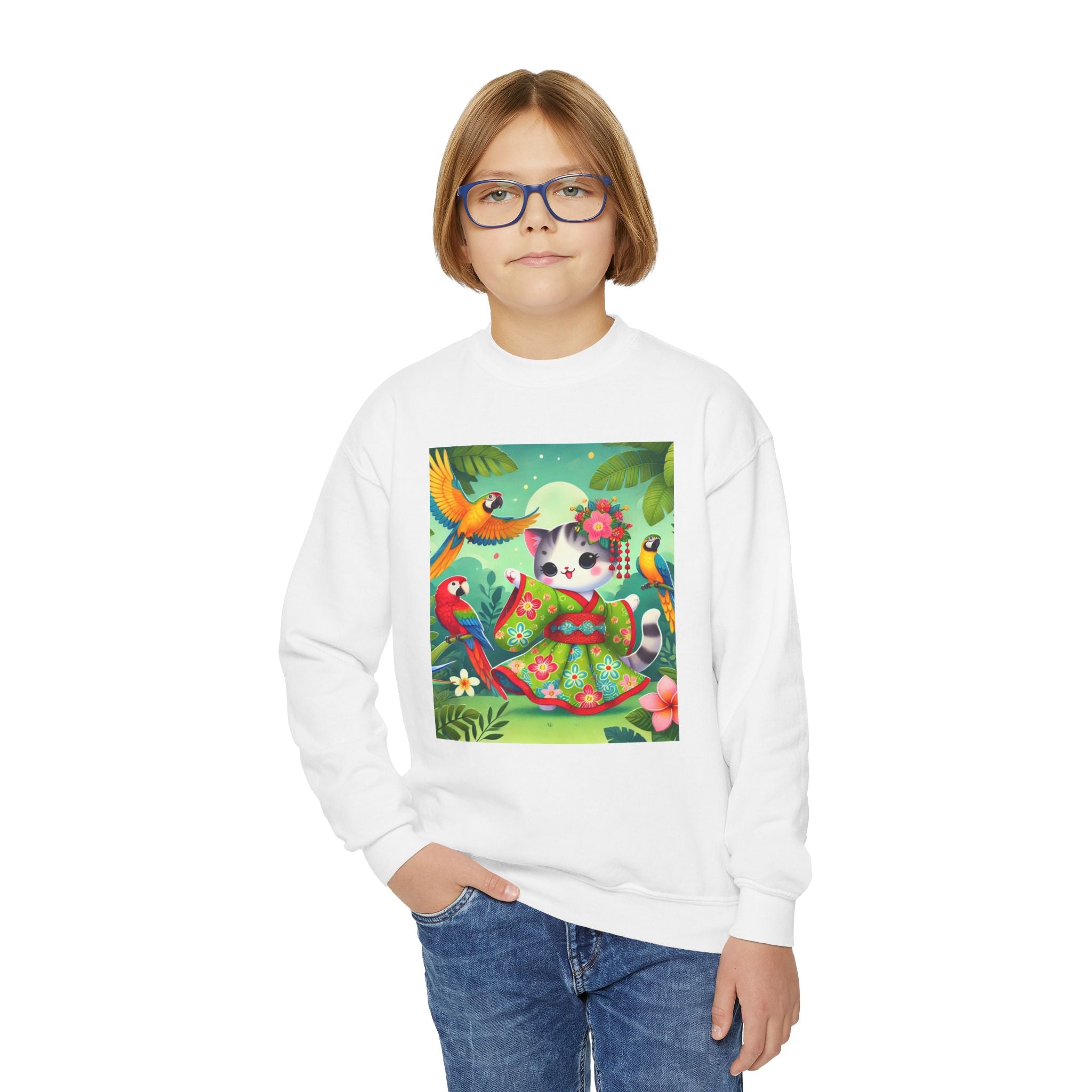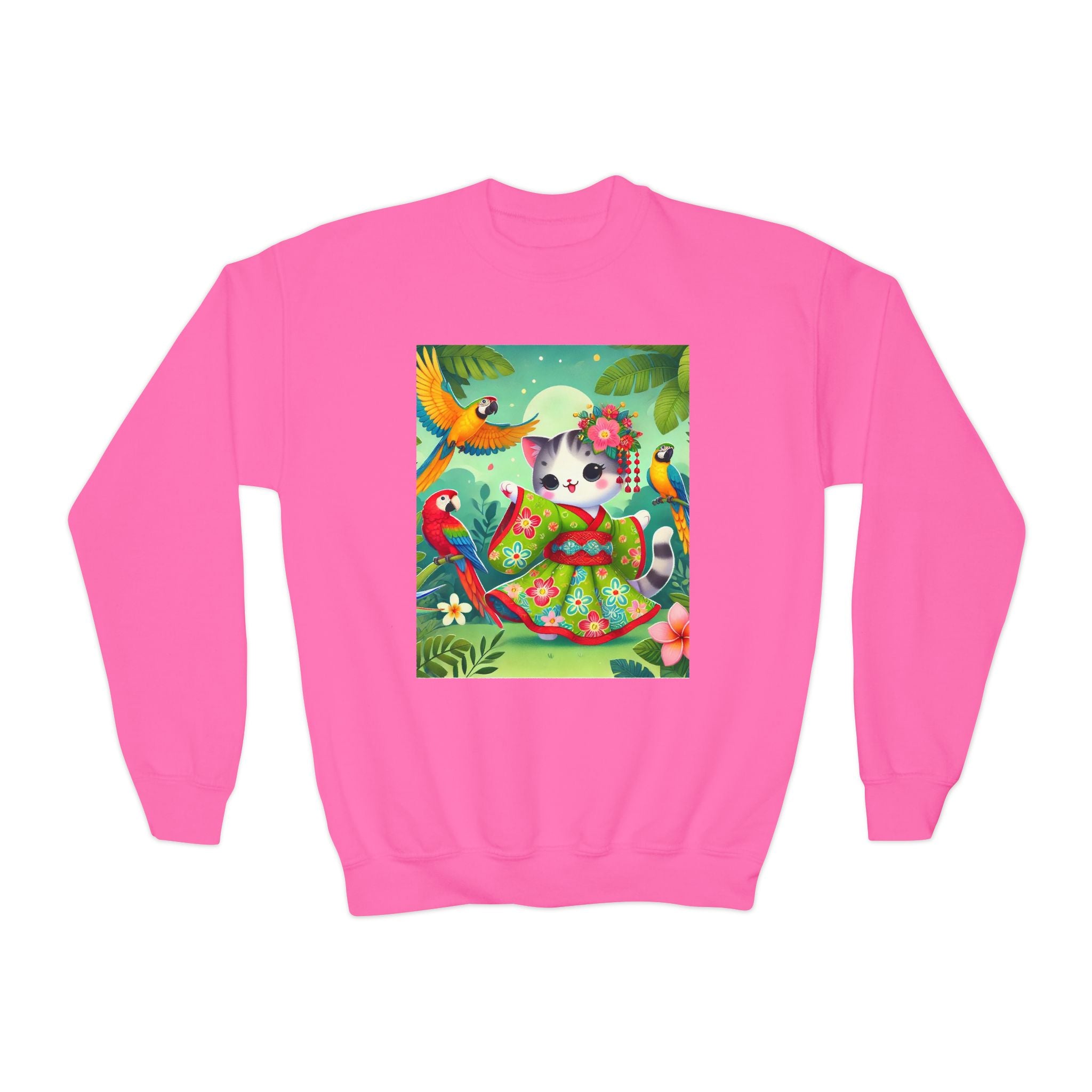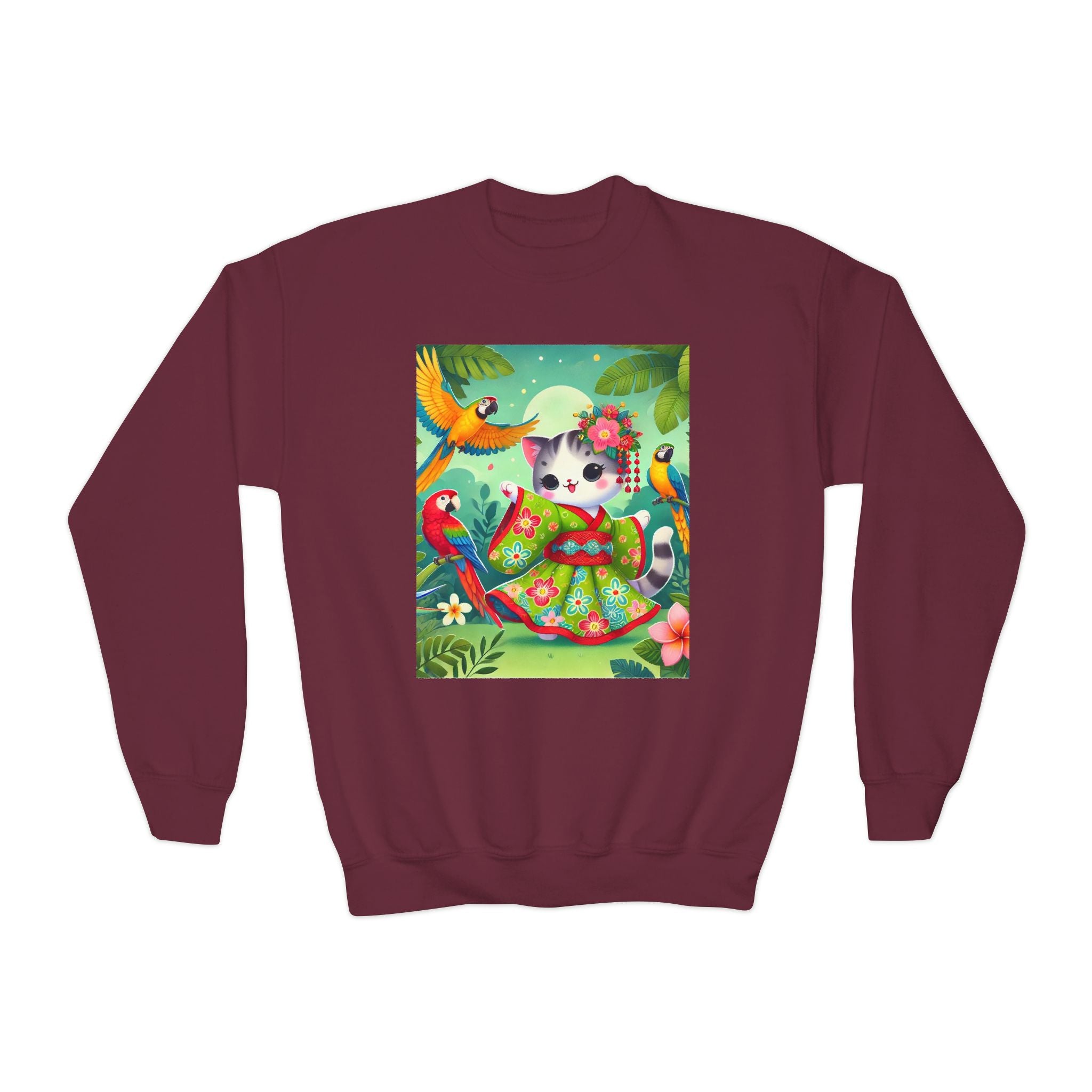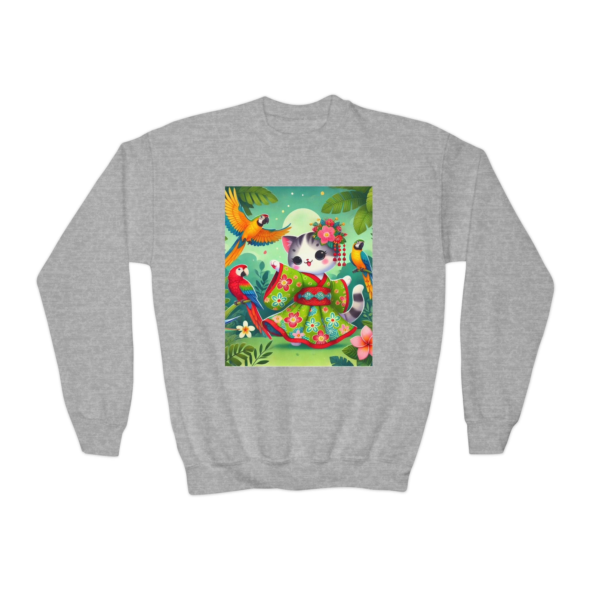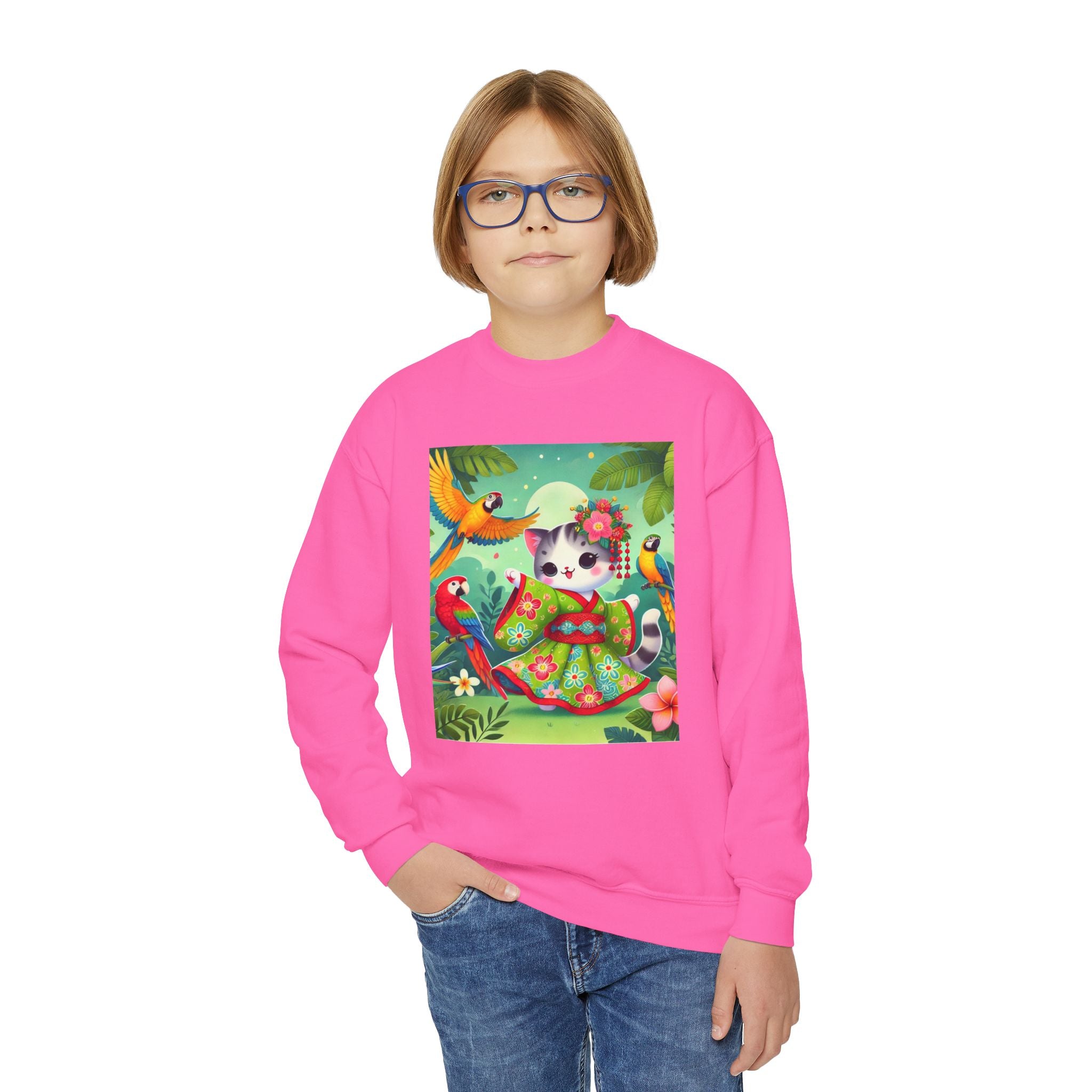 Parrot Dance of the Geisha Kitten Youth Crewneck Sweatshirt brings color, creativity, and comfort together in one delightfully artistic design. Made from a soft and balanced blend of 50% cotton and 50% polyester, this Gildan 18000B sweatshirt provides cozy warmth and lasting comfort for school, play, and relaxation. The medium-heavy fabric offers a premium feel, while the loose fit ensures easy movement. Please note: due to the fabric properties, the White color variant may appear slightly off-white.