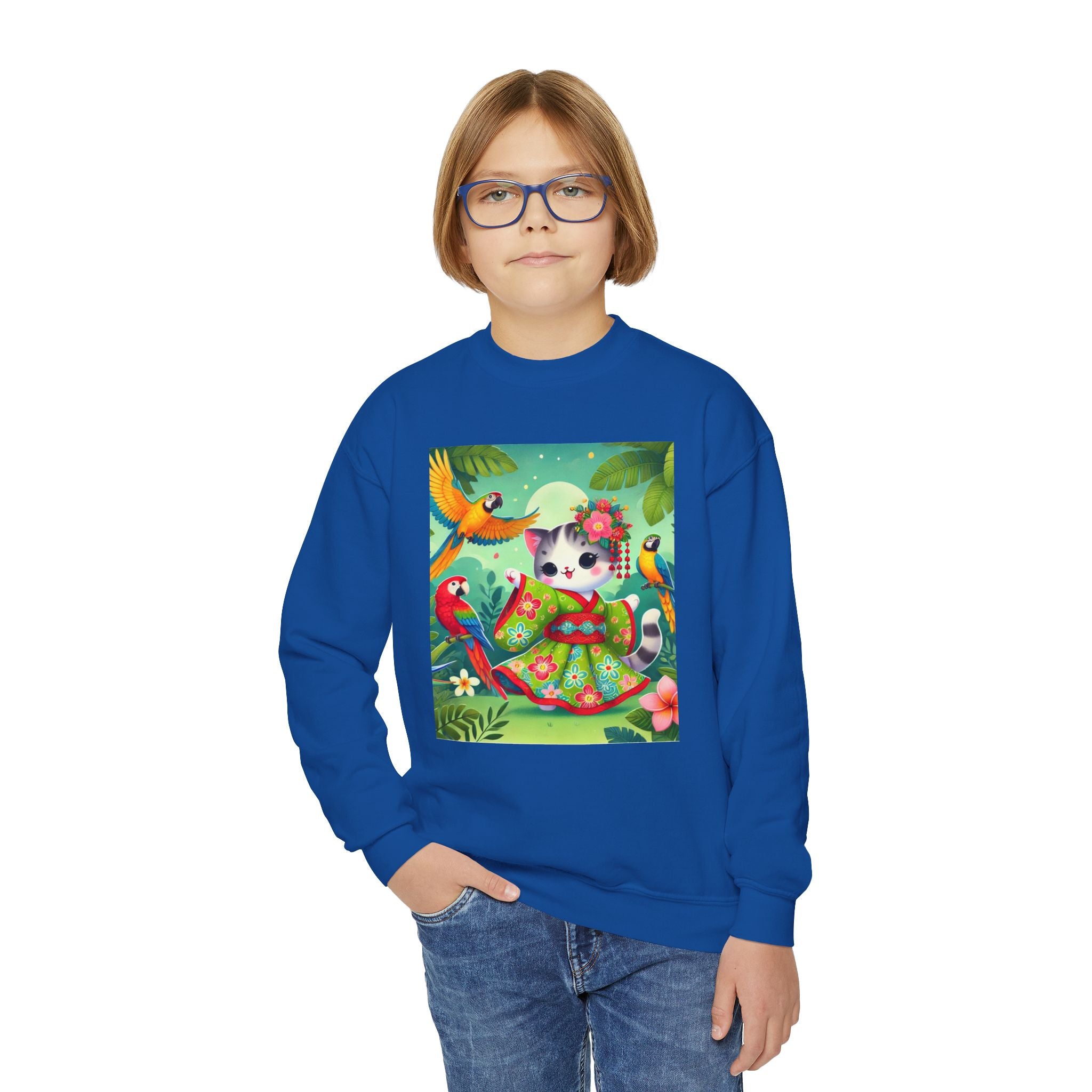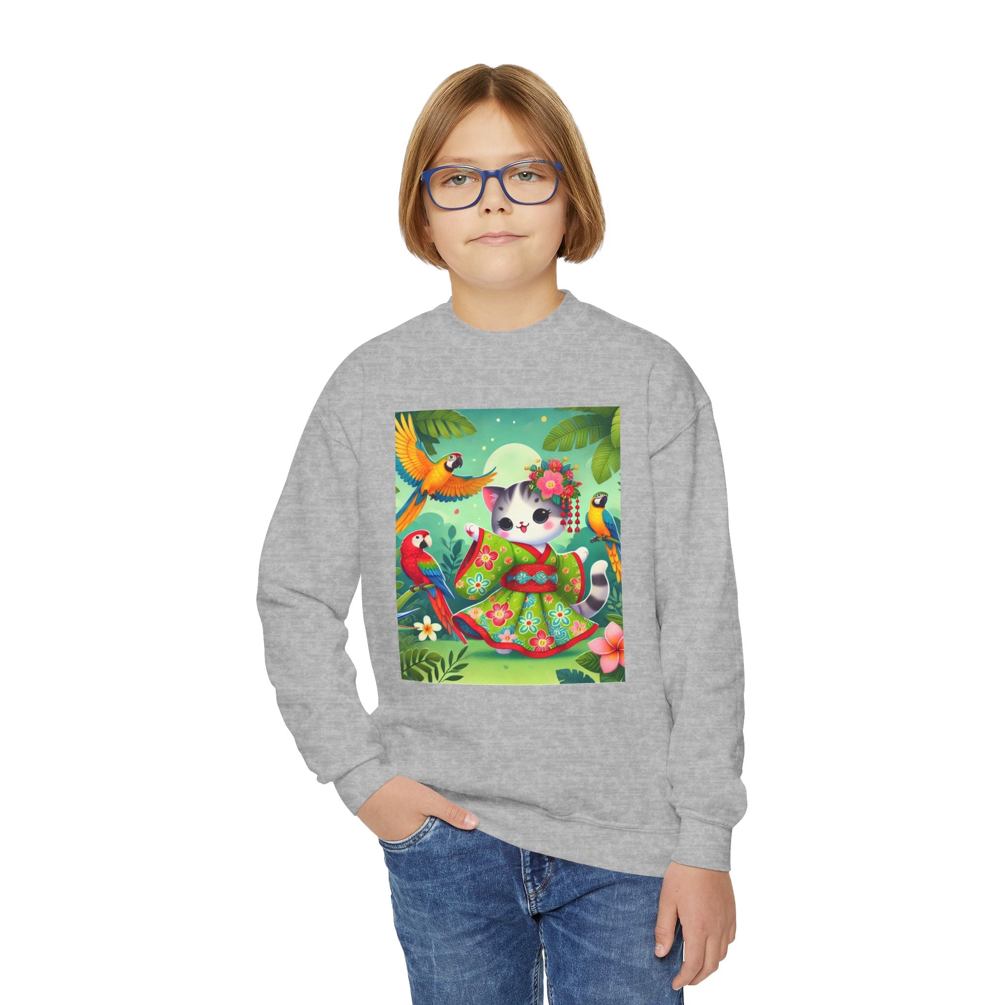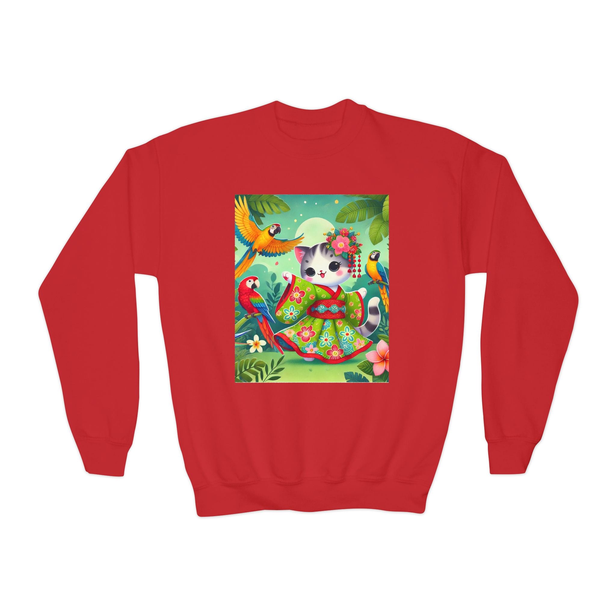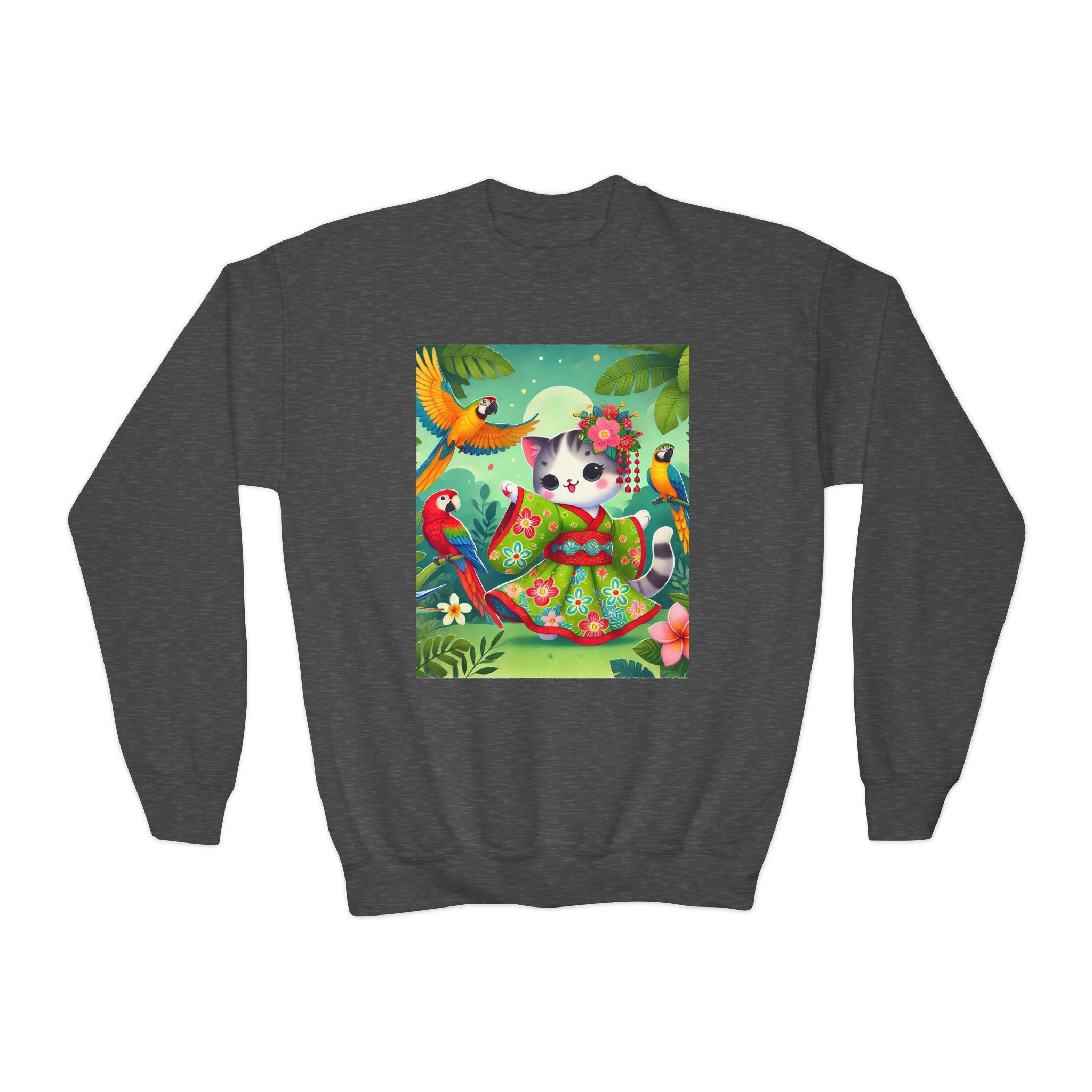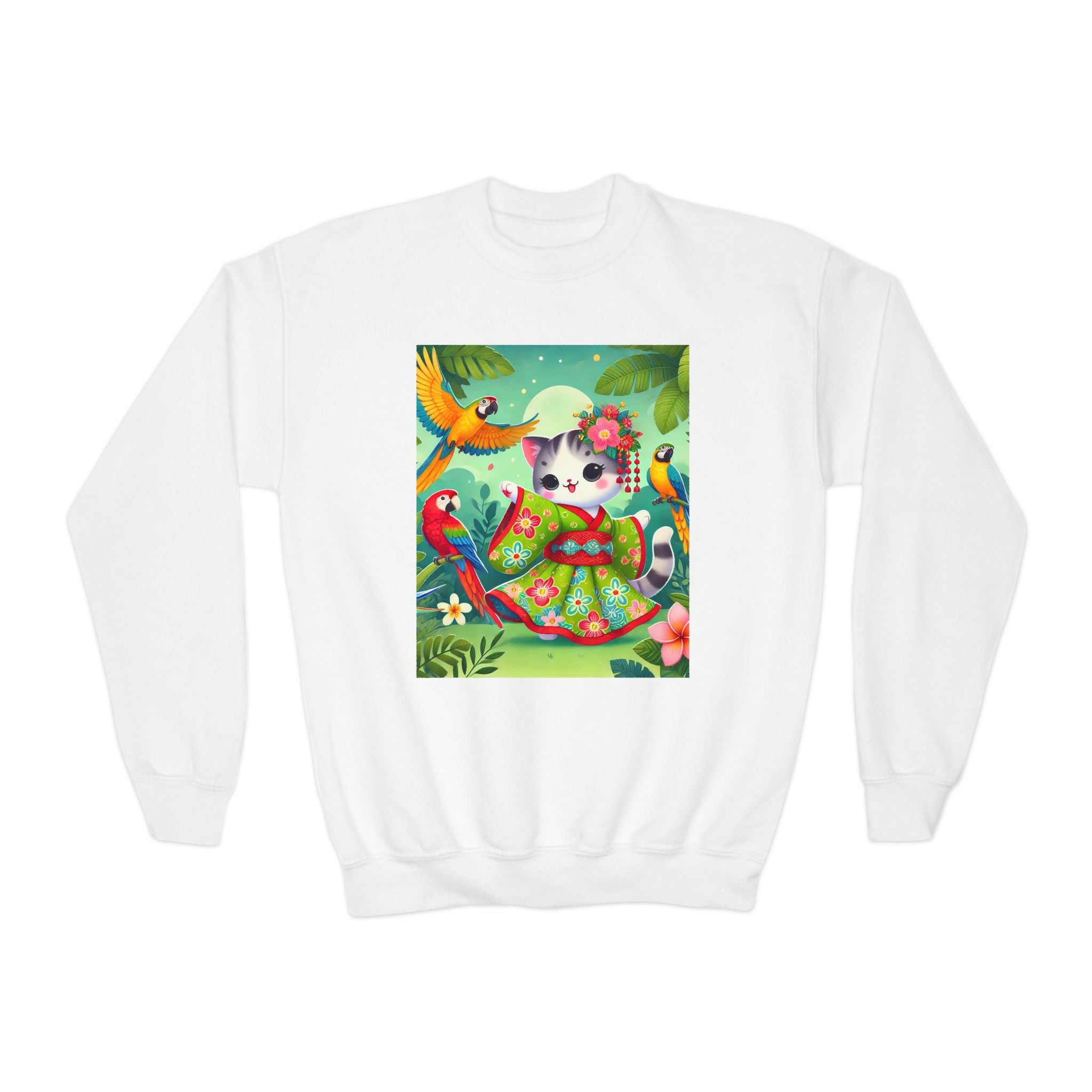 Parrot Dance of the Geisha Kitten Youth Crewneck Sweatshirt brings color, creativity, and comfort together in one delightfully artistic design. Made from a soft and balanced blend of 50% cotton and 50% polyester, this Gildan 18000B sweatshirt provides cozy warmth and lasting comfort for school, play, and relaxation. The medium-heavy fabric offers a premium feel, while the loose fit ensures easy movement. Please note: due to the fabric properties, the White color variant may appear slightly off-white.