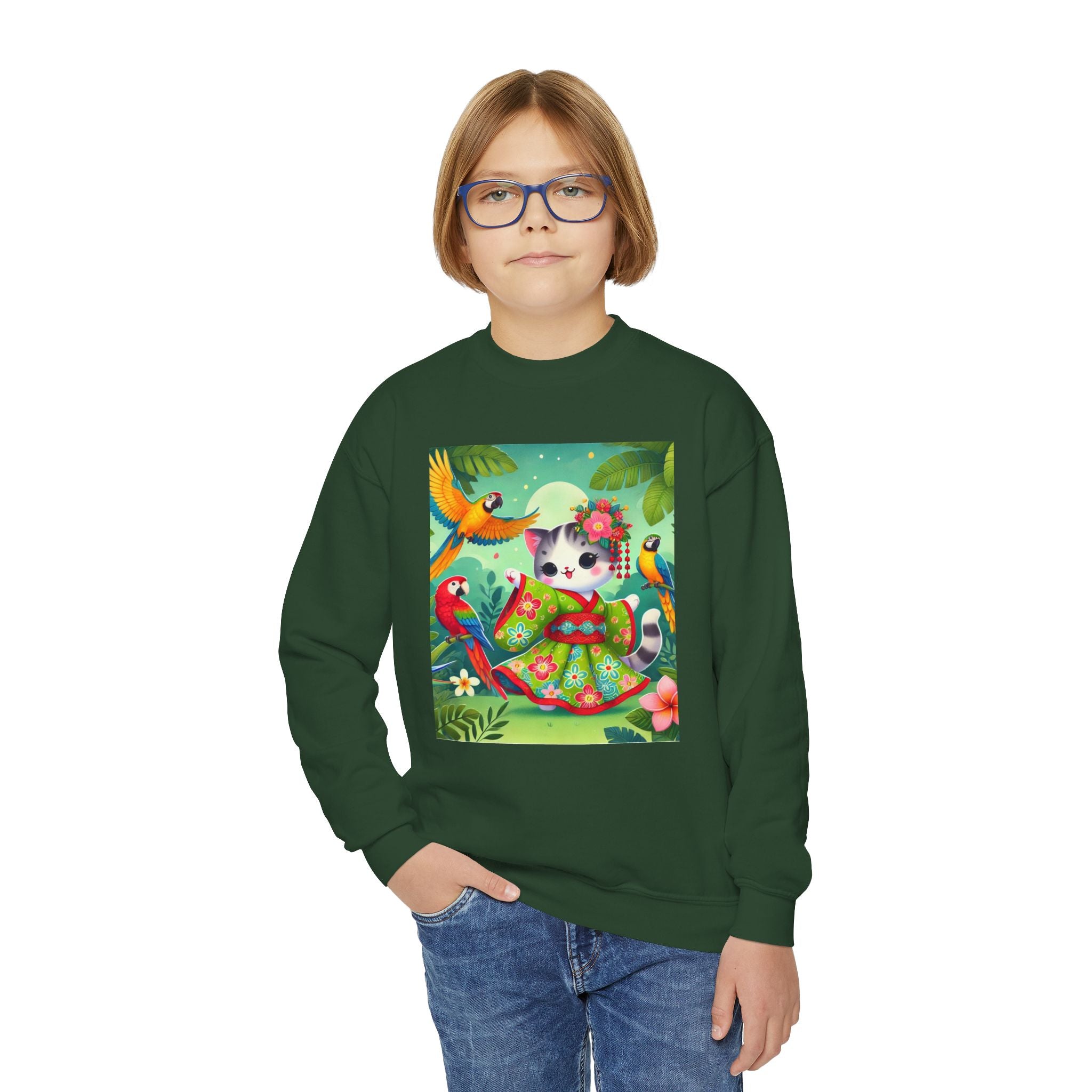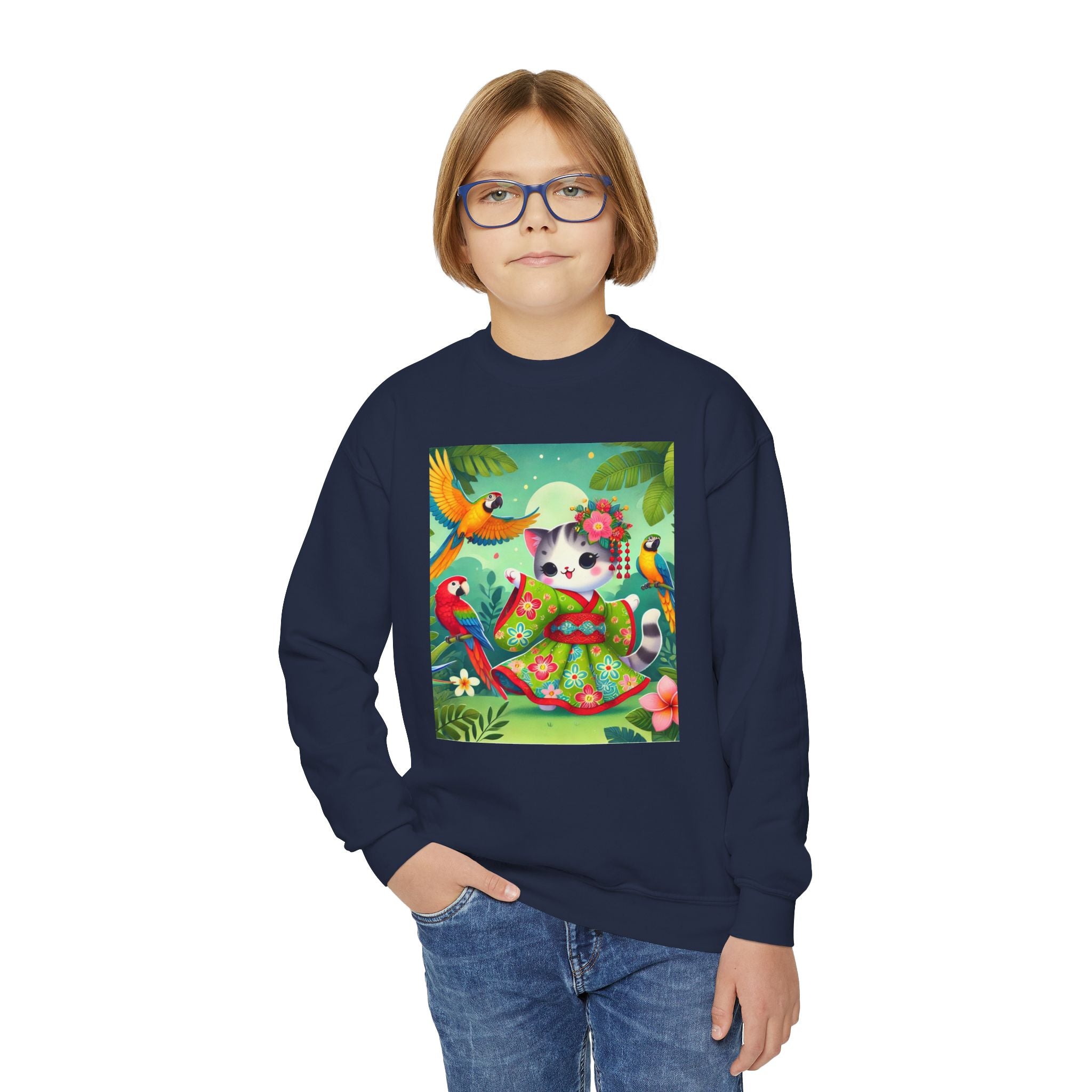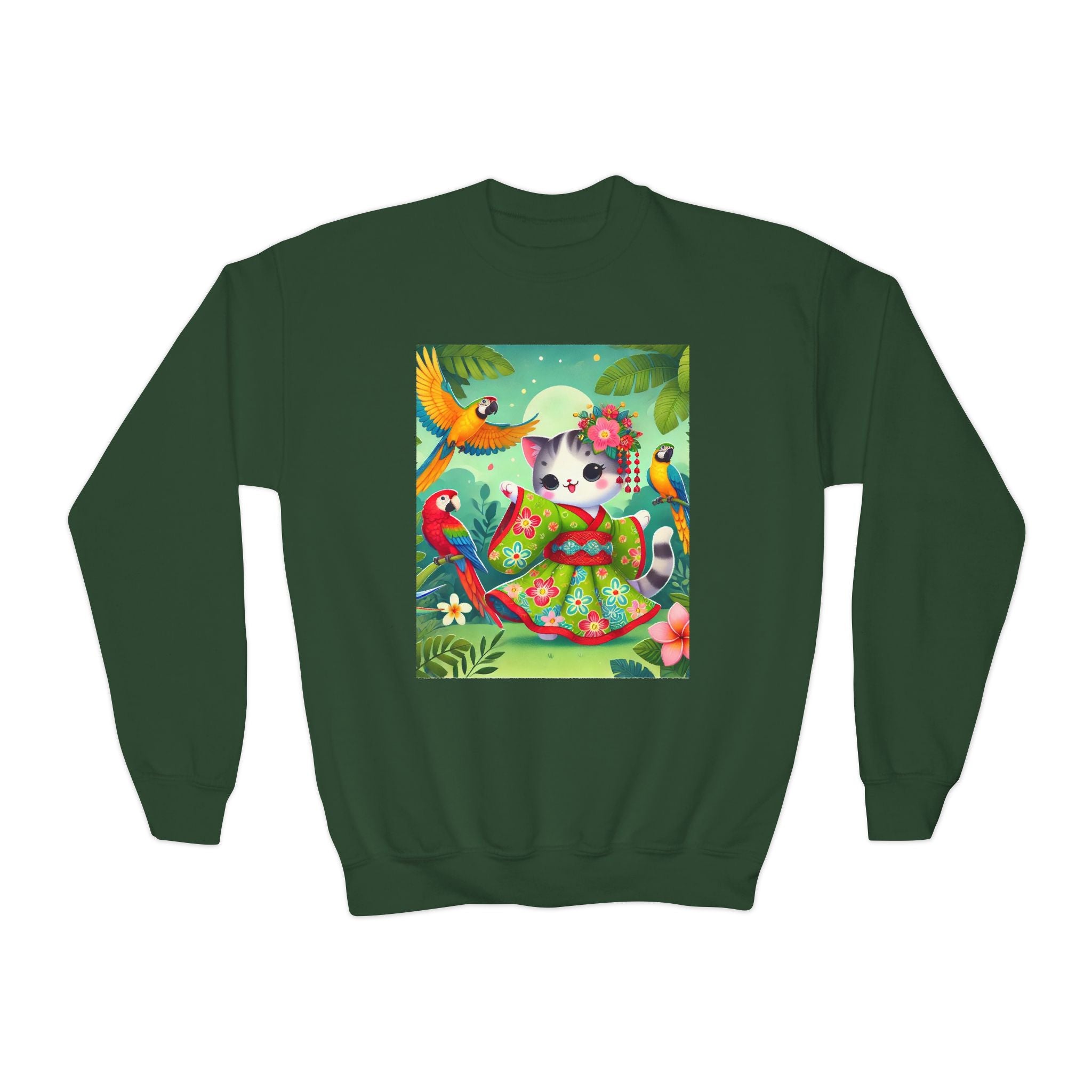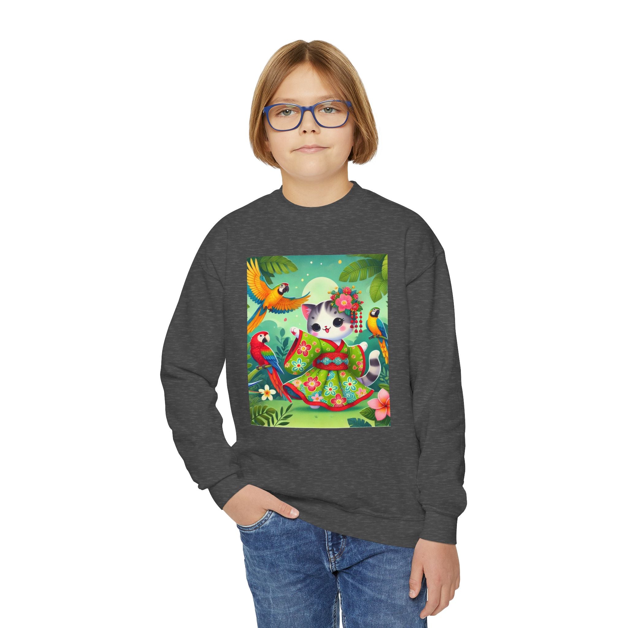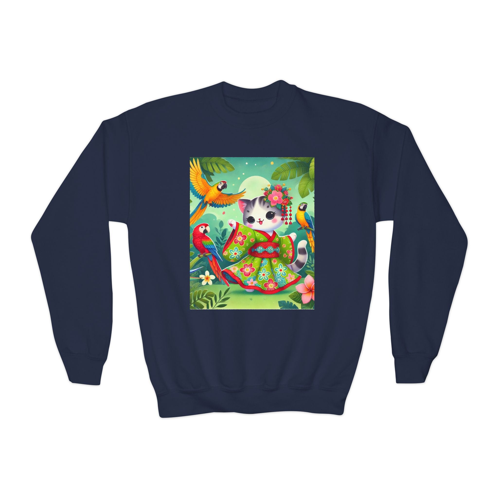Parrot Dance of the Geisha Kitten Youth Crewneck Sweatshirt brings color, creativity, and comfort together in one delightfully artistic design. Made from a soft and balanced blend of 50% cotton and 50% polyester, this Gildan 18000B sweatshirt provides cozy warmth and lasting comfort for school, play, and relaxation. The medium-heavy fabric offers a premium feel, while the loose fit ensures easy movement. Please note: due to the fabric properties, the White color variant may appear slightly off-white.