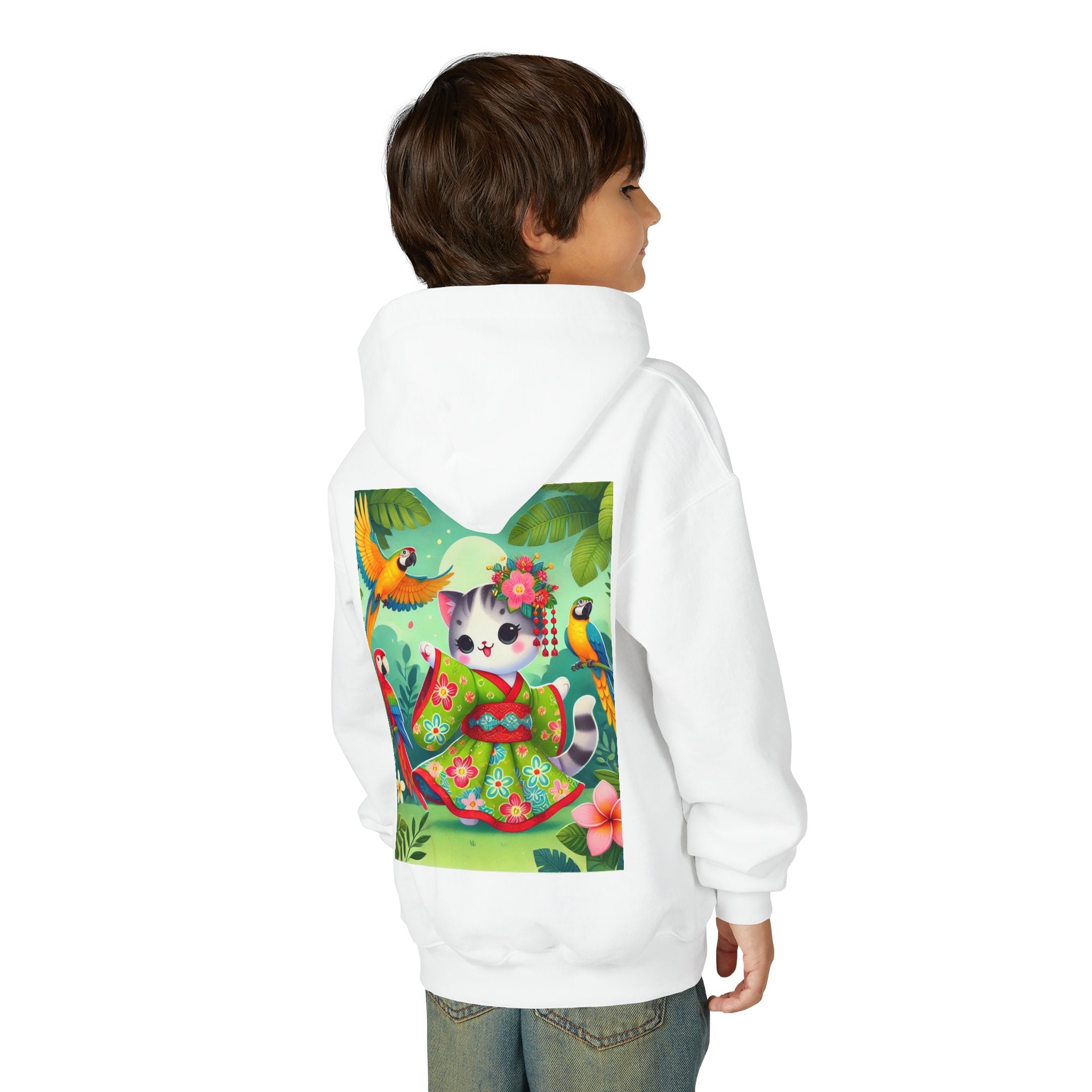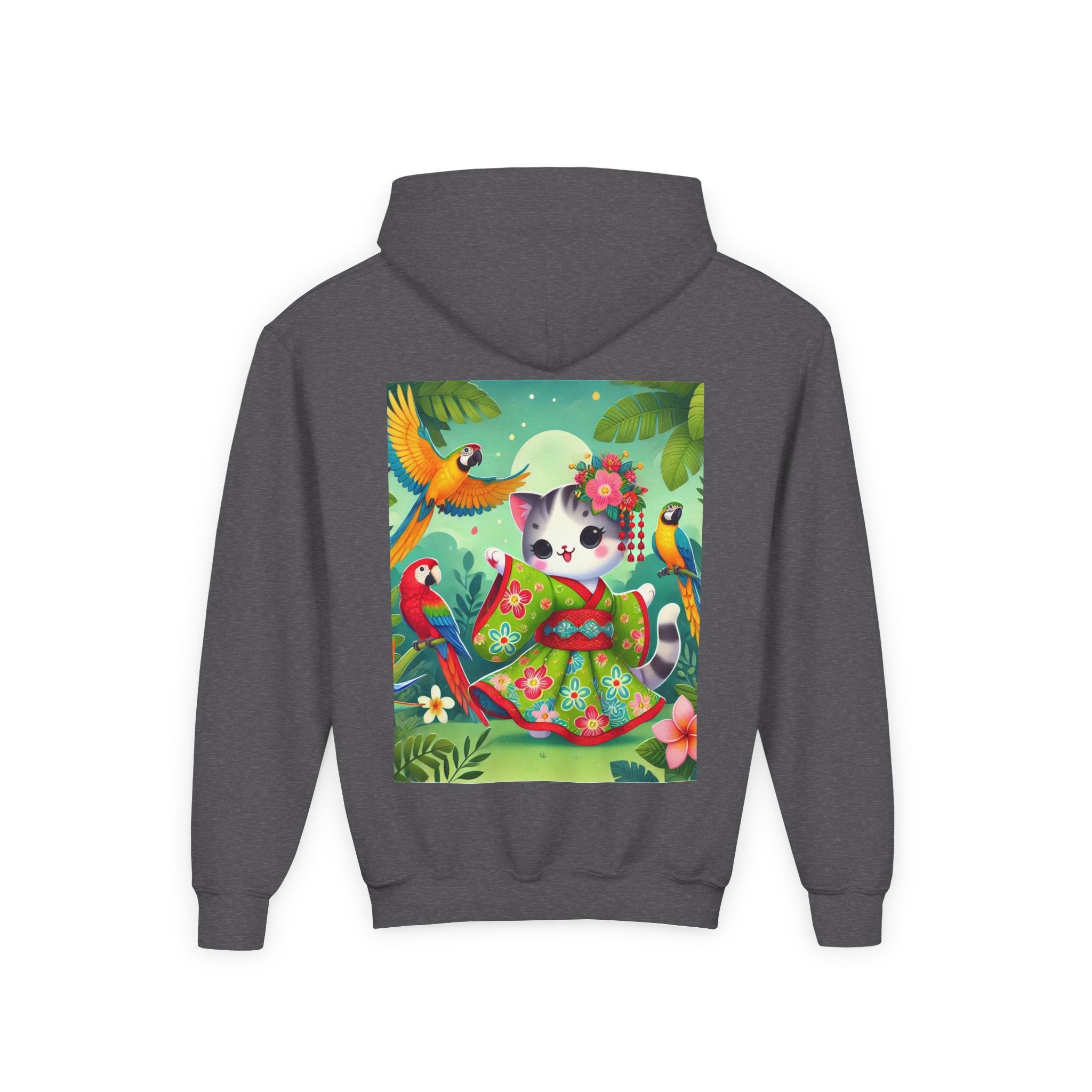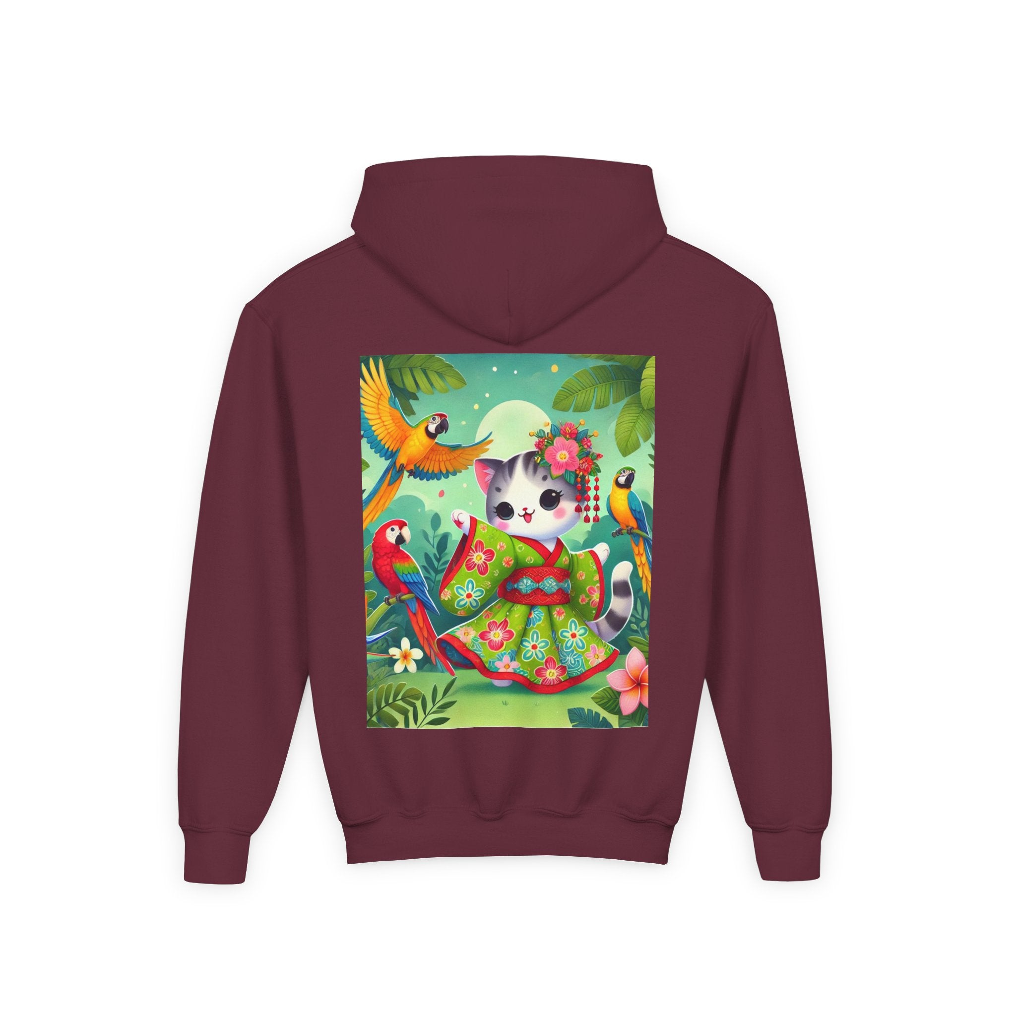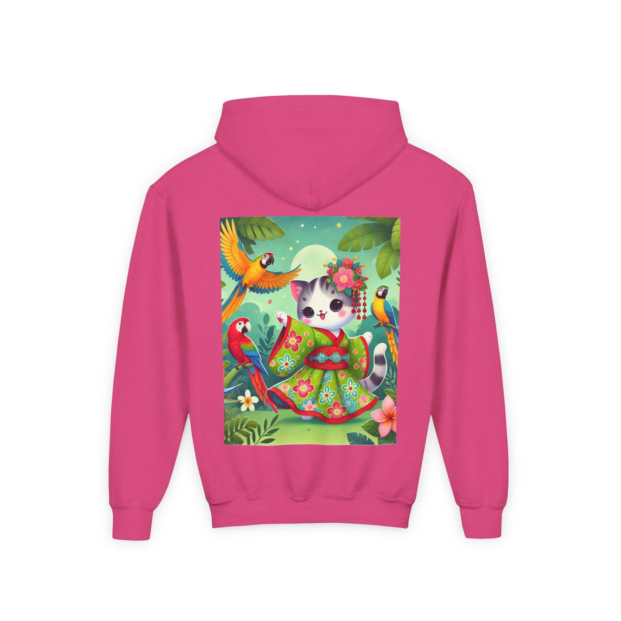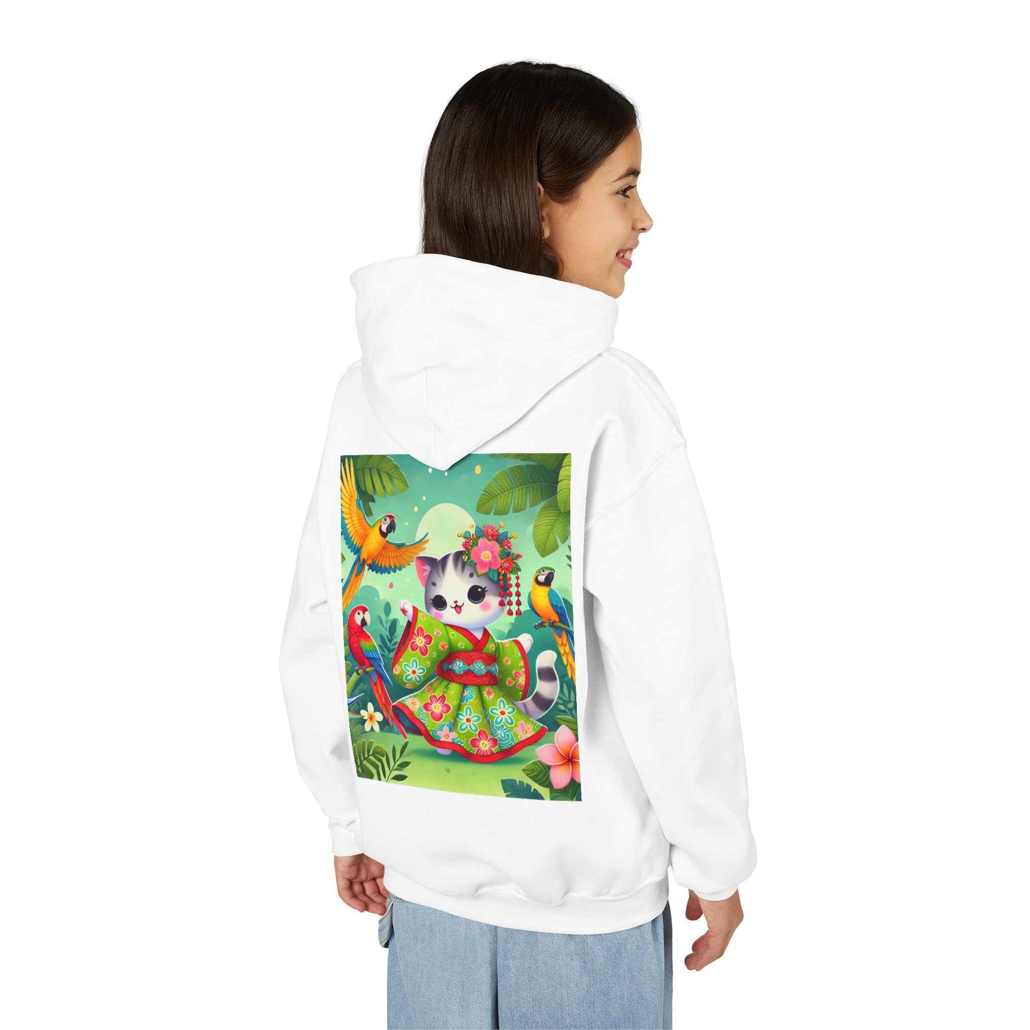 Parrot Dance of the Geisha Kitten Youth Heavy Blend Hooded Sweatshirt blends cozy comfort with vibrant, storybook charm. Made from ultra-soft, preshrunk fleece, this hoodie feels smooth and warm while minimizing lint buildup for lasting quality. The 50/50 cotton-polyester fabric ensures durability and softness, and thoughtful features like a roomy kangaroo pocket and twill-reinforced neck make it perfect for everyday wear. Please note: due to fabric properties, the White color variant may appear slightly off-white.